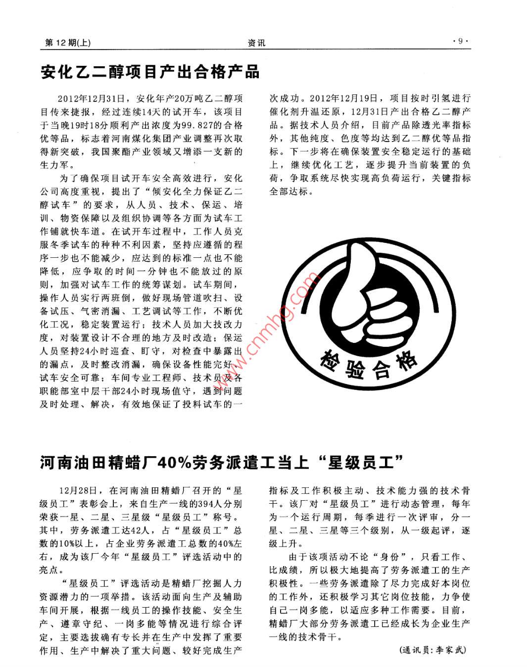 第12期(上)資訊安化乙二醇項目產(chǎn)出合格產(chǎn)品2012年12月31日,安化年產(chǎn)20萬噸乙二醇項次成功。2012年12月19日,項目按時引氫進(jìn)行目傳來捷報,經(jīng)過連續(xù)14天的試開車,該項目催化劑升溫還原,12月31日產(chǎn)出合格乙二醇產(chǎn)于當(dāng)晚19時18分順利產(chǎn)出濃度為99.827的合格品。據(jù)技術(shù)人員介紹,目前產(chǎn)品除透光率指標(biāo)優(yōu)等品,標(biāo)志著河南煤化集團(tuán)產(chǎn)業(yè)調(diào)整再次取外,其他純度、色度等均達(dá)到乙二醇優(yōu)等品指得新突破,我國聚酯產(chǎn)業(yè)領(lǐng)域又增添一支新的標(biāo)。下一步將在確保裝置安全穩(wěn)定運行的基礎(chǔ)生力軍。上,繼續(xù)優(yōu)化工藝,逐步提升當(dāng)前裝置的負(fù)為了確保項目試開車安全高效進(jìn)行,安化荷,爭取系統(tǒng)盡快實現(xiàn)高負(fù)荷運行,關(guān)鍵指標(biāo)公司高度重視,提出了“傾安化全力保證乙全部達(dá)標(biāo)。醇試車”的要求,從人員、技術(shù)、保運、培訓(xùn)、物資保障以及組織協(xié)調(diào)等各方面為試車工作鋪就快車道。在試開車過程中,工作人員克服冬季試車的種種不利因素,堅持應(yīng)遵循的程序一步也不能減少,應(yīng)達(dá)到的標(biāo)準(zhǔn)一點也不能降低,應(yīng)爭取的時間一分鐘也不能放過的原則,加強(qiáng)對試車工作的統(tǒng)籌謀劃。試車期間,操作人員實行兩班倒,做好現(xiàn)場管道吹掃、設(shè)備試壓、氣密消漏、工藝調(diào)試等工作,不斷優(yōu)化工況,穩(wěn)定裝置運行;技術(shù)人員加大技改力度,對裝置設(shè)計不合理的地方及時改造;保運人員堅持24小時巡査、盯守,對檢查中暴露出的漏點,及時整改消漏,確保設(shè)備性能完好、試車安全可靠;車間專業(yè)工程師、技術(shù)員及各驗合職能部室中層干部24小時現(xiàn)場值守,遇到問題及時處理、解決,有效地保證了投料試車的河南油田精蠟廠40%勞務(wù)派遣工當(dāng)上“星級員工”12月28日,在河南油田精蠟廠召開的“星指標(biāo)及工作積極主動、技術(shù)能力強(qiáng)的技術(shù)骨級員工”表彰會上,來自生產(chǎn)一線的394人分別干。該廠對“星級員工”進(jìn)行動態(tài)管理,每年榮獲一星、二星、三星級“星級員工”稱號。為一個運行周期,每季進(jìn)行一次評審,分其中,勞務(wù)派遺工達(dá)42人,占“星級員工”總星、二星、三星等三個級別,從一級起評,逐數(shù)的10%以上,占企業(yè)勞務(wù)派遣工總數(shù)的40%左級上升。右,成為該廠今年“星級員工”評選活動中的由于該項活動不論“身份”,只看工作亮點。比成績,所以極大地提高了勞務(wù)派遣工的生產(chǎn)星級員工”評選活動是精蠟廠挖掘人力積極性。一些勞務(wù)派遣除了盡力完成好本崗位資源潛力的一項舉措。該活動面向生產(chǎn)及輔助的工作外,還積極學(xué)習(xí)其它崗位技能,力爭使車間開展,根據(jù)一線員工的操作技能、安全生自己一崗多能,以適應(yīng)多種工作需要。目前,產(chǎn)、遵章守紀(jì)、一崗多能等情況進(jìn)行綜合評精蠟廠大部分勞務(wù)派遣工已經(jīng)成長為企業(yè)生產(chǎn)定,主要選拔確有專長并在生產(chǎn)中發(fā)揮了重要線的技術(shù)骨干。作用、生產(chǎn)中解決了重大問題、較好完成生產(chǎn)(通訊員:李家武)