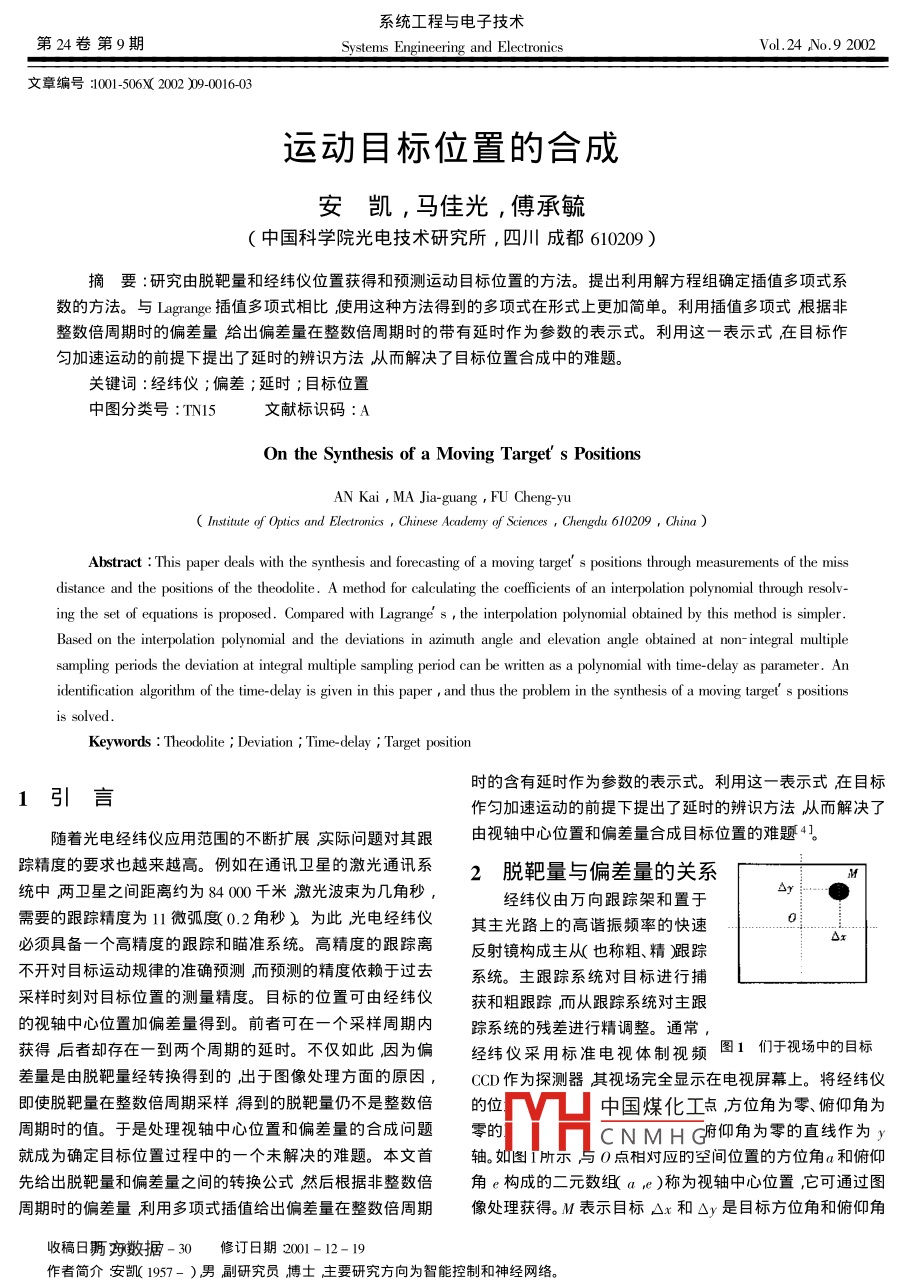 系統(tǒng)工程與電子技術(shù)第24卷第9期Systems Engineering and ElectronicsVol.24 ,No.9 2002文章編號:1001-506X( 2002 )09-0016-03運動目標位置的合成安凱,馬佳光,傅承毓(中國科學(xué)院光電技術(shù)研究所, 四川成都610209 )摘要:研究由脫靶量和經(jīng)緯儀位置獲得和預(yù)測運動目標位置的方法。提出利用解方程組確定插值多項式系數(shù)的方法。與Lagrange插值多項式相比使用這種方法得到的多項式在形式上更加簡單。利用插值多項式根據(jù)非整數(shù)倍周期時的偏差量給出偏差量在整數(shù)倍周期時的帶有延時作為參數(shù)的表示式。利用這一表示式在目標作勻加速運動的前提下提出了延時的辨識方法從而解決了目標位置合成中的難題。關(guān)鍵詞:經(jīng)緯儀;偏差;延時;目標位置中圖分類號:TN15文獻標識碼:AOn the Synthesis of a Moving Target' s PositionsAN Kai , MA Jjia-guang , FU Cheng-yu( Institute of Optics and Electronics , Chinese Academy of Sciences , Chengdu 610209 , China )Abstract : This paper deals with the synthesis and forecasting of a moving target' s positions through measurements of the missdistance and the positions of the theodolite. A method for calculating the coficients of an interpolation polynomial through resolv-ing the set of equations is proposed. Compared with Lagrange' s , the interpolation polynomial obtained by this method is simpler.Based on the interpolation polynomial and the deviations in azimuth angle and elevation angle obtained at non- integral muliplesampling periods the deviation at integral multiple sampling period can be written as a polynomial with time-delay as parameter. Anidentification algorithm of the time-delay is given in this paper , and thus the problem in the synthesis of a moving target' s positionsis solved.Keywords : Theodolite ; Deviation ; Time -delay ; Target position時的含有延時作為參數(shù)的表示式。利用這一表示式 在目標.1引言作勻加速運動的前提下提出了延時的辨識方法從而解決了隨著光電經(jīng)緯儀應(yīng)用范圍的不斷擴展實際問題對其跟由視軸中心位置和偏差量合成目標位置的難題4。蹤精度的要求也越來越高。例如在通訊衛(wèi)星的激光通訊系2脫靶量與偏差量的關(guān)系統(tǒng)中兩衛(wèi)星之間距離約為84 000千米激光波束為幾角秒,經(jīng)緯儀由萬向跟蹤架和置于>y需要的跟蹤精度為11微弧度0.2角秒)為此光電經(jīng)緯儀其主光路上的高諧振頻率的快速Ox必須具備-個高精度的跟蹤和瞄準系統(tǒng)。高精度的跟蹤離反射鏡構(gòu)成主從(也稱粗、精)跟蹤不開對目標運動規(guī)律的準確預(yù)測而預(yù)測的精度依賴于過去系統(tǒng)。主跟蹤系統(tǒng)對目標進行捕采樣時刻對目標位置的測量精度。目標的位置可由經(jīng)緯儀獲和粗跟蹤,而從跟蹤系統(tǒng)對主跟的視軸中心位置加偏差量得到。前者可在-個采樣周期內(nèi)蹤系統(tǒng)的殘差進行精調(diào)整。通常,獲得后者卻存在-到兩個周期的延時。不僅如此因為偏經(jīng)緯儀采用標準電視體制視頻圖1們于視場中的目標差量是由脫靶量經(jīng)轉(zhuǎn)換得到的,出于圖像處理方面的原因CCD作為探測器其視場完全顯示在電視屏幕上。將經(jīng)緯儀即使脫靶量在整數(shù)倍周期采樣得到的脫靶量仍不是整數(shù)倍的位中國煤化工點方位角為零、俯仰角為周期時的值。于是處理視軸中心位置和偏差量的合成問題零的MHCNMH G府仰角為零的直線作為y就成為確定目標位置過程中的一個未解決的難題。本文首軸。如圖I所示與0點相對應(yīng)的空間位置的方位角a和俯仰先給出脫靶量和偏差量之間的轉(zhuǎn)換公式然后根據(jù)非整數(shù)倍角e構(gòu)成的二元數(shù)組( a ,e )稱為視軸中心位置,它可通過圖周期時的偏差量利用多項式插值給出偏差量在整數(shù)倍周期像處理獲得。M表示目標Ax和△y是目標方位角和俯仰角收稿日眄兩數(shù)據(jù)- 30修訂日期2001-12-19作者簡介安凱( 1957- )男副研究員博士主要研究方向為智能控制和神經(jīng)網(wǎng)絡(luò)。第9期運動目標位置的合成17●偏離視軸中心的角度,分別稱為方位角和俯仰角的脫靶量。它們也可通過圖像處理的方法獲得。目標的方位角和俯仰角構(gòu)成的二元數(shù)組稱為目標位置,它們可通過視軸中心位置Ay t的脫靶量經(jīng)合成得到。用ak ,e下分別表示第k:個采樣周期視軸中心的方位角和俯仰角用A.,En分別表示第k個采樣周期目標的方位角和p|俯仰角則OA,= An-an OE。= En-ehAA,分別表示第k個采樣周期目標關(guān)于這兩個角度的偏差。用rh圖2由脫靶量確定目標位置表示目標的距離,T表示采樣周期。用Axm和Oyh分別表示目標方位角和俯仰角的脫靶量。圖2中,C表示目標位置,B與B( r,cosak rsinan Irtar( en + Oy: ))C俯仰角相同方位角相差OAp的一點,D、E分別是B、C在a r.co( ah + OA:)rsir( ak + OAμ)z)xy平面上的投影。0表示位于B ,D聯(lián)線上、方位角和俯仰角D n.cosag rsinak 0)為視軸中心位置的一點??梢郧蟮肂 ,c ,D ,E的坐標為日rcod( ap + OAk)rsir( an + OAl)z)式中zn一 第 k個采樣周期目標的高度。由圖2易知E;= en+Oy:= en+ OE,( r.cosa; ,risinan ,nstar(ek + Oyn)) ( re.co( an + OA;)rnsir( ak + OA:)2)cos△xx =|( r.cosak irsingk ,rtar( er + Oy:))|, |( r.co( ak + OA,)rsin( ak AAn)in)ll式中.一-向量的內(nèi)積。上式經(jīng)整理得到計△A.和△E,來合成目標位置比利用Ak和E:估計An-和cosOxh =Eg--合成目標位置具有更高的精度。另一方面,與經(jīng)緯儀初rcosa,col生+ 04,)+ risingsi(