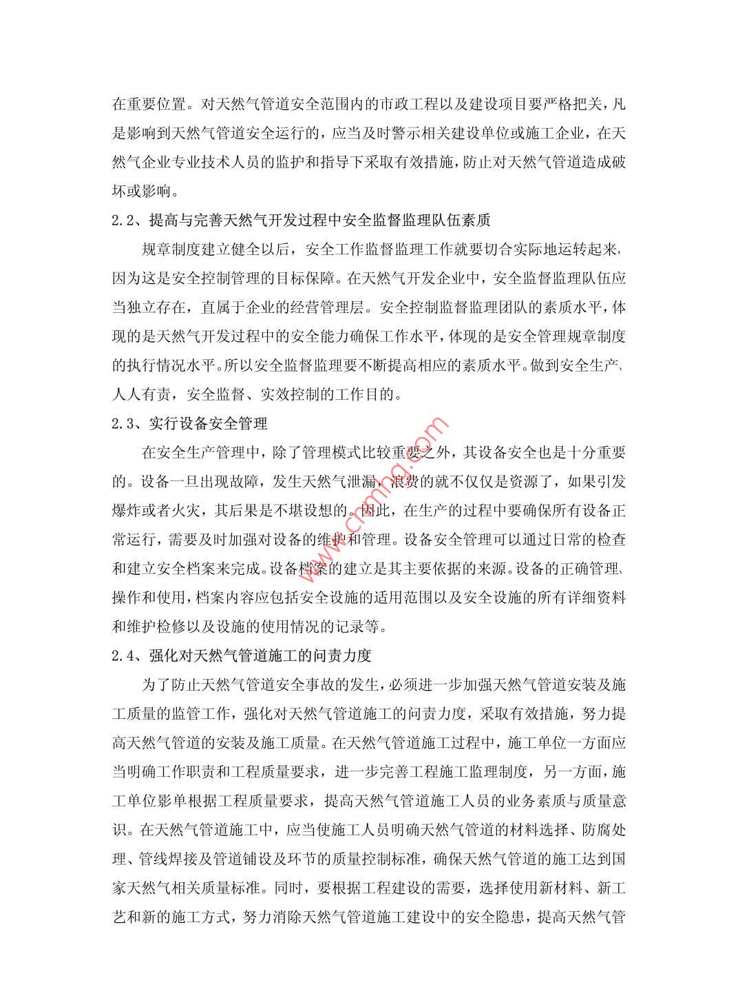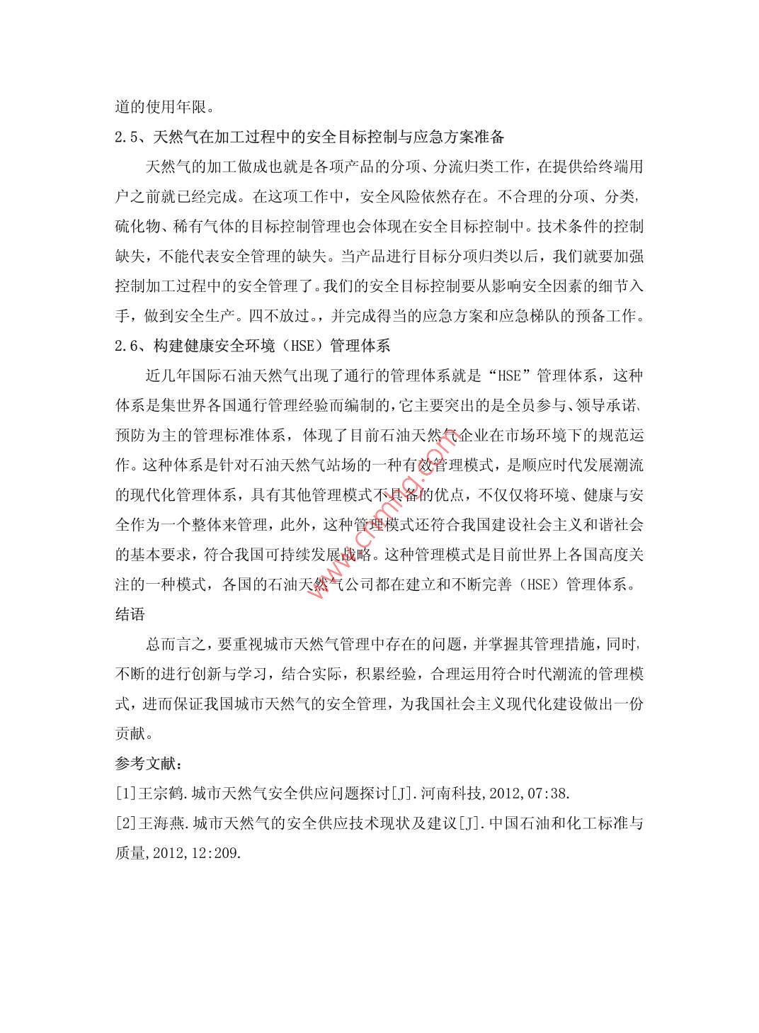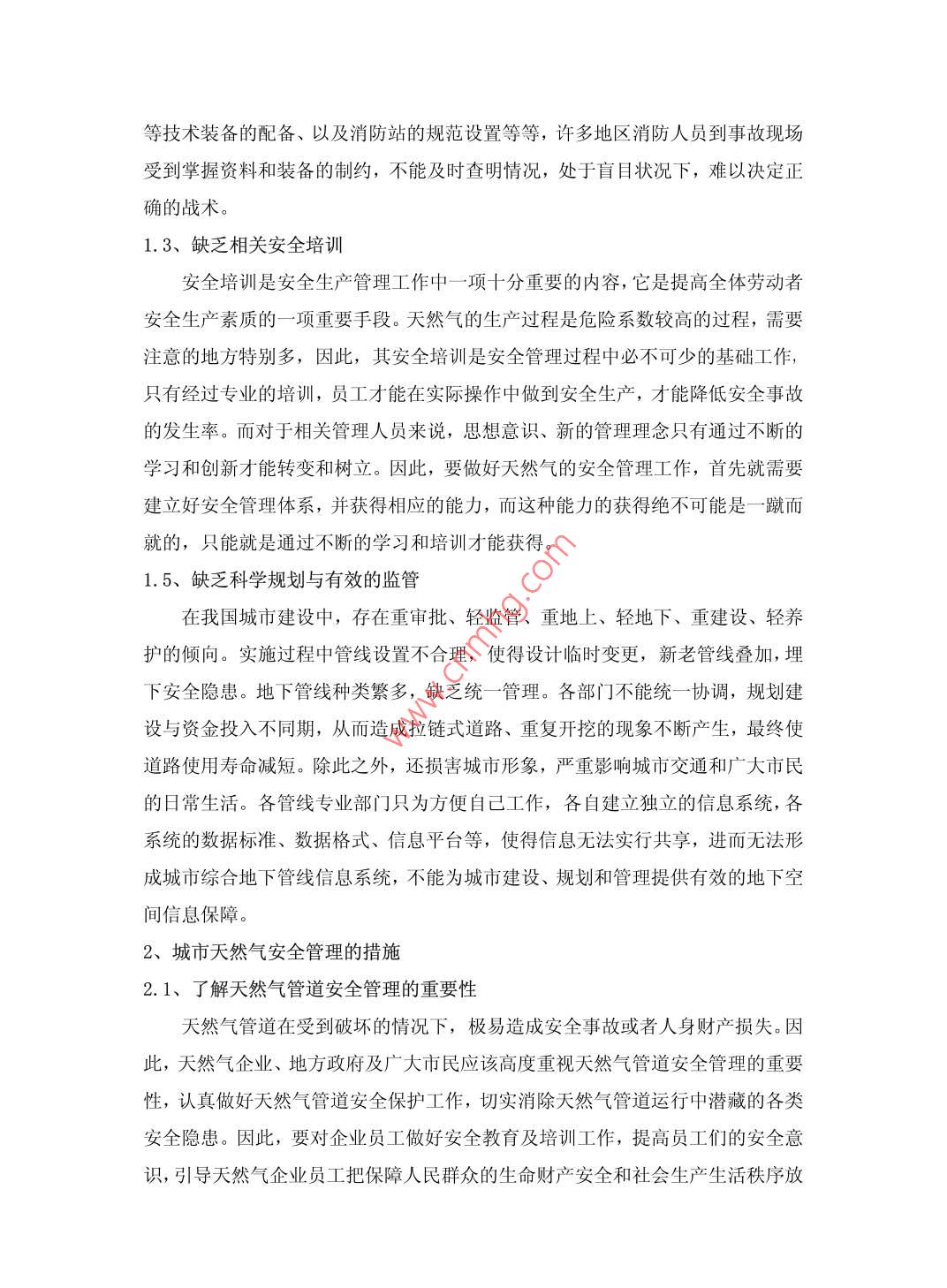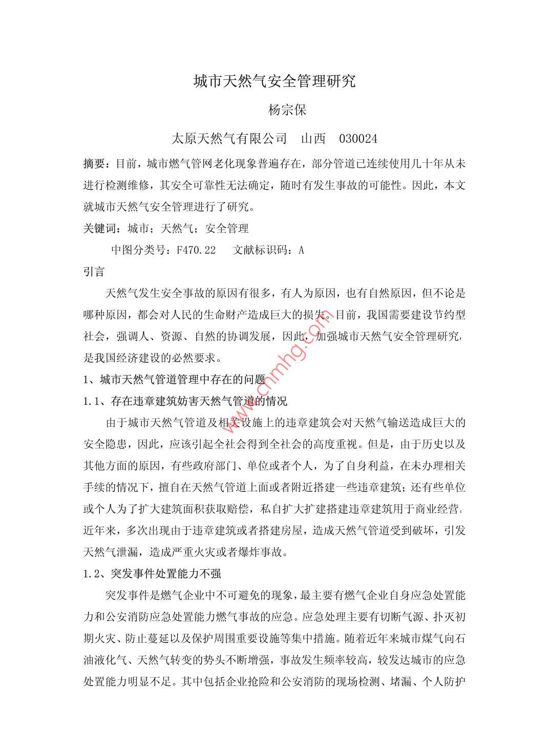 城市天然氣安全管理研究楊宗保太原天然氣有限公司山西030024摘要:目前,城市燃?xì)夤芫W(wǎng)老化現(xiàn)象普遍存在,部分管道已連續(xù)使用幾十年從未進(jìn)行檢測(cè)維修,其安全可靠性無(wú)法確定,隨時(shí)有發(fā)生事故的可能性。因此,本文就城市天然氣安全管理進(jìn)行了研究。關(guān)鍵詞:城市;天然氣;安全管理中圖分類號(hào):F470.22文獻(xiàn)標(biāo)識(shí)碼:A引言天然氣發(fā)生安全事故的原因有很多,有人為原因,也有自然原因,但不論是哪種原因,都會(huì)對(duì)人民的生命財(cái)產(chǎn)造成巨大的損失。目前,我國(guó)需要建設(shè)節(jié)約型社會(huì),強(qiáng)調(diào)人、資源、自然的協(xié)調(diào)發(fā)展,因此,加強(qiáng)城市天然氣安全管理研究,是我國(guó)經(jīng)濟(jì)建設(shè)的必然要求。1、城市天然氣管道管理中存在的問(wèn)題1.1、存在違章建筑妨害天然氣管道的情況由于城市天然氣管道及相關(guān)設(shè)施上的違章建筑會(huì)對(duì)天然氣輸送造成巨大的安全隱患,因此,應(yīng)該引起全社會(huì)得到全社會(huì)的高度重視。但是,由于歷史以及其他方面的原因,有些政府部門、單位或者個(gè)人,為了自身利益,在未辦理相關(guān)手續(xù)的情況下,擅自在天然氣管道上面或者附近搭建一些違章建筑;還有些單位或個(gè)人為了擴(kuò)大建筑面積獲取賠償,私自擴(kuò)大擴(kuò)建搭建違章建筑用于商業(yè)經(jīng)營(yíng)。近年來(lái),多次出現(xiàn)由于違章建筑或者搭建房屋,造成天然氣管道受到破壞,引發(fā)天然氣泄漏,造成嚴(yán)重火災(zāi)或者爆炸事故。突發(fā)事件處置能力不強(qiáng)突發(fā)事件是燃?xì)馄髽I(yè)中不可避免的現(xiàn)象,最主要有燃?xì)馄髽I(yè)自身應(yīng)急處置能力和公安消防應(yīng)急處置能力燃?xì)馐鹿实膽?yīng)急。應(yīng)急處理主要有切斷氣源、撲滅初期火災(zāi)、防止蔓延以及保護(hù)周圍重要設(shè)施等集中措施。隨著近年來(lái)城市煤氣向石油液化氣、天然氣轉(zhuǎn)變的勢(shì)頭不斷增強(qiáng),事故發(fā)生頻率較高,較發(fā)達(dá)城市的應(yīng)急處置能力明顯不足。其中包括企業(yè)搶險(xiǎn)和公安消防的現(xiàn)場(chǎng)檢測(cè)、堵漏、個(gè)人防護(hù)等技術(shù)裝備的配備、以及消防站的規(guī)范設(shè)置等等,許多地區(qū)消防人員到事故現(xiàn)場(chǎng)受到掌握資料和裝備的制約,不能及時(shí)査明情況,處于盲目狀況下,難以決定正確的戰(zhàn)術(shù)。1.3、缺乏相關(guān)安全培訓(xùn)安全培訓(xùn)是安全生產(chǎn)管理工作中一項(xiàng)十分重要的內(nèi)容,它是提高全體勞動(dòng)者安全生產(chǎn)素質(zhì)的一項(xiàng)重要手段。天然氣的生產(chǎn)過(guò)程是危險(xiǎn)系數(shù)較高的過(guò)程,需要注意的地方特別多,因此,其安全培訓(xùn)是安全管理過(guò)程中必不可少的基礎(chǔ)工作,只有經(jīng)過(guò)專業(yè)的培訓(xùn),員工才能在實(shí)際操作中做到安全生產(chǎn),才能降低安全事故的發(fā)生率。而對(duì)于相關(guān)管理人員來(lái)說(shuō),思想意識(shí)、新的管理理念只有通過(guò)不斷的學(xué)習(xí)和創(chuàng)新才能轉(zhuǎn)變和樹(shù)立。因此,要做好天然氣的安全管理工作,首先就需要建立好安全管理體系,并獲得相應(yīng)的能力,而這種能力的獲得絕不可能是一蹴而就的,只能就是通過(guò)不斷的學(xué)習(xí)和培訓(xùn)才能獲得。1.5、缺乏科學(xué)規(guī)劃與有效的監(jiān)管在我國(guó)城市建設(shè)中,存在重審批、輕監(jiān)管、重地上、輕地下、重建設(shè)、輕養(yǎng)護(hù)的傾向。實(shí)施過(guò)程中管線設(shè)置不合理,使得設(shè)計(jì)臨時(shí)變更,新老管線疊加,埋下安全隱患。地下管線種類繁多,缺乏統(tǒng)一管理。各部門不能統(tǒng)一協(xié)調(diào),規(guī)劃建設(shè)與資金投入不同期,從而造成拉鏈?zhǔn)降缆贰⒅貜?fù)開(kāi)挖的現(xiàn)象不斷產(chǎn)生,最終使道路使用壽命減短。除此之外,還損害城市形象,嚴(yán)重影響城市交通和廣大市民的日常生活。各管線專業(yè)部門只為方便自己工作,各自建立獨(dú)立的信息系統(tǒng),各系統(tǒng)的數(shù)據(jù)標(biāo)準(zhǔn)、數(shù)據(jù)格式、信息平臺(tái)等,使得信息無(wú)法實(shí)行共享,進(jìn)而無(wú)法形成城市綜合地下管線信息系統(tǒng),不能為城市建設(shè)、規(guī)劃和管理提供有效的地下空間信息保障。2、城市天然氣安全管理的措施了解天然氣管道安全管理的重要性天然氣管道在受到破壞的情況下,極易造成安全事故或者人身財(cái)產(chǎn)損失。因此,天然氣企業(yè)、地方政府及廣大市民應(yīng)該高度重視天然氣管道安全管理的重要性,認(rèn)真做好天然氣管道安全保護(hù)工作,切實(shí)消除天然氣管道運(yùn)行中潛藏的各類安全隱患。因此,要對(duì)企業(yè)員工做好安全教育及培訓(xùn)工作,提高員工們的安全意識(shí),引導(dǎo)天然氣企業(yè)員工把保障人民群眾的生命財(cái)產(chǎn)安全和社會(huì)生產(chǎn)生活秩序放在重要位置。對(duì)天然氣管道安全范圍內(nèi)的市政工程以及建設(shè)項(xiàng)目要嚴(yán)格把關(guān),凡是影響到天然氣管道安全運(yùn)行的,應(yīng)當(dāng)及時(shí)警示相關(guān)建設(shè)單位或