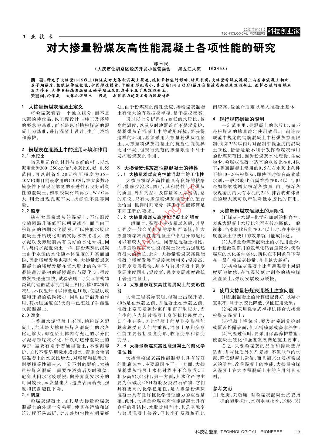 TEC科技創(chuàng)業(yè)家工業(yè)技術(shù)對(duì)大摻量粉煤灰高性能混凝土各項(xiàng)性能的研究郝玉民(大慶市讓胡路區(qū)經(jīng)濟(jì)開發(fā)小區(qū)管委會(huì)黑龍江大慶163458)摘要:研究了大摻量(30%以上)粉煤灰對(duì)大體積混凝土強(qiáng)度、抗裂等性能的影響。結(jié)果表明:大摻量粉煤灰混凝土與基準(zhǔn)混凝土相比,雖早期強(qiáng)度、極限拉伸值較低,但因彈性模量、干縮變形也減小,其后期(90d以后)強(qiáng)度會(huì)接近或超過基準(zhǔn)混凝土。選擇合適的粉煤灰及其摻量,大摻量粉煤灰混凝土的早期抗裂能力并不亞于基準(zhǔn)混凝土關(guān)鍵詞:粉煤灰大體積混凝土強(qiáng)度抗裂能力建筑石膏與膠凝材料1大摻量粉煤灰混凝土定義處。由于粉煤灰的滾珠效應(yīng),摻粉煤灰混凝例較高,侵蝕介質(zhì)難以滲入混凝土基體將粉煤灰看著一個(gè)獨(dú)立組分,而不是土有較大的有效振搗半徑,易于振搗密實(shí)。水泥的替代品,以工程設(shè)計(jì)與施工及環(huán)境通過以上分析得出較低的水膠比、較4現(xiàn)行規(guī)范摻量的限制的要求為基準(zhǔn),而不是以不摻粉煤灰的混高的溫度,以及及時(shí)地覆蓋而不是濕養(yǎng)護(hù)一定范圍里,是混凝土的水膠比,而不凝土為基準(zhǔn),進(jìn)行混凝土設(shè)計(jì)、生產(chǎn)、澆筑是粉煤灰在混凝土中的適用環(huán)境。要獲得是粉煤灰的摻量決定使用效果。目前許多和養(yǎng)護(hù)。這樣的環(huán)境,必須采用大摻量粉煤灰混凝規(guī)范中規(guī)定的鋼筋混凝土中粉煤灰摻量限2粉煤灰在混凝土中的適用環(huán)境和作用無可懷疑,但現(xiàn)行規(guī)范的摻制制(例如25%以內(nèi)),配制中低強(qiáng)度的混凝不利于土來說,恰恰是最不利于發(fā)揮粉煤灰作用發(fā)揮粉煤灰的作用。的粉煤灰范圍。因?yàn)榉勖夯宜徛?生成當(dāng)采用適合的材料與良好的*作,以水物少,粉煤灰混凝土適宜的水膠比在0.4以泥用量為300-350kg/m3,水灰比0.45-0.553大摻量粉煤灰高性能混凝土的特性下普通混凝土常用的0.5左右水灰比條件范圍,可以制備出28天抗壓強(qiáng)度為35-3.1大摻量粉煤灰高性能混凝土的工作性下?lián)?0-20%粉煤灰,即使同時(shí)摻有高效減40MP(即目前最常用的C30級(jí)),在大多數(shù)環(huán)大摻量粉煤灰高性能具有良好的粘聚水劑一般水膠比仍需維持在0.4以上。但境條件下呈現(xiàn)足夠低的滲透性和良好耐久性,能減少泌水。同時(shí),其和易性與粉煤灰是如果繼續(xù)增大粉煤灰摻量,由于粉煤灰性的混凝土。如果膠凝材料再少、W/C再的質(zhì)量、外加劑品種及摻量等關(guān)系密切。總表觀密度約只有水泥的2/3,拌合物漿體含大,則會(huì)出現(xiàn)孔隙率大、抗?jié)B性不良等問的來說,只有大摻量粉煤灰混凝土的配合量的增大就可以產(chǎn)生降低水膠比的作用。題。比恰當(dāng),攪拌時(shí)間充分,其工作性能夠滿足2.2溫度不同工程的要求。5大摻量粉煤灰混凝土的局限性摻有大量粉煤灰的混凝土,不僅溫度3.2大摻量粉煤灰高性能混凝土的強(qiáng)度(1)煤灰水泥化學(xué)外加劑的相容性,收縮因溫升降低可以明顯減小,而且由于一般而言,混凝土中摻粉煤灰后,其早表現(xiàn)為混凝土水膠比能否有效地降低,一般粉煤灰的初期水化緩慢,可以使低水膠比期強(qiáng)度一般會(huì)隨摻量的增加而降低。但大說來,當(dāng)水膠比只能在0.4以上時(shí),在中等強(qiáng)混凝土開始硬化時(shí)的實(shí)際水灰比增大,使摻量粉煤灰高性能混凝土中各組分的配比度混凝土中使用的效果就可能成問題;水泥以及膨脹劑具有良好的水化環(huán)境。同可以有較大的靈活性,同普通混凝土相比,(2)大量粉煤灰混凝土的水泥用量少時(shí),與純水泥混凝土一樣,摻粉煤灰的混凝大摻量粉煤灰高性能混凝土28天后強(qiáng)度還由于起激發(fā)作用的氫氧化鈣含量減少,使粉土由于水泥的水化隨本體溫度的升高而加有很大的增長(zhǎng)。此外,大摻量粉煤灰高性能煤灰的水化條件劣化,所以在不同條件下存快,因此強(qiáng)度發(fā)展也要加快,大摻量粉煤灰混凝土強(qiáng)度發(fā)展同溫度密切相關(guān);溫度高,在一最佳粉煤灰摻量,并非越大越好混凝土的強(qiáng)度發(fā)展在低水膠比的條件下,其強(qiáng)度發(fā)展很快,基本與普通混凝土強(qiáng)度很快通過最初的緩慢凝結(jié)與硬化期,強(qiáng)度發(fā)展速度同步;溫度低,強(qiáng)度發(fā)展速度遠(yuǎn)低度更為敏感,在氣溫較低時(shí)制備的摻粉煤的發(fā)展迅速加快。試驗(yàn)表明:與實(shí)際結(jié)構(gòu)物于普通混凝土?;一炷?強(qiáng)度發(fā)展較為緩慢。澆筑的硅酸鹽水泥混凝土相比,摻30%粉煤3.3大摻量粉煤灰高性能混凝土的變形性灰后,不僅溫升可以降低近10度,使溫度收能6使用大摻量粉煤灰混凝土注意問題縮和開裂的危險(xiǎn)減小,同時(shí)由于溫升的作大量工程實(shí)際表明,混凝土出現(xiàn)開裂,(1)配制混凝土的骨料級(jí)配良好,以減小用,其抗壓強(qiáng)度在3天前早已超過了硅酸鹽水泥混凝土。混凝土變形受到約束作用而產(chǎn)生應(yīng)力,當(dāng)(2)必須采用強(qiáng)制式攪拌機(jī)拌合大摻量2.3濕度產(chǎn)生的應(yīng)力超過混凝土身軀抗拉強(qiáng)度時(shí),粉煤灰混凝土;與普通水泥混凝土不同,摻粉煤灰混即產(chǎn)生開裂。因此混凝土