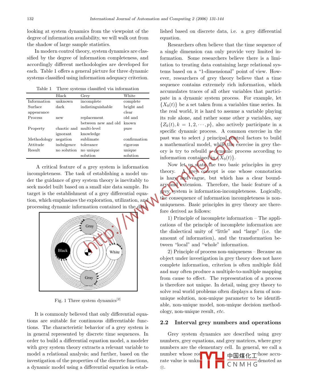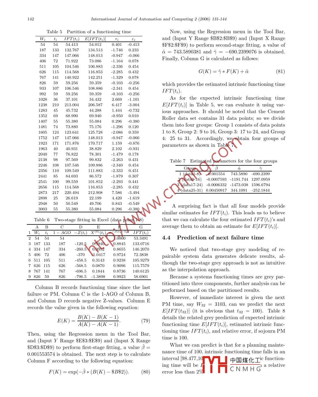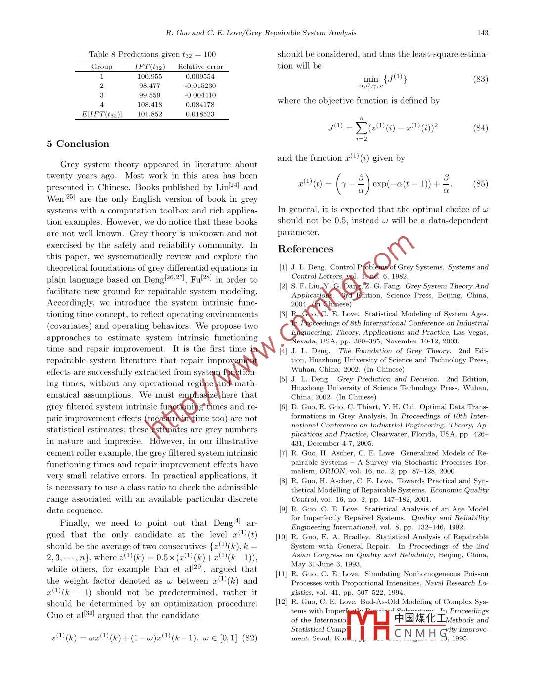 Grey Repairable System AnalysisRenkuan Guo*Department of Statistical Sciences, University of Cape Town, Cape Town, South AfricaCharles Ernie LoveFaculty of Business Administrations, Simon Fraser University, Burnaby, B. C. V5A 1S6, CanadaAbstract: In this paper, we systematically discuss the basic concepts of grey theory, particularly the grey differential equa-tion and its mathematical foundation, which is essentially unknown in the reliability engineering community. Accordingly,we propose a small-sample based approach to estimate repair improvement effects by partitioning system stopping timesinto intrinsic functioning times and repair improvement times. An industrial data set is used for ilustrative purposes in astepwise manner.Keywords: Grey theory, grey differential equation, intrinsic functioning times, repair improvement effects.1 Introductionhidden behind the collected data, and not the under-lying distribution. As long as a dynamic rule, even aDifferent from a mathematician, a statistician mustlocal and imprecise one is discovered, why should we beanalyze data collected from the real world and extractconcerned what distribution governs the data? In sum-rule(s) about reality from the data. Quite often, statis-mary, the adequateness of information depends uponticians luse existing sample distributions as a guidelinethe way we extract dynamics from the data. It may beto fit data and perform statistical hypothesis testing. Adistribution in mind is a priori knowledge in nature. Itby statistician's distributional thinking. Such a think-is often the exercise that for given data, according to re-ing logic has dominated statisticians for more than alated literature or his/ her own experience, a researchercentury, and has created today's large-sample statisti-estimates parameters according to a class of distribu-cal theory empire. A realistic data analyst should betion and an asymptotic variance-covariance matrix forconcerned with the final destination - the dynamicsestimators. As long as the statistical significance levelunderlying the data rather than the route of thinking.is satisfactory, most researchers will happily report andIn this paper, we are trying to engage in an effortpublish their findings. Therefore, a critical requirementto extract dynamics information underlying a discreteto facilitate statistical data analysis is that a sampledata sequence in terms of grey thinking, typically withsize be large enough. Such a prerequisite makes clas-a small sample size (as little as four). For this rea-sical statistics powerless whenever facing a small datason, we will use the next section to introduce the basicsample. It is obvious that statistical thinking - i.e.concepts of grey system theoryl1.drawing a conclusion from data, be corrected, but sucha correct intention is often haunted by small sample2 Grey processessize, which is often regarded as inadequate information.How much information is adequate is a matter to .2.1 Grey theory in generalbe debated. According to standard statistical thinking,a dynamic rule underlying collected data is discoveredA methodology to solve random uncertainty is prob-by distribution-fitting; therefore, large sample theoryability and statistics, i.e. to treat data in terms of sta-is inevitably employed. In this thinking pattern, onlytistical laws and prior (probability) laws. Since statis-information contained in a large enough sample is ad-tical laws are established via large samples, the moreequate. However, what is critical is the dynamic lawthe data the better will be the analysis. Therefore,straightforward statistical modeling is often dificult toManuscript received September 27, 2005; revised January 8,perform, and som中國煤化工°cost con-2006.siderations). If VYHCNMH and lok at* Corresponding author. E-mail address: rguo@stats.uct.ac.zathe real world froSxample by132International Journal of Automation and Computing 2 (2006) 131-144looking at system dynamics from the viewpoint of thelished based on discrete data, ie. a grey diferentialdegree of information availability, we will walk out fromequation.the shadow of large sample statistics.Researchers often believe that the time sequence ofIn modern control theory, system dynamics are clas-a single dimension can only provide very limited in-sified by the degree of information completeness, andformation. Some researchers believe there is a limi-accordingly diferent methodologies are developed fortation to treating data containing large relational sys-each. Table 1 offers a general picture for three dynamictems based on a“1-dimensional”point of view. How-systems classified using information adequacy criterion.ever,researchers of grey theory believe that a timesequence contains extremely rich information, whichTable 1 Three systems classifed via informationBlackGreyWhitepate in a dynamic system process. For example, letInformationindistinguishablebright and{Xo(t)} be a set taken from a variables time series. Inppearance:learthe real world, it is hard to assume a variable playingProcessnewreplacementold andits role alone, and rather some other p variables, saybetween new and old known{Zk(t),k: = 1,2,.,p}, also actively participate in aPropertychaotic and multi- levelpurespecific dynamic process. A common exercise in theignorant knowledgeMethodology negation sublimateconfirmation)ast was to select j principal control factors to buildAttitudeindulgence tolerancerigorousa mathematical model, while the exercise in grey the-Resultno solution no uniqueuniqueory is try to rebuild a dynamic process according tosolutioninformation contained in {Xo(t)}. .A critical feature of a grey system is informationNow let us state the two basic principles in greyincompleteness. The task of establishing a model un-theory. A grey concept is one whose connotationder the guidance of grey system theory is inevitably tois hazy and vague, but which has a clear bound-seek model built based on a small size data sample. Itsary an