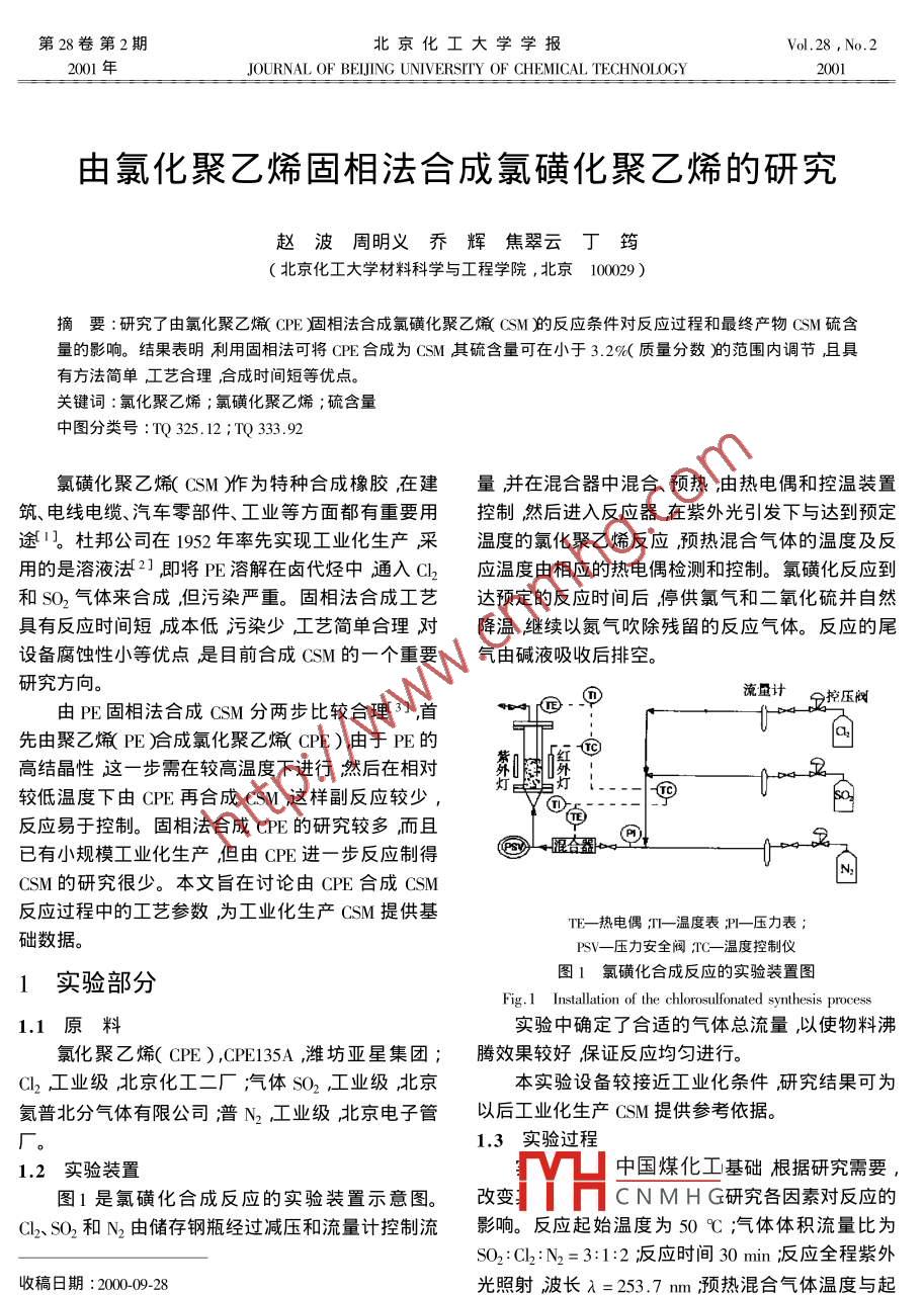 第28卷第2期北京化工大學(xué)學(xué)報(bào)Vol.28 ,No.22001年JOURNAL OF BEIJING UNIVERSITY OF CHEMICAL TECHNOLOGY2001由氯化聚乙烯固相法合成氯磺化聚乙烯的研究X波周明義喬輝焦翠云丁筠(北京化工大學(xué)材料科學(xué)與工程學(xué)院,北京100029)摘要:研究了由氯化聚乙烯( CPE固相法合成氯磺化聚乙烯CSM )的反應(yīng)條件對(duì)反應(yīng)過(guò)程和最終產(chǎn)物CSM硫含量的影響。結(jié)果表明利用固相法可將CPE合成為CSM其硫含量可在小于3.2%(質(zhì)量分?jǐn)?shù))的范圍內(nèi)調(diào)節(jié),且具有方法簡(jiǎn)單工藝合理,合成時(shí)間短等優(yōu)點(diǎn)。關(guān)鍵詞:氯化聚乙烯;氯磺化聚乙烯;硫含量中圖分類號(hào):TQ 325. 12 ;TQ 33.92氯磺化聚乙烯( CSM )作為特種合成橡膠在建量并在混合器中混合、預(yù)熱,由熱電偶和控溫裝置筑、電線電纜、汽車零部件、工業(yè)等方面都有重要用控制然后進(jìn)入反應(yīng)器在紫外光引發(fā)下與達(dá)到預(yù)定;途1。杜邦公司在1952年率先實(shí)現(xiàn)工業(yè)化生產(chǎn)采溫度的氯化聚乙烯反應(yīng)預(yù)熱混合氣體的溫度及反用的是溶液法2]即將PE溶解在鹵代烴中通入Cl2應(yīng)溫度由相應(yīng)的熱電偶檢測(cè)和控制。氯磺化反應(yīng)到和SO2氣體來(lái)合成,但污染嚴(yán)重。固相法合成工藝達(dá)預(yù)定的反應(yīng)時(shí)間后,停 供氯氣和二氧化硫并自然具有反應(yīng)時(shí)間短成本低污染少工藝簡(jiǎn)單合理對(duì)降溫繼續(xù)以氮?dú)獯党龤埩舻姆磻?yīng)氣體。反應(yīng)的尾設(shè)備腐蝕性小等優(yōu)點(diǎn)是目前合成CSM的一個(gè)重要?dú)庥蓧A液吸收后排空。研究方向。流量計(jì)倉(cāng)挖壓閥由PE固相法合成CSM分兩步比較合理3],首先由聚乙烯( PE冶成氯化聚乙烯CPE) ,由于PE的tr 向高結(jié)晶性這-步需在較高溫度下進(jìn)行然后在相對(duì)燈燈四較低溫度下由CPE再合成CSM這樣副反應(yīng)較少,Yo網(wǎng)反應(yīng)易于控制。固相法合成CPE的研究較多而且2已有小規(guī)模工業(yè)化生產(chǎn)但由CPE進(jìn)-步反應(yīng)制得troCSM的研究很少。本文旨在討論由CPE合成CSM反應(yīng)過(guò)程中的工藝參數(shù)為工業(yè)化生產(chǎn)CSM提供基TE-熱電偶;TI-溫度表;PI- -壓力表;礎(chǔ)數(shù)據(jù)。PSV-壓力安全閥;TC-溫度控制儀圖1氯磺化合成反應(yīng)的實(shí)驗(yàn)裝置圖1實(shí)驗(yàn)部分Fig.1Installation of the chlorosulfonated synthesis process1.1原料實(shí)驗(yàn)中確定了合適的氣體總流量,以使物料沸氯化聚乙烯( CPE ) ,CPE135A ,濰坊亞星集團(tuán);騰效果較好保證反應(yīng)均勻進(jìn)行。C2工業(yè)級(jí),北京化工二廠;氣體SO2 ,工業(yè)級(jí),北京本實(shí)驗(yàn)設(shè)備較接近工業(yè)化條件研究結(jié)果可為氦普北分氣體有限公司普N2工業(yè)級(jí)北京電子管以后工業(yè)化生產(chǎn)CSM提供參考依據(jù)。廠。1.3實(shí)驗(yàn)過(guò)程1.2實(shí)驗(yàn)裝置中國(guó)煤化工基礎(chǔ)根據(jù)研究需要,圖1是氯磺化合成反應(yīng)的實(shí)驗(yàn)裝置示意圖。.改變MYHCNMHG研究各因素對(duì)反應(yīng)的Cl2、SO2和N2由儲(chǔ)存鋼瓶經(jīng)過(guò)減壓和流量計(jì)控制流影響。反應(yīng)起始溫度為50 C ;氣體體積流量比為SO2:Cl2:N2= 3:1:2 ;反應(yīng)時(shí)間30 min ;反應(yīng)全程紫外收稿日期:2000-09-28光照射波長(zhǎng)λ=253.7nm;預(yù)熱混合氣體溫度與起第一作者:男,1970年生工學(xué)碩士始反應(yīng)溫度相同。第2期趙波等:由氯化聚乙烯固相法合成氯磺化聚乙烯的研究31.1.4測(cè)試方法表2起始反應(yīng)溫 度與產(chǎn)物硫含量的關(guān)系硫含量按吉化Q/JH 35- -83 標(biāo)準(zhǔn)測(cè)定。氯含量Table 2 Change of sulphur content of CSM with按GB9872- -88 標(biāo)準(zhǔn)測(cè)定。initial temperature初始溫度/Cu(S)%2結(jié)果與討論2(2.452.1氯磺化反 應(yīng)的表征352.55實(shí)驗(yàn)中測(cè)試原料CPE及產(chǎn)物CSM硫含量和氯5(2.43含量的變化結(jié)果列于表1。62.62表1原料CPE 及產(chǎn)物CSM中的硫含量和氯含量2.3氣體流 量比的影響Table 1 The sulphur and chlorine content of CPE and CSM反應(yīng)中使用了三種氣體為了方便研究實(shí)驗(yàn)中聚合物u( C1)%將具有反應(yīng)活性的SO2和Cl2與反應(yīng)惰性的N2分別CPE35.6討論。CSM1.537.42.3.1 SO2 和Cl2流量比的影響固定N2流量及.表1中數(shù)據(jù)表明合成的CSM中硫含量的增加其它反應(yīng)條件,改變SO2和Cl2流量比測(cè)定氯磺化量為1.5氯含量的增加量為1.8兩者基本上是按1反應(yīng)產(chǎn)物CSM硫含量(見(jiàn)表3):1的摩爾比增加的。圖2是反應(yīng)前后原料及產(chǎn)物表3反應(yīng)氣體比與產(chǎn) 物硫含量的關(guān)系的紅外光譜圖。Table 3 Relation of sulphur content of CSM andratio of reaction gasescsMhq( SO2):q(C2)3:12.232:11:2.63表3反映出隨著Cl2含量的增加,產(chǎn)物硫含量也隨之增高。根據(jù)下列反應(yīng)方程式3]1822111756RH + SO2 + Cl2- >RSO2Cl + HClσ/cm ISO2與C2的理論消耗量是相同的,即其摩爾比圖2CPE及CSM的紅外光譜圖為1:1。從反應(yīng)結(jié)果來(lái)看反應(yīng)氣體S02與Cl2越接Fig.2 IR curves of CSM and CPE近于理論摩爾比反應(yīng)越劇烈產(chǎn)物含硫量也增加。由圖2可看到在波數(shù)1 162 cm-'、1 408 cm-'出.2.3.2 N2 流量比對(duì)反應(yīng)的影響N2 流量在總流量現(xiàn)SO2Cl特征峰,可以證明實(shí)驗(yàn)中發(fā)生的只