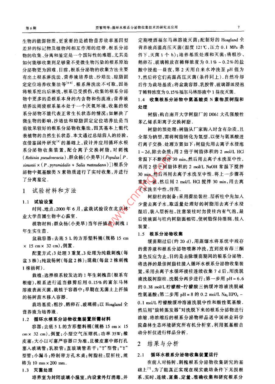第25卷第6期北京林業(yè)大學(xué)學(xué)報(bào)Vol.25, No.62003年11月JOURNAL OF BEIJING FORESTRY UNIVERSITYNow.. 2003循環(huán)水根系分泌物收集技術(shù)的研究及應(yīng)用*賈黎明馮菊芬文學(xué)軍孫焱(北京林業(yè)大學(xué)資源與環(huán)境學(xué)院) (山東 省淄博市國(guó)林管理處)摘要該文作者于2000年設(shè)計(jì)并應(yīng)用循環(huán)水根系分泌物收集裝置,結(jié)合D061型樹(shù)脂柱收集了純裁和混栽條件下楊樹(shù)與刺槐氨基酸類(lèi)N索根系分泌物,并對(duì)其物質(zhì)形態(tài)進(jìn)行了初步研究.結(jié)果表明:循環(huán)水根系分泌物收集裝置能夠正常運(yùn)轉(zhuǎn),真正實(shí)現(xiàn)了在現(xiàn)實(shí)裁培條件下無(wú)損根系,實(shí)時(shí)、連續(xù)、富樂(lè)定量、準(zhǔn)確收集和研究根系分泌物.僅僅7d時(shí)間即可收集到根系分泌物中的多種氨基酸.并達(dá)到可檢出的量精氨酸和甘氨酸是純裁刺槐根系分泌物中的主要氨基酸,占游離氨基酸總量的43.2%;而精氨酸和賴(lài)氨酸是純裁楊樹(shù)以及混裁苗木根系分必物中的主要氨基酸.循環(huán)水根系分泌物收集技術(shù)為根系分泌物的深入研究提供了方法上的保障.關(guān)鍵詞根系分泌物,收集裝置,楊樹(shù),刺槐,混交林,種間關(guān)系中圖分類(lèi)號(hào)S718.43Jia Liming; Feng Jufen; Wen Xuejun; Sun Yan. Cycling water collection technique on root exudates andits application. Jourmal of Beijing Forestry University (2003)25(6)6-10 [Ch,9 ref.] School of Resourcesand Environment, Beijing For. Univ., 10083, P. R. China. .Amino acids in nitrogen root exudates of pure and mixed planted black locust and poplar seedlings werecollected and identified by the designed cycling water olleetion device of moot exudates and D061 ion-ex-change rsin in this paper. It shows thal: the ecycling- water cllection device of root exudates could be operatednormally. The certain amounts of root exudates are enriched in the device that makes the materials collectionsccessful without damaging the roots in time and continuously as well. Only by seven days, many kinds ofamino acids in nitrogen root exudates were collected and detected quantitatively. Anginine and glycin were themain kinds of amino acids in root exudates of pure planted black locust seedlings and reached 43.2% in disso-ciative amino acids. Anginine and lysine were the main kinds of amino acids in root exudates of pure plantedpoplar seedlings and mixed planted poplar and black locust seedlings. It is concluded that the ecycling- watercollection technique is much better than other methods to conduct the study on root exudates。Key words root exudates,clletion device, poplar, black locust, mixed forest, interspecific relationship我國(guó)對(duì)混交群落樹(shù)種間關(guān)系的研究經(jīng)歷了約主導(dǎo)作用的是養(yǎng)分關(guān)系,這種關(guān)系不僅表現(xiàn)為對(duì)土50年,從對(duì)樹(shù)種聞關(guān)系現(xiàn)象的簡(jiǎn)單描述逐步上升到壤的改良,而且也表現(xiàn)為樹(shù)種間N、P養(yǎng)分的互補(bǔ)轉(zhuǎn)對(duì)樹(shù)種間關(guān)系機(jī)理的深入研究上,取得了一大批研移,即通過(guò)根際微區(qū)楊樹(shù)可以轉(zhuǎn)移磷給刺槐,而刺槐究成果.尤其是進(jìn)入20世紀(jì)90年代,在國(guó)家自然科可將固定的氮轉(zhuǎn)移給楊樹(shù)12-4),這種轉(zhuǎn)移主要通過(guò)根學(xué)基金的多次重點(diǎn)資助下,對(duì)樹(shù)種間相互作用機(jī)制系的相互接觸來(lái)完成5).本文則欲通過(guò)研究?jī)蓸?shù)種的了解越來(lái)越深人,在化感作用、以養(yǎng)分關(guān)系為主的的根系分泌物組成,進(jìn)--步探索兩樹(shù)種養(yǎng)分轉(zhuǎn)移的生理生態(tài)相互作用機(jī)制等多方面都取得了重要突物質(zhì)形態(tài),從而為揭示樹(shù)種間養(yǎng)分轉(zhuǎn)移的生態(tài)學(xué)意破" .這一時(shí)期,北京林業(yè)大學(xué)“混交林及樹(shù)種間相義奠定基礎(chǔ),并為今后的研究進(jìn)行方法上的探索.互作用機(jī)制”課題組以楊樹(shù)、刺槐混交林為模式群落對(duì)根系分泌物的研究是植物營(yíng)養(yǎng)、化感作用、根對(duì)樹(shù)種間相互作用機(jī)制進(jìn)行了深人研究.前期研究際微生態(tài)研究的重要內(nèi)容,受到國(guó)內(nèi)外的普遍重視.發(fā)現(xiàn),在楊樹(shù)刺槐混交林樹(shù)種間復(fù)雜相互關(guān)系中起因?yàn)橹参锔置谖锊粌H是根-土界面的潤(rùn)濕劑、微2003-04-16 收精htp://ww . wanfangdata. com.cn●國(guó)家自然科學(xué)基金重點(diǎn)項(xiàng)目(39230280)和國(guó)家自然科學(xué)基金項(xiàng)目(39870643)共同資助,第一作者:賈繁明,男,1968年生,博士,副教授.主姜研究方向:森林培育、城市林業(yè)。電話:010-62338194 E mljim@bjfu.edu.cn地址:100083北京林業(yè)大學(xué)資源與環(huán)境學(xué)院.第6期賈絮明等:循環(huán)水根系分泌物收類(lèi)技術(shù)的研究及應(yīng)用生物的能源物質(zhì),更重要的是植物營(yíng)養(yǎng)效率基因型定期噴灑福爾馬林溶液滅菌;配制好的Hoagland全差異的標(biāo)記物及植物間相互作用的紐帶.根系分泌背養(yǎng)液高溫高壓滅菌(溫度1219C,壓力0.1 MPa條物的收集、分離和鑒定是一個(gè)國(guó)際性的難題,尤其是件下,滅菌1個(gè)b);培養(yǎng)基質(zhì)處理和滅菌:將粗沙、如何能夠收集到足夠量不受微生物污染的根系原始鵝卵石、玻璃棉放在稀釋濃度為0.1% ~ 0.2%的鹽分泌物更為困難.目前,根系分泌物的收集方法主