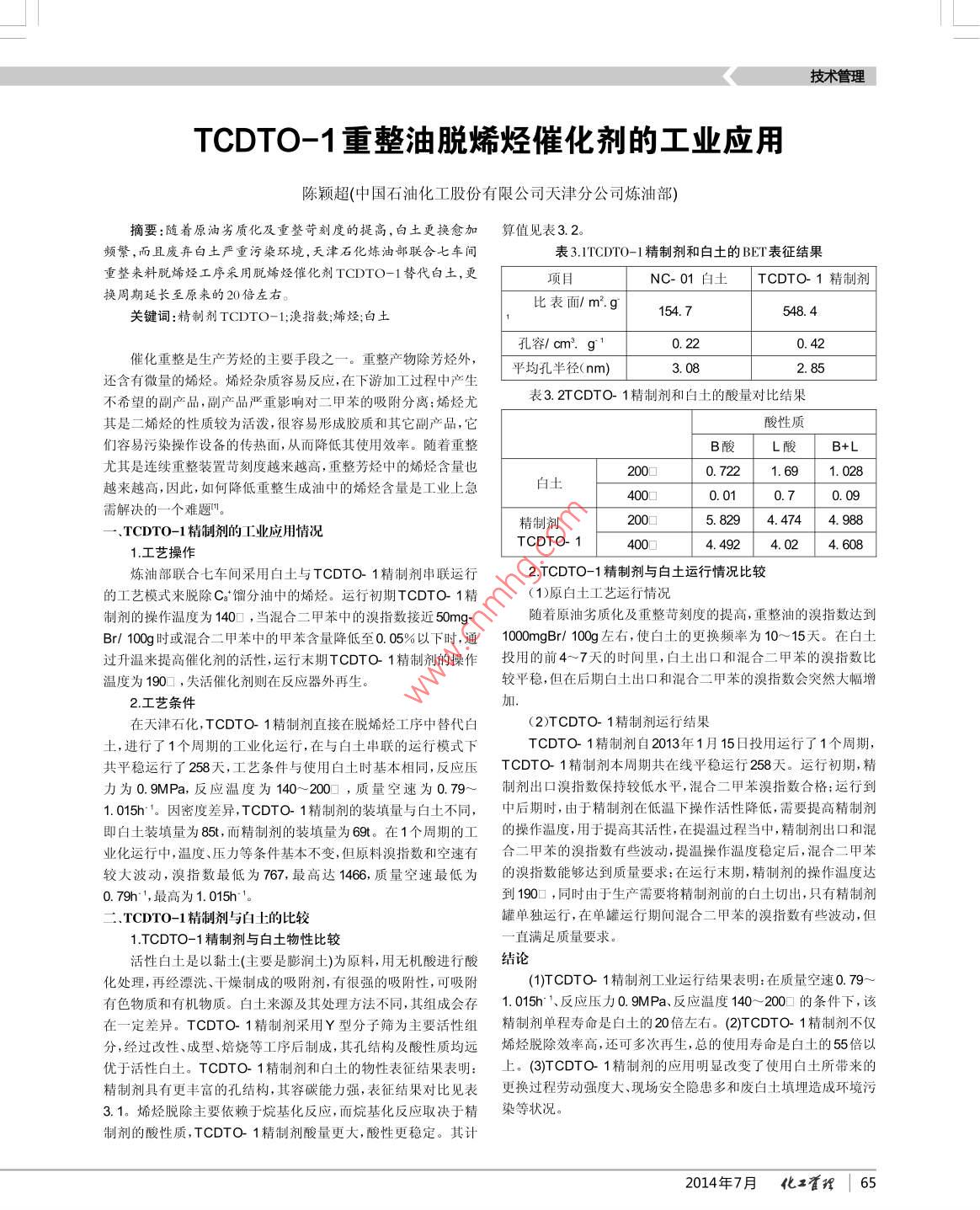 技術(shù)管理TCDTO-1重整油脫烯烴催化劑的工業(yè)應(yīng)用陳穎超(中國(guó)石油化工股份有限公司天津分公司煉油部)摘要:隨著原油劣質(zhì)化及重整苛刻度的提高,白土更換愈加算值 見(jiàn)表3.2。頻繁,而且廢棄白土嚴(yán)重污染環(huán)境,天津石化煉油部聯(lián)合七車間表31TCDTO-1精制劑和白土的BET表征結(jié)果重整來(lái)料脫烯烴工序采用脫烯烴催化劑TCDTO-1替代白土,更項(xiàng)目NC-01白土| TCDTO- 1精制劑換周期延長(zhǎng)至原來(lái)的20倍左右。比表面/m'.g154. 7548. 4關(guān)鍵詞:精制劑TCDTO- 1;溴指數(shù);烯烴;白土孔容/ cm?,g 10.220. 42催化重整是生產(chǎn)芳烴的主要手段之- +。 重整產(chǎn)物除芳烴外,還含有微量的烯烴。烯烴雜質(zhì)容易反應(yīng),在下游加工過(guò)程中產(chǎn)生平均孔半徑( nm)3. 082. 85不希望的副產(chǎn)品,副產(chǎn)品嚴(yán)重影響對(duì)二甲苯的吸附分離;烯烴尤表3. 2TCDTO- 1精制劑和白土的酸量對(duì)比結(jié)果其是二烯烴的性質(zhì)較為活潑,很容易形成膠質(zhì)和其它副產(chǎn)品,它酸性質(zhì)們?nèi)菀孜廴静僮髟O(shè)備的傳熱面,從而降低其使用效率。隨著重整B酸L酸B+L尤其是連續(xù)重整裝置苛刻度越來(lái)越高,重整芳烴中的烯烴含量也2000. 7221. 691.028越來(lái)越高,因此,如何降低重整生成油中的烯烴含量是工業(yè)上急白士4000.010.70.09需解決的一個(gè)難題"。精制劑5. 8294.4744. 988一. TCDTO-1精制劑的工業(yè)應(yīng)用情況TCDTO- 14. 4924. 024. 6081.工藝操作煉油部聯(lián)合七車間采用白土與TCDTO-1精制劑串聯(lián)運(yùn)行2.TCDT0-1精制劑與白土運(yùn)行情況比較的工藝模式來(lái)脫除C。*餾分油中的烯烴。運(yùn)行初期TCDTO- 1精(1)原白土工藝運(yùn)行情況制劑的操作溫度為140口, 當(dāng)混合二甲苯中的溴指數(shù)接近50mg-隨著原油劣質(zhì)化及重整苛刻度的提高,重整油的溴指數(shù)達(dá)到Br/ 100g時(shí)或混合二甲苯中的甲苯含量降低至0.05%以下時(shí),通100mgBr/ 100g左右,使白上的更換頻率為10~ 15天。 在白土.過(guò)升溫來(lái)提高催化劑的活性,運(yùn)行末期TCDTO 1精制劑的操作投用的前 4~ 7天的時(shí)間里,白土出口和混合二甲苯的溴指數(shù)比溫度為190]. ,失活催化劑則在反應(yīng)器外再生。較平穩(wěn),但在后期白土出口和混合二甲苯的溴指數(shù)會(huì)突然大幅增2.工藝條件加在天津石化,TCDTO- 1精制劑直接在脫烯烴工序中替代白(2)TCDTO- 1精制劑運(yùn)行結(jié)果土,進(jìn)行了1個(gè)周期的工業(yè)化運(yùn)行,在與白土串聯(lián)的運(yùn)行模式下TCDTO- 1精制劑自2013年1月15日投用運(yùn)行了1個(gè)周期,共平穩(wěn)運(yùn)行了258天,工藝條件與使用白士時(shí)基本相同,反應(yīng)壓TCDTO- 1精制劑本周期共在線平穩(wěn)運(yùn)行258天。運(yùn)行初期,精力為0.9MPa,反應(yīng)溫度為140~ 200 , 質(zhì)量空速為0.79~制劑出 口溴指數(shù)保持較低水平,混合二甲苯溴指數(shù)合格:運(yùn)行到1. 015h'。因密度差異,TCDTO- 1精制劑的裝填量與白土不同,中 后期時(shí),由于精制劑在低溫下操作活性降低,需要提高精制劑即白上裝填量為85t,而精制劑的裝填量為69t。在1個(gè)周期的工的操作溫度, 用于提高其活性,在提溫過(guò)程當(dāng)中,精制劑出口和混業(yè)化運(yùn)行中,溫度、壓力等條件基本不變,但原料溴指數(shù)和空速有合 二甲苯的溴指數(shù)有些波動(dòng),提溫操作溫度穩(wěn)定后,混合二甲苯較大波動(dòng),溴指數(shù)最低為767,最高達(dá)1466,質(zhì)量空速最低為的溴指數(shù)能夠達(dá)到質(zhì)量要求:在運(yùn)行末期,精制劑的操作溫度達(dá)0.79h*',最高為1. 015h1到190口,同時(shí)由于生產(chǎn)需要將精制劑前的白土切出,只有精制劑二TCDTO-1精制劑與白土的比較罐單獨(dú)運(yùn)行,在單罐運(yùn)行期間混合二甲苯的溴指數(shù)有些波動(dòng),但1.TCDTO-1精制劑與白土物性比較一直滿 足質(zhì)量要求?;钚园淄潦且责ね?(主要是膨潤(rùn)上土)為原料,用無(wú)機(jī)酸進(jìn)行酸結(jié)論化處理,再經(jīng)漂洗、干燥制成的吸附劑,有很強(qiáng)的吸附性,可吸附(1)TCDTO-1精制劑工業(yè)運(yùn)行結(jié)果表明:在質(zhì)量空速0.79~有色物質(zhì)和有機(jī)物質(zhì)。白土來(lái)源及其處理方法不同,其組成會(huì)存1. 015hi、反應(yīng)壓力0.9MPa、反應(yīng)溫度140~ -200口] 的條件下,該在一定差異。TCDTO- 1精制劑采用Y型分子篩為主要活性組精制劑 單程壽命是白土的20倍左右。(2)TCDTO- 1精制劑不僅分,經(jīng)過(guò)改性、成型、焙燒等工序后制成,其孔結(jié)構(gòu)及酸性質(zhì)均遠(yuǎn)烯烴脫除效率高,還可多次再生,總的使用壽命是自土的55倍以優(yōu)于活性白上。TCDTO- 1精制劑和白土的物性表征結(jié)果表明:上。 (3)TCDTO- 1精制劑的應(yīng)用明顯改變了使用白土所帶來(lái)的精制劑具有更豐富的孔結(jié)構(gòu),其容碳能力強(qiáng),表征結(jié)果對(duì)比見(jiàn)表更 換過(guò)程勞動(dòng)強(qiáng)度大、現(xiàn)場(chǎng)安全隱患多和廢白土填埋造成環(huán)境污3.1.烯烴脫除主要依賴于烷基化反應(yīng),而烷基化反應(yīng)取決于精染 等狀況。制劑的酸性質(zhì), TCDTO- 1精制劑酸量更大,酸性更穩(wěn)定。其計(jì)2014年7月化工管理| 65