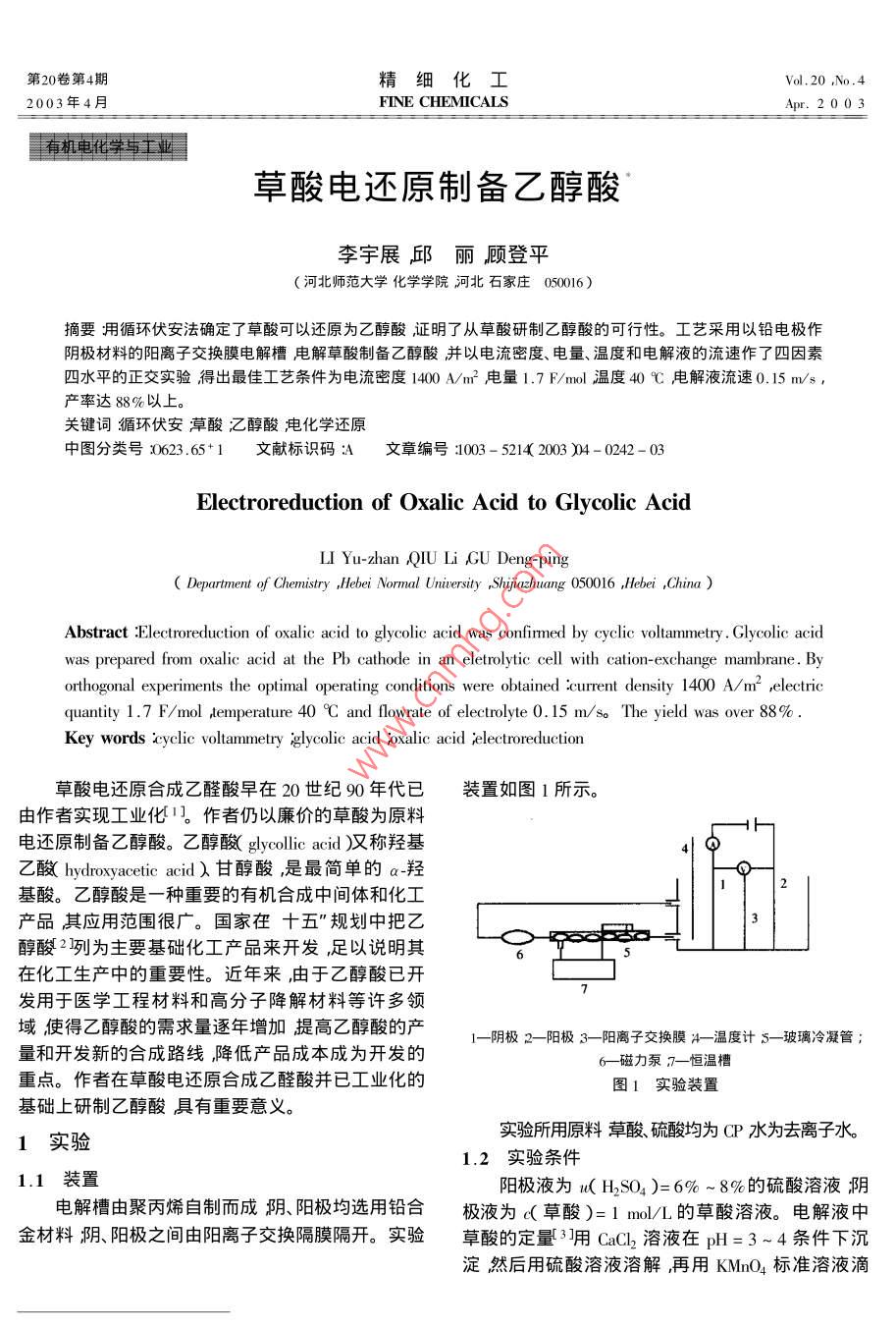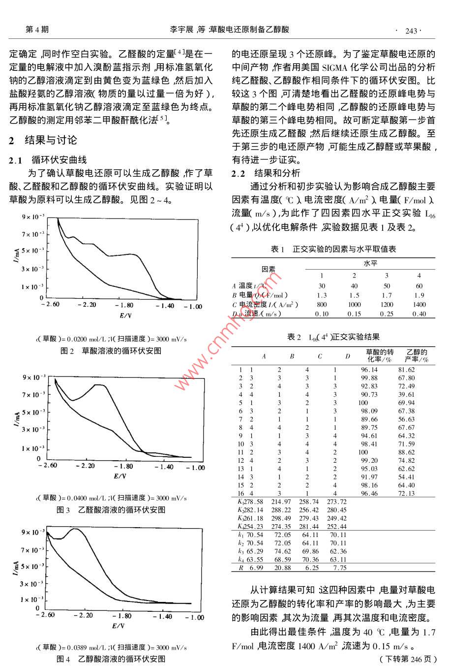 第20卷第4期精細(xì)化工Ⅴol.20,No.42003年4月FINE CHEMICALSpr.2003有粗電學(xué)與輯草酸電還原制備乙醇酸李宇展邱麗顧登平河北師范大學(xué)化學(xué)學(xué)院河北石家莊050016)摘要用循環(huán)伏安法確定了草酸可以還原為乙醇酸證明了從草酸硏制乙醇酸的可行性。工藝采用以鉛電極作陰極材料的陽(yáng)離子交換膜電解槽虍解草酸制備乙醇酸并以電流密度、電量、溫度和電解液的流速作了四因素四水平的正交實(shí)驗(yàn)得出最佳工藝條件為電流密度1400A/m2電量1.7F/mo溫度40℃電解液流速0.15m/s產(chǎn)率達(dá)88%以上。關(guān)鍵詞循環(huán)伏安草酸,醇酸電化學(xué)還原中圖分類號(hào)3623.65+1文獻(xiàn)標(biāo)識(shí)碼:A文章編號(hào)1003-52142003)1-0242-03Electroreduction of Oxalic Acid to Glycolic AcidLI Yu-zhan QIu Li GU Deng-pingDepartment of Chemistry Hebei Normal University Shijiazhuang 050016, Hebei, ChinaAbstract Electroreduction of oxalic acid to glycolic acid was confirmed by cyclic voltammetry Glycolic acidwas prepared from oxalic acid at the Pb cathode in an eletrolytic cell with cation-exchange mambrane. Byorthogonal experiments the optimal operating conditions were obtained current density 1400 A/mf ,electricquantity 1.7 F/mol temperature 40C and flowrate of electrolyte 0.15 m/so The yield was over 88%Key words cyclic voltammetry glycolic acid ,oxalic acid electroreduction草酸電還原合成乙醛酸早在20世紀(jì)90年代已裝置如圖1所示。由作者實(shí)現(xiàn)工業(yè)化1。作者仍以廉價(jià)的草酸為原料電還原制備乙醇酸。乙醇酸 glycollic acid)稱羥基乙酸 hydroxyacetic acid)甘醇酸,是最簡(jiǎn)單的α-羥基酸。乙醇酸是一種重要的有機(jī)合成中間體和化工產(chǎn)品其應(yīng)用范圍很廣。國(guó)家在十五”規(guī)劃中把乙醇酸2列為主要基礎(chǔ)化工產(chǎn)品來(lái)開(kāi)發(fā),足以說(shuō)明其在化工生產(chǎn)中的重要性。近年來(lái),由于乙醇酸已開(kāi)發(fā)用于醫(yī)學(xué)工程材料和高分子降解材料等許多領(lǐng)域使得乙醇酸的需求量逐年增加提高乙醇酸的產(chǎn)l—陰極』—陽(yáng)極♂—-陽(yáng)離子交換膜;溫度計(jì)δ—玻璃冷凝管量和開(kāi)發(fā)新的合成路線,降低產(chǎn)品成本成為開(kāi)發(fā)的6—磁力泵7—恒溫槽重點(diǎn)。作者在草酸電還原合成乙醛酸并已工業(yè)化的圖1實(shí)驗(yàn)裝置基礎(chǔ)上研制乙醇酸具有重要意義。1實(shí)驗(yàn)實(shí)驗(yàn)所用原料草酸硫酸均為CP水為去離子水。12實(shí)驗(yàn)條件1裝置陽(yáng)極液為κ(H2SO4)=6%~8%的硫酸溶液陰電解槽由聚丙烯自制而成玥、陽(yáng)極均選用鉛合極液為&(草酸)=1mlL的草酸溶液。電解液中金材料熾、陽(yáng)極之間由陽(yáng)離子交換隔膜隔開(kāi)。實(shí)驗(yàn)草酸的定量3用CaC2溶液在pH=3~4條件下沉淀然后用硫酸溶液溶解再用KMnO4標(biāo)準(zhǔn)溶液滴第4期李宇展等草酸電還原制備乙醇酸43定確定同時(shí)作空白實(shí)驗(yàn)。乙醛酸的定量是在一的電還原呈現(xiàn)3個(gè)還原峰。為了鑒定草酸電還原的定量的電解液中加入溴酚藍(lán)指示劑用標(biāo)準(zhǔn)氬氧化中間產(chǎn)物作者用美國(guó) SIGMA化學(xué)公司出品的分析汭的乙醇溶液滴定到由黃色變?yōu)樗{(lán)綠色然后加入純乙醛酸、乙醇酸作相同條件下的循環(huán)伏安圖。比鹽酸羥氨的乙醇溶液物質(zhì)的量以過(guò)量一倍為好),較這3個(gè)圖冋可清楚地看岀乙醛酸的還原峰電勢(shì)與再用標(biāo)準(zhǔn)氬氧化鈉乙醇溶液滴定至藍(lán)綠色為終點(diǎn)。草酸的第二個(gè)峰電勢(shì)相同乙醇酸的還原峰電勢(shì)與乙醇酸的測(cè)定用鄰苯二甲酸酐?;?草酸的第三個(gè)峰電勢(shì)相同。故可斷定草酸第一步首2結(jié)果與討論先還原生成乙醛酸然后繼續(xù)還原生成乙醇酸。至于第三步的電還原產(chǎn)物可能生成乙醇醛或蘋(píng)果酸2.1循環(huán)伏安曲線有待進(jìn)一步證實(shí)。為了確認(rèn)草酸電還原可以生成乙醇酸作了草2.2結(jié)果和分析酸、乙醛酸和乙醇酸的循環(huán)伏安曲線。實(shí)驗(yàn)證明以通過(guò)分析和初步實(shí)驗(yàn)認(rèn)為影響合成乙醇酸主要草酸為原料可以生成乙醇酸。見(jiàn)圖2~4。因素有溫度(℃)電流密度(A/m2)電量(F/mol)流量(m/s),為此作了四因素四水平正交實(shí)驗(yàn)L(4)以優(yōu)化電解條件實(shí)驗(yàn)數(shù)據(jù)見(jiàn)表1及表2。表1正交實(shí)驗(yàn)的因素與水平取值表3×10-3因素1×10-3A溫度t/℃B電量Q(F/mol)-2.201.40-1.00C電流密度(Am2)800100014000.15草酸)=0.0200mol/L;民掃描速度)=3000mV/s表2L44)交實(shí)驗(yàn)結(jié)果圖2草酸溶液的循環(huán)伏安圖ABCD草的轉(zhuǎn)z嬖的398,0967.3889.6656.633x 1067.6764.321×10·3o1234588.621.40-1.00草酸)=0.0400ml/L;κ掃描速度)=3000mVs14.97258.74273.72圖3乙醛酸溶液的循環(huán)伏安圖K261,18298,49279,43249,42k254.2327435281.44252.44h170.5472.0564.1170.11k270.5472.0564.1170.17×103k365,2974.6269h463.338:9“m0:50從計(jì)算結(jié)果可知汶四種因素中電量對(duì)草酸電1×10-1還原為乙醇酸的轉(zhuǎn)化率和產(chǎn)率的影響最大,為主要的影響因素其次為流量再其次溫度和電流密度。E/v由此得出最佳條件溫度為40℃,電量為1.7草酸)=0.0389mL;掃描速度)=3000mV/sF/mol電流密度1400A/m2流速為0.15m/s圖4乙醇酸溶液的循環(huán)伏安圖下轉(zhuǎn)第246頁(yè))24精細(xì)化工 FINE CHEMICALS第20卷從圖4可以看到粉體的晶粒尺