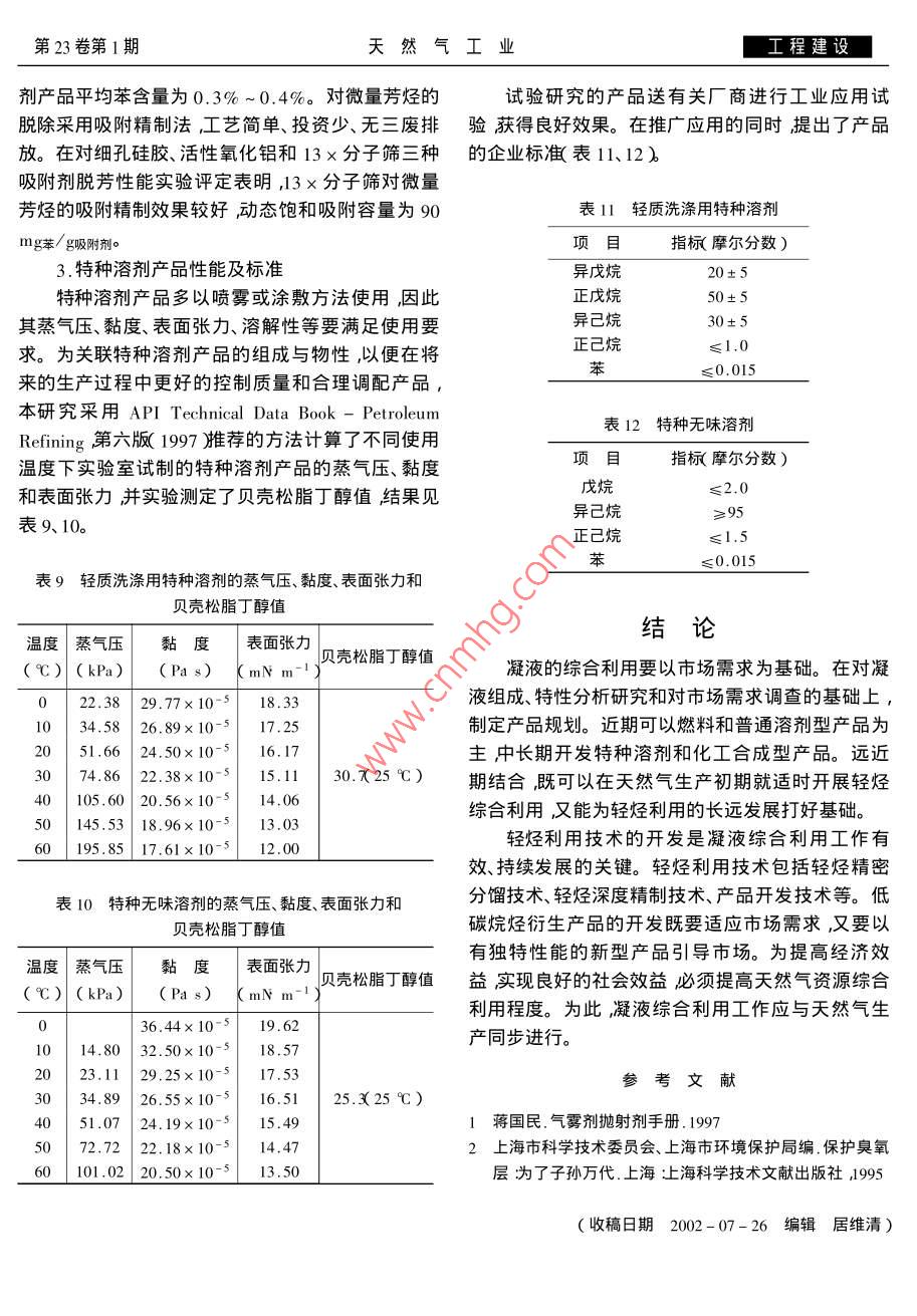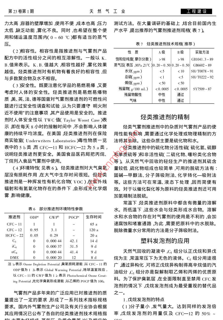 工程建設(shè)天然氣工業(yè)2003年1月天然氣凝液的綜合利用郭揆常上海石油天然氣總公司)郭揆常.天然氣凝液的綜合利用.天然氣工業(yè)20032X1)98-103摘要天然氣是以甲烷為主的烴類氣體混合物。其組成中除甲烷外常含有不同數(shù)量的C2~Cs等低碳烷烴以及二氧化碳、氮?dú)?、硫化物等非烴類。天然氣既可作為清潔能源又可作為優(yōu)質(zhì)化工原料。為了提高資源綜合利用程度提高經(jīng)濟(jì)效益除重視甲烷旳合理利用外積極拓展天然氣中其他低碳烷烴的綜合利用不僅可增加全業(yè)經(jīng)濟(jì)效益而且還會產(chǎn)生顯著的社會效益。平湖油氣田是我國東海第一個正式投入開發(fā)的油氣田,為了綜合利用從其天然氣中回收的凝液對該凝液的組成特性、利用方案、產(chǎn)品開發(fā)等進(jìn)行了課題研究并調(diào)查了上海地區(qū)市場需求進(jìn)而制定燃料—溶劑型的利用方案生產(chǎn)環(huán)保型氣霧劑推進(jìn)劑、塑料發(fā)泡劑以及特種溶劑等為主取得了初步成果。主題詞天然氣低碳烷烴綜合利用平湖氣田凝液是從天然氣或油田伴生氣)回收的除甲綜合利用。烷以外的低碳烷烴。從資源綜合利用角度講,凝液綜合利用是天然氣利用的一部分。由于低碳烷烴具平湖油氣田凝液的組成有良好的環(huán)境特性其衍生產(chǎn)品的應(yīng)用對保護(hù)臭氧天然氣中除甲烷外的低碳烷烴的含量隨氣藏成層、減少溫室效應(yīng)效果顯著因此,凝液的綜合利用因的不同而不同。一般來說凝析氣和油田伴生氣不僅能提高經(jīng)濟(jì)效益而且還可以產(chǎn)生顯著的社會中C3+的含量比較高因而其利用價值更大。平湖效益。因此從天然氣生產(chǎn)開始就應(yīng)同步實(shí)施輕烴油氣田是凝析氣藏其天然氣的組成見表1。表1平湖油氣田天然氣組分表組分H2O摩爾分?jǐn)?shù)0.0733.8690.65581.37.4874.0731.0150.82570.2920.8920.19910.0892由表1可見平湖油氣田天然氣中,、丁烷含0.I%以上。液化氣LPG戊烷和穩(wěn)定輕烴的組成量為6%左右戊烷含量為0.5%左右,C6+含量在分別見表2~5。0.1%~0.2%。該油氣田陸上天然氣處理廠采用了穩(wěn)定輕烴的組成一般隨脫戊烷塔的操作情況而臚脹外加丙烷制冷的冷凝回收工藝投產(chǎn)3年來先變化。其中,C4餾分含量很少小于1%:Cs餾分含后經(jīng)過了三分之一負(fù)荷到滿負(fù)荷的生產(chǎn)運(yùn)行穩(wěn)定。量小于20%汜已烷、庚烷、辛烷及其以上烷烴含量分該廠產(chǎn)品除了甲、乙烷作銷售氣輸入城市管網(wǎng)外尚有用作車用和民用燃料的丙、丁烷混合氣戊烷和穩(wěn)表2LPG組成摩爾分?jǐn)?shù)定輕烴,對于這些產(chǎn)品的利用首先是要確定其產(chǎn)組分C2G量和組成。為此曾對投產(chǎn)兩年來天然氣中的輕烴樣品10.159.1219117.6710.570.03進(jìn)行分析進(jìn)一步明確了C輕烴含量在0.1%左樣品‖011556429218.013.020.30右且隨季節(jié)變化,上半年在0.1%以下,下半年在作者簡介郭揆常,1942年生教授級高級工程師∶1964年畢業(yè)于原北京石油學(xué)院開發(fā)系;期致力于石油天然氣工程設(shè)計與建設(shè)從1992年至今從事海上油氣田開發(fā)建設(shè)工作擔(dān)任平湖油氣田的技術(shù)負(fù)責(zé)人發(fā)表論文30多篇擔(dān)任本刊第五屆編委會委員。地址(200041)海市江寧路336號。電話(021)2555078第23卷第1期天然氣工業(yè)程建設(shè)表3戊烷組成摩爾分?jǐn)?shù)組分C4 cIsNe22-二甲基丁烷C環(huán)戊烷nCn3-甲基戊烷甲基環(huán)戊烷樣品I0.113.2762.8331.890.25樣品Ⅱ0.662.6435.940.90注℃中包含23-二甲基丁烷+2-甲基戊烷表4穩(wěn)定輕烴組成摩爾分?jǐn)?shù)組分2000年1月200年3月2000年5月200年7月200年9月00年11月16.848.487.38C641.9559.049.1123.6324.232924.783.0523.695.5154.119甲苯3.1884.6835.3344.552注表中數(shù)值為當(dāng)月平均值年月表示取樣日期表5穩(wěn)定輕烴單體烴組成摩爾分?jǐn)?shù)199年10月1999年11月2000年9月11日2000年9月27日2001年4月16日異丁烷0.350.07正丁烷0.030.55異戊烷烷3.995.7922-二甲基丁烷0.52.320.98C烷烴)+環(huán)戊烷15.143-甲基戊烷6.78正己烷12.5413.0922-二甲基戊烷0.280.370.280.58甲基環(huán)戊烷2A-二甲基戊烷0.50.770.13223-三甲基丁烷0.190.180.151.69C烷烴2)+環(huán)己烷20.4820.207.97正庚烷3.293.414.39甲基環(huán)己烷10,0010.7710.380.607.38乙基環(huán)戊烷0.431.330.830.69甲苯6.086.62注年月日表示取樣日期迿含2、3-二甲基丁烷+2-甲基戊烷衛(wèi))含3、3-二甲基戊烷+2-甲基己烷2、4-二甲基戊烷,、1二甲基環(huán)戊烷3-甲基己烷,、順3-二甲基環(huán)戊烷,l、反3-二甲基環(huán)戊烷A、反2-二甲基環(huán)戊烷3-乙基戊烷。別為40%~60%,25%~35%和5%~20%;、甲利用有了較好的基礎(chǔ)。輕烴的進(jìn)一步加工方案按產(chǎn)苯和總芳烴含量分別為2%~6%β3%~7%和6%品類型可以分為燃料型、燃料一溶劑型和化工合成11%。穩(wěn)定輕烴組成的波動較大其原因除了處型理廠的原料氣組成變化引起外盧與脫戊烷塔操作不燃料型是國內(nèi)輕烴回收裝置初期較多采用的產(chǎn)平穩(wěn)也有關(guān)。單體烴分析結(jié)果顯示穩(wěn)定輕烴中豐度品方案。即將從天然氣或原油伴生氣沖回收的凝最高的是異己烷組分可達(dá)20%~30%。液再分離出丙烷、丁烷混合氣作LPG銷售為民用或凝液綜合利用方案車用燃料后余下的C+產(chǎn)品天然汽油)作調(diào)和汽油。由于這種辛烷值較低的烴餾分不易調(diào)和成9