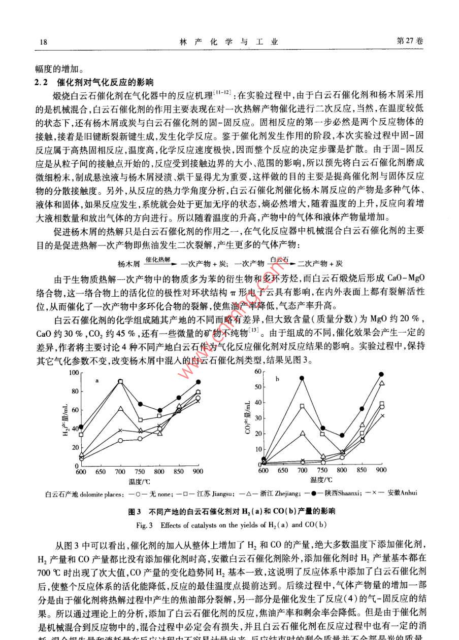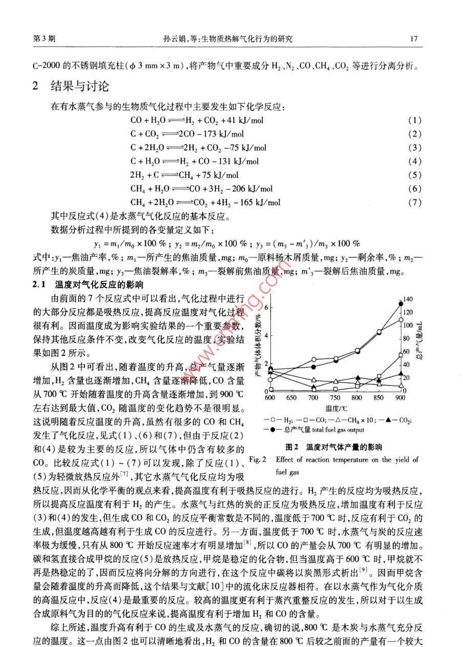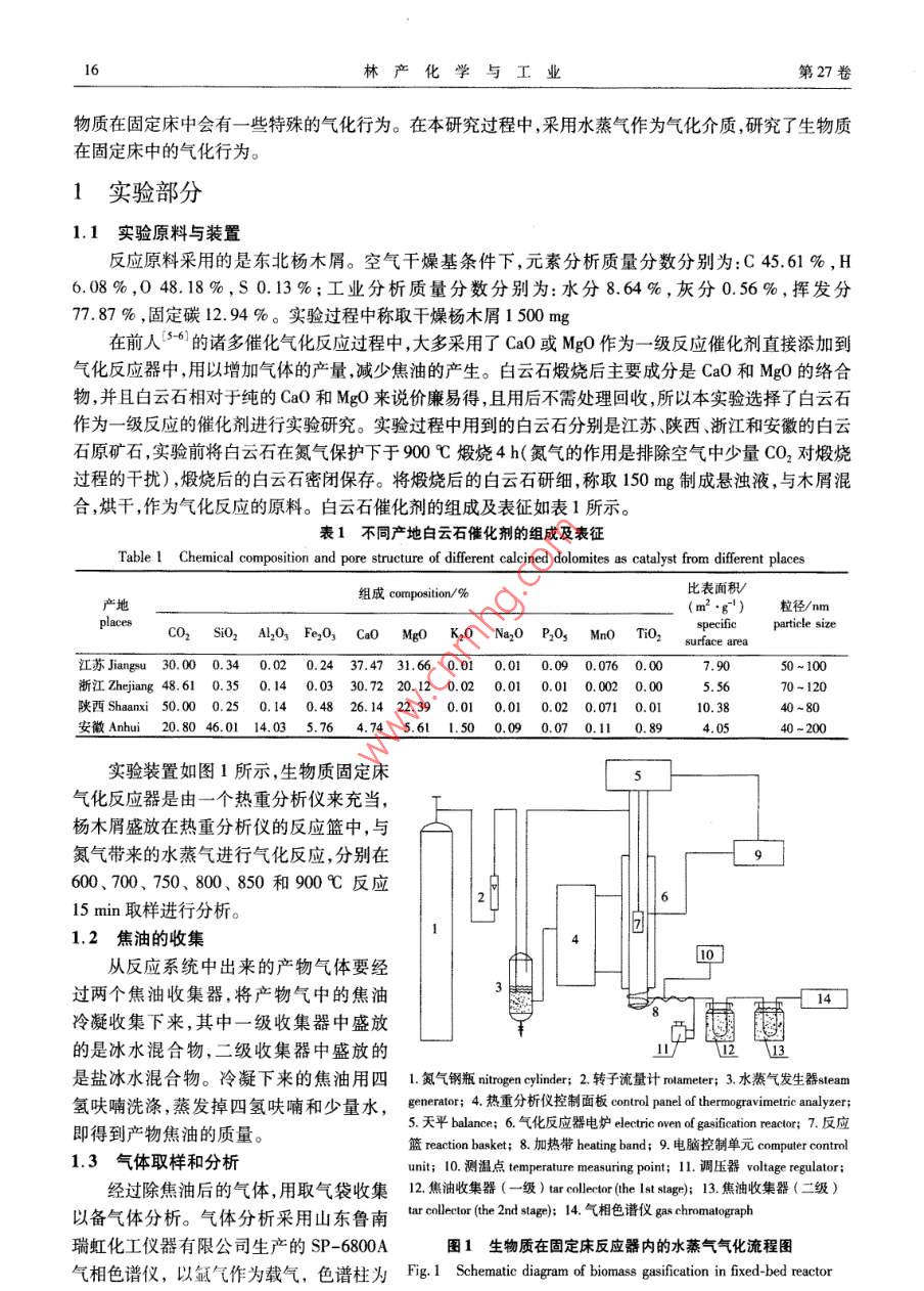 第27卷第3期林產(chǎn)化學(xué)與工業(yè)Vol. 27 No.32007 年6月Chemistry and Industry of Forest ProductsJune 2007生物質(zhì)熱解氣化行為的研究孫云娟,蔣劍春"(中國林業(yè)科學(xué)研究院林產(chǎn)化學(xué)工業(yè)研究所;國家林業(yè)局林產(chǎn)化學(xué)工程.重點(diǎn)開放性實(shí)驗(yàn)室,江蘇南京210042)摘要:以固定床為氣化反應(yīng)器,對(duì)生物質(zhì)水蒸氣氣化的特性進(jìn)行了一系列實(shí)驗(yàn)研究。氣化介質(zhì)水蒸氣為一定溫度下的蒸汽,由一定流量的氮?dú)廨d入反應(yīng)體系內(nèi)。實(shí)驗(yàn)探討了采用楊木屑作為氣SUN Yun-juan化原料時(shí),氣化溫度、以原料浸泡方式加入的催化劑類型、水蒸氣加入量等主要參數(shù)對(duì)氣體產(chǎn)量的影響。結(jié)果表明:在較高氣化溫度下,白云石催化制中鐵含量越多,比表面積越大,中孔越多,水蒸氣加入量越多,對(duì)氣化反應(yīng)越有利。在原料量1500 mg、反應(yīng)溫度900 C、水蒸氣蒸發(fā)溫度48 C、陜西白云石催化劑狀態(tài)下得到的最高氫氣產(chǎn)量為5. 95 mL/min。關(guān)鍵詞:生物質(zhì);固定床;氣化; 白云石.中圖分類號(hào):TQ351.2文獻(xiàn)標(biāo)識(shí)碼:A文章編號(hào):0253 - 2417(2007)03 -0015 -06Study on Biomass Pyrolysis and GasificationSUN Yun-juan, JIANG Jjian-chun( Institute of Chemical Industry of Forest Products,CAF; Key and Open Lab. onForest Chermical Engineering , SFA, Nanjing 210042, China)Abstract: The characteristics of biomass toward steam gasification in a fixed-bed were studied by experiments. Saturated steamwas caried into the gasifer by N:. Effects of gasification conditions on yield of fuel gas , such as gasification temperature, styleof catalyst and steam quantity in the gasifer when using poplar sawdust as raw material were investigated. From the experimentalresults, it can be seen that higher reaction temperature ,proper style of calcined dolomite( higher iron content,bigger specificsurface area and more mesopores) and higher steam quantity were profitable conditions. The highest hydrogen yield,5. 95 ml/min, was achieved under the conditions of poplar sawdust mass 1 500 mg, reaction temperature 900 C,steam( mixedquantitatively with N2 ) saturation temperature 48 C using Shaanxi dolomite ,as catalyst.Key words: biomass ;fixed bed;gasification;dolomite隨著化石能源的逐漸枯竭,人們加快了生物質(zhì)制取清潔能源的探索步伐。我國是--個(gè)農(nóng)業(yè)大國,有著豐富的生物質(zhì)資源,每年至少有農(nóng)林廢棄物約7億噸,折合標(biāo)準(zhǔn)煤約為3.5億噸。過去經(jīng)常是采用傳統(tǒng)的直接燃燒的方式利用這些生物質(zhì)能源,而近年來由于化石燃料進(jìn)入農(nóng)村,部分農(nóng)村(特別是較發(fā)達(dá)地區(qū)農(nóng)村)生物質(zhì)能的使用量下降,目前每年實(shí)際使用量僅為2.2億噸標(biāo)煤,生物質(zhì)相對(duì)過剩。這些過剩的生物質(zhì)大多被廢棄,或隨意焚燒,造成環(huán)境污染。直接當(dāng)燃料使用時(shí),其熱效率也僅為10% ~20 %。而將生物質(zhì)氣化成氣體燃料后再使用,熱效率可提高30%以上1-2)。 因而對(duì)生物質(zhì)進(jìn)行熱化學(xué)處理制取可燃?xì)怏w是一種很有前景的能源開發(fā)方式。生物質(zhì)熱解氣化是生物質(zhì)熱化學(xué)轉(zhuǎn)換過程的重要內(nèi)容,基本原理是在不完全燃燒條件下,將生物質(zhì)原料加熱,使較高相對(duì)分子質(zhì)量的有機(jī)碳?xì)浠衔镦溋呀?變成較低相對(duì)分子質(zhì)量的CO、H,、CH4等可燃性氣體,在轉(zhuǎn)換過程中可以用空氣、氧氣或水蒸氣等氣化介質(zhì)13-4)。國內(nèi)外關(guān)于生物質(zhì)氣化流化床的研究較多,而在固定床中較全面的研究比較少,生收稿日期:2006 -06-22基金項(xiàng)目:國家科技支撐計(jì)劃資助項(xiàng)目( 2006BAD07 A03) ;國家自然科學(xué)基金資助項(xiàng)目(30671649)作者簡介:孫云娟(1979-),女,河北唐山人,碩士,主要從事生物質(zhì)熱化學(xué)轉(zhuǎn)化方面的研究+通訊作者:蔣劍春,研究員,博士生導(dǎo)師,從事林產(chǎn)化學(xué)加工領(lǐng)域的生物質(zhì)熱化學(xué)轉(zhuǎn)化技術(shù)活性炭制備和應(yīng)用的基礎(chǔ)研究及開發(fā)設(shè)16林產(chǎn)化學(xué)與工業(yè)第27卷物質(zhì)在固定床中會(huì)有一些特殊的氣化行為。在本研究過程中,采用水蒸氣作為氣化介質(zhì),研究了生物質(zhì)在固定床中的氣化行為。1實(shí)驗(yàn)部分1.1實(shí)驗(yàn)原料與裝置反應(yīng)原料采用的是東北楊木屑??諝飧稍锘鶙l件下,元素分析質(zhì)量分?jǐn)?shù)分別為:C 45.61 %,H6.08%,0 48.18%,S 0.13%;工業(yè)分析質(zhì)量分?jǐn)?shù)分別為:水分8.64%,灰分0.56%,揮發(fā)分77.87%,固定碳12.94%。實(shí)驗(yàn)過程中稱取干燥楊木屑1500mg在前人[5-6]的諸多催化氣化反應(yīng)過程中,大多采用了CaO或MgO作為- -級(jí)反應(yīng)催化劑直接添加到氣化反應(yīng)器中,用以增加氣體的產(chǎn)量,減少焦油的產(chǎn)生。白云石煅燒后主要成分是CaO和MgO的絡(luò)合物,并且白云石相對(duì)于純的CaO和MgO來說價(jià)廉易得,且用后不需處理回收,所以本實(shí)驗(yàn)選擇了白云石作為- -級(jí)反應(yīng) 的催化劑進(jìn)行實(shí)驗(yàn)研究。實(shí)驗(yàn)過程中用到的白云石分別是江蘇、陜西、浙江和安徽的白云石原礦石,實(shí)驗(yàn)前將白云石在氮?dú)獗Wo(hù)下于900 C煅燒4 h(氮?dú)獾淖饔檬桥懦諝庵猩倭緾O2對(duì)煅燒過程的干