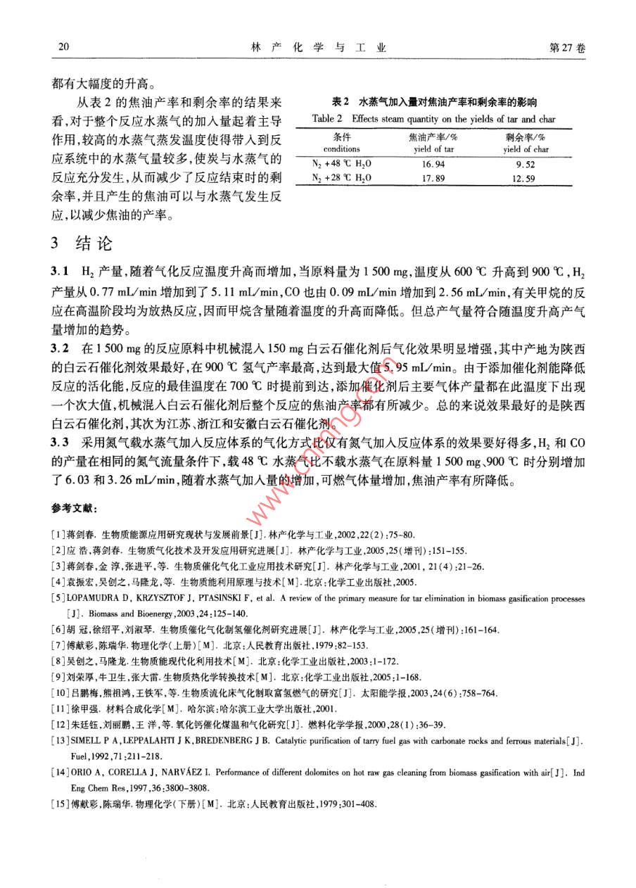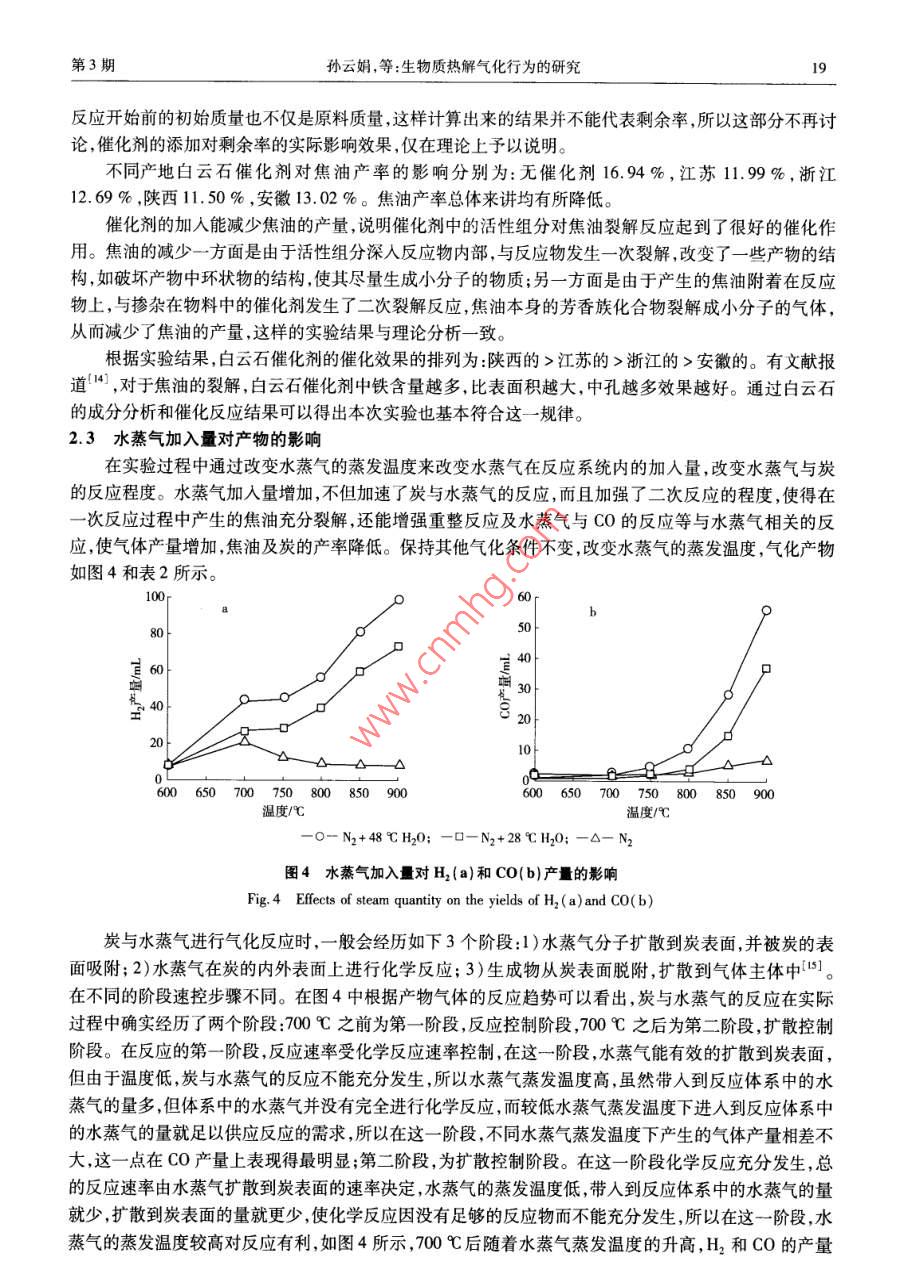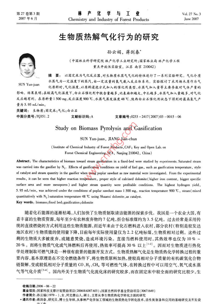 第27卷第3期林產(chǎn)化學(xué)與工業(yè)Vol. 27 No.32007 年6月Chemistry and Industry of Forest ProductsJune 2007生物質(zhì)熱解氣化行為的研究孫云娟,蔣劍春"(中國林業(yè)科學(xué)研究院林產(chǎn)化學(xué)工業(yè)研究所;國家林業(yè)局林產(chǎn)化學(xué)工程.重點(diǎn)開放性實(shí)驗(yàn)室,江蘇南京210042)摘要:以固定床為氣化反應(yīng)器,對(duì)生物質(zhì)水蒸氣氣化的特性進(jìn)行了一系列實(shí)驗(yàn)研究。氣化介質(zhì)水蒸氣為一定溫度下的蒸汽,由一定流量的氮?dú)廨d入反應(yīng)體系內(nèi)。實(shí)驗(yàn)探討了采用楊木屑作為氣SUN Yun-juan化原料時(shí),氣化溫度、以原料浸泡方式加入的催化劑類型、水蒸氣加入量等主要參數(shù)對(duì)氣體產(chǎn)量的影響。結(jié)果表明:在較高氣化溫度下,白云石催化制中鐵含量越多,比表面積越大,中孔越多,水蒸氣加入量越多,對(duì)氣化反應(yīng)越有利。在原料量1500 mg、反應(yīng)溫度900 C、水蒸氣蒸發(fā)溫度48 C、陜西白云石催化劑狀態(tài)下得到的最高氫氣產(chǎn)量為5. 95 mL/min。關(guān)鍵詞:生物質(zhì);固定床;氣化; 白云石.中圖分類號(hào):TQ351.2文獻(xiàn)標(biāo)識(shí)碼:A文章編號(hào):0253 - 2417(2007)03 -0015 -06Study on Biomass Pyrolysis and GasificationSUN Yun-juan, JIANG Jjian-chun( Institute of Chemical Industry of Forest Products,CAF; Key and Open Lab. onForest Chermical Engineering , SFA, Nanjing 210042, China)Abstract: The characteristics of biomass toward steam gasification in a fixed-bed were studied by experiments. Saturated steamwas caried into the gasifer by N:. Effects of gasification conditions on yield of fuel gas , such as gasification temperature, styleof catalyst and steam quantity in the gasifer when using poplar sawdust as raw material were investigated. From the experimentalresults, it can be seen that higher reaction temperature ,proper style of calcined dolomite( higher iron content,bigger specificsurface area and more mesopores) and higher steam quantity were profitable conditions. The highest hydrogen yield,5. 95 ml/min, was achieved under the conditions of poplar sawdust mass 1 500 mg, reaction temperature 900 C,steam( mixedquantitatively with N2 ) saturation temperature 48 C using Shaanxi dolomite ,as catalyst.Key words: biomass ;fixed bed;gasification;dolomite隨著化石能源的逐漸枯竭,人們加快了生物質(zhì)制取清潔能源的探索步伐。我國是--個(gè)農(nóng)業(yè)大國,有著豐富的生物質(zhì)資源,每年至少有農(nóng)林廢棄物約7億噸,折合標(biāo)準(zhǔn)煤約為3.5億噸。過去經(jīng)常是采用傳統(tǒng)的直接燃燒的方式利用這些生物質(zhì)能源,而近年來由于化石燃料進(jìn)入農(nóng)村,部分農(nóng)村(特別是較發(fā)達(dá)地區(qū)農(nóng)村)生物質(zhì)能的使用量下降,目前每年實(shí)際使用量僅為2.2億噸標(biāo)煤,生物質(zhì)相對(duì)過剩。這些過剩的生物質(zhì)大多被廢棄,或隨意焚燒,造成環(huán)境污染。直接當(dāng)燃料使用時(shí),其熱效率也僅為10% ~20 %。而將生物質(zhì)氣化成氣體燃料后再使用,熱效率可提高30%以上1-2)。 因而對(duì)生物質(zhì)進(jìn)行熱化學(xué)處理制取可燃?xì)怏w是一種很有前景的能源開發(fā)方式。生物質(zhì)熱解氣化是生物質(zhì)熱化學(xué)轉(zhuǎn)換過程的重要內(nèi)容,基本原理是在不完全燃燒條件下,將生物質(zhì)原料加熱,使較高相對(duì)分子質(zhì)量的有機(jī)碳?xì)浠衔镦溋呀?變成較低相對(duì)分子質(zhì)量的CO、H,、CH4等可燃性氣體,在轉(zhuǎn)換過程中可以用空氣、氧氣或水蒸氣等氣化介質(zhì)13-4)。國內(nèi)外關(guān)于生物質(zhì)氣化流化床的研究較多,而在固定床中較全面的研究比較少,生收稿日期:2006 -06-22基金項(xiàng)目:國家科技支撐計(jì)劃資助項(xiàng)目( 2006BAD07 A03) ;國家自然科學(xué)基金資助項(xiàng)目(30671649)作者簡介:孫云娟(1979-),女,河北唐山人,碩士,主要從事生物質(zhì)熱化學(xué)轉(zhuǎn)化方面的研究+通訊作者:蔣劍春,研究員,博士生導(dǎo)師,從事林產(chǎn)化學(xué)加工領(lǐng)域的生物質(zhì)熱化學(xué)轉(zhuǎn)化技術(shù)活性炭制備和應(yīng)用的基礎(chǔ)研究及開發(fā)設(shè)16林產(chǎn)化學(xué)與工業(yè)第27卷物質(zhì)在固定床中會(huì)有一些特殊的氣化行為。在本研究過程中,采用水蒸氣作為氣化介質(zhì),研究了生物質(zhì)在固定床中的氣化行為。1實(shí)驗(yàn)部分1.1實(shí)驗(yàn)原料與裝置反應(yīng)原料采用的是東北楊木屑??諝飧稍锘鶙l件下,元素分析質(zhì)量分?jǐn)?shù)分別為:C 45.61 %,H6.08%,0 48.18%,S 0.13%;工業(yè)分析質(zhì)量分?jǐn)?shù)分別為:水分8.64%,灰分0.56%,揮發(fā)分77.87%,固定碳12.94%。實(shí)驗(yàn)過程中稱取干燥楊木屑1500mg在前人[5-6]的諸多催化氣化反應(yīng)過程中,大多采用了CaO或MgO作為- -級(jí)反應(yīng)催化劑直接添加到氣化反應(yīng)器中,用以增加氣體的產(chǎn)量,減少焦油的產(chǎn)生。白云石煅燒后主要成分是CaO和MgO的絡(luò)合物,并且白云石相對(duì)于純的CaO和MgO來說價(jià)廉易得,且用后不需處理回收,所以本實(shí)驗(yàn)選擇了白云石作為- -級(jí)反應(yīng) 的催化劑進(jìn)行實(shí)驗(yàn)研究。實(shí)驗(yàn)過程中用到的白云石分別是江蘇、陜西、浙江和安徽的白云石原礦石,實(shí)驗(yàn)前將白云石在氮?dú)獗Wo(hù)下于900 C煅燒4 h(氮?dú)獾淖饔檬桥懦諝庵猩倭緾O2對(duì)煅燒過程的干