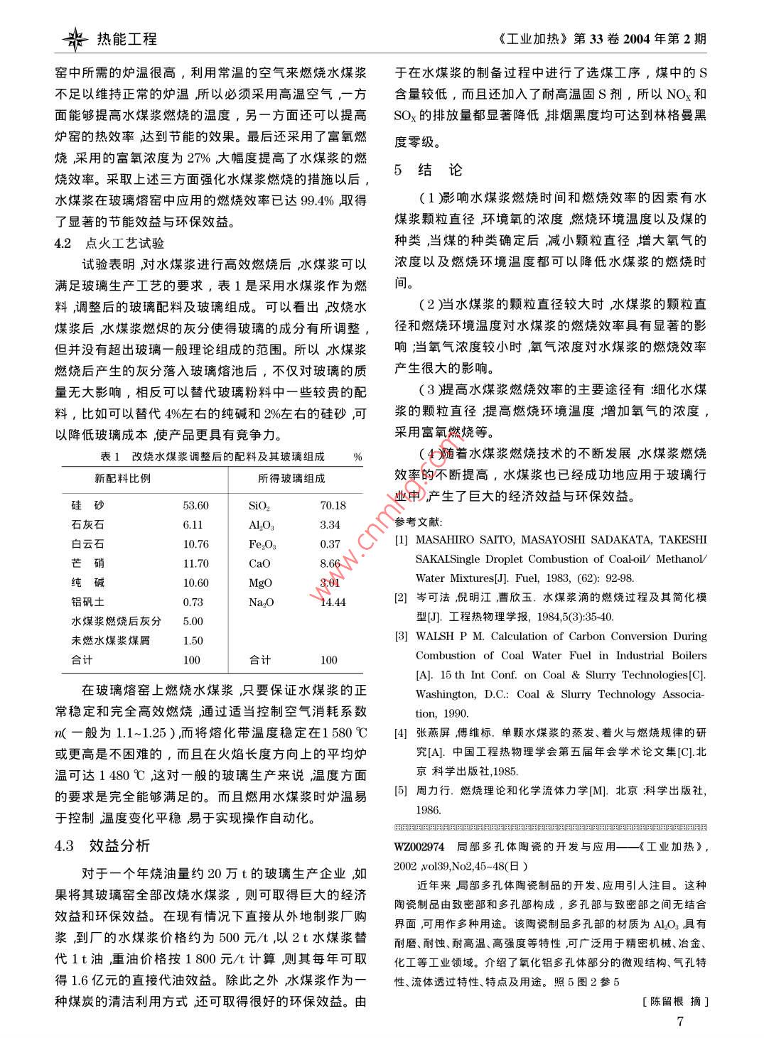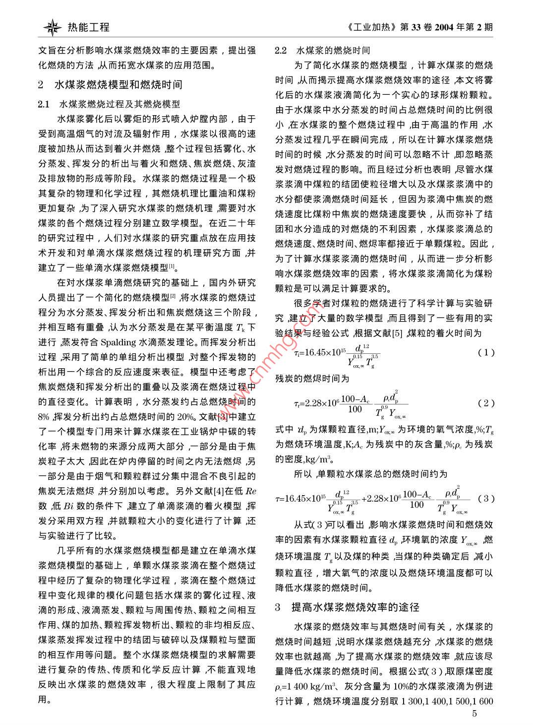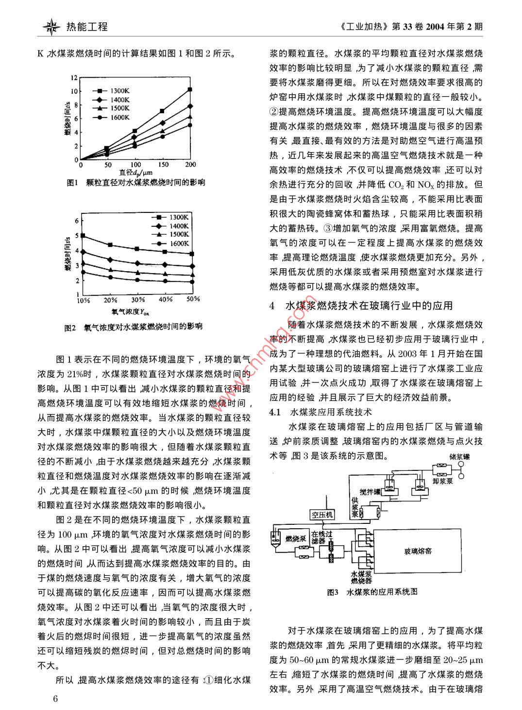熱能工程《工業(yè)加熱》第33卷2004年第2期水煤漿的強(qiáng)化燃燒技術(shù)及其工業(yè)應(yīng)用夏德宏,吳永紅北京科技大學(xué)熱能工程系,北京10008摘要∶通過(guò)簡(jiǎn)化水煤漿旳燃燒模型計(jì)算了水煤漿的燃燒時(shí)間分析了影響水煤漿燃燒效率旳因素提岀了改善水煤漿燃燒效率的途徑并介紹了國(guó)內(nèi)首次在玻璃熔窯上進(jìn)行的水煤漿燃燒應(yīng)用試驗(yàn)。關(guān)鍵詞:水煤漿燃燒時(shí)間撚燒效率詖璃熔窯中圖分類(lèi)號(hào):TFO66.12文獻(xiàn)標(biāo)識(shí)碼:A文章編號(hào):1002-16392004)2000404Combustion Intensification of Coal-water SlurryXIA De-hong, wU Yong-hong(Dept. of Thermal Engineering, University of Science Technology Beijing, Beijing 100083, ChinaAbstract: Through simplifying the combustion model of Coal-Water Slurry, the combustion time of Coal-Water Slurry iscalculated and the effects on the combustion efficiency of Coal-Water Slurry are analyzed. The methods to intensify thecombustion of Coal-Water Slurry are brought to light. Coal-Water Slurry has been put into application in the melting fur-nace of glass for the first time in China.Key words: Coal-Water Slurry; combustion time; combustion efficiency; melting fumace of glass近年來(lái)隨著水煤漿燃燒技術(shù)的不斷推廣水煤漿燃燒前言技術(shù)也已經(jīng)成功地應(yīng)用于陶瓷行業(yè)與玻璃行業(yè)中由水煤漿燃燒技術(shù)經(jīng)過(guò)十多年的科技攻關(guān)及工業(yè)應(yīng)于燒制陶瓷和玻璃時(shí)對(duì)原料的成分要求很高,如果水用實(shí)踐,已經(jīng)在工業(yè)爐如加熱爐、鍋爐等)上得到了煤漿沒(méi)有得到完全燃燒,未燃燼的殘?zhí)蓟烊胩沾苫蚱鲁晒Φ膽?yīng)用并取得了一系列的研究成果和寶貴經(jīng)驗(yàn)。璃中會(huì)對(duì)產(chǎn)品的質(zhì)量造成一定的影響,這對(duì)水煤漿燃燒技術(shù)提出了更高的要求。如何拓寬水煤漿的工業(yè)應(yīng)收稿日期2003409-11:修回日期20031218用范圍提高其燃燒效率從而進(jìn)一步提高水煤漿應(yīng)用作者簡(jiǎn)介夏德宏(13)男湖南津市人北京科技大學(xué)熱能的經(jīng)濟(jì)效益和環(huán)保效益是當(dāng)前所面臨的主要問(wèn)題。本工程系教授主要研究能源的清潔與高效利用(3)應(yīng)用雙股射流回卷吸手段實(shí)現(xiàn)了低氧(15%以[2]祁海鷹李宇紅高溫空氣燃燒技術(shù)的國(guó)際發(fā)展動(dòng)態(tài)工業(yè)下燃燒大大降低NOx排放量加熱2003(1)1-6(4)采用空氣、煤氣雙蓄熱燃燒方式較好地解決我③]朱彤饒文濤低NO高溫空氣燃燒技術(shù)[熱能動(dòng)力工國(guó)燃料熱值不高的難題;程2001916)328331⑤5)體積小結(jié)構(gòu)緊湊操作靈活維護(hù)方便?!?]王愛(ài)華李紅軍DRL燃燒器設(shè)計(jì)研究[J冶金能源2003224結(jié)語(yǔ)(1)31-335]李朝祥高效蓄熱式熱交換器的設(shè)計(jì)研究[]沈陽(yáng)凍北大本文設(shè)計(jì)研究了一套新型蓄熱式燃燒系統(tǒng),具有學(xué),1999高效、低氧燃燒和低NOκ排放等優(yōu)點(diǎn)。該燃燒器對(duì)于開(kāi)圓6]蔡九菊,于娟.陶瓷球蓄熱室傳熱特性的硏究卩.鋼鐵,發(fā)適合我國(guó)國(guó)情的高溫蓄熱燃燒系統(tǒng)具有重要意義1999342)54-58.由于高溫空氣燃燒機(jī)理非常復(fù)雜,對(duì)于該系統(tǒng)的研制郭伯偉漲耆一工業(yè)爐發(fā)展與蓄熱式燃燒器的應(yīng)用工業(yè)開(kāi)發(fā)工作仍需做進(jìn)一步的探討和分析加熱2001A3)59[8]王力軍票九菊高溫空氣燃燒回流混合模型研究門(mén).包頭鋼參考文獻(xiàn)鐵學(xué)院學(xué)報(bào)2001203)2102131 TOSHIAKI HASEGAWA, RYOICHI TANAKA. High Tem⑨]比埃爾JM,切比爾NA燃燒空氣動(dòng)力學(xué)[M北京科學(xué)erature Air Combustion Contributing To Energy and出版社1979Pollutant reduction in industrial furnace()高溫空100岑可法樊建人工程氣固多相流動(dòng)的理論及計(jì)算M杭州氣燃燒新技術(shù)講座北京中國(guó)科學(xué)技術(shù)協(xié)會(huì)聯(lián)合會(huì)1999浙江大學(xué)出版社,1990熱能工程《工業(yè)加熱》第33卷2004年第2期文旨在分析影響水煤漿燃燒效率的主要因素,提岀強(qiáng)2.2水煤漿的燃燒時(shí)間化燃燒的方法從而拓寬水煤漿的應(yīng)用范圍為了簡(jiǎn)化水煤漿的燃燒模型,計(jì)算水煤漿的燃燒2水煤漿燃燒模型和燃燒時(shí)間時(shí)間從而揭示提高水煤漿燃燒效率的途徑本文將霧化后的水煤漿液滴簡(jiǎn)化為一個(gè)實(shí)心的球形煤粉顆粒2.1水煤漿燃燒過(guò)程及其燃燒模型由于水煤漿中水分蒸發(fā)的時(shí)間占總?cè)紵龝r(shí)間的比例很水煤漿霧化后以霧炬的形式噴入爐膛內(nèi)部,由于小在水煤漿的整個(gè)燃燒過(guò)程中由于高溫的作用水受到高溫?zé)煔獾膶?duì)流及輻射作用,水煤漿以很高的速分蒸發(fā)過(guò)程幾乎在瞬間完成,所以在計(jì)算水煤漿燃燒度被加熱從而達(dá)到著火并燃燒整個(gè)過(guò)程包括霧化、水時(shí)間的時(shí)候水分蒸發(fā)的時(shí)間可以忽略不計(jì)即忽略蒸分蒸發(fā)、揮發(fā)分的析岀與著火和燃燒、焦炭燃燒、灰渣發(fā)對(duì)燃燒過(guò)程的影響。而且經(jīng)過(guò)分析也表明盡管水煤及排放物的形成等階段。水煤漿的燃燒過(guò)程是一個(gè)極漿漿滴中煤粒的結(jié)團(tuán)使粒徑增大以及水煤漿漿滴中的其復(fù)雜的物理和化學(xué)過(guò)程,其燃燒機(jī)理比重油和煤粉水分都使?jié){滴燃