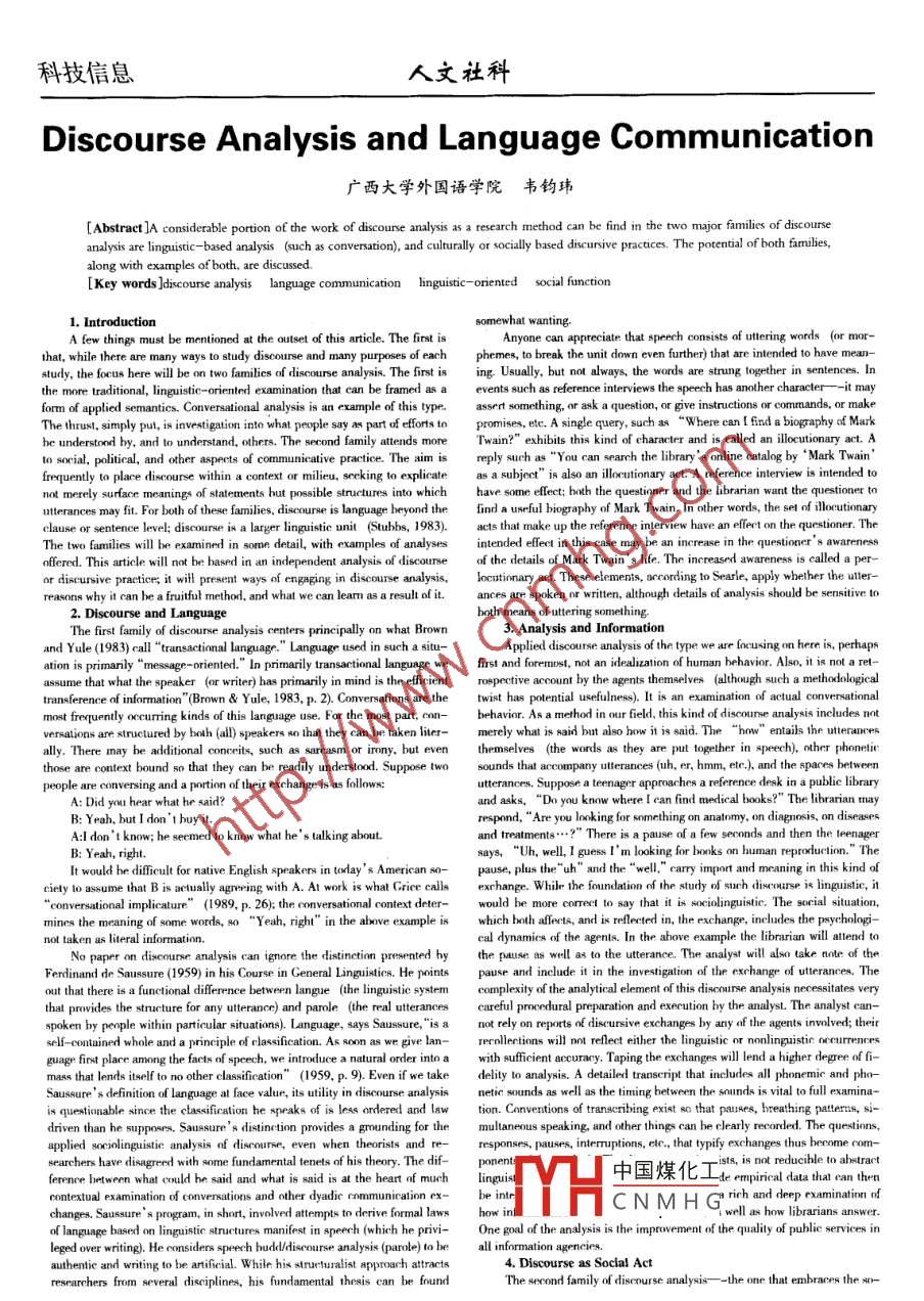科技信息人文社科does not describe all of the discursive practices that occur in educational sel-s0 of importance information science. Nornan Fairclough ofers a simple (pos- tings. An analyst is required to rcogpize the dfferent situations in which dis-sibly too simple) description of this farmil: "Critical approaches difer from cursive practices are enacted. The admission of the inluences of the socialnon-critical approaches in not just describing discursive practices, but also situation on identity and the ways identity is expressed is another way to re-showing how discourse is shaped by relations of power and ideologies, and thespond to the challenge of itrpretation. The will to knowledge is manifest inconstructive effects discourse has upon social identities, social relations andinstitutions, but it is not redefined in the instiutions; examination of educa-systemns of knowledge and belief, neither of which is normally apparent to dis-tional settings demonstrales variability within institutions.couse participants" (1992, p.12). These treat discourse first in the context in5. Summarywhich it occurs and, second, with regard to more specific purposes.An article by Siobhan Stevenson (2001) focuses on the social uses and familie are different in kind and in purpose. There are, 8 has been noted, .social efets of discourse that have political and idelogical elements. Steven-similarities between the two families. In each the emphasis is on discourseson says, "The three dimensions of this idelogically oriented model ineludeanalysis- - the examination of discourse a it occurs. In each there is an at-text, discourse practice. and social practice ”(2001, p. 53).Coordination, whichtempt to study the effects of the discourse-- what it means within the contextrequires a search for mechanisms that coordinate conversation exchanges andin which it occurs. The effects of the discursive practices are also a matter ofrequrfocus on the structure of discoure, cognitive nules, and resoure exchangeinterest. With the first family a purpose is to guuge the eficacy of linguisticmodels of discourse; and cooperation, which views communicators as active,goal seeking agents in understanding the production of conversation and isvant information in a reference transaction). A part of that purpose extends toconcerned with cooperative dinlogue and contexts for conversation. A compli-assessing the understand ability of exchanges (whether one person under-cating factor, acknowledged by Barbara Johnstone (2002) and indicated earli- stands what the other is saying). That objective may be achieved by examininger, is that discourse is both a product of social relations and produces socialthe discourse to see if the participants demonstrate understanding or by exam-relations, is both a produet of language and gives form to language (p. 9).Theining actions that can rllet understanding of what is said.historical development of each perspective is sketched, and within each one ofthese some theoretical approaches concerned with conversational coherenceReferencesare discussed.[1 ]Brown,G.,& Yule,G. (1983).Discouse analysis. Cambridge:Cam-Ron Day provides a description of the complicated itrelations of dis-bridge University Press.course and istitutions:“The lliance between pefessional discourses and of-[2]Day, R.E. 200.Tropes, history, and ethics in proesionil dis-ten conservative and dorminant ideological and cultural forces is not just a re-course and information science.sult of ... accidental class aliances. ... Critical studies of professions need to[3]De Saussure, F. (1959),Course in general lingisticsNew York:reach out to a broader social and cultural context in order to understand pro-Philosophical Library.ducts 0of social forces other than themselves" (2000, p.471[4 ]Fairclough,N.(1992) Discourse and social change Cambridge: Poli-can more readily agree that part of our identities is socially influenced that in-fuence extends to our discursive practices in different social situations. One is[5 ]Grice, P(1989).Sudies in the way of words.Cambidge, MA: Har-likely to speak diferently in, say, a comittee meeting than in a casual con-vard University PesJourmal of the Society for Information Science, 51 (5),versation with a clleague. The infuence futher extends to the language that469 - 475.is likely to he deened appropriate to certain sttings. The specife setting may[6 ]Johnstone, B.(2002),Discouse analyis.Malden, MA: Blackwell.relleet fairly clearly defined power relations. The classroom may be one such[7 ]Stubbs, M.(1983).Discourse analysis: The sociolinguistic analysis ofpower slting. The teacher may apeak from the authority of the position (whichnatural laguage. Chicago: University of Chicago Press.nd dele of sate finded comu-knowledge (which uually means that the leacher in more learned than thenity information centres: A textually oriented discourse amalysis. Canadianstudents). An examination of the discourse that occurs in a classroom would Joumal of Information & Library Science, 26(2/3), 51 - 75.have to acknowledge these reltionships). of course, the preceding example(上接第152頁(yè))也多用地名來(lái)命名品牌。說(shuō)明產(chǎn)品特點(diǎn),又具優(yōu)美含義.富有聯(lián)想,那-定可以使消費(fèi)者間接聯(lián)德國(guó)品牌命名一個(gè)特 點(diǎn)是將父子兩人的名字共同作為品牌名稱(chēng),想到商品或服務(wù)的優(yōu)點(diǎn)。如:瑞登梅爾父子公司Rttenmaier&Sons,愛(ài)爾福特父子公司Erfurt&(5)在中國(guó)文化中應(yīng)該沒(méi)有不良,消極的含義:比如:望瑞門(mén),在中Sohn等文中的意義也非常吉樣。大眾汽車(chē)的Vento在德國(guó)賣(mài)得- .切正常,但在四、德文品牌中譯的原則意大利它的意思是“屁”。這個(gè)名字在意大利大眾汽車(chē)的經(jīng)銷(xiāo)商看來(lái)是優(yōu)秀的品牌名稱(chēng)既體現(xiàn)了