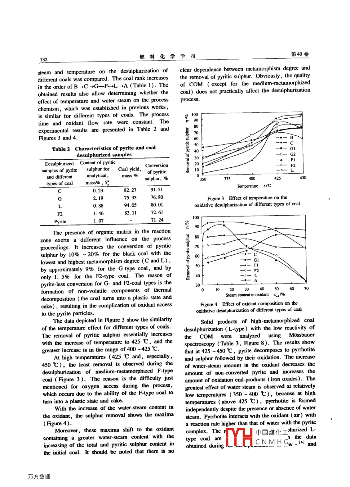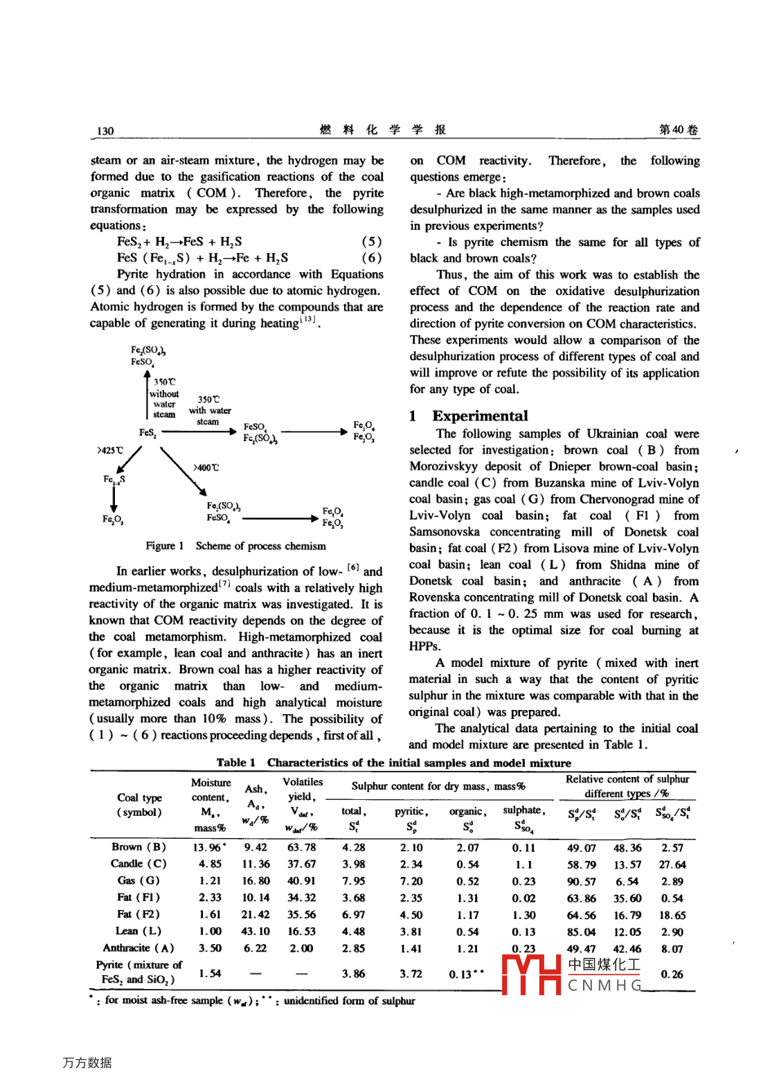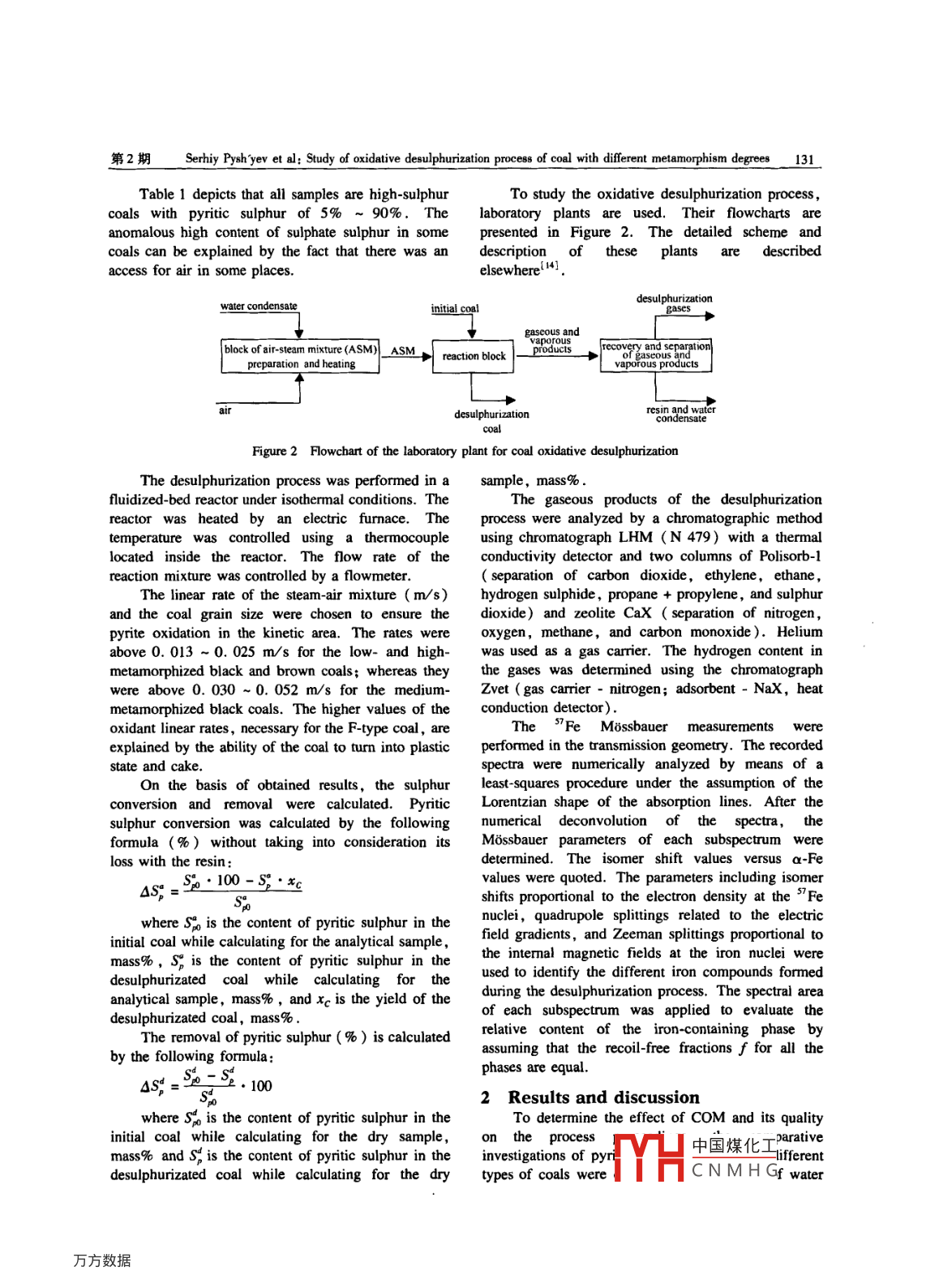 第40卷第2期燃料化學(xué)學(xué)報(bào)Vol 40 No. 2012年2月Journal of Fuel Chemistry and TechnologyFeb.2012文章編號(hào):0253-2409(2012)02012909Study of oxidative desulphurizationprocess of coal with different metamorphism degreesS PYSHYEV. V GUNKA Y PRYSIAZHNYI K SHEVCHUK. A PATTEK-JANCZYK(1. Institute of Chemistry and Chemical Technology, Lviv Polytecnic National University, St. Bandery 12, 79013 Laiv, Ukraine2. State Higher Vocational School in Tarnow, Mickiewicz 8, 33-100 Tarnow Poland)Abstract: The oxidative desulphurization process of coal with different metamorphism degrees treated by an air-steam mixture hasbeen studied. It has been shown that the pyrite present in black coal and anthracite is oxidized with the sulphur dioxide formationand the process chemical mechanism does not depend on the quality of organic matter. The medium-metamorphized coal, capable ofturning into a plastic state and cake in the range of investigated temperatures( 350-450 C), is desulphurized with the greatestdifficulty. The chemical mechanism dealing with the transformations of pyritic sulphur present in brown coal differs from similarprocesses taking place in black coal and anthracite, because Fes, is converted with hydrogen sulphide formation at desulphurizationKey words: oxidative desulphurization; organic matrix; pyrite; metamorphism degree; sulphurCLC number: TQ533 Document code AThe use of coal at heat power plants( HPPs)is stage in the two-staged coal burning at HPPs, andcomplicated because of the sulphur high present in the desulphurized coal can be seen as comprising thecoal. The burning of such a fuel leads to the so, second stage of burnemission into the atmospherePrevious studies(6-91 conducted on some coalNowadays SO2 emissions accompanied by smoke samples showed the effect of temperature and waterfumes decrease due to their sorption by potassium steam on the chemical mechanism of the coalompounds with the following gypsum obtaining. desulphurization process:However if we do not take into consideration theIt was observed that process intensification takesbenefits from the environmental protection, thanall place at 425 C and higher temperatures due to thethese desulphurization methods willmposition of pyrite to pyrrhotite and sulphur witheven if by-products( gypsum, dry ash, ammonium their following oxidationsulphate etc. )find an application"1-It was assumed that the addition of water steamMost of the other existing desulphurization to the air enhances the process due to the fact that themethods are either economically unprofitable or under steam may form complexes with pyrite, therebydevelopment. Thus, we may say that the efficient and increasing its reactivity. Water adsorption changes theprofitable industrial technology relating to so2 highest occupied molecular orbital HOMOemissions reduction for the combustion of high- characteristics of the surface, for instance, H2O to Fesulphur coal is absentions by electron donation. The resulting LUMO statesWe develop the technological basis of coal attributed to the orbitals in S2 dimers occurring in bulkpreventive desulphurization by using the oxidative can promote the surface reactionsmethod The essence of this process lies in theUsing data from 6-9, the scheme of the processselective oxidation of pyritic sulphur, which chemism was suggested( Figure 1)constitutes the main part of sulphur in the highOn the other hand. the authors( 3, 11, 12) showedlphur coall2-, by an air-steam mixture at 350- that coal organic matter(C)and its transformation450 C. The desulphurization products of black coal products(CO) may participate in reactions of pyriteand anthracite are solid fuel with a relatively low oxidation, Fes Fe-s) formation and itssulphur content, resin formed by partial transformationdecomposition of coal organic matter, andFeS,+C+H20- H2S+ Fes+ codesulphurization gases with a high content of so2FeS2+C→CS2+Fe(2)The latter may be used for the production of liquefied2FeS(Fe- S)+C- CS,+ 2Fe(3)concentrated So, by using known methods 101FeS2+CO→Fes+COSThe proposed process can be seen as the firstIt is well known that for coal treatment by waterReceived date: 2011-06-07: Recelved in revised form: 2011-09-21Corresponding author: Serhiy Pysh'yev( 1972-),male, Ph. D, associate professor, main凵中國(guó)煤化工mandhydrocarbon fuels, E-mail: gaja@ polyet. Viv. ua.CNMHG本文的英文電子版由Elsevier出版社在ScienceDirect上出版(hp://www.sciencedirect.com/science/joumal18725813)。130燃料化學(xué)學(xué)報(bào)第40卷steam or an air-steam mixture, the hydrogen may be on COM reactivity. Therefore, the followingformed due to the gasification reactions of the coal questions emerge:organic matrix COM ). Therefore, the pyriteAre black high-metamorphized and brown coalstransformation may be expressed by the following desulphurized in the same manner as the samplesequationsIn previous experiments?FeS2+H2→Fes+H2S(5)Is pyrite chemism the same for all types ofFes(Fe1S)+H2→Fe+H2S(6) black and brown coalPyrite hydration in accordance with EquationsThus, the aim of this work was to establish the5)and(6) is also possible due to atomic hydrogen. effect of COM on the oxidative desulphurizationAtomic hydrogen is formed by the compounds that are process and the dependence of the reaction rate andcapable of generating it during heating 3Jdirection of pyrite conversion on COM characteristicsThese experiments would allow a comparison of thFe, ( Sondesulphurization process of different types of coal andwill improve or refute the possibility of its application350℃for any type of coalith watercam1 ExperimentalsDAFoThe following samples of Ukrainian coal were425℃selectednvestigation: brown coal(B)from400℃Morozivskyy deposit of Dnieper brown-coal basinFecandle(C)from Buzanska mine of Lviv-VolynFe (SO4hcoal basin; gas coal (G)from Chervonograd mine ofFeSOFe, o.Lviv- Volyn coal basin; fat coal F1) fromSamsonovska concentrating m