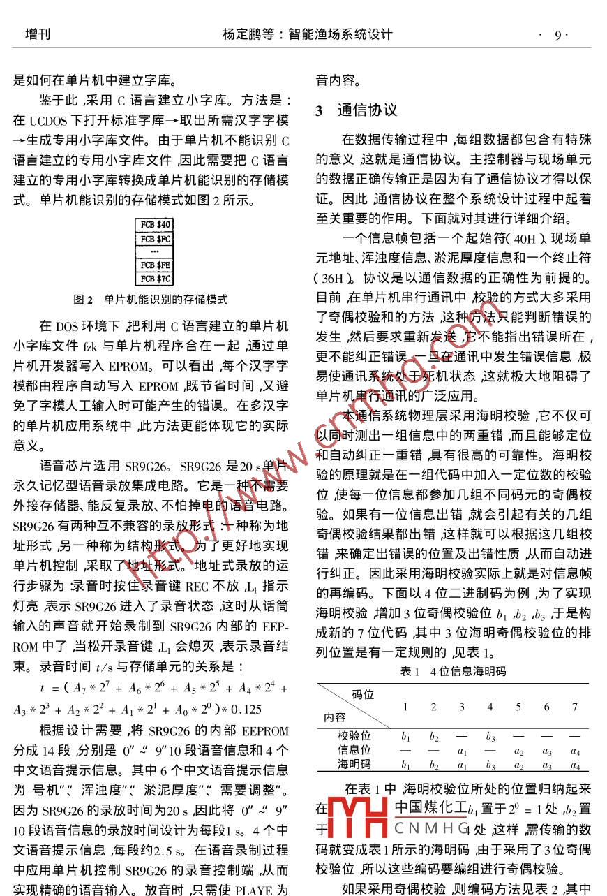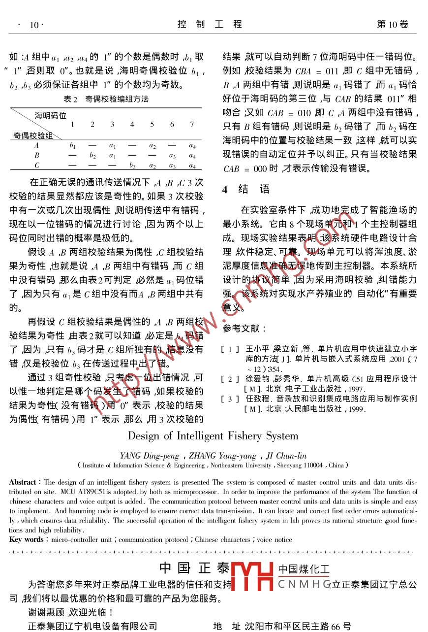2003年5月控制工程May.2003第10卷增刊Control Engineering of ChinaVol. 10 ,So文章編號: 1671-7848 2003 )-0008-03智能漁場系統(tǒng)設計楊定鵬,張洋洋,季春霖(東北大學信息科學與工程學院,遼寧沈陽10004)要:提出了智能漁場系統(tǒng)的具體設計方案。該設計方案由主控制器和分布在現(xiàn)場的數(shù)據(jù)控制單元組成,它們均采用微控制器AT89C51做為微處理器。為提高系統(tǒng)性能,為其配備了漢字和語音輸出功能。主控制器和現(xiàn)場控制單元的通信協(xié)議設計簡單、易于實現(xiàn)。同時為了保證數(shù)據(jù)傳輸?shù)恼_性而采用海明校驗,它能夠定位和自動糾正一重錯具有很高的可靠性。該智能漁場系統(tǒng)在實驗室已調試成功。實驗結果表明本系統(tǒng)結構設計合理功能完善可靠性高。關鍵詞:微控制器;通信協(xié)議漢字顯示語音提示.中圖分類號:TP 393文獻標識碼: A濃度、溫度)進行適當調整。即當氧的濃度過低1引言時數(shù)據(jù)控制單元自動開啟給水泵,直到水中氧的如何實現(xiàn)水產(chǎn)養(yǎng)殖業(yè)的自動化”最大限度.濃度正常時自動關閉水泵;當溫度低于設定的標地獲得綜合經(jīng)濟效益,對水產(chǎn)養(yǎng)殖業(yè)發(fā)展有著重.準溫度時數(shù)據(jù)控制單元自動開啟加熱器,直到溫要的現(xiàn)實意義。智能漁場系統(tǒng)正是對此而提出度達到設定上限時自動關閉加熱器。而對需要人的。它由主控制器和現(xiàn)場單元組成。每個分布在為因素參與才能達到調整目的的數(shù)據(jù)(渾濁度、淤現(xiàn)場的數(shù)據(jù)控制單元都與多個傳感器相連對它泥厚度)則由數(shù)據(jù)控制單元發(fā)給主控制器。主控所在漁池的氧的濃度、溫度、渾濁度、淤泥厚度等制器在接收到信息幀后,首先確認現(xiàn)場單元的地進行監(jiān)控并對能夠進行自動控制的數(shù)據(jù)(氧的濃址然后發(fā)出相應的警告信息通知管理人員。其度、溫度)進行適當調整。而對需要人為因素參與中一個信息幀包括一個起始符 若干個信息符(視才能達到調整目的的數(shù)據(jù)(渾濁度、淤泥厚度)則具體情況而定),一個終止符。由數(shù)據(jù)控制單元發(fā)給主控制器。主控制器在接收健盤軸囚到信息幀后,首先確認現(xiàn)場單元的地址然后發(fā)出通音畫H主控制司臺區(qū)縣輸田現(xiàn)場速信總線RS-485相應的警告信息通知管理人員。該系統(tǒng)的主控制T器和數(shù)據(jù)控制單元均采用微控制器AT89C51。同現(xiàn)場單元i}現(xiàn)場單元2現(xiàn)場單元時為了提高人機溝通能力,為系統(tǒng)配備了語音輸傳感泰組傳感暴組[ 傳感番組出和漢顯輸出功能。整個系統(tǒng)設計合理適用范圖1智能漁場系統(tǒng)電路原理框圖圍廣。系統(tǒng)采用漢顯芯片來顯示由現(xiàn)場單元采集的渾濁度、淤泥厚度信息。漢顯芯片選用內藏2智能漁場系統(tǒng)整體設計HD61830的液晶模塊MGLS-8032B。在內藏控制智能漁場系統(tǒng)原理框圖如圖1所示整個系器型的液晶顯示模塊上,已經(jīng)完成了控制器與液統(tǒng)由AT89C51微控制器,鍵 盤輸入電路漢字顯晶顯示控制驅動器顯示緩沖區(qū)的接口工作,留的示電路,語音輸出電路驅動電路等構成。僅僅是與微控制器的接口。因此只需了解具體工作過程如下:中國煤化工控制器接口的工作時分布在現(xiàn)場的數(shù)據(jù)控制單元首先對從現(xiàn)場采序HCNMHG器及其與HD61830的集的數(shù)據(jù)(漁池的氧的濃度、溫度、渾濁度、淤泥厚.接口做太多了解就可使用內藏HD61830的液晶.度進行分析對能夠進行自動控制的數(shù)據(jù)(氧的顯示模塊。在確定所選芯片后要解決的問題就收稿日期: 2002-09- 30作者簡介:楊定鵬1973- )男云南龍陵人講師碩士研究生主要研究方向為嵌入式系統(tǒng)設計與應用。增刊楊定鵬等:智能漁場系統(tǒng)設計是如何在單片機中建立字庫。音內容。鑒于此,采用C語言建立小字庫。方法是:3通信協(xié)議在UCDOS下打開標準字庫→取出所需漢字字模->生成專用小字庫文件。由于單片機不能識別C在數(shù)據(jù)傳輸過程中,每組數(shù)據(jù)都包含有特殊語言建立的專用小字庫文件,因此需要把C語言的意義這就是通信協(xié)議。主控制器與現(xiàn)場單元建立的專用小字庫轉換成單片機能識別的存儲模的數(shù)據(jù)正確傳輸正是因為有了通信協(xié)議才得以保式。單片機能識別的存儲模式如圖2所示。證。因此通信協(xié)議在整個系統(tǒng)設計過程中起著[ FCB $40至關重要的作用。下 面就對其進行詳細介紹。[FCB$FC|一個信息幀包括一個起始符(40H)現(xiàn)場單元地址、渾濁度信息、淤泥厚度信息和一個終止符FCB $E[ FCB $TC(36H)協(xié)議是以通信數(shù)據(jù)的正確性為前提的。圖2單片 機能識別的存儲模式目前在單片機串行通訊中校驗的方式大多采用在DOS環(huán)境下把利用C語言建立的單片機了奇偶校驗和的方法,這種方法只能判斷錯誤的小字庫文件fzk與單片機程序合在一起通過單發(fā)生然后要求重新發(fā)送,它不能指出錯誤所在,片機開發(fā)器寫入EPROM??梢钥闯雒總€漢字字更不能糾正錯誤,- -旦在通訊中發(fā)生錯誤信息極模都由程序自動寫入EPROM ,既節(jié)省時間,又避易使通訊系統(tǒng)處于死機狀態(tài)這就極大地阻礙了免了字模人工輸入時可能產(chǎn)生的錯誤。在多漢字單片機串行通訊的
