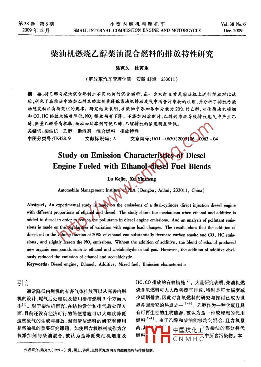 第38卷第6期小型內(nèi)燃機(jī)與摩托車Vol 38 No 62009年12月SMALL INTERNAL COMBUSTION ENGINE AND MOTORCYCLEoec.2009柴油機(jī)燃燒乙醇柴油混合燃料的排放特性硏究陸克久徐寅生(解放軍汽車管理學(xué)院安徽蚌埠23011摘要:將乙醇與柴油混合配制出不同比例的混合燃料,在一臺(tái)雙缸直噴式柴油機(jī)上進(jìn)行排放對(duì)比試驗(yàn),研究了在柴油中添加乙醇及助溶劑能降低柴油杋排放廢氣中所含污染物的機(jī)理,并分析了排放污染物隨發(fā)動(dòng)機(jī)負(fù)荷變化的規(guī)律。研究結(jié)果表明,在柴油中添加體積分?jǐn)?shù)為20%的乙醇,可使柴油機(jī)碳煙和C0、HC排放大幅度降低,№O排放稍有下降。不添加助溶劑時(shí),乙醇的摻混導(dǎo)致排放尾氣中產(chǎn)生乙醇、微量乙醛等有機(jī)物,而添加助溶劑可使乙醇、乙醛排放的濃度明顯降低。關(guān)鍵詞:柴油機(jī)乙醇助溶劑混合燃料排放特性中圖分類號(hào):TK428.9文獻(xiàn)標(biāo)識(shí)碼:A文章編號(hào):1671-0630(2009)06-0063-04Study on Emission Characteristics of DieselEngine Fueled with Ethanol-diesel Fuel BlendsLu Kejiu, Xu YinshengAutomobile Management Institute of PLA( Bengbu, Anhui, 233011, China)Abstract: An experimental study is made on the emissions of a dual-cylinder direct injection diesel enginewith different proportions of ethanol and diesel. The study shows the mechanism when ethanol and additive isadded to diesel in order to reduce the pollutants in diesel engine emissions. And an analysis of pollutant emissions is made on the regularities ofvanation with engine load changesdiesel oil in the volume fraction of 20% of ethanol can substantially decrease carbon smoke and Co, HC emissions,and slightly lessen the NO, emissions. Without the addition of additive, the blend of ethanol producednew organic compounds such as ethanol and acetaldehyde in tail gas. However, the addition of additive obviously reduced the emission of ethanol and acetaldehydeKeywords: Diesel engine, Ethanol, Additive, Mixed fuel, Emission characteristic引言HC、CO排放的有效措施。大量研究表明,柴油機(jī)燃通常降低內(nèi)燃機(jī)的有害氣體排放可以從完善內(nèi)燃燒含氧燃料可大大改善廢氣排放特別是可大幅度減機(jī)的設(shè)計(jì)尾氣后處理以及使用清潔燃料3個(gè)方面入少碳煙排放因此對(duì)含氧燃料的研究與探討已成為世1l對(duì)于柴油機(jī)而言,在結(jié)構(gòu)設(shè)計(jì)和排氣后處理方界各國(guó)研究的熱點(diǎn)之一。。乙醇作為一種含氧且具面,目前還沒(méi)有經(jīng)濟(jì)可行的簡(jiǎn)便措施可以大幅度降低有可再生性的生物能源被認(rèn)為是一種較理想的代用這些廢氣的生成與排放,因而清潔燃料的研究和使用燃料”。由于乙醇和柴油能夠均勻混合,且含氧量是柴油機(jī)的重要研究課題。如使用含氧燃料或作為含高H中國(guó)煤化工為柴油的部分替代氧添加劑與柴油混合被認(rèn)為是降低柴油機(jī)煙度及燃料CNMHG中所含污染物。本作者簡(jiǎn)介:陸克久(1969-),男,碩士,講師主要研究方向?yàn)閮?nèi)燃機(jī)結(jié)構(gòu)與排放控制小型內(nèi)燃機(jī)與摩托車第38卷試驗(yàn)探索了乙醇柴油混合燃料和助溶劑的制備方法,3試驗(yàn)結(jié)果與分析研究了摻混乙醇對(duì)柴油機(jī)排放的影響??紤]到摻混乙3.1煙度特性醇會(huì)導(dǎo)致新有害物質(zhì)的生成,所以除了考察排放標(biāo)準(zhǔn)碳煙是柴油機(jī)尾氣的主要污染物之一,一般多在規(guī)定的煙度、NO、HC和CO指標(biāo)外,還對(duì)乙醇乙醛的高負(fù)荷或加速的條件下產(chǎn)生。圖1給出了各種燃料的排放進(jìn)行了研究。煙度排放與負(fù)荷的關(guān)系。由圖1可知,同種燃料的煙1試驗(yàn)燃料度排放會(huì)隨著負(fù)荷的增大而增加。這是由于隨著負(fù)荷1.1助溶劑的制備的增大,每循環(huán)的噴油量增加,即α降低,缸內(nèi)局部出助溶劑的主要成分為不飽和酸+高分子聚合物+現(xiàn)過(guò)濃混合氣的幾率變大,所以煙度的排放隨負(fù)荷的卵磷脂。助溶劑的制備方法是將不飽和酸和高分子聚增大而增加。當(dāng)負(fù)荷小于7kW時(shí),煙度的排放維持在合物按3:1的體積比混合,置于真空旋轉(zhuǎn)蒸發(fā)儀中,較低水平。隨著負(fù)荷的增加,當(dāng)負(fù)荷達(dá)到138kW時(shí)加入體積約為不飽和酸15%的二甲苯和5%的酞酸四排氣煙度顯著增加。其中純柴油的煙度為3.1BU,而丁酯。反應(yīng)過(guò)程中,水溫控制在0℃,真空泵抽真空,E10、E20、E30乙醇柴油混合燃料分別為2BsU反應(yīng)時(shí)間3~4h。加入體積約為不飽和酸2%的卵磷1.4BSU、1.8BSU,分別降低了35.5%、54.8%、脂,得到棕黃色的粘稠狀液體助溶劑。41.9%。可見(jiàn),摻混乙醇的柴油較純柴油燃燒排氣煙1.2乙醇柴油混合燃料的制備度有顯著的降低,并當(dāng)乙醇摻混量為20%時(shí),煙度排本試驗(yàn)采用市售0柴油與無(wú)水乙醇將乙醇和柴放降低效果最為顯著。摻混乙醇導(dǎo)致煙度降低的主要油按不同的體積比進(jìn)行混合,得到混合乙醇柴油(EX原因,一是因?yàn)橐掖既剂显诟邷叵聲?huì)發(fā)生微爆效應(yīng),有乙醇+柴油X為乙醇的摻混比)。本試驗(yàn)首先將無(wú)助于缸內(nèi)混合氣的均勻混合及燃燒,從而抑制了碳煙水乙醇按10%、20%和30%的體積比(分別記為E10、的生成;另外因?yàn)橐掖际且环N含氧燃料,這等于增大了E20和E30純柴油記為EO)與柴油混合,然后在攪拌a,在一定程度上促進(jìn)了