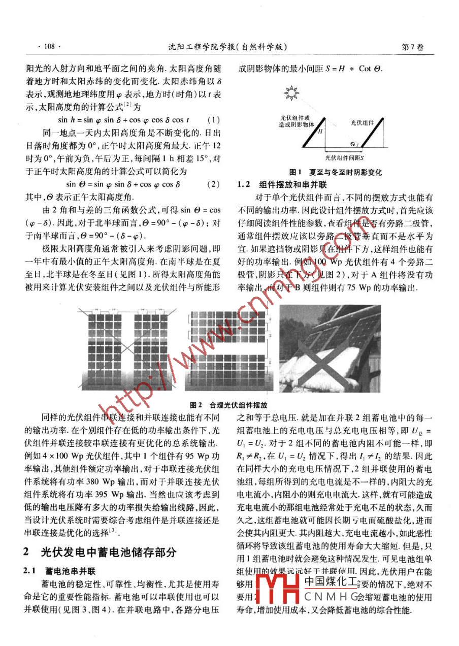 第7卷第2期沈陽(yáng)工程學(xué)院學(xué)報(bào)(自然科學(xué)版)Vol.7 No.22011年4月.Jourmal of Shenyang Institute of Engineering( Natural Science)Apr. 2011光伏系統(tǒng)的優(yōu)化設(shè)計(jì)李實(shí),田春寧 ,鞠振河,殷志剛(遼寧太陽(yáng)能研究應(yīng)用有限公司,沈陽(yáng)110034)摘要: 針對(duì)電陽(yáng)能光伏發(fā)電的飛速發(fā)展,提出了在光伏系統(tǒng)設(shè)計(jì)中應(yīng)注意的問(wèn)題并作了簡(jiǎn)要分析.同時(shí)分別對(duì)光伏組件擺放和串并聯(lián),以及不同陣列間距的計(jì)算進(jìn)行了分析,指出了光伏系統(tǒng)中影響蓄電池使用壽命的主要因素及注意事項(xiàng),并給出了合理的建議.關(guān)鍵詞:光伏組件;蓄電池;光伏陣列中圖分類號(hào): TM615文獻(xiàn)標(biāo)識(shí)碼: B文章編號(hào): 1673 - 1603(2011)02 -0107 -04行每瓦最多20元人民幣的補(bǔ)貼.2009年7月16日,財(cái)0引言政部等3部門聯(lián)合印發(fā)了《關(guān)于實(shí)施金太陽(yáng)示范工程隨著光伏發(fā)電的快速發(fā)展,2007年全球太陽(yáng)能新的通知》,決定綜合采取財(cái)政補(bǔ)助科技支持和市場(chǎng)拉裝容量已達(dá)2 826 MWp. 2007年,在太陽(yáng)能光電產(chǎn)業(yè)動(dòng) 方式,加快國(guó)內(nèi)光伏發(fā)電的產(chǎn)業(yè)化和規(guī)模化發(fā)展,并鏈中有大量的投資集中到新產(chǎn)能的提升上.此外,太陽(yáng)計(jì)劃在2 ~3年內(nèi),采取財(cái)政補(bǔ)助方式支持不低于500能光電企業(yè)在2007年間的貸款融資金額增長(zhǎng)了近MW的光伏發(fā)電示范項(xiàng)目.國(guó)家將原則上按光伏發(fā)電100億美元,使得該產(chǎn)業(yè)規(guī)模不斷擴(kuò)大.2008年全球光系統(tǒng)及其配套輸配電工程總投資的50%給予補(bǔ)助;其伏市場(chǎng)增至5.5 GW,全球太陽(yáng)能安裝總量已累計(jì)達(dá)中偏遠(yuǎn)無(wú)電地區(qū)的獨(dú)立光伏發(fā)電系統(tǒng)按總投資的15GW.雖然受金融危機(jī)影響,德國(guó)、西班牙對(duì)太陽(yáng)能70%給予補(bǔ)助;對(duì)于光伏發(fā)電關(guān)鍵技術(shù)產(chǎn)業(yè)化和基礎(chǔ)光伏發(fā)電的扶持力度有所降低,但其他國(guó)家的政策扶能力建設(shè)項(xiàng)目,主要通過(guò)貼息和補(bǔ)助的方式給予支持.持力度卻在逐年加大.日本政府2008年11月發(fā)布了單個(gè)光伏發(fā)電項(xiàng)目裝機(jī)容量不低于300kWp、建設(shè)周“太陽(yáng)能發(fā)電普及行動(dòng)計(jì)劃”,確定太陽(yáng)能發(fā)電量到期原則上不超過(guò)1年、運(yùn)行期不少于20年的,屬于國(guó)家2030年的發(fā)展目標(biāo)是要達(dá)到2005年的40倍,并在財(cái)政補(bǔ)助的項(xiàng)目范圍內(nèi)".然而,對(duì)于光伏工程項(xiàng)目特3~5年后,將太陽(yáng)能電池系統(tǒng)的價(jià)格降至目前的-半別是光伏獨(dú)立系統(tǒng),不能盲目地追求光伏工程的容量,左右;2009年還專門安排30億日元的補(bǔ)助金,專項(xiàng)鼓否則將會(huì)造成財(cái)力人力物力的大量浪費(fèi).對(duì)于光伏設(shè)計(jì)勵(lì)太陽(yáng)能蓄電池的技術(shù)開(kāi)發(fā).2008年9月16日,美國(guó)人員,應(yīng)該全面考慮光伏系統(tǒng)各個(gè)不同部件和系統(tǒng)總體參議院通過(guò)了一攬子減稅計(jì)劃,其中將光伏行業(yè)的減的組合優(yōu)化. 這些應(yīng)該包括光伏組件部分線路傳輸部稅政策(ITC)續(xù)延2~6年.分能址儲(chǔ)存部分、系統(tǒng)控制部分的優(yōu)化設(shè)計(jì).中國(guó)太陽(yáng)能資源非常豐富,理論儲(chǔ)量達(dá)每年1光伏組件 部分17000億t標(biāo)準(zhǔn)煤.2007年底,全國(guó)光伏系統(tǒng)的累計(jì)裝機(jī)容址達(dá)到100MW,從事太陽(yáng)能電池生產(chǎn)的企業(yè)1.1組件陰影達(dá)到50余家,太陽(yáng)能電池生產(chǎn)能力為2900 MW ,太陽(yáng)太陽(yáng)能組件安裝地點(diǎn)的選擇,必須考慮到陰影問(wèn)能電池年產(chǎn)量為1 188 MW ,超過(guò)了日本和歐洲.題.因?yàn)橐荒曛刑?yáng)始終是不斷變化的,所以陰影也是在金融危機(jī)形勢(shì)下,2009年3月23日,中國(guó)財(cái)政不斷變化,因此太陽(yáng)能組建系統(tǒng)固定裝置就要采取極部、住房和城鄉(xiāng)建設(shè)部出臺(tái)《太陽(yáng)能光電建筑應(yīng)用財(cái)限計(jì)算方法來(lái)滿足要求,以陰影計(jì)算太陽(yáng)高度角就需政補(bǔ)助資金管理暫行辦法》,決定對(duì)部分光伏建筑進(jìn)要 被引人對(duì)干地殘上的其個(gè)地點(diǎn),太陽(yáng)高度角是指太中國(guó)煤化工收稿日期: 2011-01 -12JTYHCNMHG基金項(xiàng)目:遼[寧省科學(xué)技術(shù)計(jì)劃項(xiàng)日(2004224003) ;遼寧省科技攻X項(xiàng)月(200作者簡(jiǎn)介:李實(shí)( 1962 -),男,沈陽(yáng)人,高級(jí)經(jīng)濟(jì)師,碩上108●沈陽(yáng)工程學(xué)院學(xué)報(bào)(自然科學(xué)版)第7卷陽(yáng)光的入射方向和地平面之間的夾角.太陽(yáng)高度角隨成陰影物體的最小問(wèn)距S=H * Cot 0.著地方時(shí)和太陽(yáng)赤緯的變化而變化.太陽(yáng)赤緯角以δ表示,觀測(cè)地地理緯度用φ表示,地方時(shí)(時(shí)角)以1表染示,太陽(yáng)高度角的計(jì)算公式“為sin h=sinφ sinδ+cosφ cosδcos 1 (1)光伏組件或光伏組件造成陰影物體同一地點(diǎn)- -天內(nèi)太陽(yáng)高度角是不斷變化的.日出日落時(shí)角度都為0°,正午時(shí)太陽(yáng)高度角最大.正午12時(shí)為0° ,午前