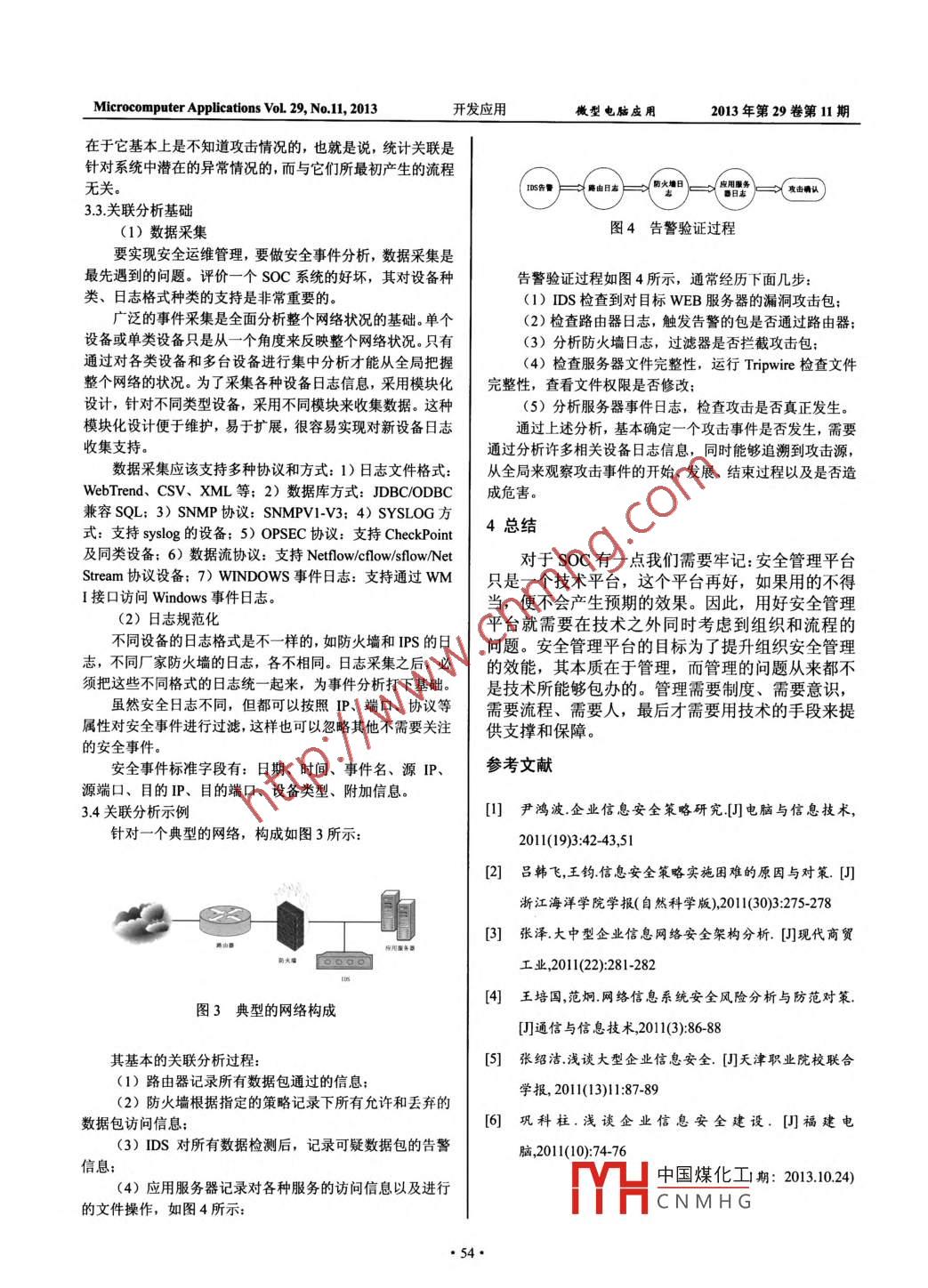 Microcomputer Applications VoL. 29, No.11, 2013開(kāi)發(fā)應(yīng)用微型電腦應(yīng)用2013年第29卷第11期文章編號(hào): 100757210110051-0SOC分析研究楊新鋒,劉克成摘要:闡述了SOC的定義,探討了soc與NOC之間的關(guān)系,詳細(xì)分析了soc應(yīng)該具備的功能,對(duì)SOC的核心一-安全事件關(guān)聯(lián)進(jìn)行了深入的研究,在此基礎(chǔ)上給出了一個(gè)安全事件關(guān)聯(lián)分析示例。關(guān)鍵詞:安全管理平臺(tái);安全事件;關(guān)聯(lián)分析中圖分類號(hào): TP391文獻(xiàn)標(biāo)志碼: AAnalysis and Research on socYang Xinfeng, Liu Kecheng(School of Computer and Iformation Eninering. Nanyang Istitute of Tchnology, Nanyang 43000 China)Abstract: This paper dscerie the dfinitin of soc, explore the rlationship betwen SOc and NOC, deailed alysis the functionsoc should have, Conducted in-depth study the core of soC . scrity event corelation, On this basis,s a security event crelationexample is given.Key words: Security Operations Cener; Secuity Event; Crelation Analysis0引言定義。并且盡管其本質(zhì)是基本相同的,對(duì)于soc這個(gè)術(shù)語(yǔ)在現(xiàn)代虛擬世界中,造成信息安全事件的來(lái)源為病毒、的定義,國(guó)內(nèi)外還存在不小的區(qū)別。國(guó)際上,一般將soc看作是安全運(yùn)營(yíng)中心,它是-個(gè)蠕蟲(chóng)或木馬,不變的安全事件來(lái)源就是“人”。為適應(yīng)各式對(duì)ITC (In-the-Cloud)服務(wù)及配套的CPE (Custoner Premi各樣攻擊手法、符合政府或企業(yè)法規(guī)要求,企業(yè)采取各種信se- Equipment)設(shè)施進(jìn)行全面監(jiān)控、運(yùn)維、管理的場(chǎng)所,并息安全科技,包含防毒、防火墻、主機(jī)型/網(wǎng)絡(luò)型入侵防御涵蓋相關(guān)的物理安全防護(hù)設(shè)施、辦公設(shè)施、人員組織、工作系統(tǒng)、身份認(rèn)證與存取權(quán)限管理系統(tǒng)及身份安全、VPN甚流程和技術(shù)支撐環(huán)境。至網(wǎng)絡(luò)存取控制等,各種技術(shù)提供現(xiàn)代化信息安全防護(hù)的解在國(guó)內(nèi),一般將soc寬泛地等價(jià)于安全管理平臺(tái)。安決方案"。信息安全事件管理,包含監(jiān)控、分析及反應(yīng),這些多樣全管理平臺(tái)的一-般性定 義是:安全管理平臺(tái)是一一個(gè)以資產(chǎn)為核心,以安全事件管理為關(guān)鍵流程,采用安全域劃分的思化科技的結(jié)合對(duì)企業(yè)也產(chǎn)生新的挑戰(zhàn),即是沒(méi)有一個(gè)方式可想,建立一套實(shí)時(shí)的資產(chǎn)風(fēng)險(xiǎn)模型, 協(xié)助管理員進(jìn)行事件以標(biāo)準(zhǔn)化、去重復(fù)化及關(guān)連這些存在于不同科技之事件。此分析、風(fēng)險(xiǎn)分析、預(yù)警管理和應(yīng)急響應(yīng)處理的集中安全管理外,對(duì)于管理人員而言,通常管理防毒系統(tǒng)為-組人員, 管.系統(tǒng)。理IPS為一組人員,而管理防火墻也許又為另-組,這樣導(dǎo)嚴(yán)格意義上而言,soc不等同于安全管理平臺(tái),安全致整體信息安全的管理出現(xiàn)各自為戰(zhàn)的窘境,對(duì)實(shí)時(shí)信息安管理平臺(tái)僅僅是soc的技術(shù)支撐部分。一個(gè)完整的soc不全事件的關(guān)聯(lián)分析也造成極大困難,由于要將上下游事件串僅包括安全管理平臺(tái),還包括配套的組織、流程、場(chǎng)地等等。起,信息安全事件之后的調(diào)查時(shí)間會(huì)格外地冗長(zhǎng)1??梢?jiàn),國(guó)內(nèi)所指的soc本質(zhì)上與國(guó)際上的定義是相同的。有鑒于此,企業(yè)為了達(dá)到安全水平,需要建設(shè)一個(gè)集中但是,由于國(guó)內(nèi)soc發(fā)展的歷史原因,形成了國(guó)內(nèi)外在s式資源,以跨越及整合這些不同層面之信息安全產(chǎn)品及管理oC定義上的形式化差異。資源,達(dá)到監(jiān)控、分析及快速響應(yīng)),因此soc (Security2SOC與NOC的關(guān)系Operations Center) 應(yīng)運(yùn)而生。網(wǎng)絡(luò)安全的發(fā)展隨著網(wǎng)絡(luò)建設(shè)經(jīng)歷了三個(gè)階段:一是防1 Soc的定義火墻、防病毒與入侵檢測(cè)系統(tǒng)IDS (Intrusion Detection Sys關(guān)于soc的定義,目前為止還沒(méi)有一個(gè)統(tǒng)一的標(biāo)準(zhǔn)化作者簡(jiǎn)介:楊新鋒(9792).男,議.河南省內(nèi)鄉(xiāng)衛(wèi)人。南陽(yáng)理工學(xué)院計(jì)算機(jī)科學(xué)與技術(shù)系。中國(guó)煤化工。南陽(yáng),473000劉克成(1962-),男,議,陜西省橫山縣人,南陽(yáng)理I學(xué)院計(jì)算機(jī)科學(xué)與技術(shù)系.碩MHCNMHG究。南陽(yáng),47300.Microcomputer Applications Vol. 29, No.11, 2013開(kāi)發(fā)應(yīng)用微型電腦應(yīng)用.2013年第29卷第11期tem)部署的初級(jí)階段4。二是隨著網(wǎng)絡(luò)擴(kuò)大,各種業(yè)務(wù)從對(duì)安全事件的分析與取證。由此soC的功能發(fā)展就延伸為相互獨(dú)立到共同運(yùn)營(yíng),網(wǎng)絡(luò)管理中出現(xiàn)的安全域的概念,利3個(gè)維度,如圖2所示:用隔離技術(shù)把網(wǎng)絡(luò)分為邏輯的安全區(qū)域,并大量的使用區(qū)域?qū)徲?jì)↑邊界防護(hù)與脆弱性掃描與用戶接入控制技術(shù),此時(shí)的安全技術(shù)分為防護(hù)、監(jiān)控、審計(jì)、認(rèn)證、掃描等多種體系,紛繁復(fù)應(yīng)用審計(jì)雜,稱為安全建設(shè)階段51。三是隨著業(yè)務(wù)的增多,網(wǎng)絡(luò)的安數(shù)據(jù)庫(kù)審計(jì)全管理成為網(wǎ