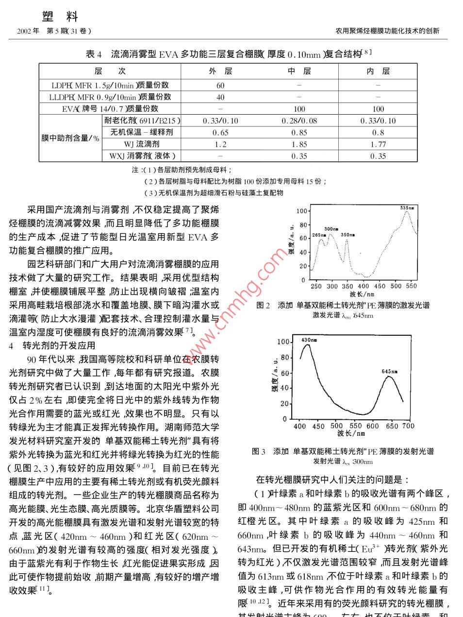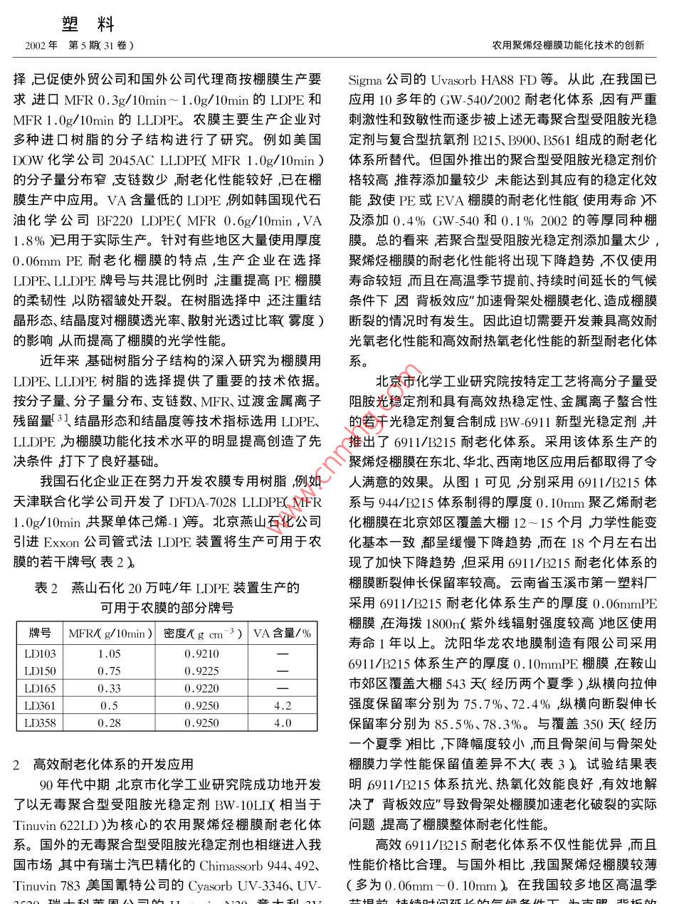 塑料農(nóng)用聚烯烴棚膜功能化技術(shù)的創(chuàng)新2002年第5期(31卷)農(nóng)用塑料特輯陳宇高繼志?( 1.北京市化學工業(yè)研究院北京100084 2.沈陽華龍農(nóng)地膜制造有限公司沈陽1 10034 )摘要簡述了功能性棚膜基礎(chǔ)樹脂的技術(shù)要求和我國近年來研究開發(fā)的高效耐老化體系、流滴消霧體系、轉(zhuǎn)光劑應(yīng)用效果,論述了EVA多功能棚膜、聚烯烴長壽棚膜、茂金屬聚乙烯棚膜和專用化棚膜的性能特點,以及外涂型流滴消霧劑開發(fā)應(yīng)用進展情況并提出了發(fā)展建議。關(guān)鍵詞功能性棚膜基礎(chǔ)樹脂耐老化體系流滴消霧體系轉(zhuǎn)光劑;外涂型流滴劑中圖分類號:TQ320.721 ,TQ325.1文獻標識碼 A文章編號:1001 - 9456( 2002 )05 - 0017- 10 .Functionalization Innovation of Agricultrual Polyolefin Greenhouse FilmsCHEN Yul GAO Jji-zhi2( 1. Beijing Research Institute of Chemical Industry , Beiing 100084 China;2. Shenyang Hualong Agricultural Film Manufacture Ltd , Shenyang 110034 China)Abstract The technique demand for functional greenhouse film' s base resin and the application effectsof efficient anti-aging system dripping and fog- reducing system photo transforming agent studied in recentyears are reviewed. The performances and characteristics of EVA multifunctional films ,polyolefin long-lifefilm mPE film ,customizational film and the progress of the research and application for coating drippingfog- reducing agent are presented. And the advices of development are given.Key words :functional greenhouse film ;base resin ianti- aging system ;dripping and fog reducing sys-tem photo-transforming agent coating dripping agent20世紀80年代中期以來我國塑料棚室”特別1基 礎(chǔ)樹脂的分子結(jié)構(gòu)研究與選擇是節(jié)能型日光溫室栽培面積迅速擴大。1998~1999多年來農(nóng)膜生產(chǎn)企業(yè)以熔體流動速率(MFR)為年度全國設(shè)施園藝栽培面積已達2148萬畝其中日光依據(jù)選擇棚膜生產(chǎn)用LDPE、LLDPE。近年的研究結(jié)溫室栽培面積528萬畝(表1 ),比1988~ 1989年度分果表明基礎(chǔ)樹脂分子量、分子量分布、支鏈數(shù)等指標別增加13.3倍和28.8倍1。與此同時根據(jù)設(shè)施園對耐候性的影響與MFR(熔體流動速率)具有同等甚藝的發(fā)展要求我國農(nóng)膜生產(chǎn)企業(yè)與農(nóng)用塑料助劑科至更實際的指導意義"[3]。一些企業(yè),已選用分子量研院所及生產(chǎn)企業(yè)密切合作強化技術(shù)創(chuàng)新相繼開發(fā)較高、分子量分布較窄、支鏈數(shù)較少的樹脂生產(chǎn)耐老化成功了PE耐老化、流滴耐老化棚膜、EVA多功能棚PE棚膜。按此要求過去采用的MFR 2.0g/ 10min的膜及專用化棚膜等新型棚膜。LDPE、LLDPE在當今功能性PE棚膜生產(chǎn)中的用量表1我國1998~ 1999年度設(shè)施園藝栽培面積[1]已明顯減少。北京燕山石化公司2F0.4A( MFR 0.4g/單位萬畝10min)齊魯石化公司2100TN00( MFR 0. 3g/大、中小棚溫室10min入2101TN00( MFR 0. 85g/10min)等牌號總計小計其中LDPE濟魯石化公司的7042、 天津聯(lián)合化學公司DF-大棚中小棚加熱溫室|日光溫室DA- 7085( MFR 1.0g/ 10min等LLDPE已用于功能性| 2148 1598 690| 908| 55022528PE棚膜生產(chǎn)。由于農(nóng)膜生產(chǎn)企業(yè)注重基礎(chǔ)樹脂的選塑料2002年第5期(31 卷)農(nóng)用聚烯烴棚膜功能化技術(shù)的創(chuàng)新?lián)?,已促使外貿(mào)公司和國外公司代理商按棚膜生產(chǎn)要Sigma公司的Uvasorb HA88 FD等。從此,在我國已求進口MFR 0.3g/ 10min~ 1.0g/ 10min的LDPE和應(yīng)用10多年的GW_540/2002耐老化體系,因有嚴重MFR1.0g/10min的LLDPE。農(nóng)膜主要生產(chǎn)企業(yè)對刺激性和致敏性而逐步被上述無毒聚合型受阻胺光穩(wěn)多種進口樹脂的分子結(jié)構(gòu)進行了研究。例如美國定劑與復(fù)合型抗氧劑B215、B900、B561組成的耐老化DOW化學公司2045AC LLDPE( MFR 1.0g/ 10min )體系所替代。但國外推出的聚合型受阻胺光穩(wěn)定劑價的分子量分布窄支鏈數(shù)少,耐老化性能較好,已在棚格較高推薦添加量較少未能達到其應(yīng)有的穩(wěn)定化效膜生產(chǎn)中應(yīng)用。VA含量低的LDPE例如韓國現(xiàn)代石能致使PE或EVA棚膜的耐老化性能(使用壽命)不油化學公司BF220 LDPE( MFR 0. 6g/10min, VA及添加0.4% GW-540和0.1% 2002 的等厚同種棚1.8% )已用于實際生產(chǎn)。針對有些地區(qū)大量使用厚度膜。總的看來若聚合型受阻胺光穩(wěn)定劑添加量太少0.06mm PE耐老化棚膜的特點,生產(chǎn)企業(yè)在選擇聚烯烴棚膜的耐老化性能將出現(xiàn)下降趨勢,不僅使用LDPE、LLDPE牌號與共混比例時,注重提高PE棚膜壽命較短,而且在高溫季節(jié)提前、持續(xù)時間延長的氣候的柔韌性,以防褶皺處開裂。在樹脂選擇中還注重結(jié)條件下,因背板效應(yīng)”加速骨架處棚膜老化、造成棚膜晶形態(tài)、結(jié)晶度對棚膜透光率、散射光透過比率(霧度)斷裂的情況時有發(fā)生。因此迫切需要開發(fā)兼具高效耐的影響從而提高了棚膜的光學性能。光氧老化性能和高效耐熱氧老化性能的新型耐老化體近年來基礎(chǔ)樹脂分子結(jié)構(gòu)的深入研究為棚膜用LDPE、LLDPE樹脂的選擇提供了重要的技術(shù)依據(jù)。北京市化學工業(yè)研究院按特定工藝將高分子量受按分子量、分子量分布、支鏈數(shù)、MFR、過渡金屬離子阻胺光穩(wěn)定劑和具有高效熱穩(wěn)定性、金屬離子螯合性殘留量3、結(jié)晶形態(tài)和結(jié)晶度等技術(shù)指標選用LD