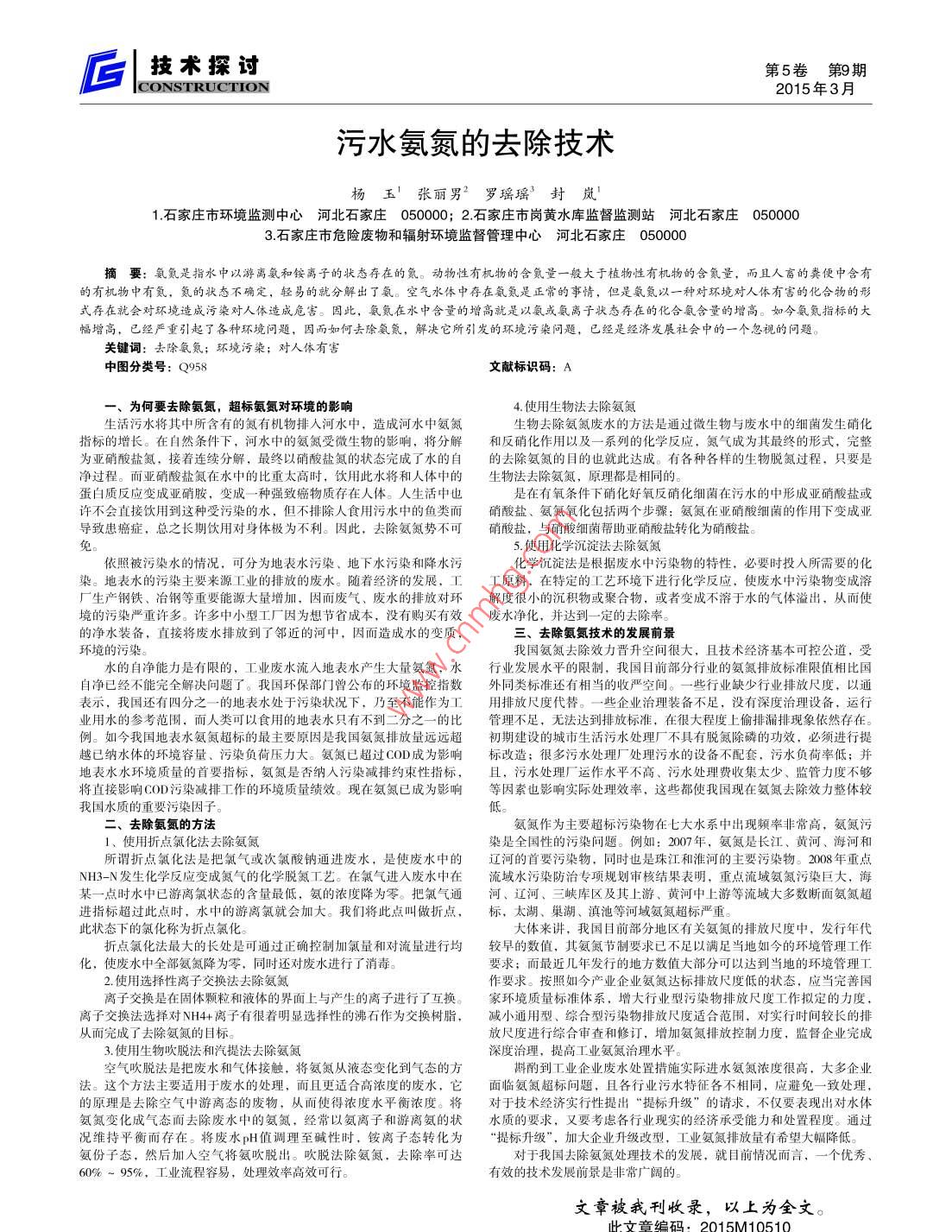 后l技術(shù)探討第5卷第9期CONSTRUCTION2015年3月污水氨氮的去除技術(shù)楊玉'張麗男2羅瑤瑤’封嵐1.石家莊市環(huán)境監(jiān)測中心河北石家莊050000;2.石家莊市崗黃水庫監(jiān)督監(jiān)測站河北石家莊0500003.石家莊市危險廢物和輻射環(huán)境監(jiān)督管理中心河北石家莊050000摘要:氨氮是指水中以游離氨和銨離子的狀態(tài)存在的氮。動物性有機物的含氪量一般大于植物性有機物的含氪量,而且人畜的糞便中含有」的有機物中有氮,氮的狀態(tài)不確定,輕易的就分解出了氨??諝馑w中存在氨氮是正常的事情,但是氫氪以一種對環(huán)境對人體有害的化合物的形式存在就會對環(huán)境造成污燊對人體造成危害。因此,氨氪在水中含量的増高就是以氨或氨離子狀態(tài)存在的化合氡含量的増高。如今氨氪指標(biāo)的大幅增高,已經(jīng)嚴(yán)重引起了各種環(huán)境問題,因而如何去稌氨氮,解決它所引發(fā)的環(huán)境污染問題,已經(jīng)是經(jīng)濟發(fā)展社會中的一個忽視的問題。關(guān)鍵詞:去除氡氪;環(huán)境污染;對人體有害中圖分類號:Q958文獻標(biāo)識碼:A、為何要去除氨氮,超標(biāo)氨氮對環(huán)境的影響4.使用生物法去除氨氮生活污水將其中所含有的氮有機物排入河水中,造成河水中氨氮生物去除氨氮廢水的方法是通過微生物與廢水中的細(xì)菌發(fā)生硝化指標(biāo)的增長。在自然條件下,河水中的氨氮受微生物的影響,將分解和反硝化作用以及一系列的化學(xué)反應(yīng),氮氣成為其最終的形式,完整為亞硝酸鹽氮,接著連續(xù)分解,最終以硝酸鹽氮的狀態(tài)完成了水的自的去除氨氮的目的也就此達(dá)成。有各種各樣的生物脫氮過程,只要是凈過程。而亞硝酸鹽氮在水中的比重太高時,飲用此水將和人體中的生物法去除氨氮,原理都是相同的蛋白質(zhì)反應(yīng)變成亞硝胺,變成一種強致癌物質(zhì)存在人體。人生活中也是在有氧條件下硝化好氧反硝化細(xì)菌在污水的中形成亞硝酸鹽或許不會直接飲用到這種受污染的水,但不排除人食用污水中的魚類而硝酸鹽、氨氮氧化包括兩個步驟:氨氮在亞硝酸細(xì)菌的作用下變成亞導(dǎo)致患癌癥,總之長期飲用對身體極為不利。因此,去除氨氮勢不可硝酸鹽,與硝酸細(xì)菌幫助亞硝酸鹽轉(zhuǎn)化為硝酸鹽。5.使用化學(xué)沉淀法去除氨氮依照被污染水的情況,可分為地表水污染、地下水污染和降水污化學(xué)沉淀法是根據(jù)廢水中污染物的特性,必要時投入所需要的化染。地表水的污染主要來源工業(yè)的排放的廢水。隨著經(jīng)濟的發(fā)展,工工原料,在特定的工藝環(huán)璄下進行化學(xué)反應(yīng),使廢水中污染物變成溶廠生產(chǎn)鋼鐵、冶鋼等重要能源大量増加,因而廢氣、廢水的排放對環(huán)解度很小的沉積物或聚合物,或者變成不溶于水的氣體溢出,從而使境的污染嚴(yán)重許多。許多中小型工廠因為想節(jié)省成本,沒有購買有效廢水凈化,并達(dá)到一定的去除率的凈水裝備,直接將廢水排放到了鄰近的河中,因而造成水的變質(zhì)三、去除氨氮技術(shù)的發(fā)展前景環(huán)境的污染我國氨氮去除效力晉升空間很大,且技術(shù)經(jīng)濟基本可控公道,受水的自凈能力是有限的,工業(yè)廢水流入地表水產(chǎn)生大量氨氮,水行業(yè)發(fā)展水平的限制,我國目前部分行業(yè)的氨氮排放標(biāo)準(zhǔn)限值相比國自凈已經(jīng)不能完全解決問題了。我國環(huán)保部門曾公布的環(huán)境監(jiān)控指數(shù)外同類標(biāo)準(zhǔn)還有相當(dāng)?shù)氖諊?yán)空間。一些行業(yè)缺少行業(yè)排放尺度,以通表示,我國還有四分之一的地表水處于污染狀況下,乃至不能作為工用排放尺度代替。一些企業(yè)治理裝備不足,沒有深度治理設(shè)備,運行業(yè)用水的參考范圍,而人類可以食用的地表水只有不到二分之一的比管理不足,無法達(dá)到排放標(biāo)準(zhǔn),在很大程度上偷排漏排現(xiàn)象依然存在。例。如今我國地表水氨氮超標(biāo)的最主要原因是我國氨氮排放量遠(yuǎn)遠(yuǎn)超初期建設(shè)的城市生活污水處理廠不具有脫氮除磷的功效,必須進行提越已納水體的環(huán)境容量、污染負(fù)荷壓力大。氨氮已超過COD成為影響標(biāo)改造;很多污水處理廠處理污水的設(shè)備不配套,污水負(fù)荷率低;并地表水水環(huán)境質(zhì)量的首要指標(biāo),氨氮是否納入污染減排約束性指標(biāo),且,污水處理廠運作水平不高、污水處理費收集太少、監(jiān)管力度不夠?qū)⒅苯佑绊慍OD污染減排工作的環(huán)境質(zhì)量績效。現(xiàn)在氨氮已成為影響等因素也影響實際處理效率,這些都使我國現(xiàn)在氨氮去除效力整體較我國水質(zhì)的重要污染因子低去除氨氮的方法氨氮作為主要超標(biāo)污染物在七大水系中出現(xiàn)頻率非常高,氨氮污1、使用折點氯化法去除氨氮染是全國性的污染問題。例如:2007年,氨氮是長江、黃河、海河和所謂折點氯化法是把氯氣或次氯酸鈉通進廢水,是使廢水中的遼河的首要污染物,同時也是珠江和淮河的主要污染物。2008年重點NH3-N發(fā)生化學(xué)反應(yīng)變成氮氣的化學(xué)脫氮工藝。在氯氣進入廢水中在流域水污染防治專項規(guī)劃審核結(jié)果表明,重點流域氨氮污染巨大,海某一點時水中已游離氯狀態(tài)的含