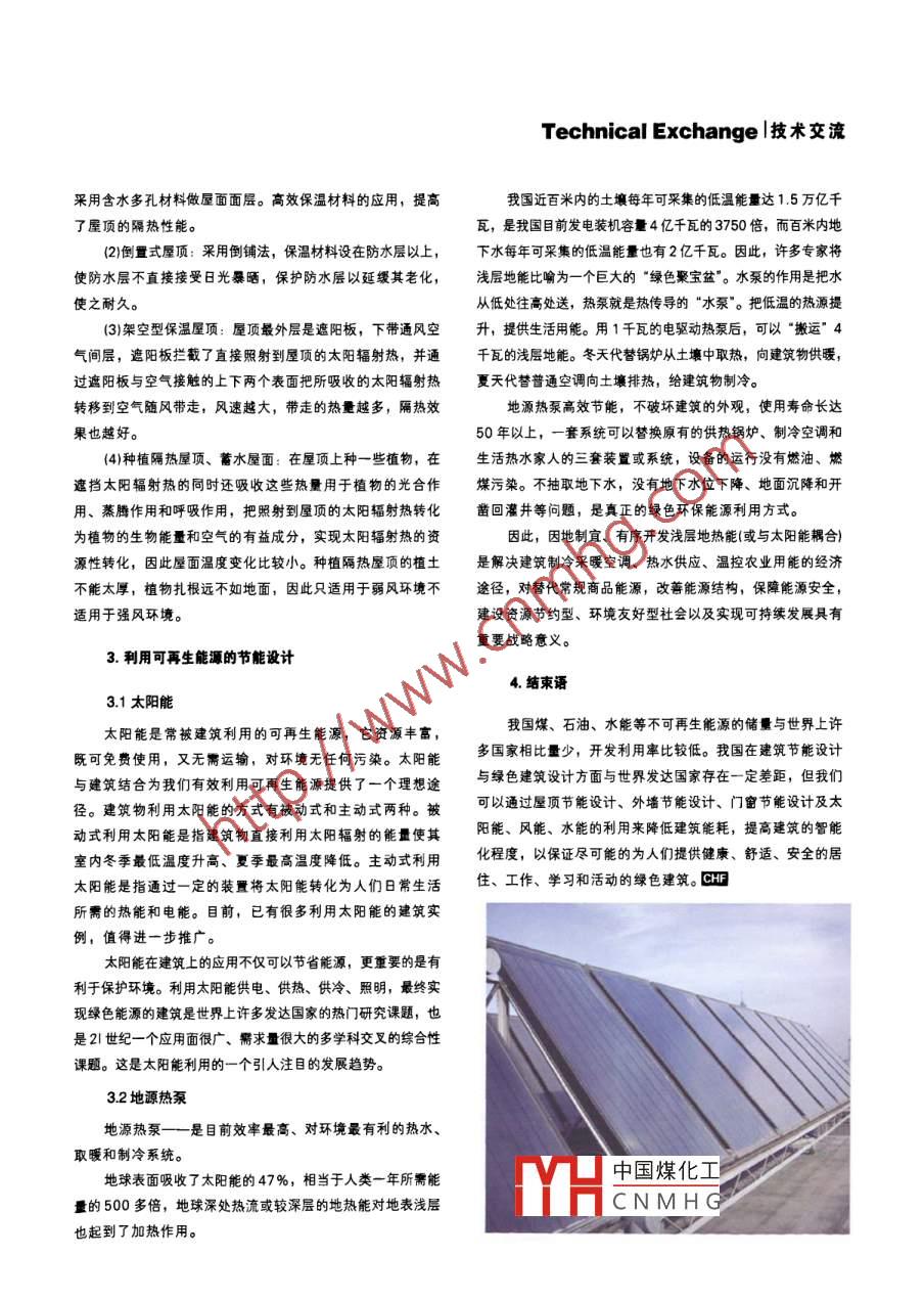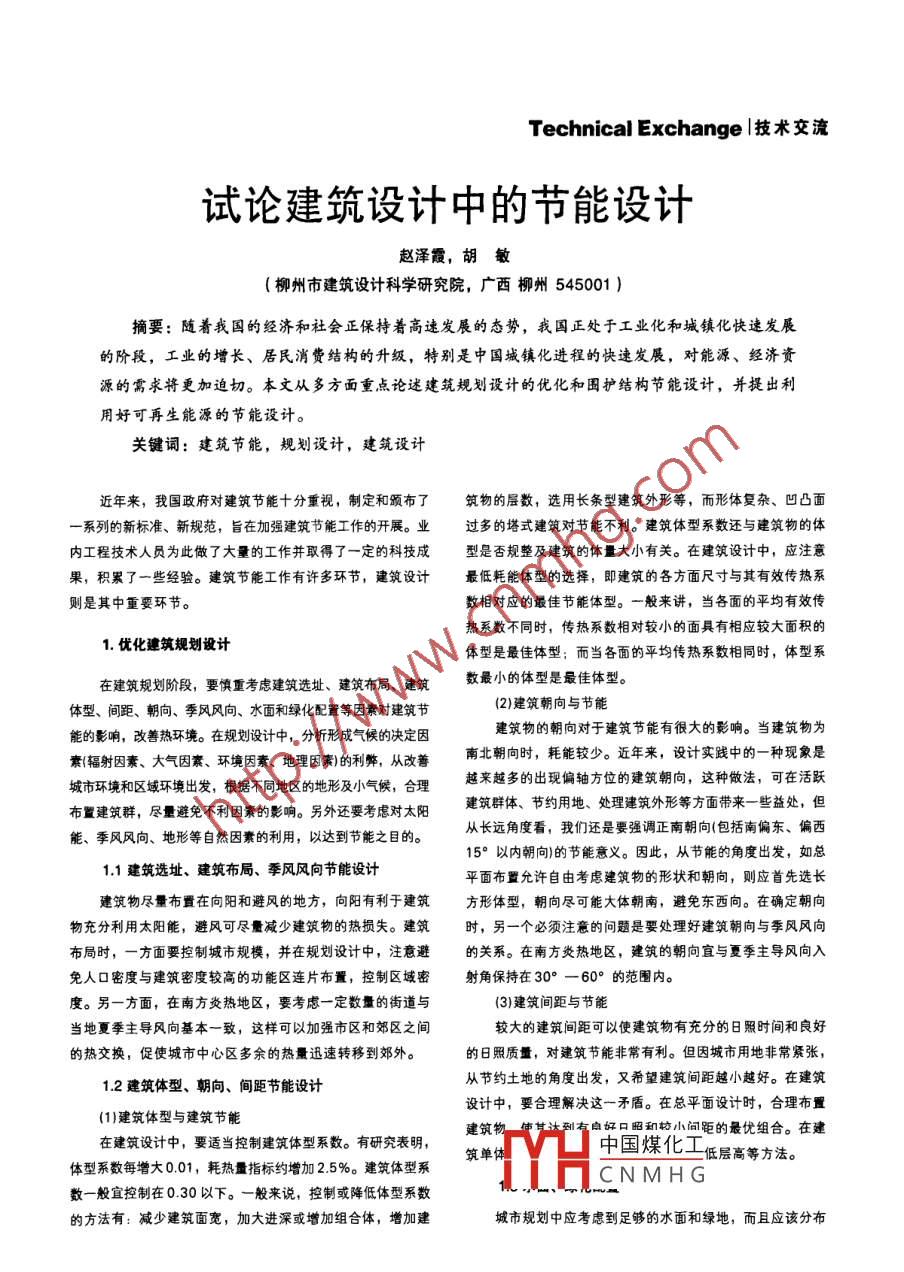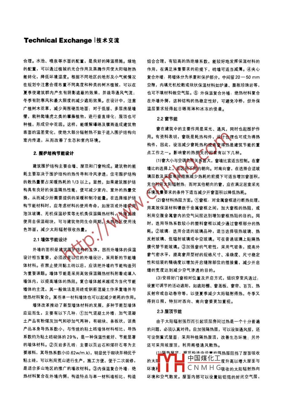 Technical Exchange |技術(shù)交流試論建筑設(shè)計(jì)中的節(jié)能設(shè)計(jì)趙澤霞,胡 敏(柳州市建筑設(shè)計(jì)科學(xué)研究院,廣西柳州545001 )摘要:隨著我國(guó)的經(jīng)濟(jì)和社會(huì)正保持著高速發(fā)展的態(tài)勢(shì),我國(guó)正處于工業(yè)化和城鎮(zhèn)化快速發(fā)展的階段,工業(yè)的增長(zhǎng)、居民消費(fèi)結(jié)構(gòu)的升級(jí),特別是中國(guó)城鎮(zhèn)化進(jìn)程的快速發(fā)展,對(duì)能源、經(jīng)濟(jì)資源的需求將更加迫切。本文從多方面重點(diǎn)論述建筑規(guī)劃設(shè)計(jì)的優(yōu)化和圍護(hù)結(jié)構(gòu)節(jié)能設(shè)計(jì),并提出利用好可再生能源的節(jié)能設(shè)計(jì)。關(guān)鍵詞:建筑節(jié)能,規(guī)劃設(shè)計(jì),建筑設(shè)計(jì)近年來,我國(guó)政府對(duì)建筑節(jié)能十分重視,制定和頒布了筑物的層數(shù),選用長(zhǎng)條型建筑外形等,而形體復(fù)雜、凹凸面-系列的新標(biāo)準(zhǔn)、新規(guī)范,旨在加強(qiáng)建筑節(jié)能工作的開展。業(yè)過多的塔式建筑對(duì)節(jié)能不利。建筑體型系數(shù)還與建筑物的體內(nèi)工程技術(shù)人員為此做了大量的工作并取得了一定的科技成型是否規(guī)整及建筑的體量大小有關(guān)。在建筑設(shè)計(jì)中,應(yīng)注意果,積累了一些經(jīng)驗(yàn)。建筑節(jié)能工作有許多環(huán)節(jié),建筑設(shè)計(jì)最低耗能體型的選擇,即建筑的各方面尺寸與其有效傳熱系則是其中重要環(huán)節(jié)。數(shù)相對(duì)應(yīng)的最佳節(jié)能體型。-般來講,當(dāng)各面的平均有效傳熱系數(shù)不同時(shí),傳熱系數(shù)相對(duì)較小的面具有相應(yīng)較大面積的1.優(yōu)化建筑規(guī)劃設(shè)計(jì)體型是最佳體型;而當(dāng)各面的平均傳熱系數(shù)相同時(shí),體型系在建筑規(guī)劃階段,要慎重考慮建筑選址、建筑布局、建筑數(shù)最小的體型是最佳體型。體型、間距、朝向、季風(fēng)風(fēng)向、水面和綠化配置等因素對(duì)建筑節(jié)(2)建筑朝向與節(jié)能能的影響,改善熱環(huán)境。在規(guī)劃設(shè)計(jì)中,分析形成氣候的決定因建筑物的朝向?qū)τ诮ㄖ?jié)能有很大的影響。當(dāng)建筑物為素(輻射因素、大氣因素、環(huán)境因素、地理因素)的利弊,從改善南北朝向時(shí),耗能較少。近年來,設(shè)計(jì)實(shí)踐中的一種現(xiàn)象是城市環(huán)境和區(qū)域環(huán)境出發(fā),根據(jù)不同地區(qū)的地形及小氣候,合理越來越多的出現(xiàn)偏軸方位的建筑朝向,這種做法,可在活躍布置建筑群,盡量避免不利因素的影響。另外還要考慮對(duì)太陽(yáng)建筑群體、節(jié)約用地、處理建筑外形等方面帶來-些益處, 但能、季風(fēng)風(fēng)向、地形等自然因素的利用,以達(dá)到節(jié)能之目的。從長(zhǎng)遠(yuǎn)角度看,我們還是要強(qiáng)調(diào)正南朝向(包括南偏東、偏西15°以內(nèi)朝向)的節(jié)能意義。因此,從節(jié)能的角度出發(fā),如總1.1建筑選址、建筑布局、季風(fēng)風(fēng)向節(jié)能設(shè)計(jì)平面布置允許自由考慮建筑物的形狀和朝向,則應(yīng)首先選長(zhǎng)建筑物盡量布置在向陽(yáng)和避風(fēng)的地方,向陽(yáng)有利于建筑方形體型,朝向盡可能大體朝南,避免東西向。在確定朝向物充分利用太陽(yáng)能,避風(fēng)可盡量減少建筑物的熱損失。建筑時(shí),另一個(gè)必須注意的問題是要處理好建筑朝向與季風(fēng)風(fēng)向布局時(shí),一方面要控制城市規(guī)模,并在規(guī)劃設(shè)計(jì)中,注意避的關(guān)系。在南方炎熱地區(qū),建筑的朝向宜與夏季主導(dǎo)風(fēng)向入免人口密度與建筑密度較高的功能區(qū)連片布置,控制區(qū)域密射角保持在30° - - 60°的范圍內(nèi)。度。另-方面,在南方炎熱地區(qū),妻考慮- -定數(shù)量的街道與(3)建筑間距與節(jié)能當(dāng)?shù)叵募局鲗?dǎo)風(fēng)向基本一致,這樣可以加強(qiáng)市區(qū)和郊區(qū)之間較大的建筑間距可以使建筑物有充分的8照時(shí)間和良好的熱交換,促使城市中心區(qū)多余的熱量迅速轉(zhuǎn)移到郊外。的日照質(zhì)量,對(duì)建筑節(jié)能非常有利。但因城市用地非常緊張,從節(jié)約土地的角度出發(fā),又希望建筑間距越小越好。在建筑1.2建筑體型、朝向、間距節(jié)能設(shè)計(jì)設(shè)計(jì)中,要合理解決這一矛盾。在總平面設(shè)計(jì)時(shí),合理布置(1)建筑體型與建筑節(jié)能在建筑設(shè)計(jì)中,要適當(dāng)控制建筑體型系數(shù)。有研究表明,建筑物使其達(dá)到有自好口照和校小間距的最優(yōu)組合。在建體型系數(shù)每增大0.01,耗熱量指標(biāo)約增加2.5%。建筑體型系筑單體中國(guó)煤化工低層高等方法。HCNMH G數(shù)一般宜控制在0.30以下。- 般來說,控制或降低體型系數(shù)的方法有:減少建筑面寬,加大進(jìn)深或增加組合體,增加建城市規(guī)劃中應(yīng)考慮到足夠的水面和綠地,而且應(yīng)該分布CHINA HOUSING FACILITIES 57Technical Exchange |技術(shù)交流合理。水池、噴泉等水面的配置,是良好的降溫措施。綠地組合合理,有較高的熱絕緣系數(shù),能較好地發(fā)揮保溫材料的的配置,可以通過植被的光合作用及蒸騰作用使太陽(yáng)輻射熱作用,在滿足承重要求的前提下,磚墻可適當(dā