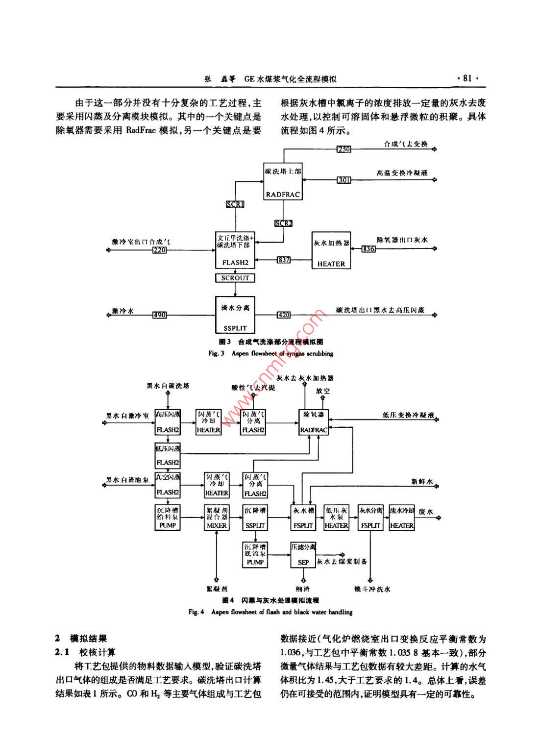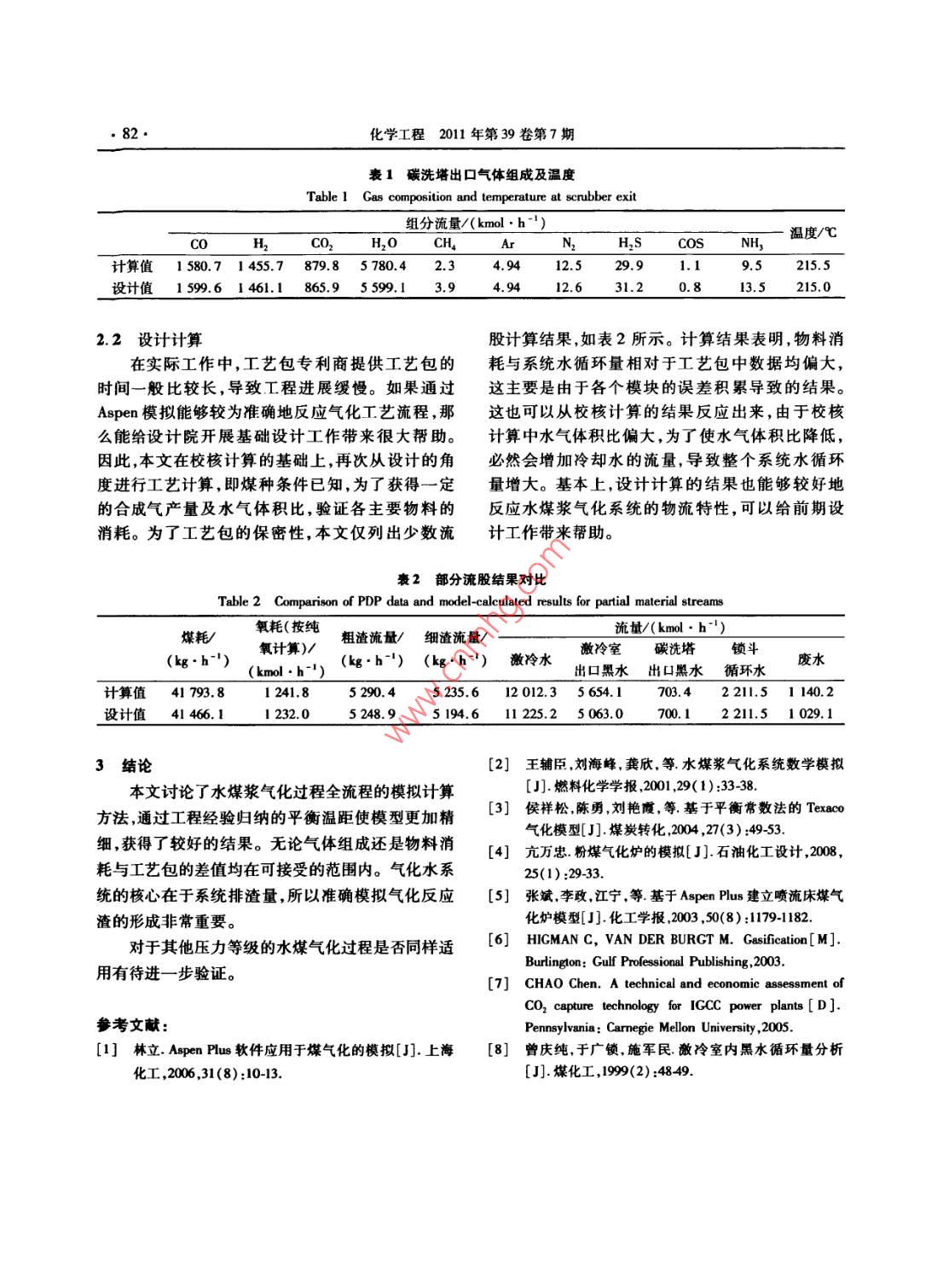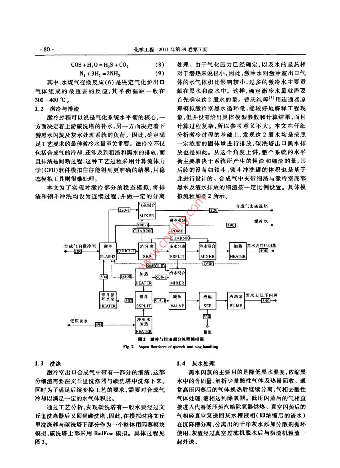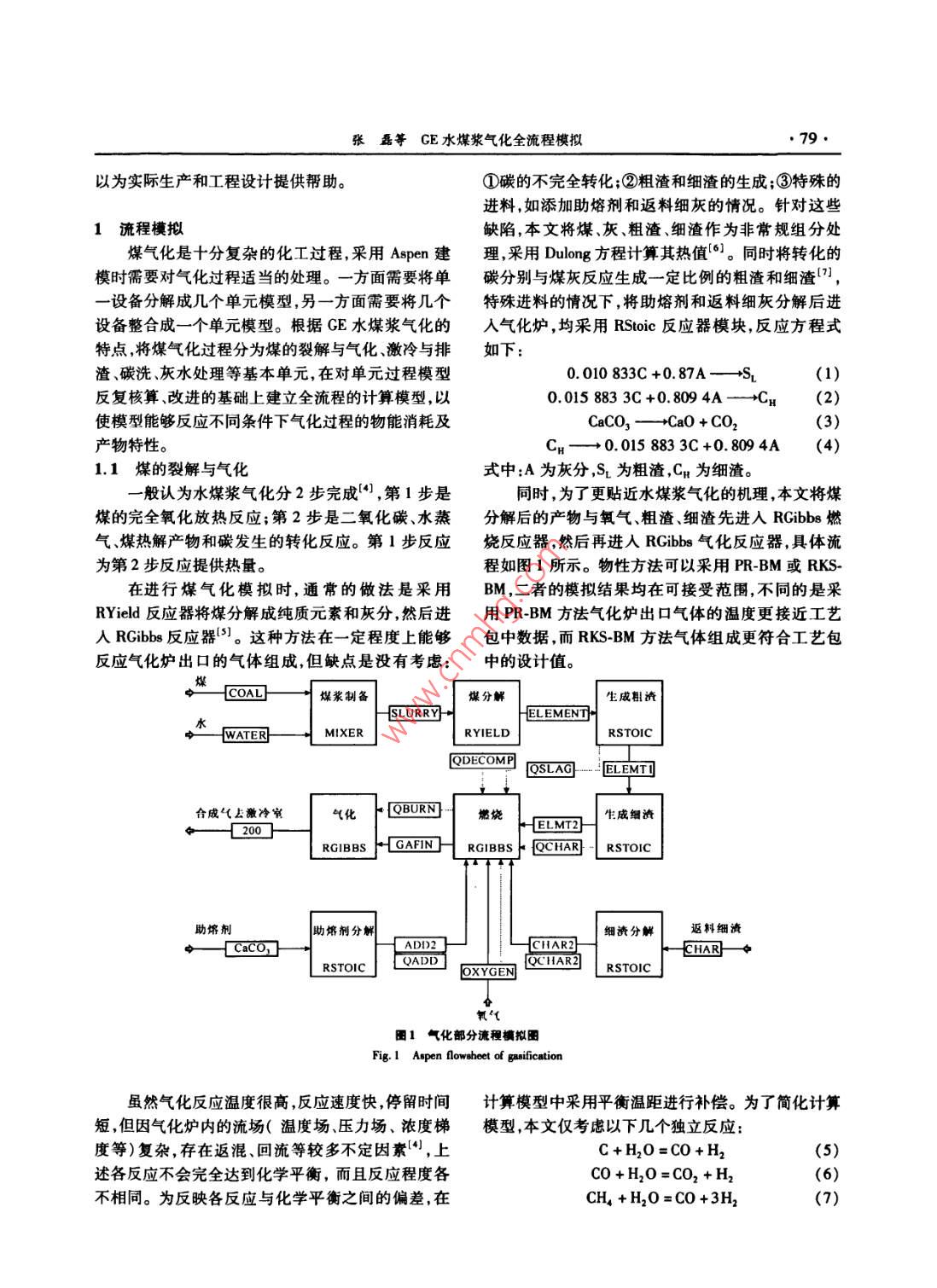第39卷第7期化學(xué)工程Vol. 39 No.72011 年7月CHEMICAL ENGINEERING( CHINA)l. 2011GE水煤漿氣化全流程模擬張磊,汪根寶,謝東升,許兆廣(中國石化集團(tuán)南京工程公司,江蘇南京211100)摘要:GE水煤漿氣化工藝是目前廣泛采用的煤氣化技術(shù)。通過對GE水煤漿氣化全過程的模擬,可以加深對工藝包的理解,對氣化爐進(jìn)行優(yōu)化控制,同時(shí)為工藝設(shè)計(jì)和生產(chǎn)操作提供指導(dǎo)。文中根據(jù)GE水煤漿氣化的T.藝特點(diǎn),將水煤漿氣化過程分為煤的裂解與氣化激冷與排渣、碳洗、閃蒸與灰水處理等基本單元過程,在對單元過程模型反復(fù)核算改進(jìn)的基礎(chǔ)上采用Aspen Plus建立了GE水煤漿氣化全流程的計(jì)算模型。通過校核計(jì)算與設(shè)計(jì)計(jì)算2種方式分別進(jìn)行了模型驗(yàn)證,2種計(jì)算結(jié)果均與工藝包數(shù)據(jù)較為吻合,證明所建立的模型適用于CE氣化過程的計(jì)算,可以對GE氣化爐的氣化過程作出相對合理的預(yù)測。關(guān)鍵詞:Aspen Plus;冰煤漿;氣化;激冷;灰水處理;碳洗;模擬中圖分類號(hào):TQ 054文獻(xiàn)標(biāo)識(shí)碼:A文章編號(hào):1005-9954(2011 )07-0078-05Simulation of whole GE water-coal slurry gasification processZHANG Lei, WANG Gen-bao, XIE Dong-sheng, XU Zhao-guang(Sinopee Nanjng Engineering & Construction lnc.,Nanjing 21100 , Jiangsu Province, China)Abstract :GE water coal slumy gasification process is one of the commonly-used advanced gasification technologies.The simulation of whole GE gasification can improve the understanding of the process and be used 8s a predictivetool at the optimization stage, and also provide guidance for process design and production operation. The featuresof CE slurry gasification were analyzed, which can be divided into several units of coal pyrolysis and gasification,quench and slag handing, syngas scrubbing, fash, and black water handling. The calculation model of whole CEwater- coal slury gasification process was set up with Aspen Plus based on the testing and verifying section models.The model was verified through rating and designing calculations. Two calculation results are in agreement with thedata in process design package( PDP). It indicates that the developed model is feasible to calculate and predict theGE gasification.Key words: Aspen Plus; water-coal slurry; gasification; quench; black water handling; syngas scrubbing; simulation立足于中國的能源結(jié)構(gòu)及國家宏觀發(fā)展戰(zhàn)略的擬分析,可以更深人地了解其工藝,并對氣化爐進(jìn)行轉(zhuǎn)變,潔凈煤技術(shù)作為可持續(xù)發(fā)展和實(shí)現(xiàn)2個(gè)根本優(yōu)化控制",提高整個(gè)過程的熱效率;同時(shí)可以預(yù)轉(zhuǎn)變的戰(zhàn)略措施之一,得到了 政府的大力支持。煤測不同條件下氣化爐出口煤氣的成分及污染物的排氣化技術(shù)是實(shí)現(xiàn)煤炭潔凈利用的關(guān)鍵共性技術(shù),是放,為工程設(shè)計(jì)提供指導(dǎo)。發(fā)展煤基化學(xué)品煤基液體燃料、煤氣化聯(lián)合循環(huán)發(fā)煤氣化的模擬工作得到許多研究人員的重電多聯(lián)產(chǎn)等過程工業(yè)的龍頭和基礎(chǔ)。其中,GE公視[23),但大部分的工作僅集中在氣化部分,對包括司開發(fā)的水煤漿氣化(原德士古水煤漿加壓氣化技激冷、排渣洗滌、閃蒸等工序在內(nèi)的整個(gè)水煤漿氣術(shù))具有煤種適應(yīng)性強(qiáng)、碳轉(zhuǎn)化率高、適合作化工合化流程模擬卻很少關(guān)注。而這些T序?qū)饣到y(tǒng)的成原料氣、三廢處理方便、操作穩(wěn)定等優(yōu)點(diǎn),成為迄物料消耗能量消耗及利用起著重要作用。因此,本今為止工業(yè)化較好的煤氣化技術(shù),在國內(nèi)得到了廣文開展了氣化全流程的模擬計(jì)算工作,通過對氣化泛應(yīng)用。工藝的分析,將氣化過程分為若干子過程進(jìn)行模擬,通過Aspen Plus對整個(gè)水煤漿氣化過程進(jìn)行模并與工藝包提供的數(shù)據(jù)對比,取得了理想的結(jié)果,可收稿日期:2010-12-24作者簡介:張磊( 1981- -),男,碩士,工程師、從事化工設(shè)計(jì)工作,E-mail:hanglei01. snei@ sinopec. com。張磊等GE水煤漿氣化全流程模擬●79.以為實(shí)際生產(chǎn)和工程設(shè)計(jì)提供幫助。①碳的不完全轉(zhuǎn)化;②粗渣和細(xì)渣的生成;③特殊的進(jìn)料,如添加助熔劑和返料細(xì)灰的情況。針對這些1流程模擬缺陷,,本文將煤、灰、粗渣細(xì)渣作為非常規(guī)組分處煤氣化是十分復(fù)雜的化工過程,采用Aspen 建理,采用Dulong方程計(jì)算其熱值'°]。同時(shí)將轉(zhuǎn)化的模時(shí)需要對氣化過程適當(dāng)?shù)奶幚怼?-方面需要將單碳分別與煤灰反應(yīng)生成--定比例的粗渣和細(xì)渣["),一設(shè)備分解成幾個(gè)單元模型,另一方面需要將幾個(gè)特殊進(jìn)料的情況下,將助熔劑和返料細(xì)灰分解后進(jìn)設(shè)備整合成-一個(gè)單元模型。根據(jù)GE水煤漿氣化的人氣化爐,均采用RSloic反應(yīng)器模塊,反應(yīng)方程式特點(diǎn),將煤氣化過程分為煤的裂解與氣化、激冷與排如下:渣碳洗、灰水處理等基本單元,在對單元過程模型0.010 833C +0.87A-→+S(1)反復(fù)核算、改進(jìn)的基礎(chǔ)上建立全流程的計(jì)算模型,以0.015 883 3C +0.809 4A--→Cp(2)使模型能夠反應(yīng)不同條件下氣化過程的物能消耗及CaCO,一→CaO + CO2(3)產(chǎn)物特性。Cp-→ 0.015 883 3C +0.809 4A(4)1.1 煤的裂解與氣化式中:A為灰分,SL為粗渣,Cp為細(xì)渣。- -般