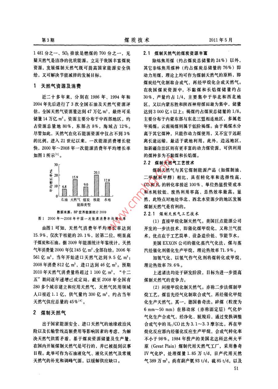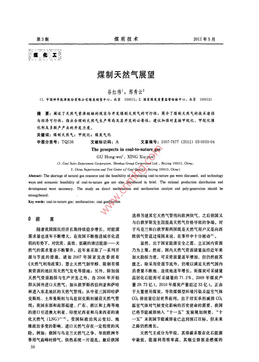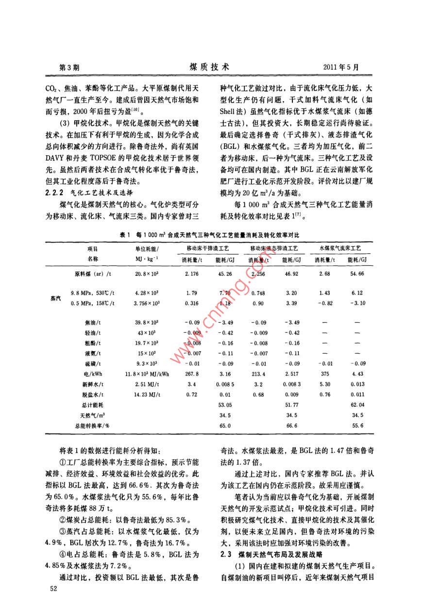 第3期煤質(zhì)技術(shù)2011年5月煤制天然氣展望谷紅偉,邢秀云1.中國神華能源股份有限公司煤炭銷售中心,北京10001;2.國家煤炭質(zhì)量監(jiān)督檢驗(yàn)中心,北京10003)摘要:闡迷了天然氣資源短缺的現(xiàn)實(shí)與開發(fā)煤制天然氣的可行性,簡介了煤制天然氣的技術(shù)途與經(jīng)濟(jì)可行性,指出合理的天然氣生產(chǎn)布局及其開發(fā)的必要性,建議加強(qiáng)對直接甲烷化、甲烷化催化劑及多聯(lián)產(chǎn)產(chǎn)業(yè)的開發(fā)力度關(guān)鍵詞:煤制天然氣;甲烷化;煤炭氣化中圖分類號:TQ536文獻(xiàn)標(biāo)識碼:A文章編號:1007-7677(2011)03-0050-04GU Hong-wei, XING Xiu-yun2(1. Coal Sales Department Corporation, Shenhua Group Cor poration Ltd, Beijing 100011, China2. China Supervision and Test Center of Coal Quality, Beijing 100013, ChinaAbstract: The shortage of natural gas resource and the feasibility of developing coal-to-nature gas were discussed, and technologyand economic feasibility of coal-to-nature gas are also introduced in brief. The ratn distribution anddevelopment were necessary. The study on direct methanation and methanation catalyst andstrengthenedKey words: coal-to-nature gas; methanation; coal gasification前言選擇另建其它天然氣管線向歐洲供氣,之后俄國又與白俄羅斯發(fā)生因提高天然氣價格導(dǎo)致的爭端。對隨著我國國民經(jīng)濟(jì)長期持續(xù)穩(wěn)步增長,對能源于烏克蘭和白俄羅斯兩國既是天然氣用戶又是向西需求量也逐年不斷增大。在我國不斷推進(jìn)城市化進(jìn)歐供氣管道過境國來說,在事件中十分被動。。程的形勢下,對優(yōu)質(zhì)、高效、低碳的清潔能源——天顯然,出于國家能源安全之需,立足國內(nèi)資源然氣的需求量亦不斷攀升。近年來采取了一系列開乃為上策。然而,國內(nèi)天然氣資源儲量雖經(jīng)近年來源與節(jié)流的措施,諸如2007年國家發(fā)改委頒布加大勘探力度,可采資源量逐年增加,但仍然極其《天然氣利用政策》,禁止天然氣制甲醇、限制有煤匱乏。除采用資源節(jié)流外,仍難以滿足天然氣國內(nèi)炭資源的地區(qū)用天然氣發(fā)電等措施;另外,除加強(qiáng)消費(fèi)量不斷地、連續(xù)地逐年增長。而煤炭可采儲量天然氣資源勘探與生產(chǎn)開發(fā)之外,自2006年開始高居化石能源可采儲量的71.2%,2009年煤炭產(chǎn)即從國外進(jìn)口天然氣,如從俄羅斯西伯利亞和薩哈量29.73億t,2010年煤炭產(chǎn)量超過33億t。正由林進(jìn)入東北地區(qū)的天然氣管線;從中亞三國即哈薩于大量使用煤炭,導(dǎo)致煤煙型環(huán)境污染及溫室氣體克斯坦、土庫曼斯坦與烏茲別克斯坦鋪設(shè)天然氣管CO2排放量位居世界前列。出于切實(shí)承擔(dān)減排CO2線;我國東部和南部福建、廣東、浙江和上海等地溫室氣體對氣候變化影響的歷史使命的需要,我國的港口引進(jìn)澳大利亞、印度尼西亞和馬來西亞的液已將節(jié)能減排納入“十一五”發(fā)展規(guī)劃綱要,“十化天然氣(LNG)1-。受國際政治風(fēng)云變幻,地五”末我國節(jié)能減排業(yè)已達(dá)到預(yù)訂目標(biāo),但未來緣政治多變的影響,進(jìn)口天然氣存在一定程度的風(fēng)之路仍然漫長。險(xiǎn)。例如:俄國與烏克蘭天然氣之爭,導(dǎo)致歐洲冬天然氣主成分為甲烷,其排碳系數(shù)在化石能源季用氣高峰時停氣,供熱系統(tǒng)一片混亂。最后俄國中最低,能源利用效率高,其煙塵排放是燃煤的第3期煤質(zhì)技術(shù)2011年5月1481分之一、SO2排放是燃煤的700分之一,無21煤制天然氣的煤炭資源豐富疑天然氣是潔凈的優(yōu)質(zhì)能源。立足于我國豐富煤炭除煉焦用煤(約占煤炭總儲量的24%)以外,資源,發(fā)展煤制天然氣既可提高國家能源安全供其它非煉焦用煤種(約占煤炭總儲量的76%)給,又可解決節(jié)能減排的發(fā)展目動力用煤,理論上均可作為煤制天然氣的原料,即1天然氣資源及消費(fèi)煤炭經(jīng)氣化制取合成氣,再經(jīng)甲烷化合成天然氣在我國煤炭資源中,不黏煤和長焰煤儲量約占近二十多年來,分別在1986年、1994年和30%,產(chǎn)量約占1/4,主要集中于華北和西北地2004年先后進(jìn)行了3次全國石油及天然氣資源評區(qū),又以內(nèi)蒙東勝和陜西神府煤田最為集中,儲量估。全國天然氣資源量達(dá)到47萬億m3,最終可采達(dá)到300億t以上;褐煤約占煤炭總儲量的1/8。儲量14萬億m。資源主要分布于中西部地區(qū),約主要分布于內(nèi)蒙東部與東北三盟相連地區(qū),多屬老占資源總量地80%,東部占8%,海域占12%。年褐煤。云南褐煤則屬于低階褐煤。由于褐煤水分盡管如此,天然氣在化石能源資源中僅占不到3%高于其它煤種,只能作動力煤使用,又不宜于遠(yuǎn)距的比例。進(jìn)入21世紀(jì)以來,一次能源消費(fèi)增長較離長途運(yùn)輸,最適于就地利用。此外,邊遠(yuǎn)地區(qū),快,2000年~2008年一次能源消費(fèi)年平均增長率如新疆自治區(qū)則有更豐富的動力煤資源,可供利用如圖1所示1的煤種多為不黏煤和長焰煤。2.2煤制天然氣工藝技煤制天然氣與其它煤制能源產(chǎn)品(如煤制油二甲醚和甲醇)相比,具有轉(zhuǎn)化率和選擇性高,CO和H2的轉(zhuǎn)化率接近100%、單位熱值投資成本和水耗較低、廢熱利用率高、總熱效率最高。顯石油大然氣煤炭核能水電然,此特點(diǎn)對地處華北、西北水資源少的地區(qū)發(fā)展能源類型煤制天然氣是