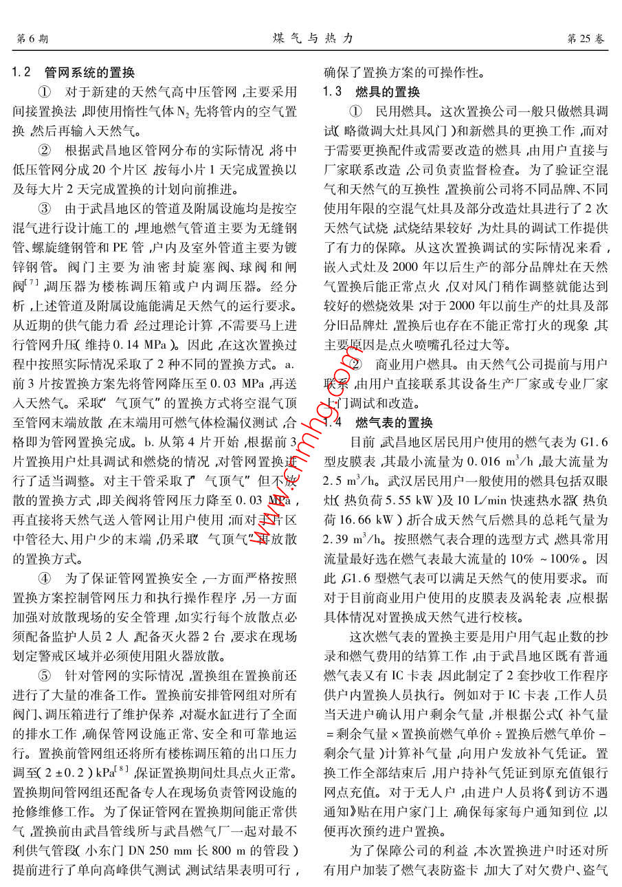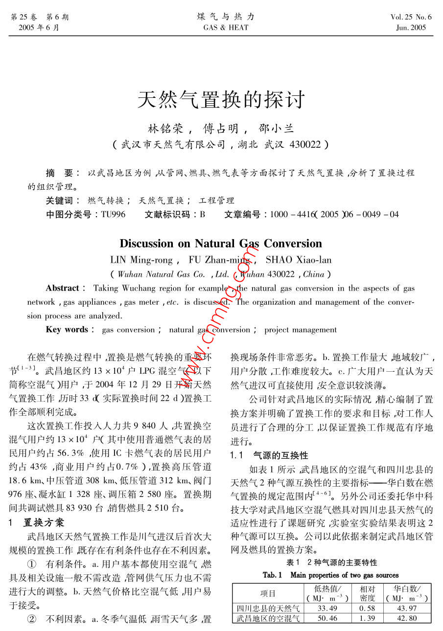 笫25卷第6期煤氣與熱力Vol 25 No 62005年6月gas heatJun.2005天然氣置換的探討林銘榮,傅占明,邵小蘭(武漢市天然氣有限公司,湖北武漢430022)摘要:以武昌地區(qū)為例從管網(wǎng)、燃具、燃?xì)獗淼确矫嫣接懥颂烊粴庵脫Q分析了置換過(guò)程的組織管理。關(guān)鍵詞:燃?xì)廪D(zhuǎn)換;天然氣置換;工程管理中圖分類號(hào):TU996文獻(xiàn)標(biāo)識(shí)碼:B文章編號(hào):1000-4416(200506-0049-04Discussion on Natural Gas ConversionLIN Ming-rong, FU Zhan-ming, SHAO Xiao-lan( Wuhan Natural Gas Co., Ltd., Wuhan 430022, ChinaAbstract: Taking Wuchang region for example the natural gas conversion in the aspects ofnetwork, gas appliances, gas meter etc. is discussed. The organization and management of the conver-sion process are analyzedKey words: gas conversion natural gas conversion; project management在燃?xì)廪D(zhuǎn)換過(guò)程中,置換是燃?xì)廪D(zhuǎn)換的重要環(huán)換現(xiàn)場(chǎng)條件非常惡劣。b.置換工作量大地域較廣,節(jié)=3。武昌地區(qū)約13×104戶LPG混空氣(以下用戶分散,作難度較大。c.廣大用戶一直認(rèn)為天簡(jiǎn)稱空混氣)用戶,于2004年12月29日開始天然然氣進(jìn)漢可直接使用安全意識(shí)較淡薄。氣置換工作歷時(shí)33d實(shí)際置換時(shí)間22d)置換工公司針對(duì)武昌地區(qū)的實(shí)際情況精心編制了置作全部順利完成。換方案并明確了置換工作的要求和目標(biāo),對(duì)工作人這次置換工作投入人力共9840人共置換空員進(jìn)行了合理的分工以保證置換工作規(guī)范有序地混氣用戶約13×10戶(其中使用普通燃?xì)獗淼木舆M(jìn)行民用戶約占56.3%使用C卡燃?xì)獗淼木用裼脩?.1氣源的互換性約占43%,商業(yè)用戶約占0.7%),置換高壓管道如表1所示武昌地區(qū)的空混氣和四川忠縣的186km、中壓管道308km、低壓管道312km、閥門天然氣2種氣源互換性的主要指標(biāo)—一華白數(shù)在燃976座、凝水缸1328座、調(diào)壓箱2580座。置換期氣置換的規(guī)定范圍內(nèi)←6]。另外公司還委托華中科間共調(diào)試燃具83930臺(tái)銷售燃具2510臺(tái)技大學(xué)對(duì)武昌地區(qū)空混氣燃具對(duì)四川忠縣天然氣的1置換方案適應(yīng)性進(jìn)行了課題研究實(shí)驗(yàn)室實(shí)驗(yàn)結(jié)果表明這2武昌地區(qū)天然氣置換工作是川氣進(jìn)漢后首次大種氣源可以互換。公司以此依據(jù)來(lái)制定武昌地區(qū)管規(guī)模的置換工作既存在有利條件也存在不利因素。網(wǎng)及燃具的置換方案。①有利條件。a.用戶基本都使用空混氣燃表12種氣源的主要特性具及相關(guān)設(shè)施一般不需改造管網(wǎng)供氣壓力也不需Tab. 1 Main properties of two gas sources進(jìn)行大的調(diào)整。b,天然氣價(jià)格比空混氣低,用戶易項(xiàng)目低熱值相對(duì)華白數(shù)M.密度(M,m-3)于接受。四川忠縣的天然氣33.490.5843.97②不利因素。a.冬季氣溫低雨雪天氣多,置武昌地區(qū)的空混氣50.461.3942:80第6期煤氣與熱力第25卷1.2管網(wǎng)系統(tǒng)的置換確保了置換方案的可操作性。①對(duì)于新建的天然氣高中壓管網(wǎng),主要采用1.3燃具的置換間接置換法即使用惰性氣體N2先將管內(nèi)的空氣置①民用燃具。這次置換公司一般只做燃具調(diào)換然后再輸入天然氣。試(略微調(diào)大灶具風(fēng)門)和新燃具的更換工作,而對(duì)②根據(jù)武昌地區(qū)管網(wǎng)分布的實(shí)際情況將中于需要更換配件或需要改造的燃具由用戶直接與低壓管網(wǎng)分成20個(gè)片區(qū)按每小片1天完成置換以廠家聯(lián)系改造公司負(fù)責(zé)監(jiān)督檢查。為了驗(yàn)證空混及每大片2天完成置換的計(jì)劃向前推進(jìn)。氣和天然氣的互換性置換前公司將不同品牌、不同③由于武昌地區(qū)的管道及附屬設(shè)施均是按空使用年限的空混氣灶具及部分改造灶具進(jìn)行了2次混氣進(jìn)行設(shè)計(jì)施工的埋地燃?xì)夤艿乐饕獮闊o(wú)縫鋼天然氣試燒試燒結(jié)果較好為灶具的調(diào)試工作提供管、螺旋縫鋼管和PE管,戶內(nèi)及室外管道主要為鍍了有力的保障。從這次置換調(diào)試的實(shí)際情況來(lái)看鋅鋼管。閥門主要為油密封旋塞閥、球閥和閘嵌入式灶及2000年以后生產(chǎn)的部分品牌灶在天然閥,調(diào)壓器為樓棟調(diào)壓箱或戶內(nèi)調(diào)壓器。經(jīng)分氣置換后能正常點(diǎn)火僅對(duì)風(fēng)門稍作調(diào)整就能達(dá)到析,上述管道及附屬設(shè)施能滿足天然氣的運(yùn)行要求。較好的燃燒效果對(duì)于2000年以前生產(chǎn)的灶具及部從近期的供氣能力看經(jīng)過(guò)理論計(jì)算不需要馬上進(jìn)分舊品牌灶,置換后也存在不能正常打火的現(xiàn)象其行管網(wǎng)升維持0.14MPa)因此在這次置換過(guò)主要原因是點(diǎn)火噴嘴孔徑過(guò)大等。程中按照實(shí)際情況采取了2種不同的置換方式。a.②商業(yè)用戶燃具。由天然氣公司提前與用戶前3片按置換方案先將管網(wǎng)降壓至0.03MPa再送聯(lián)系由用戶直接聯(lián)系其設(shè)備生產(chǎn)廠家或?qū)I(yè)廠家入天然氣。采取“氣頂氣”的置換方式將空混氣頂上門調(diào)試和改造。至管網(wǎng)末端放散在末端用可燃?xì)怏w檢漏儀測(cè)試合1.4燃?xì)獗淼闹脫Q格即為管網(wǎng)置換完成。b.從第4片開始,根據(jù)前3目前武昌地區(qū)居民用戶使用的燃?xì)獗頌镚1.6片置換用戶灶具