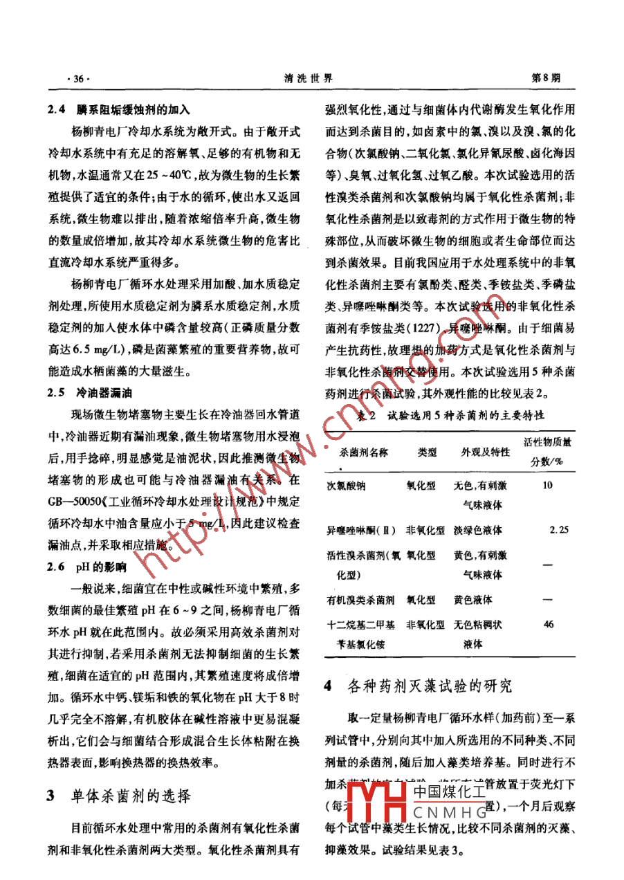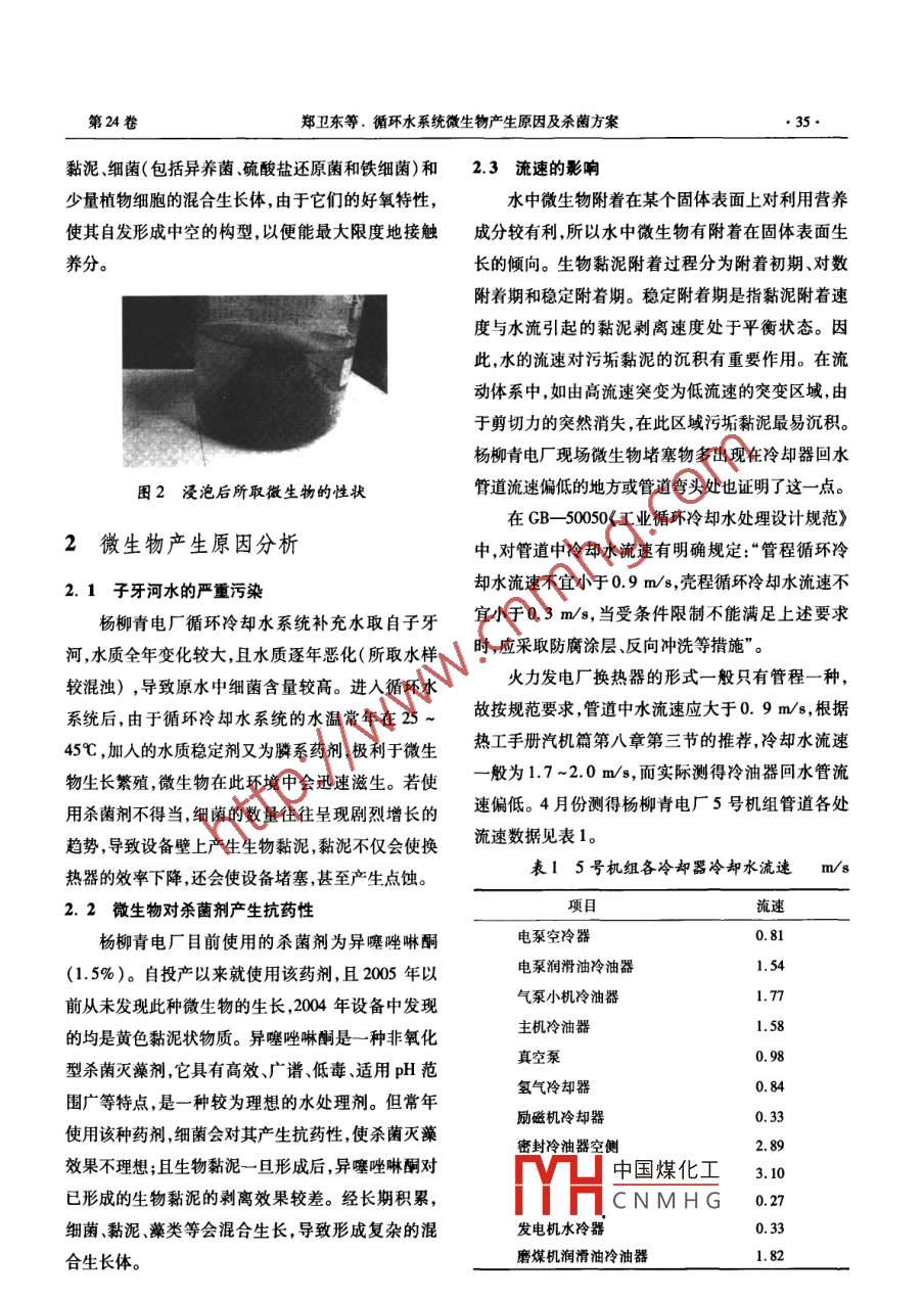 清洗世界第24卷第8期他山之石Cleaning World2008年8月文章編號:1671 - 8909(2008)08 -0034 -06循環(huán)水系統(tǒng)微生物產(chǎn)生原因及殺菌方案鄭衛(wèi)東'馮梅堂'田利2(1.華能楊柳青發(fā)電廠,天津300380; 2. 西安熱工研究院有限公司,陜西西安710032)商要:對楊柳青電廠循環(huán)水系統(tǒng)微生物堵塞物進行了菌種分析,并對微生物堵塞物形成的原因進行了探討,針對分析出的菌種(主要為異養(yǎng)菌)進行殺菌試驗,并提出了系統(tǒng)運行殺菌處理方案。關(guān)鍵詞:微生物;菌種分析;殺菌試驗中圖分類號:TQ 085*.4文獻標識碼:B楊柳青電廠地處天津市近郊,有2臺300 MW發(fā)電機組。該廠循環(huán)冷卻水系統(tǒng)補充水取自子牙1微生物種類的確定河,水質(zhì)全年變化較大,且逐年惡化。為節(jié)約用水、,管道微生物污堵情況示于圖1。堵物外觀呈黑降低水耗,循環(huán)水系統(tǒng)處理采用加酸.加水質(zhì)穩(wěn)定劑褐色絲 帶狀物集合生長體,經(jīng)水浸泡后,絲狀物變?yōu)樘幚?并采用1.5%的異噻唑啉酮進行殺菌處理,循中空的桿狀物,見圖2。用手輕捻泡開的桿狀物,立環(huán)冷卻水的排污水通過反滲透處理后回用,循環(huán)水即松散為油泥狀,未感覺有植物纖維,鏡檢(400倍)水質(zhì)有一定改善。全廠輔機設(shè)備用水均采用循環(huán)清楚地看到鐵細菌、寄生蟲卵和少量植物細胞。水,2006年5號機組小修設(shè)備解體后發(fā)現(xiàn),汽機側(cè)冷經(jīng)過顯微鏡鏡檢和細菌種類分析,堵塞物中含卻器回水部分管道(尤其是水平管道和管道的轉(zhuǎn)彎有大量的異養(yǎng)菌、硫酸鹽還原菌和鐵細菌,生物體為處)有微生物及黏泥堵塞現(xiàn)象。冷卻塔的分水槽內(nèi)也發(fā)現(xiàn)此類微生物。如果這一問題不解決,長期發(fā)展下去,微生物黏泥附著在管道中,會降低熱交換能力:同時,黏泥若不及時去除,日積月累會造成管道的堵塞及造成垢下微生物腐蝕等。西安熱工研究院有限公司和楊柳青電廠合作,對循環(huán)水系統(tǒng)微生物堵寨物進行了細菌種類鑒別試驗殺菌劑篩選及動態(tài)試驗,并提出了循環(huán)水殺菌滅圍1管道中微生物污 堵情況藻的處理方案。中國煤化工JYHCNMHG作者簡介:鄭衛(wèi)東( 1962 - )男,高工,現(xiàn)主要從事電廠技術(shù)管理工作。第24卷鄭衛(wèi)東等.循環(huán)水系統(tǒng)微生物產(chǎn)生原因及殺菌方案●35.黏泥、細菌(包括異養(yǎng)菌硫酸鹽還原菌和鐵細菌)和2.3 流速的影響少量植物細胞的混合生長體,由于它們的好氧特性,水中微生物附著在某個固體表面上對利用營養(yǎng)使其自發(fā)形成中空的構(gòu)型,以便能最大限度地接觸成分較有利,所以水中微生物有附著在固體表面生養(yǎng)分。長的傾向。生物黏泥附著過程分為附著初期、對數(shù)附著期和穩(wěn)定附著期。穩(wěn)定附著期是指黏泥附著速度與水流引起的黏泥剝離速度處于平衡狀態(tài)。因此,水的流速對污垢黏泥的沉積有重要作用。在流動體系中,如由高流速突變?yōu)榈土魉俚耐蛔儏^(qū)域,由于剪切力的突然消失,在此區(qū)域污垢黏泥最易沉積。楊柳青電廠現(xiàn)場微生物堵塞物多出現(xiàn)在冷卻器回水圖2浸泡后所取微 生物的性狀管道流速偏低的地方或管道彎頭處也證明了這一一點。在GB- -50050<工業(yè)循環(huán)冷卻水處理設(shè)計規(guī)范》2微生物產(chǎn)生原因分析中,對管道中冷卻水流速有明確規(guī)定:“管程循環(huán)冷卻水流速不宜小于0.9 m/s,殼程循環(huán)冷卻水流速不2.1子牙河水的嚴重污染楊柳青電廠循環(huán)冷卻水系統(tǒng)補充水取自子牙宜小于0.3 m/s,當受條件限制不能滿足上述要求河,水質(zhì)全年變化較大,且水質(zhì)逐年惡化(所取水樣時,應采取防腐涂層、反向沖洗等措施"。較混濁) ,導致原水中細菌含量較高。進入循環(huán)水火力發(fā)電廠換熱器的形式- -般只有管程一種,系統(tǒng)后,由于循環(huán)冷卻水系統(tǒng)的水溫常年在25 ~故按規(guī)范要求,管道中水流速應大于0.9 m/s,根據(jù)45C ,加人的水質(zhì)穩(wěn)定劑又為膦系藥劑,極利于微生熱工手冊汽機篇第八章第三節(jié)的推薦,冷卻水流速物生長繁殖,微生物在此環(huán)境中會迅速滋生。若使一般為1.7~2.0 m/s, 而實際測得冷油器回水管流用殺菌劑不得當,細菌的數(shù)量往往呈現(xiàn)劇烈增長的速偏低。4月份測得楊柳青電廠5號機組管道各處趨勢,導致設(shè)備壁上產(chǎn)生生物黏泥,黏泥不僅會使換流速數(shù)據(jù)見表1。表15 號機組各冷卻器冷卻水流速m/s熱器的效率下降,還會使設(shè)備堵塞,甚至產(chǎn)生點蝕。2.2微生物對殺菌劑產(chǎn)生抗藥性項目流速楊柳青電廠目前使用的殺菌劑為異噻唑啉酮,電泵空冷器0.81(1.5%)。自投產(chǎn)以來就使用該藥劑,且2005年以電泵潤滑油冷油器1.54前從未發(fā)現(xiàn)此種微生物的生長,2004年設(shè)備中發(fā)現(xiàn)氣泵小機冷油器1.77的均是黃色黏泥狀物質(zhì)。異噻唑啉酮是-種非氧化主機冷油器1.58型殺菌滅藻劑,它具有高效、廣譜、低毒、適用pH范真空泵0.98圍廣等特點,是一種較為理想的水處理劑。但常年氫氣冷卻器0.84勵磁機冷卻器0.33使用該種藥劑,細菌會對其產(chǎn)生抗藥性,使殺菌滅藻密封冷油器空側(cè)2.89效果不理想;且生物黏泥- -旦形成后,異噻唑啉酮對中國煤化工3. 10已形成的生物黏泥的剝離效果較