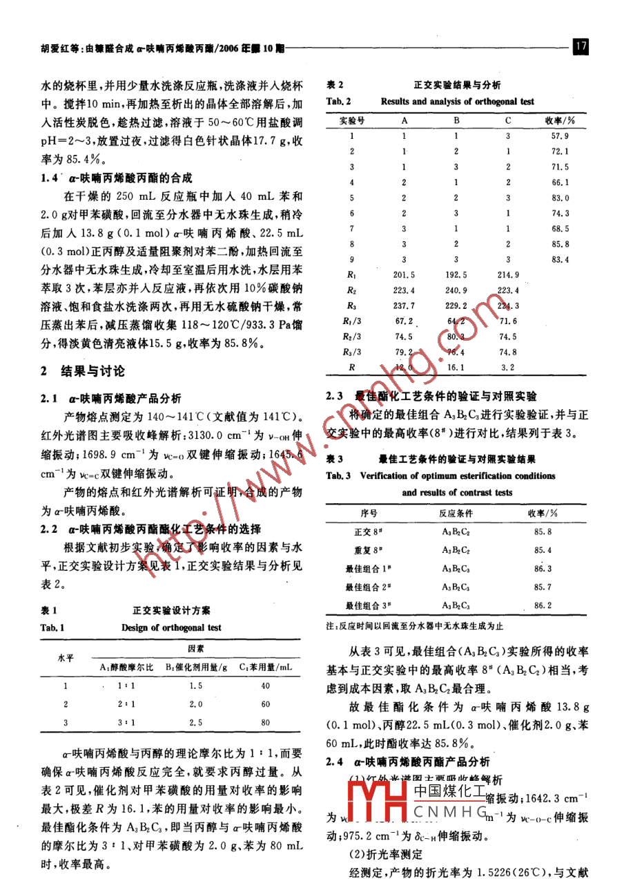 200v423№.10化學(xué)與生物工Chemistry Bioengineering由糠醛合成a-呋喃丙烯酸丙酯胡愛紅,趙穎(1.湖北工業(yè)大學(xué)化學(xué)與環(huán)境工程學(xué)院,湖北武漢430068;2.武漢天河機(jī)場自來水花木公司,湖北武漢430000要:以糠醛為主要原料采用相轉(zhuǎn)移法合威α呋喃丙烯酸,再由α呋喃丙烯酸與正丙醇酯化,制備了a呋喃丙烯酸丙酯。并通過正交實(shí)驗(yàn)確定了最佳酯化條件,酯收率可達(dá)85.8%關(guān)鍵詞:糠醛;a呋喃丙烯酸丙酯;相轉(zhuǎn)移催化;酯化中圖分類號:0626.11文獻(xiàn)標(biāo)識碼:A文章編號:1672-5425(2006我國生產(chǎn)糠醛的原料極其豐富,主要有玉米芯、棉副反應(yīng):籽殼和甘蔗等1,目前以糠醛為原料的精細(xì)化工產(chǎn)品廣泛應(yīng)用于香料、醫(yī)藥、農(nóng)藥、橡膠助劑、防腐劑、溶劑和合成樹脂等領(lǐng)域21。近年來我國糠醛產(chǎn)大于銷,糠醛的深加工越來越受到重視。COoa呋喃丙烯酸丙酯是在食品和日化產(chǎn)品中有廣泛用途的呋喃類雜環(huán)香料,其香味特征強(qiáng)、閾值低、用量(2)a呋喃丙烯酸與正丙醇的酯化反應(yīng)少,增香效果明顯、持久,可用作多種食用香料的調(diào)香主反應(yīng):原料。同時,該酯還具有很強(qiáng)的吸收紫外線的能力,可作為理想的紫外線吸收劑,在防曬、護(hù)膚類化妝品中+CHCH CH2OH得到應(yīng)用,目前該香料在國內(nèi)外香精及日化行業(yè)應(yīng)用CH=CHCOO(CH,hCH廣泛。作者選用a呋喃丙烯酸丙酯作為糠醛的深加工目標(biāo),并探討了優(yōu)化工藝條件副反應(yīng):實(shí)驗(yàn)1.1主要儀器與試劑CH=CHCOOHNAXUS型傅立葉紅外光譜儀,電熱恒溫干燥箱,CoOH」n恒溫浴槽,RY-1型熔點(diǎn)儀,阿貝折射儀??啡?工業(yè)品;聚乙二醇(1000)、苯二酚,分析純;乙酐碳酸鉀、正丙醇濃鹽酸苯對甲苯磺酸化學(xué)·[人純CHCHCOOCH2 CH CH,1.2原理(1)糠醛與乙酐反應(yīng)生成a呋喃丙烯酸,該反應(yīng)為COOCH,CH2 CH,典型的 Perkin反應(yīng)1.3a呋喃丙烯酸的合成{主反應(yīng):在裝有攪拌器溫度計(jì)和冷凝管(上接氯化鈣干燥〔又s管)的250mL干燥三口瓶內(nèi)依次加入12.5mL(0.15mol)糠醛、36.3mL(0.375mol)乙酐、20.7gCH-CHCOOH(0中國煤化工PG1008對糠醛的摩CNMHG升溫至150℃,回流UL丿后,及應(yīng)液倒入裝有500mL收稿日期:2006-05-29作者簡介:胡愛紅(1967一),女,湖北人,實(shí)驗(yàn)師,主要從事環(huán)境和化學(xué)的實(shí)驗(yàn)教學(xué)及科研工作。E-mail:ainu2004@yahoo.com.cn胡愛紅等:由幕醛合成a呋喃丙烯酸丙/2006年10水的燒杯里,并用少量水洗滌反應(yīng)瓶,洗滌液并入燒杯表2正交實(shí)驗(yàn)結(jié)果與分析中。攪拌10min,再加熱至析出的晶體全部溶解后,加Ta2 Results and analysis of orthogonal test人活性炭脫色,趁熱過濾,溶液于50~60℃用鹽酸調(diào)實(shí)驗(yàn)號C收率/%pH=2~3,放置過夜,過濾得白色針狀晶體17.7g,收57.9率為85.4%71.51.4a呋喃丙烯酸丙酯的合成31223在干燥的250mL反應(yīng)瓶中加人40mL苯和83.02.0g對甲苯磺酸,回流至分水器中無水珠生成,稍冷4567后加人13.8g(0.1mol)a呋喃丙烯酸、2.5mL(0.3mol)正丙醇及適量阻聚劑對苯二酚,加熱回流至222333112385.883.4分水器中無水珠生成冷卻至室溫后用水洗,水層用苯9RRR192.5214.9萃取3次,苯層亦并入反應(yīng)液,再依次用10%碳酸鈉240.9223.4溶液、飽和食鹽水洗滌兩次,再用無水硫酸鈉干燥,常237.7224.3壓蒸出苯后,減壓蒸餾收集118~120℃/933.3Pa餾R1/367.2分,得淡黃色清亮液體15.5g收率為85.8%R2/374.52結(jié)果與討論2.1a呋喃丙烯酸產(chǎn)品分析2.3最佳酯化工藝條件的驗(yàn)證與對照實(shí)驗(yàn)物熔點(diǎn)測定為140~141C(文獻(xiàn)值為141℃)。將確定的最佳組合A3B2C3進(jìn)行實(shí)驗(yàn)驗(yàn)證,并與正紅外光譜圖主要吸收峰解析:3130.0cm-為v-o伸交實(shí)驗(yàn)中的最高收率(84)進(jìn)行對比結(jié)果列于表3縮振動;16989cm-為-雙鍵伸縮振動;1645.6裹最佳工藝條件的驗(yàn)證與對照實(shí)驗(yàn)結(jié)果cm-1為w=c雙鍵伸縮振動。Tab 3 Verification of optimum esterification conditions產(chǎn)物的熔點(diǎn)和紅外光譜解析可證明,合成的產(chǎn)物and results of contrast tests為a呋喃丙烯酸。序號反應(yīng)條件收率/%2.2a-呋喃丙烯酸丙酯酯化工藝條件的選擇正交8甲A3 B, Cu根據(jù)文獻(xiàn)初步實(shí)驗(yàn),確定了影響收率的因素與水重復(fù)8A3 B2 C平,正交實(shí)驗(yàn)設(shè)計(jì)方案見表1,正交實(shí)驗(yàn)結(jié)果與分析見最A(yù)3 BC3表2。最佳組合2A3 BaC正交實(shí)驗(yàn)設(shè)計(jì)方案最佳組合3AsBC86.2Tab. 1Design of orthogonal test注:反應(yīng)時間以回流至分水器中無水珠生成為止水平從表3可見,最佳組合(A3B2C3)實(shí)驗(yàn)所得的收率A:醉酸摩爾比B:催化劑用量/gC:苯用量/mL基本與正交實(shí)驗(yàn)中的最高收率8“(A3B2C2)相當(dāng),考慮到成本因素,取A3B2C2最合理故最佳酯化條件為a呋喃丙烯酸13.8g3:1(0.1mol)丙醇22.5mL(0.3mol)、催化劑2.0g、苯60mL,此時酯收率達(dá)85.8%a呋喃丙烯酸與丙醇的理論摩爾比為1:1,而要確保α呋喃丙烯酸反應(yīng)完全就要求丙醇過量。從2.4a呋喃丙烯酸丙酯產(chǎn)品分析謹(jǐn)圓主曲峰解析表2可見,催化劑對甲苯磺酸的用量對收率的影響中國煤化工縮振動;1642.3cm-1最大,極差R為16.1,苯的用量對收率的影響最小。最佳酯化條件為ABC,即當(dāng)丙醇與a呋喃丙烯酸為wCNMH為w-0c伸縮振的摩爾比為3:1、對甲苯磺酸為2.0g、苯為80mL動;975
