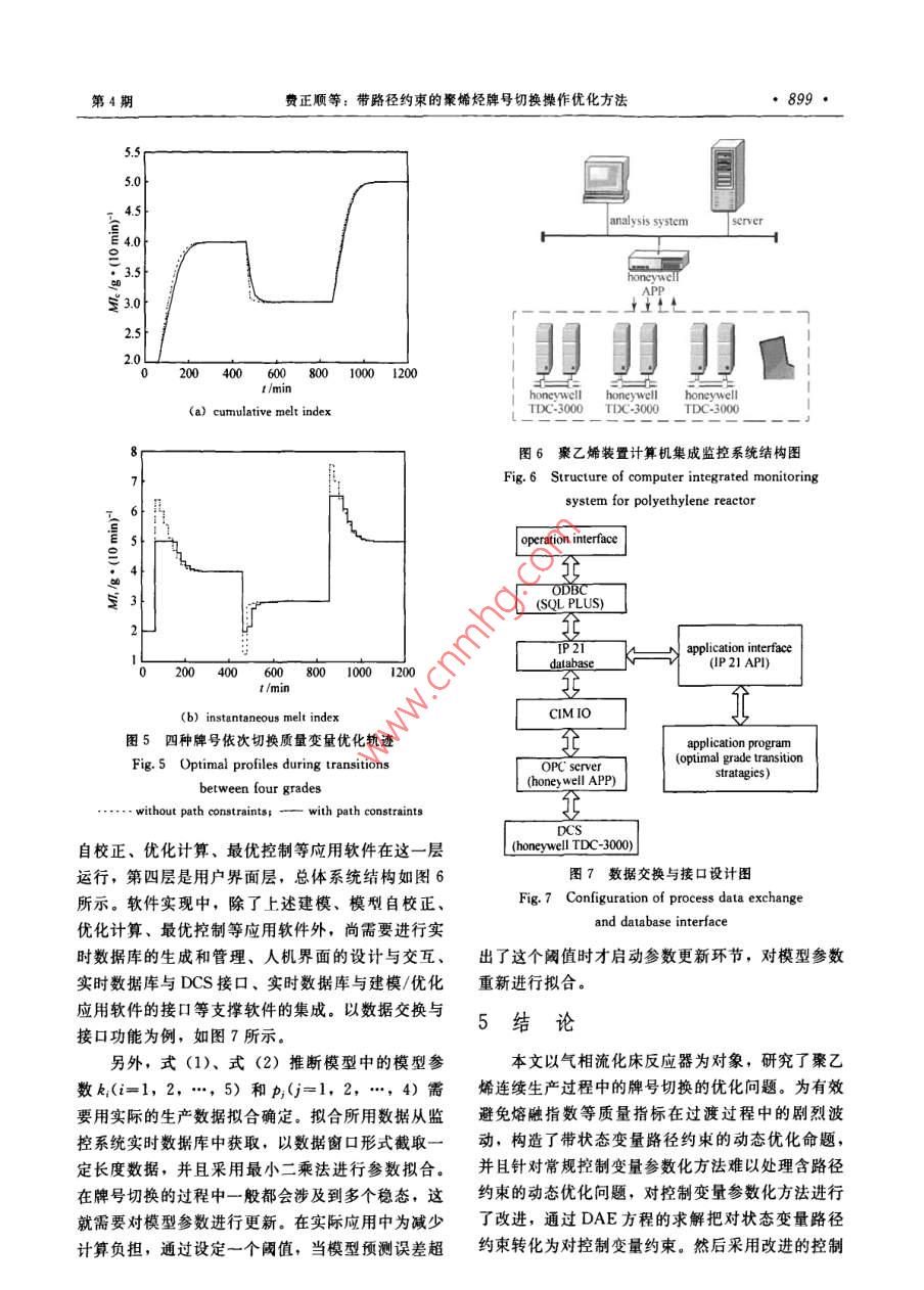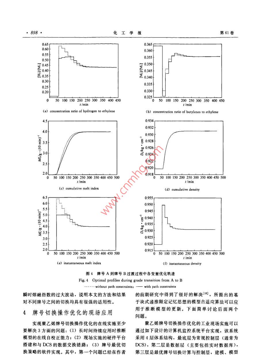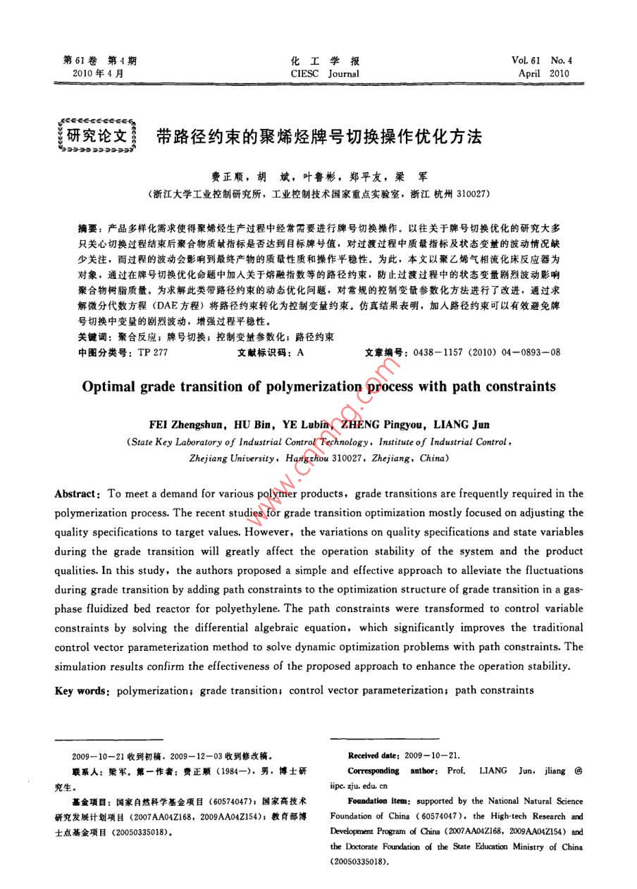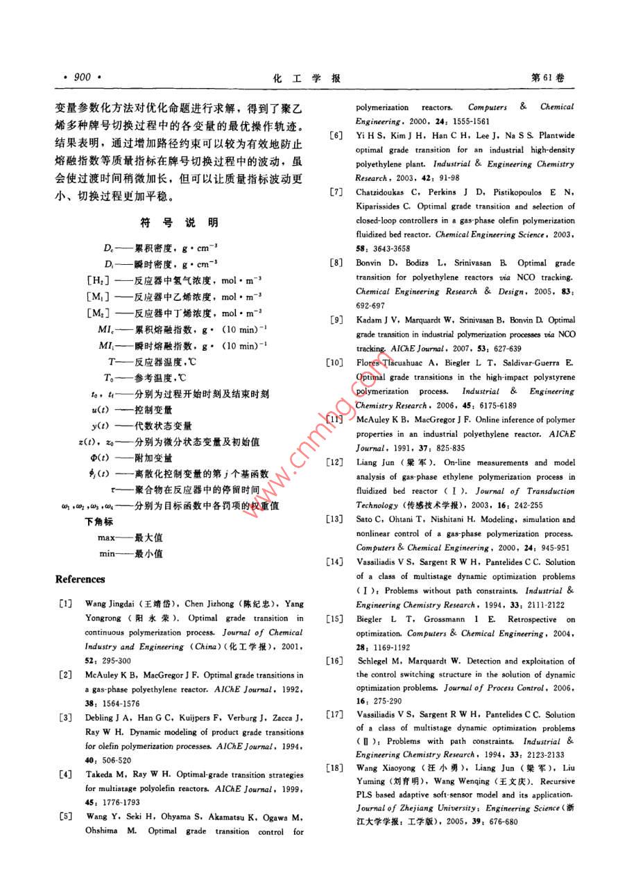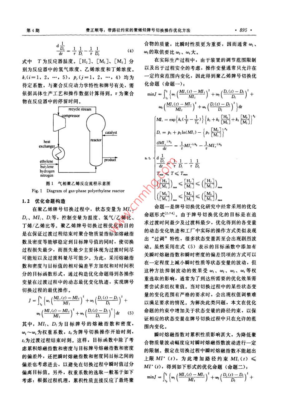 第61卷第4期化工學(xué)報(bào)VoL.61 No.42010年4月CIESC JournalApril 2010研究論文貧帶路徑約束的聚烯烴牌號(hào)切換操作優(yōu)化方法9333999939費(fèi)正順,胡斌,葉魯彬,鄭平友,梁軍(浙江大學(xué)工業(yè)控制研究所,工業(yè)控制技術(shù)國(guó)家重點(diǎn)實(shí)驗(yàn)室,浙江杭州310027)摘要:產(chǎn)品多樣化需求使得聚烯烴生產(chǎn)過(guò)程中經(jīng)常需要進(jìn)行牌號(hào)切換操作。以往關(guān)于牌號(hào)切換優(yōu)化的研究大多只關(guān)心切換過(guò)程結(jié)束后聚合物質(zhì)址指標(biāo)是否達(dá)到目標(biāo)牌號(hào)值,對(duì)過(guò)渡過(guò)程中質(zhì)最指標(biāo)及狀態(tài)變量的波動(dòng)情況缺少關(guān)注,而過(guò)程的波動(dòng)會(huì)影響到最終產(chǎn)物的質(zhì)最性質(zhì)和操作平穩(wěn)性。為此,本文以聚乙烯氣相流化床反應(yīng)器為對(duì)象,通過(guò)在牌號(hào)切換優(yōu)化命題中加入關(guān)于熔融指數(shù)等的路徑約束,防止過(guò)渡過(guò)程中的狀態(tài)變量劇烈波動(dòng)影響聚合物樹脂質(zhì)量。為求解此類帶路徑約束的動(dòng)態(tài)優(yōu)化問(wèn)題,對(duì)常規(guī)的控制變最參數(shù)化方法進(jìn)行了改進(jìn),通過(guò)求解微分代數(shù)方程(DAE 方程)將路徑約束轉(zhuǎn)化為控制變量約束。仿真結(jié)果表明,加人路徑約束可以有效避免牌號(hào)切換中變量的劇烈波動(dòng),增強(qiáng)過(guò)程平穩(wěn)性。關(guān)鍵詞:聚合反應(yīng);牌號(hào)切換:控制變量參數(shù)化;路徑約束中團(tuán)分類號(hào): TP 277文獻(xiàn)標(biāo)識(shí)碼: A文章編號(hào): 0438-1157 (2010) 04-0893-08Optimal grade transition of polymerization process with path constraintsFEI Zhengshun, HU Bin, YE Lubin, ZHENG Pingyou, LIANG Jun(State Key Laboralory of Industrial Control Technology. Institute of Industrial Control ,Zhejiang University, Hangzhou 310027,Zhejiang, China)Abstract: To meet a demand for various polymer products, grade transitions are frequently required in thepolymerization process. The recent studies for grade transition optimization mostly focused on adjusting thequality specifications to target values. However, the variations on quality specifications and state variablesduring the grade transition will greatly affect the operation stability of the system and the productqualities. In this study, the authors proposed a simple and effective approach to alleviate the fluctuationsduring grade transition by adding path constraints to the optimization structure of grade transition in a gas-phase fluidized bed reactor for polyethylene. The path constraints were transformed to control variableconstraints by solving the differential algebraic equation, which significantly improves the traditionalcontrol vector parameterization method to solve dynamic optimization problems with path constraints. Thesimulation results confirm the effectiveness of the proposed approach to enhance the operation stbility.Key words: polymerization; grade transition; control vector parameterization; path constraints2009-10-21收到初稿,2009- 12-03收到修改稿。Received date; 2009-10-21.聯(lián)系人:架軍。第一作者:費(fèi)正順(1984-),男,博士研Corresponding antbor: Prof, LIANG Jun, jliang @究生。ipe. zju edu. cn基金項(xiàng)目:國(guó)家自然科學(xué)基金項(xiàng)目(60574047); 國(guó)家高技術(shù)Foundation item: supported by the National Natural Science研究發(fā)展計(jì)劃項(xiàng)目(2007AA04Z168, 2009AA04Z154); 教有部博Foundation of Ching ( 60574047),the High-tech Research and士點(diǎn)基金項(xiàng)目(20050335018)。Development Program of Caina (2007AA04Z168, 2009AA04Z154) andthe Doctorate Foundation of the State Education Ministry of China(20050335018).●894●化工學(xué)報(bào)第61卷操作點(diǎn)之間的最優(yōu)時(shí)變操作軌跡。引| 言上述關(guān)于牌號(hào)切換問(wèn)題的研究大多僅限于關(guān)心聚烯烴樹脂通常在聚合反應(yīng)器中進(jìn)行生產(chǎn),不過(guò)渡過(guò)程結(jié)束后質(zhì)量指標(biāo)能否達(dá)到目標(biāo)值,而對(duì)整同性狀和用途的樹脂產(chǎn)品以不同的牌號(hào)進(jìn)行區(qū)分。個(gè)切換過(guò)程中質(zhì)量指標(biāo)的波動(dòng)情況以及由此引起的在連續(xù)生產(chǎn)過(guò)程中,不同牌號(hào)的聚烯烴樹脂的生產(chǎn)操作難度缺少關(guān)注。一般地,聚合反應(yīng)器中反應(yīng)生一般通過(guò)改變反應(yīng)器的操作條件實(shí)現(xiàn),以達(dá)到在同成的聚烯烴樹脂性能主要由累積熔融指數(shù)等累積性一裝置中生產(chǎn)不同牌號(hào)的聚烯烴樹脂的目的。然質(zhì)決定,但瞬時(shí)熔融指數(shù)等瞬時(shí)性質(zhì)的過(guò)大波動(dòng)會(huì)而,從一種牌號(hào)的生產(chǎn)到另-種牌號(hào)的生產(chǎn)中間往產(chǎn)生大量不符合目標(biāo)要求的樹脂”。為了避免過(guò)渡往經(jīng)歷一個(gè)產(chǎn)生大量不合格產(chǎn)品過(guò)渡料的過(guò)程(稱過(guò)程中瞬時(shí)熔融指數(shù)的劇烈波動(dòng),本文在聚合反應(yīng)為牌號(hào)切換過(guò)渡過(guò)程),因此在聚合反應(yīng)的牌號(hào)切.牌號(hào)切換優(yōu)化命題中加入對(duì)瞬時(shí)熔融指數(shù)等狀態(tài)變換過(guò)程中盡可能減少過(guò)渡時(shí)間和過(guò)渡料數(shù)量顯得相量的路徑約束,以保證聚合物質(zhì)量指標(biāo)在整個(gè)過(guò)渡當(dāng)重要。過(guò)程中只在規(guī)定的范圍內(nèi)變化,從而不僅使切換結(jié)聚烯
