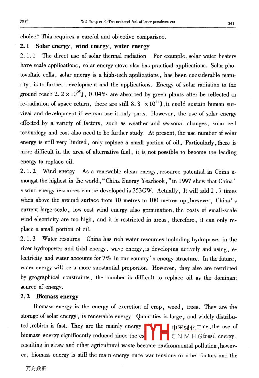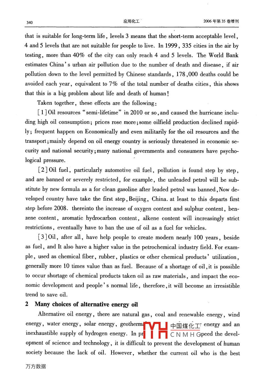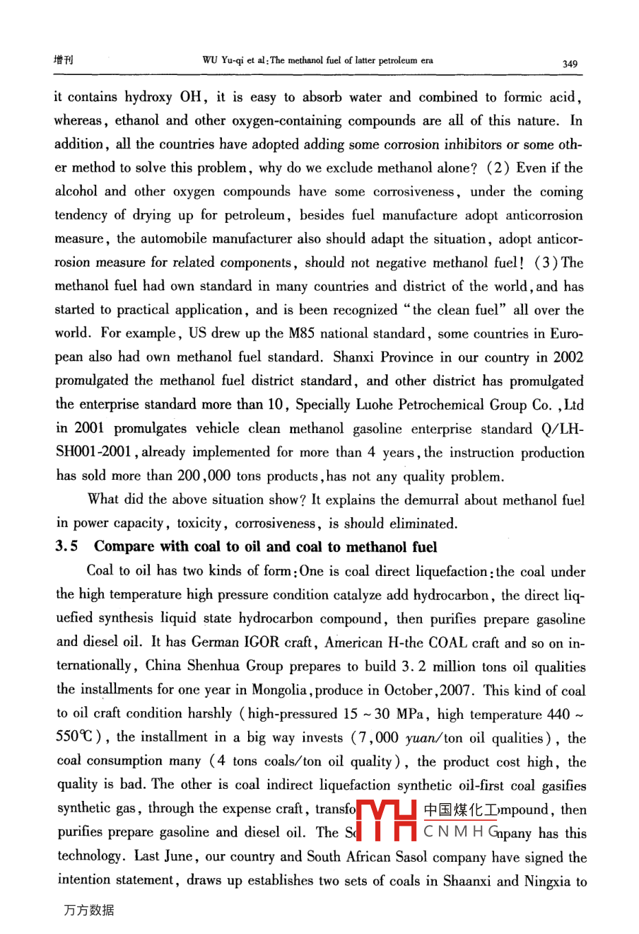 第35卷增刊應(yīng)Vol 352006年10月Applied Chemical IndustryOct.2006后石油時代的甲醇燃料吳城琦,馮向法(中國漯河石化集團控股有限公司,河南漯河462000)摘要:在后石油時代即將來臨和環(huán)境問題日益嚴重的今天,世界科技和能源、環(huán)保各界,乃至聯(lián)合國和各國政府,都在高度關(guān)注替代石油的清潔能源問題,各種替代能源也在競相爭奪取代權(quán)。針對這種情況,通過實事求是地分析,用科學(xué)數(shù)據(jù)說話,毫無隱晦地亮明這個“后石油時代初期惟有甲醇燃料甲天下”的觀點,以解能源、環(huán)保等有關(guān)部門以及廣大消費者關(guān)于代油清潔燃料的憂慮關(guān)鍵詞:石油;甲醇;燃料;替代能源;醇醚燃料中圖分類號:TK01文獻標(biāo)識碼:A在后石油時代即將來臨和環(huán)境問題日益嚴重的今天,世界科技和能源、環(huán)保各界,乃至聯(lián)合國和各國政府,都在高度關(guān)注替代石油的清潔能源問題,各種替代能源也在競相爭奪取代權(quán)。除了科技界比較客觀外,各種替代能源的代言人就是這些能源的擁有者和維護者,競爭非常激烈。其中最有希望的也是遭受攻擊最甚者,例如甲醇燃料,什么動力性問題、毒性問題、腐蝕性問題等,好象這種早已廣泛用作基本化工原料的物質(zhì),用途拓展到燃料領(lǐng)域時,一下子就變成了不能使用的東西了!究競是怎樣的呢?科技界為甲醇作了一些辯護,所有介紹甲醇的書籍和文章都說甲醇除了是最基本的化工原料外,還是典型的清潔燃料。但是,好象也有點躲躲閃閃。例如,大都明說煤、天然氣或其它碳氫化合物都可以制取醇醚清潔燃料,然后繞一個彎,再注明醇醚清潔燃料主要指甲醇和二甲瞇。這種注釋雖然不夠確切,但是畢竟把甲醇作為主角提了出來。其實,醇醚燃料包括甲醇和甲醇的衍生物醚類、酯類等,兩種說法是一回事。好在中國環(huán)境與發(fā)展國際合作委員會的一份報告以及國內(nèi)外一些權(quán)威文章中已經(jīng)明確提出:“若干年后,甲醇燃料將占壓倒其它燃料的主導(dǎo)地位,直到新的更好的燃料真正開發(fā)出來和投入實際應(yīng)用”。那么,為什么要等到若干年后呢?為什么不從現(xiàn)在起就按照市場規(guī)律盡可能取代一些石油而省下石油做更重要的事情呢?主要原因是有關(guān)管理部門的某些人土還不太認識這個問題,現(xiàn)有的一些石油企業(yè)和競爭替代石油燃料的企業(yè),為了自己的眼前利益還在反對。究竟誰是后石油時代的主導(dǎo)性替代燃料呢?說實話,目前還沒有統(tǒng)一認識,我國的各種文件和有關(guān)行政部門的言論表明,他們還在十字路口猶豫,有病亂投醫(yī)的現(xiàn)象顯而易見,更沒有認定甲醇燃料的恥中國煤化工針對這種情況,本文通過實事求是地分機HCNMH毫無隱晦地亮明這個“后石油時代初期惟有甲醇燃料甲天下”的觀點,以解能源、環(huán)保等有關(guān)部門以及廣大消費者關(guān)于代油清潔燃料的憂慮。同時也誠心地勸說一些還不太增刊吳域琦等:后石油時代的甲醇燃料323認識這個問題的人,早日認識這個問題。更主要地是堅定甲醇燃料開發(fā)者的信心,使之發(fā)揮我國自己的優(yōu)勢,早日從這個領(lǐng)域“牟利”,并對人類社會可持續(xù)發(fā)展和避免爭奪石油的戰(zhàn)爭做出貢獻。1能源與環(huán)境問題世界能源的大規(guī)模消耗是從化石能源,特別是石油的大規(guī)模開采應(yīng)用開始的。它僅僅用了一百多年的時間,就使得億萬年的石油積累貯藏即將消耗殆盡。這種不可再生的石油消耗殆盡前后,世界就進入了后石油時代。那時,必須有替代或取代石油的新能源。這個觀點是公認的。由于化石能源的大規(guī)模耗用,帶來了嚴重的環(huán)境問題,威脅著人類的生存和發(fā)展,這個觀點也是公認的。但是,當(dāng)今人們對這兩個公認觀點的認識,在緊迫性和對策上卻有較大差異。一些人輕視這兩個問題的嚴重性,用化石能源的地質(zhì)貯量或者尚能得過且過來安慰自己,用逃離環(huán)境污染重災(zāi)區(qū)來應(yīng)付環(huán)境污染。豈知,化石能源的已探明貯量只是地質(zhì)貯量的一小部分,可采貯量又是已探明貯量的一小部分。特別是石油的已探明可采貯量,不管是樂觀數(shù)據(jù)還是悲觀數(shù)據(jù),都已經(jīng)見底,象現(xiàn)在這樣大規(guī)模開采和消耗下去,很快就要枯竭。又豈知,化石能源造成的環(huán)境污染,已經(jīng)嚴重威脅人類和地球生物的生存。如果個別企業(yè)不顧這些,當(dāng)各國政府執(zhí)行聯(lián)合國的《里約宣言》、《21世紀議程》、《蒙特利爾議定書》和《京都議定書》等文件時,這些企業(yè)將在劫難逃。因為如果不這樣,任憑保護地球的臭氧層破壞、酸雨頻降、疑難病叢生,人類和地球生物都難以生存。在這方面已有先例。在以前的很長時間內(nèi),汽車制造商是反對汽油中加入含氧化合物的,因為他們主要考慮的是腐蝕性問題。但是,1990年美國國會通過了“清潔空氣法修正案”強制推行“新配方清潔汽油”后,全世界紛紛響應(yīng),含氧化合物成了“新配方清潔汽油”必須添加的成分。1.1關(guān)于能源問題全世界的石油資源究競還能維持多少時間呢?全球石油的總貯量,樂觀地估算為6500億t,悲觀地估算為2700億t,實際上已探明的可采貯量比這少得多。在21世紀開始的時候,全