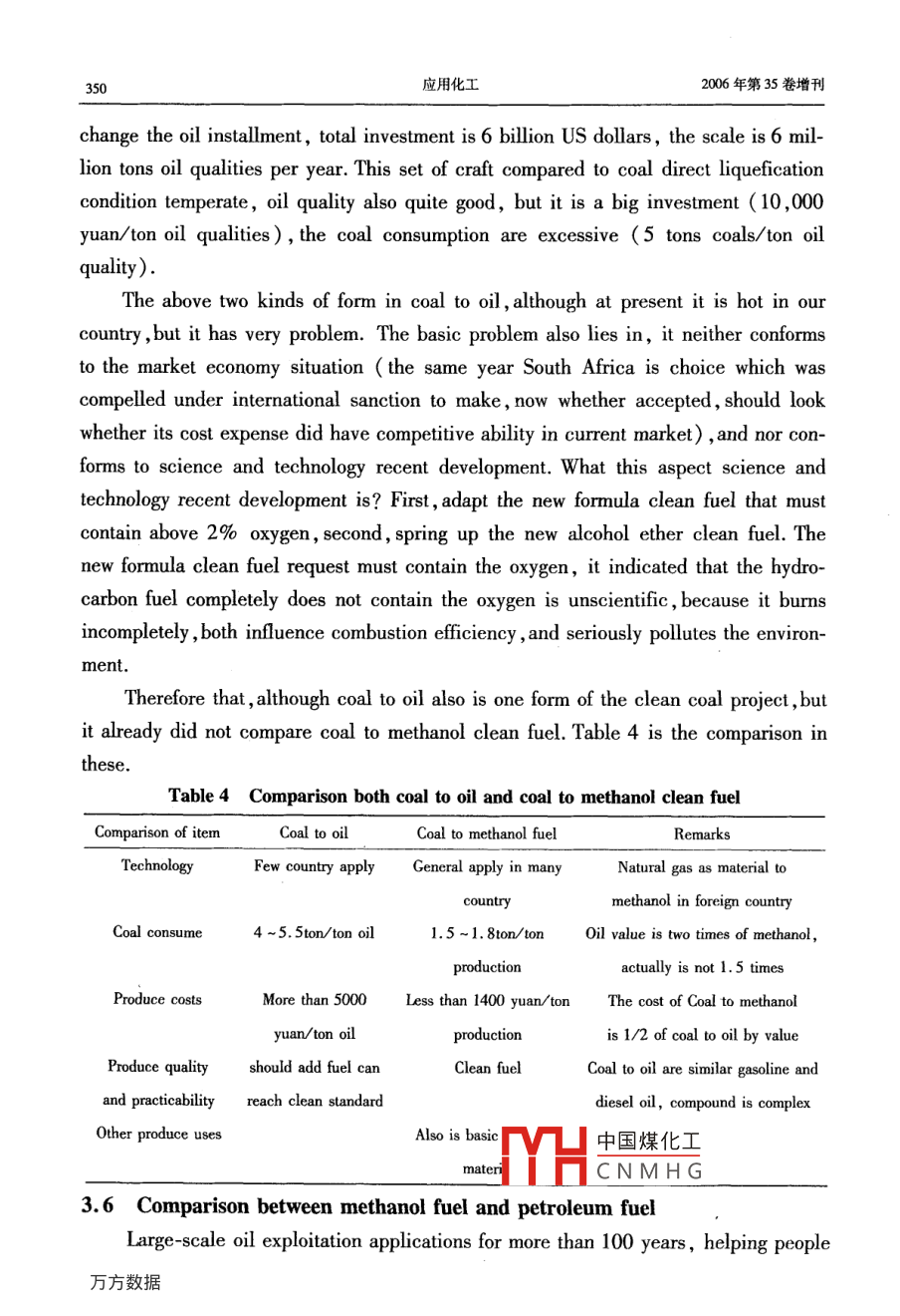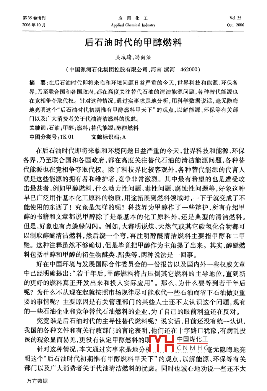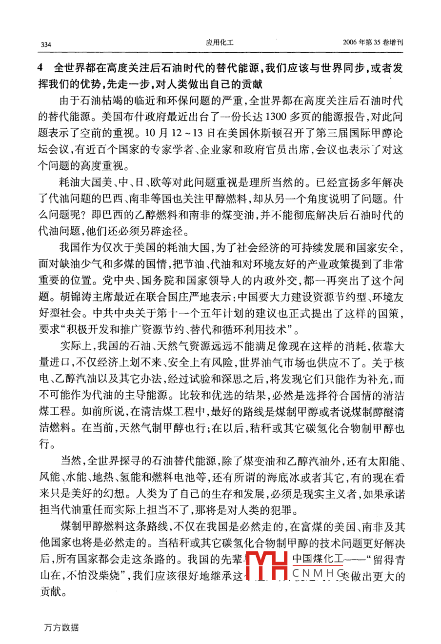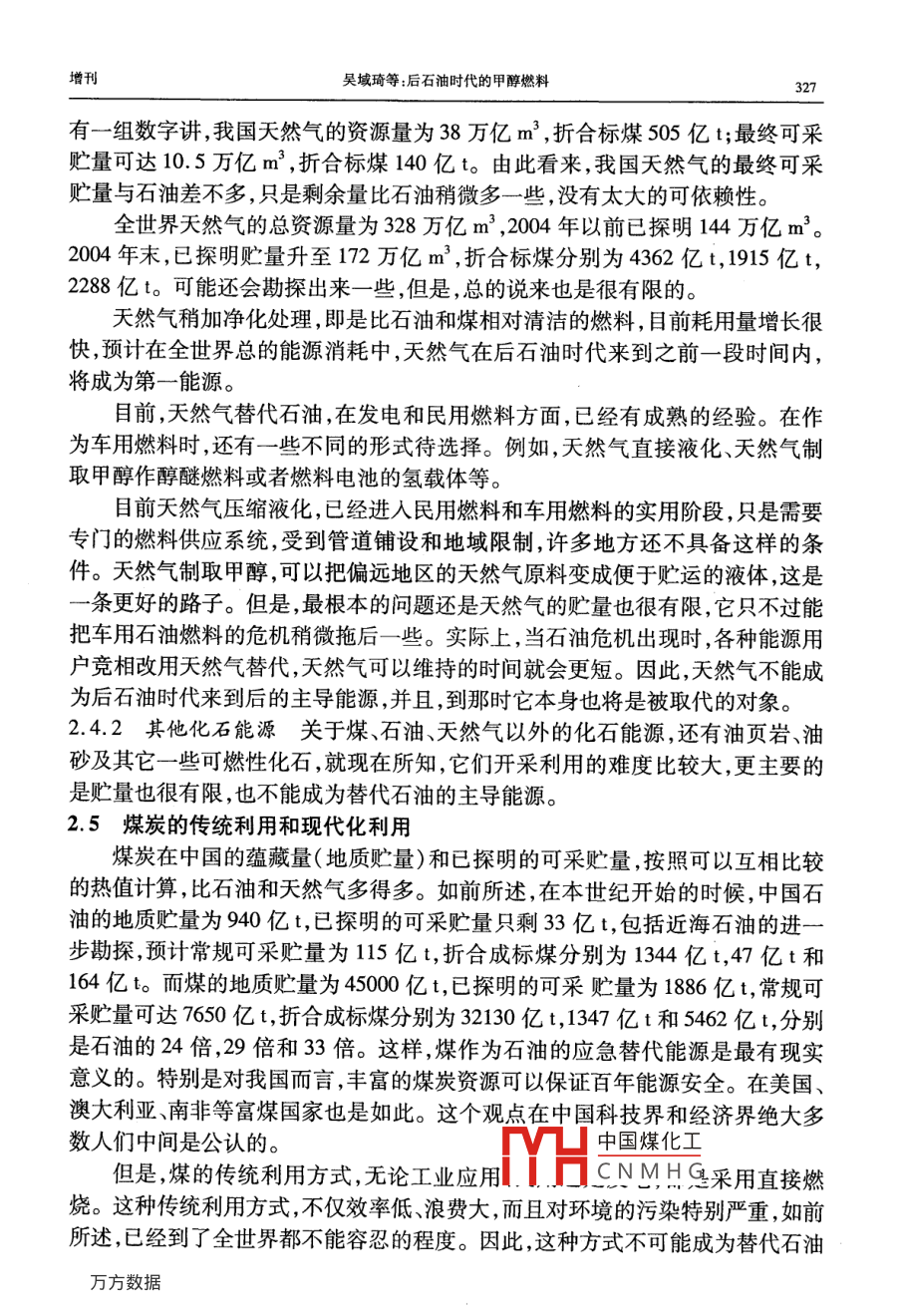 第35卷增刊應(yīng)Vol 352006年10月Applied Chemical IndustryOct.2006后石油時代的甲醇燃料吳城琦,馮向法(中國漯河石化集團控股有限公司,河南漯河462000)摘要:在后石油時代即將來臨和環(huán)境問題日益嚴重的今天,世界科技和能源、環(huán)保各界,乃至聯(lián)合國和各國政府,都在高度關(guān)注替代石油的清潔能源問題,各種替代能源也在競相爭奪取代權(quán)。針對這種情況,通過實事求是地分析,用科學(xué)數(shù)據(jù)說話,毫無隱晦地亮明這個“后石油時代初期惟有甲醇燃料甲天下”的觀點,以解能源、環(huán)保等有關(guān)部門以及廣大消費者關(guān)于代油清潔燃料的憂慮關(guān)鍵詞:石油;甲醇;燃料;替代能源;醇醚燃料中圖分類號:TK01文獻標(biāo)識碼:A在后石油時代即將來臨和環(huán)境問題日益嚴重的今天,世界科技和能源、環(huán)保各界,乃至聯(lián)合國和各國政府,都在高度關(guān)注替代石油的清潔能源問題,各種替代能源也在競相爭奪取代權(quán)。除了科技界比較客觀外,各種替代能源的代言人就是這些能源的擁有者和維護者,競爭非常激烈。其中最有希望的也是遭受攻擊最甚者,例如甲醇燃料,什么動力性問題、毒性問題、腐蝕性問題等,好象這種早已廣泛用作基本化工原料的物質(zhì),用途拓展到燃料領(lǐng)域時,一下子就變成了不能使用的東西了!究競是怎樣的呢?科技界為甲醇作了一些辯護,所有介紹甲醇的書籍和文章都說甲醇除了是最基本的化工原料外,還是典型的清潔燃料。但是,好象也有點躲躲閃閃。例如,大都明說煤、天然氣或其它碳氫化合物都可以制取醇醚清潔燃料,然后繞一個彎,再注明醇醚清潔燃料主要指甲醇和二甲瞇。這種注釋雖然不夠確切,但是畢竟把甲醇作為主角提了出來。其實,醇醚燃料包括甲醇和甲醇的衍生物醚類、酯類等,兩種說法是一回事。好在中國環(huán)境與發(fā)展國際合作委員會的一份報告以及國內(nèi)外一些權(quán)威文章中已經(jīng)明確提出:“若干年后,甲醇燃料將占壓倒其它燃料的主導(dǎo)地位,直到新的更好的燃料真正開發(fā)出來和投入實際應(yīng)用”。那么,為什么要等到若干年后呢?為什么不從現(xiàn)在起就按照市場規(guī)律盡可能取代一些石油而省下石油做更重要的事情呢?主要原因是有關(guān)管理部門的某些人土還不太認識這個問題,現(xiàn)有的一些石油企業(yè)和競爭替代石油燃料的企業(yè),為了自己的眼前利益還在反對。究竟誰是后石油時代的主導(dǎo)性替代燃料呢?說實話,目前還沒有統(tǒng)一認識,我國的各種文件和有關(guān)行政部門的言論表明,他們還在十字路口猶豫,有病亂投醫(yī)的現(xiàn)象顯而易見,更沒有認定甲醇燃料的恥中國煤化工針對這種情況,本文通過實事求是地分機HCNMH毫無隱晦地亮明這個“后石油時代初期惟有甲醇燃料甲天下”的觀點,以解能源、環(huán)保等有關(guān)部門以及廣大消費者關(guān)于代油清潔燃料的憂慮。同時也誠心地勸說一些還不太增刊吳域琦等:后石油時代的甲醇燃料323認識這個問題的人,早日認識這個問題。更主要地是堅定甲醇燃料開發(fā)者的信心,使之發(fā)揮我國自己的優(yōu)勢,早日從這個領(lǐng)域“牟利”,并對人類社會可持續(xù)發(fā)展和避免爭奪石油的戰(zhàn)爭做出貢獻。1能源與環(huán)境問題世界能源的大規(guī)模消耗是從化石能源,特別是石油的大規(guī)模開采應(yīng)用開始的。它僅僅用了一百多年的時間,就使得億萬年的石油積累貯藏即將消耗殆盡。這種不可再生的石油消耗殆盡前后,世界就進入了后石油時代。那時,必須有替代或取代石油的新能源。這個觀點是公認的。由于化石能源的大規(guī)模耗用,帶來了嚴重的環(huán)境問題,威脅著人類的生存和發(fā)展,這個觀點也是公認的。但是,當(dāng)今人們對這兩個公認觀點的認識,在緊迫性和對策上卻有較大差異。一些人輕視這兩個問題的嚴重性,用化石能源的地質(zhì)貯量或者尚能得過且過來安慰自己,用逃離環(huán)境污染重災(zāi)區(qū)來應(yīng)付環(huán)境污染。豈知,化石能源的已探明貯量只是地質(zhì)貯量的一小部分,可采貯量又是已探明貯量的一小部分。特別是石油的已探明可采貯量,不管是樂觀數(shù)據(jù)還是悲觀數(shù)據(jù),都已經(jīng)見底,象現(xiàn)在這樣大規(guī)模開采和消耗下去,很快就要枯竭。又豈知,化石能源造成的環(huán)境污染,已經(jīng)嚴重威脅人類和地球生物的生存。如果個別企業(yè)不顧這些,當(dāng)各國政府執(zhí)行聯(lián)合國的《里約宣言》、《21世紀議程》、《蒙特利爾議定書》和《京都議定書》等文件時,這些企業(yè)將在劫難逃。因為如果不這樣,任憑保護地球的臭氧層破壞、酸雨頻降、疑難病叢生,人類和地球生物都難以生存。在這方面已有先例。在以前的很長時間內(nèi),汽車制造商是反對汽油中加入含氧化合物的,因為他們主要考慮的是腐蝕性問題。但是,1990年美國國會通過了“清潔空氣法修正案”強制推行“新配方清潔汽油”后,全世界紛紛響應(yīng),含氧化合物成了“新配方清潔汽油”必須添加的成分。1.1關(guān)于能源問題全世界的石油資源究競還能維持多少時間呢?全球石油的總貯量,樂觀地估算為6500億t,悲觀地估算為2700億t,實際上已探明的可采貯量比這少得多。在21世紀開始的時候,全