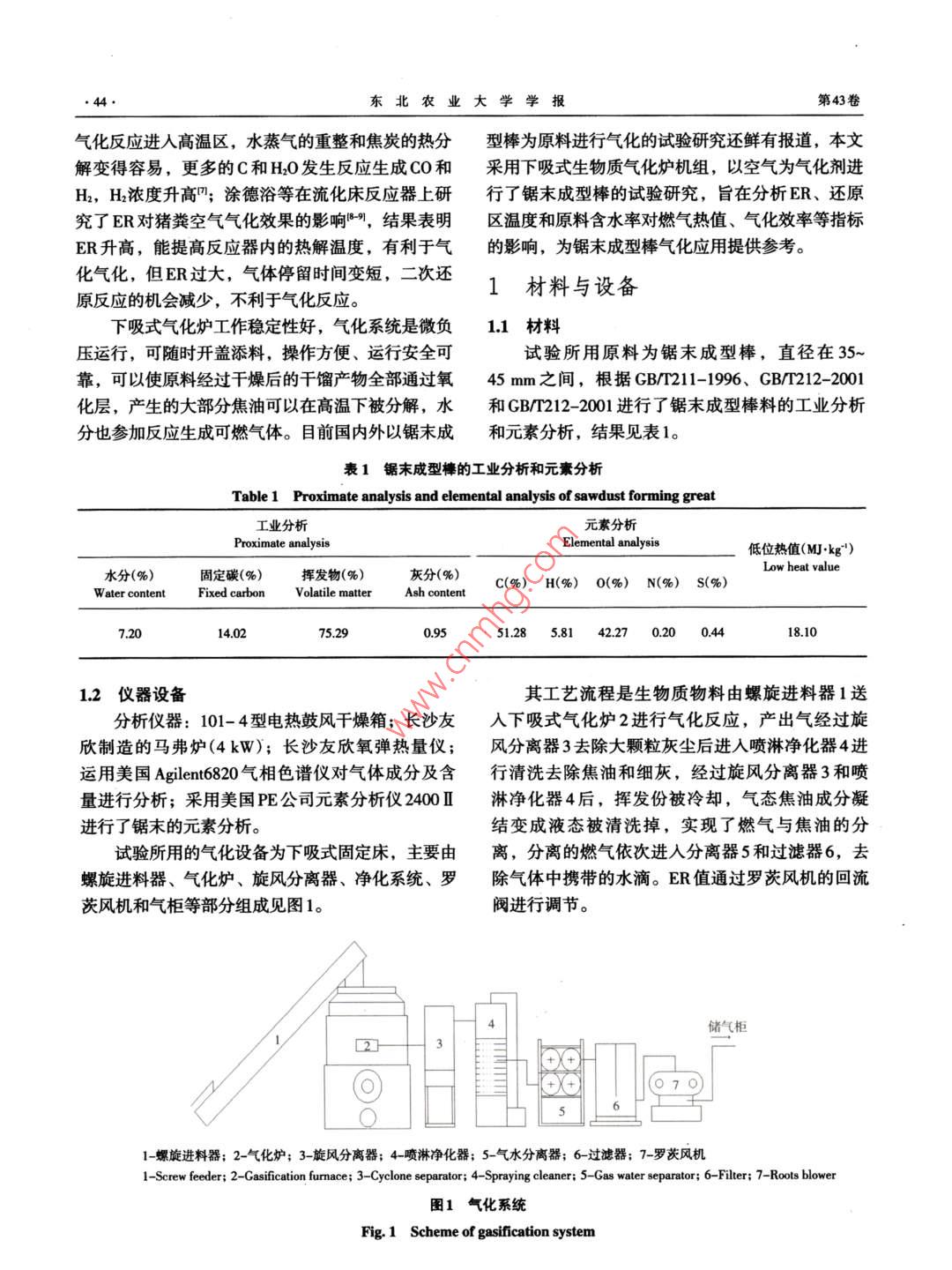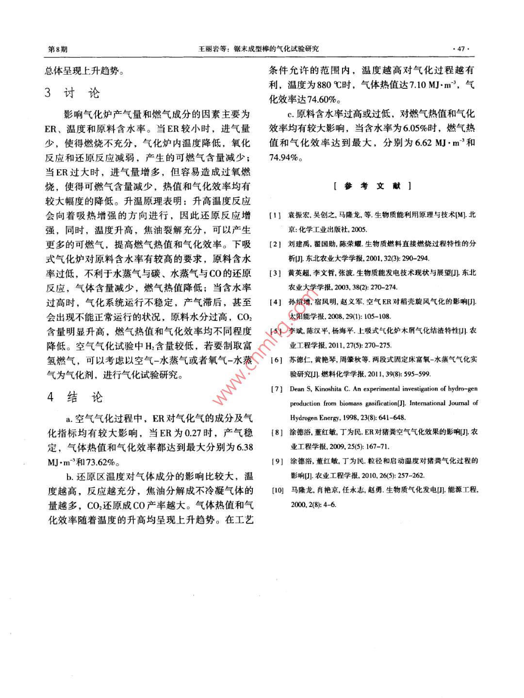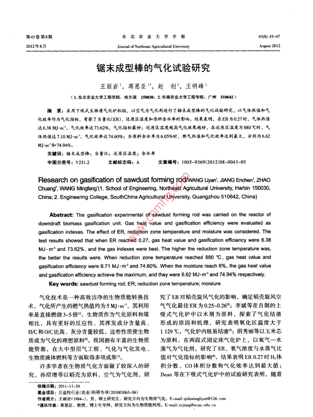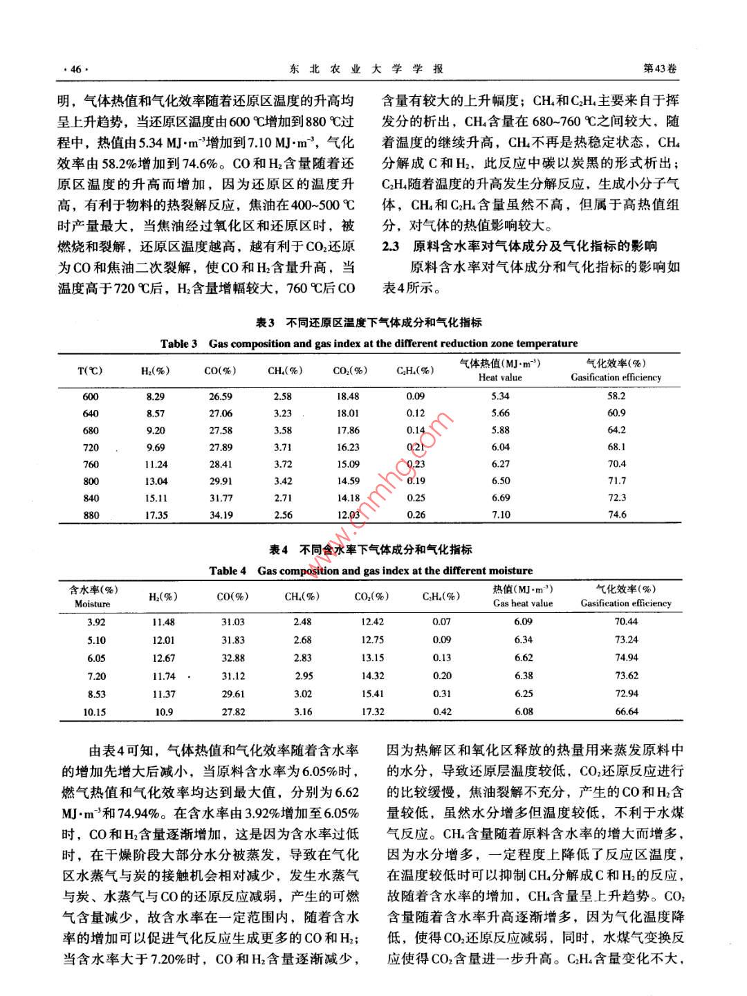 第43卷第8期東北農(nóng)業(yè)大學學報43(8):43-472012年8月Joumal of Northeast Agricultural UniversityAugust 2012鋸末成型棒的氣化試驗研究王麗巖',蔣恩臣",趙創(chuàng)”,王明峰'(1.東北農(nóng)業(yè)大學工程學院,哈爾濱150030; 2. 華南農(nóng)業(yè)大學工程學院,廣州510642 )摘要:采用下吸式生物質(zhì)氣化爐機組,以空氣為氣化劑進行了鋸末成型棒的氣化試驗研究。以氣體熱值和氣化效率作為氣化指標,考察了當量比(ER)、還原區(qū)溫度和原料含水率的影響。結(jié)果表明,在ER為0.27時,氣體熱值達6.38 MJ-m*',氣化效率達73.62%, 氣化指標最好;還原區(qū)溫度越高氣化效果越好,在還原區(qū)溫度為880C時,氣體熱值達7.10 MJ.m",氣化效率達74.60%;當原料含水率為6.05%時,燃氣熱值和氣化效率達到最大,分別為6.62MJ.m’和74.94%。關鍵詞:鋸末成型棒;當量比;還原區(qū)溫度;含水率中圖分類號: V231.2文獻標志碼: A文章編號: 1005-9369(2012)08-0043-05Research on gasification of sawdust forming rod/WANG Liyan', JIANG Enchen', ZHAOChuang', WANG Mingfeng'(1. School of Engineering, Northeast Agricultural University, Harbin 150030,China; 2. Engineering College, SouthChina Agricultural University, Guangzhou 510642, China)Abstract: The gasification experimental of sawdust forming rod was carried on the reactor ofdowndraft biomass gasification unit. Gas heat value and gasification efficiency were evaluated asgasification indexes. The effect of ER, reduction zone temperature and moisture was considered. Thetest results showed that when ER reached 0.27, gas heat value and gasification eficiency were 6.38MJ. m3 and 73.62%, and the gas indexes were best. The higher the reduction zone temperature was,the better the results were. When reduction zone temperature reached 880 C, gas heat value andgasification eficiency were 6.71 MJ.m° and 74.60%. When the moisture reach 6%, the gas heat valueand gasification fficiency achieve the maximum, and they were 6.62 MJ.ms and 74.94% respectively.Key words: sawdust forming rod; ER; reduction zone temperature; moisture氣化技術是-種高效潔凈的生物質(zhì)能轉(zhuǎn)換技究了ER對稻殼旋風氣化的影響,確定稻殼旋風空術,氣化所產(chǎn)生的燃氣熱值約為5 MJ.m*,其利用氣氣化最佳ER為0.25~0.26*;李斌等在自制的上率是直接燃燒3~5倍"。生物質(zhì)作為氣化原料和煤吸式氣化爐中以木屑為原料,探索了氣化結(jié)渣相比,具有更好的反應性、其揮發(fā)成分含量高、形成的原因和機理,研究表明氧化區(qū)溫度大于H/C和0/C比高、灰分含量較低,這些性質(zhì)使生物1 129 C,氣化爐內(nèi)極易結(jié)渣";陰秀麗等以玉米芯質(zhì)成為氣化的理想原料”。我國擁有豐富的生物質(zhì)為原料, 在兩段式固定床氣化爐上,以氧氣- -水能資源,在大中型沼氣工程、氣化與氣化發(fā)電、蒸氣為氣化劑, 研究了ER、氧氣濃度與水蒸氣比生物質(zhì)液體燃料等方面取得多項成果"。值對氣化指標的影響響,結(jié)果表明ER 0.27時H2體許多學者在生物質(zhì)氣化方面做了較深人的研積分數(shù)、CO體積分數(shù)和氣化效率達到最大值;究,孫紹增等以稻殼為原料,空氣為氣化劑,研Dean 等在下吸式氣化爐中的試驗研究表明,隨著收稿日期: 2011-11-24 .基金項目:公益性行業(yè)(農(nóng)業(yè))科研專項(201003063 -06)作者簡介:王麗巖(1984-), 男,碩士研究生,研究方向為生物質(zhì)氣化。E- mail: qidawangliyan@ 126. com*通訊作者:蔣恩臣,教授,博士生導師,研究方向為生物質(zhì)能利用。E -mail: ecjiang@scau. edu. cn44●東北農(nóng)業(yè)大學學報第43卷氣化反應進入高溫區(qū),水蒸氣的重整和焦炭的熱分型棒 為原料進行氣化的試驗研究還鮮有報道,本文解變得容易,更多的C和H2O發(fā)生反應生成CO和采用 下吸式生物質(zhì)氣化爐機組,以空氣為氣化劑進H2,H2濃度升高";涂德浴等在流化床反應器上研行了鋸末成型棒的試驗研究,旨在分析ER、還原究了ER對豬糞空氣氣化效果的影響18-9,結(jié)果表明區(qū)溫度和原料含水率對燃氣熱值、氣化效率等指標ER升高,能提高反應器內(nèi)的熱解溫度,有利于氣的影響,為鋸末成型棒氣化應用提供參考?;瘹饣獷R過大,氣體停留時間變短,二次還1材料與設備原反應的機會減少,不利于氣化反應。下吸式氣化爐工作穩(wěn)定性好,氣化系統(tǒng)是微負.1材料壓運行,可隨時開蓋添料,操作方便、運行安全可試驗所用原料為鋸末成型棒,直徑在35~靠,可以使原料經(jīng)過干燥后的干餾產(chǎn)物全部通過氧45 mm之間,根據(jù)GB/T211-1996、GB/T212- -2001化層,產(chǎn)生的大部分焦油可以在高溫下被分解,水和GB/T212- -2001 進行了鋸末成型棒料的工業(yè)分析分也參加反應生成可燃氣體。目前國內(nèi)外以鋸末成和元素分析,結(jié)果見表1。表1鋸末成型棒的工業(yè)分析和元素分析Table 1 Proximate analysis and elemental analysis of sawdust forming great工業(yè)分析元素分析Proximate analysisElemental analysis低位熱值(M].kg")Low heat value水分(%)固定碳(%)揮發(fā)物(%)灰分(%)C(%) H(%) 0(%) N(%) S(%)Water contentFixed carbonVolatile matterAsh content2014.0275.290.9551.28 5.81 42.27 0.20 0.4418.101.2儀器設備其工藝流程是生物質(zhì)物料由螺旋進料器1送分析儀器: 101- 4型電熱鼓風干燥箱;長沙友人下吸式氣化爐2進行氣化反應,產(chǎn)出氣經(jīng)過旋欣制造的馬弗爐(4kW);長沙友欣氧彈熱量儀;風分離器3去除大顆?;覊m后進入噴淋凈化器4進運用美國Agilent6820氣相色譜儀對氣體成分及含行清洗去除焦油和細灰,經(jīng)過旋風分離器3