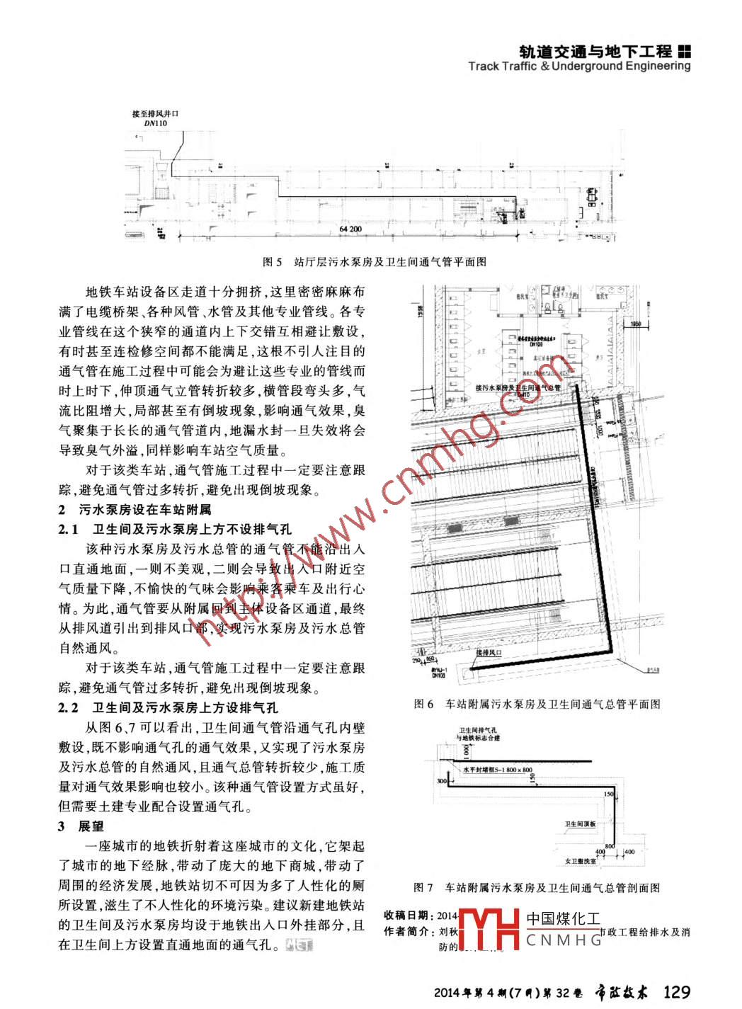 軌道交通與地下工程出Track Traffic & Underground Engineering地下車站污水泵房及污水管道的通氣措施劉秋紅,吳燕國(廣州地鐵設(shè)計(jì)研究院有限公司,廣東廣州510010)摘要:地下車站無法自然通風(fēng),污水系統(tǒng)-旦有臭氣外濫,將影響整個(gè)地下空間環(huán)境。重點(diǎn)分析地下車站污水系統(tǒng)如何設(shè)置通氣管及相應(yīng)設(shè)置方式的注意事項(xiàng)。關(guān)鍵詞:地鐵車站;污水泵房;衛(wèi)生間;污水管;通氣中圖分類號: TU 823.4文獻(xiàn)標(biāo)志碼:B文章編號:1009-7767(2014)04- -0127-03The Ventilating Measure of Sewage Pump House and Its SewagePipelines in Subway StationLiu Qiuhong, Wu Yanguo隨著人們生活水平不斷提高,人們對基礎(chǔ)設(shè)施和公內(nèi)的措施。 水封設(shè)在衛(wèi)生器具排水口下,水封深度一般共服務(wù)設(shè)施的需求,已從基本需求層次逐漸轉(zhuǎn)移到舒適為50mm。--但排水管內(nèi)氣壓變化值超過水封抵抗能力性層次。地鐵車站也從原來的無公共衛(wèi)生間發(fā)展到現(xiàn)在的最大極限時(shí),就發(fā)生水封破壞,管道中的污濁有毒有的每站均設(shè)公共衛(wèi)生間,在考慮人們出行便利的同時(shí),害 氣體就會人侵站內(nèi),不僅影響站內(nèi)環(huán)境衛(wèi)生還容易傳也不會因如廁難帶來麻煩。污水系統(tǒng)是地鐵排水系統(tǒng)的播疾病。保證排水系統(tǒng)水封不被破壞是排水系統(tǒng)設(shè)計(jì)重要部分,其直接影響乘客的使用方便舒適程度及空的重要 任務(wù),而良好的排水管道通氣系統(tǒng)是保證水封不氣質(zhì)量。一個(gè)工況良好的污水系統(tǒng)應(yīng)能迅速排除污水,被 破壞十分有效的重要措施。因此,筆者對地鐵站污水且站內(nèi)空氣不被污染。為此,現(xiàn)在地鐵站污水系統(tǒng)多采系統(tǒng)如何設(shè)置通氣管進(jìn)行了研究,結(jié)合具體情況進(jìn)行分用重力流+新型污水提升系統(tǒng)相結(jié)合的方式,重力流部析, 合理設(shè)計(jì)通氣設(shè)施,以維持污水系統(tǒng)內(nèi)氣壓穩(wěn)定。分衛(wèi)生潔具普遍設(shè)置了水封。水封是利用一定高度的靜1 污水泵房 設(shè)在車站主體水壓力來抵抗排水管內(nèi)氣壓變化,防止管內(nèi)氣體進(jìn)人室1.1 污水泵房及污水管道通氣管(見圖 1.2.3)通風(fēng)口二通氣橋女衛(wèi)生間污水泵房fE3通氣管通氣立管通風(fēng)口/中國煤化工圖1站臺層污水泵房及污水管道通氣管,MHCNMH G2014年第4期(7月)第32卷市改故術(shù)127軌道交通與地下工程Track Traffic & Underground Engineering圖1中,衛(wèi)生間污水總管及污水池上均設(shè)有通氣污水泵房立管,且通氣立管均就近接至房間.上方排風(fēng)系統(tǒng)通風(fēng)口。圖2中,污水泵房及衛(wèi)生間上方均設(shè)有通風(fēng)口,風(fēng)女衛(wèi)生間機(jī)將2個(gè)房間的臭氣經(jīng)由排風(fēng)管送到站廳層。圖3中,司機(jī)巴生間風(fēng)管敷設(shè)至排風(fēng)道終止,之后臭氣自由流動。污水池及污水管道的臭氣中可能會含有甲烷、乙烷、氨等有害氣體,這些氣體不僅有異臭味,有的還有較強(qiáng)的毒性,這些氣體進(jìn)人通氣管經(jīng)房間上方通風(fēng)口男衛(wèi)生間直接進(jìn)人通風(fēng)系統(tǒng)(見圖1)。污水泵房上方的排風(fēng)機(jī)負(fù)責(zé)將從通風(fēng)口吸人的氣體經(jīng)由站廳層排至排風(fēng)道內(nèi)圖2站臺層污水泵房及衛(wèi)生間通風(fēng)管平面圖(見圖2、3)。1)雖然衛(wèi)生間及污水泵房專門配備1套排風(fēng)系統(tǒng),風(fēng)室不和其他設(shè)備房共用排風(fēng)管及排風(fēng)機(jī),但是排風(fēng)管都弱電井是矩形的,管壁及管段連接處密封性能不佳,當(dāng)風(fēng)機(jī)發(fā)生故障,排風(fēng)管道上的逆止閥會關(guān)閉,此時(shí)污水管道及污水泵房內(nèi)的臭氣便會彌漫整個(gè)房間甚至經(jīng)由隧道風(fēng)機(jī)房.風(fēng)管泄露至站廳層,導(dǎo)致整個(gè)車站上方被臭氣籠罩。2)排風(fēng)管道只敷設(shè)至站廳層排風(fēng)道處(見圖3),即污水泵房及污水管道內(nèi)的臭氣到此就可以自由流動,逆溫或陰天時(shí),臭氣無法經(jīng)由排風(fēng)道流動到排風(fēng)口上方,相反臭氣會在外界大氣壓的作用下彌漫整個(gè)站廳層,導(dǎo)致地鐵站空氣質(zhì)量惡化。綜上得出結(jié)論,污水泵房及污水管道通氣管盡量不要利用排風(fēng)系統(tǒng)通氣,建議單獨(dú)設(shè)置通氣管直通大氣。1.2 污水泵房及污水管道通氣管單獨(dú)出車站從圖4可以看出,站臺層衛(wèi)生間污水總管與污水提升設(shè)備靠TL-1通氣。從圖5可以看出,站廳衛(wèi)生間排風(fēng)道污水總管的通氣管與站臺層污水系統(tǒng)通氣管TL-1匯合后穿過長達(dá)70 m的設(shè)備區(qū)通道進(jìn)人排風(fēng)道,最終接圖3站廳層污水 泵房及衛(wèi)生間通風(fēng)管平面圖至排風(fēng)井口部上方實(shí)現(xiàn)自然通風(fēng)。集水井De110D|D保潔工具縣間TL-1Del10o屏蔽門設(shè)備及控制室YWL-1DN110中國煤化工圖4站臺層污水泵房及衛(wèi)生間通氣管.TYHCNMH G128 市政故術(shù)2014 No.4(Jul.) Vol.32軌道交通與地下工程器Track Traffic & Underground Engineering接至排風(fēng)井口DN11064 200s島t圖5站廳層污水 泵房及衛(wèi)生間通氣管平面圖地鐵車站設(shè)備區(qū)走道十分擁擠,這里密密麻麻布滿了電纜橋架、各種風(fēng)管、水管