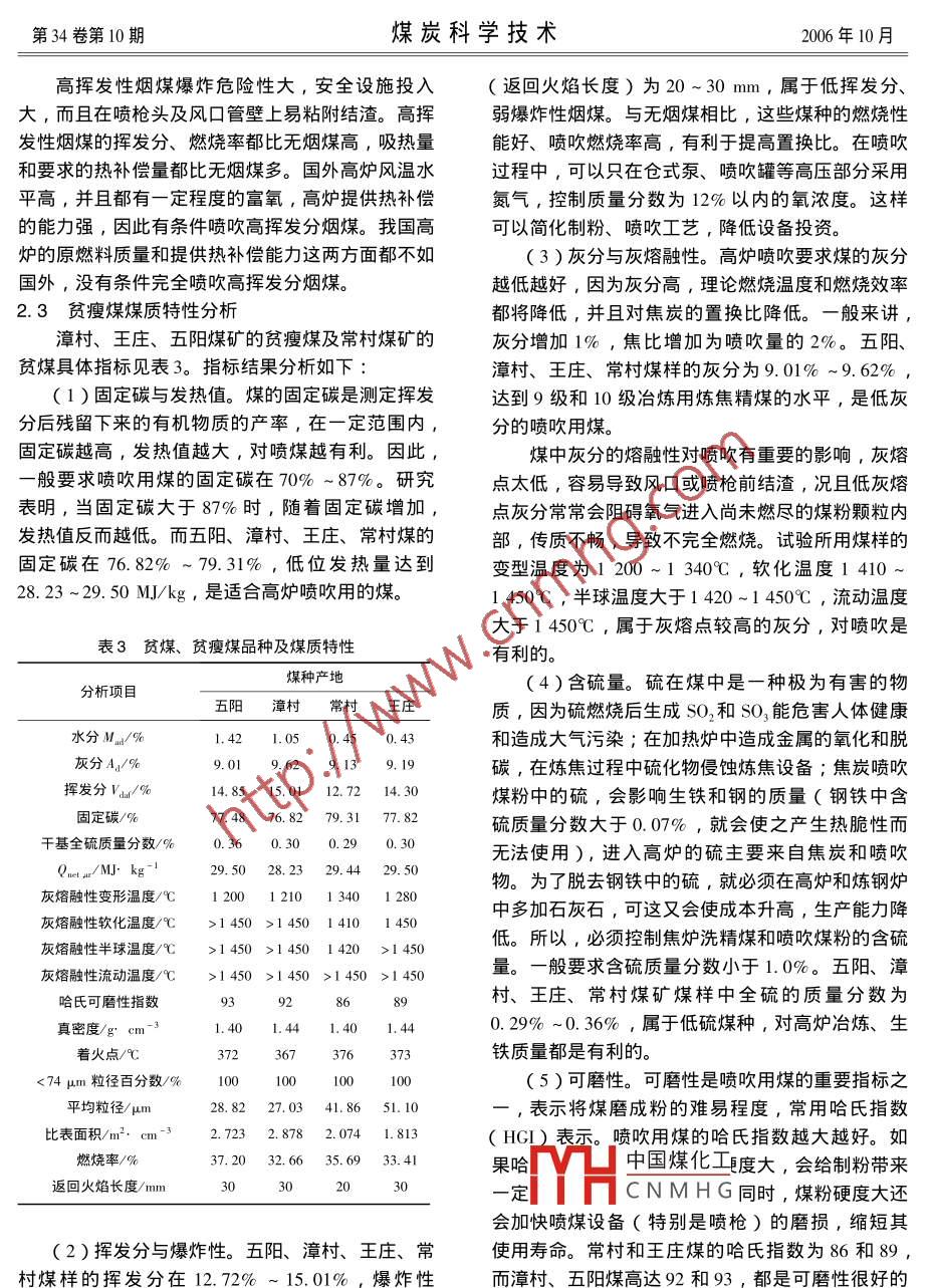 第34卷第10期煤炭科學(xué)技術(shù)2006年10月貧煤、貧瘦煤用作高爐噴吹煤的可行性研究張俊燕,金龍哲,王麗穎,金巖輝(北京科技大學(xué)金屬礦山高效開采與安全教育部重點(diǎn)實(shí)驗(yàn)室,北京10083 )摘要:介紹了 我國(guó)高爐噴吹煤的發(fā)展現(xiàn)狀,根據(jù)對(duì)高爐噴吹煤粉煤炭質(zhì)量的要求,分析了幾種貧煤、貧瘦煤的煤質(zhì)特性,測(cè)定了煤粉的返回火焰長(zhǎng)度,并結(jié)合鋼鐵企業(yè)實(shí)際應(yīng)用貧煤、貧瘦煤的高爐運(yùn)行情況及經(jīng)濟(jì)效益分析,得出4種貧煤、貧瘦煤具備生產(chǎn)高爐噴吹煤的條件和優(yōu)勢(shì)。關(guān)鍵詞:高爐噴吹;貧瘦煤;煤質(zhì)特性;返回火焰長(zhǎng)度中圖分類號(hào): TF538. 63文獻(xiàn)標(biāo)志碼: B文章編號(hào):0253-2336 ( 2006 ) 10 -0062 -04.Feasibility study on blast furnace blowing with meagrecoal and meagre lean coalZHANG Jun-yan ,JIN Long-zhe , WANG Li-ying ,JIN Yan-hui( Key Laboratory of Metal Mine High Eficient Mining and Safety of National Ministry of Education ,University of Science and Technology Bejing , Beijing 100083 , China )高爐噴吹輔助燃料是現(xiàn)代高爐煉鐵生產(chǎn)廣泛采煤、貧瘦煤被越來越多的機(jī)構(gòu)重視開發(fā)成為高爐噴用的新技術(shù),同時(shí)它還是現(xiàn)代高爐爐況調(diào)節(jié)所不可吹煤2。本文以山西潞安礦區(qū)漳村、王莊及五陽缺少的重要手段之一。高爐噴吹燃料意義在于降低煤礦的貧瘦煤、常村煤礦的貧煤為例進(jìn)行煤質(zhì)特性焦比,降低生鐵成本,改善高爐冶煉過程,并為應(yīng)分析,并結(jié)合鋼鐵企業(yè)噴吹貧瘦煤的高爐運(yùn)行指標(biāo).用高風(fēng)溫和富氧鼓風(fēng)創(chuàng)造條件, 從而進(jìn)一步改 善高和成本分析,得出貧瘦煤作為高爐噴吹煤種,從技爐各項(xiàng)技術(shù)經(jīng)濟(jì)指標(biāo)。我國(guó)煤炭資源豐富,分布廣術(shù)性能和經(jīng)濟(jì)效益方面是可行的。泛,按煤化程度不同,從褐煤到無煙煤分為14個(gè)1高爐噴吹用煤的性能要求大類和17個(gè)小類,其中可供高爐噴吹用的煤選擇余地很大,可以因地制宜、就近取煤、合理利用煤高爐噴吹用煤應(yīng)能滿足高爐冶煉工藝要求和對(duì)炭資源,這對(duì)進(jìn)一步擴(kuò)大噴煤量、提高高爐置換比提高噴吹量和置換比有利,以便替代更多的焦炭。和改善高爐冶煉過程具有重要意義中。其主要性能要求如下[31:我國(guó)高爐噴吹主要用的無煙煤資源有限,價(jià)格(1 )煤的干基灰分越低越好,應(yīng)與使用的焦過高,無煙煤不能滿足高爐噴煤技術(shù)及現(xiàn)實(shí)發(fā)展的炭灰分相同, -般要求干基灰分小于15%。需要。煙煤與無煙煤相比具有著火溫度低、燃燒性(2)干基全硫含量越低越好,煤的含硫質(zhì)量好等優(yōu)點(diǎn),但是煙煤爆炸危險(xiǎn)性大,安全設(shè)施投入分?jǐn)?shù)應(yīng)與使用的焦炭含硫質(zhì)量分?jǐn)?shù)相同,--般要求大。貧煤、貧瘦煤具有基本無結(jié)焦核,揮發(fā)分比無干基全硫質(zhì)量分?jǐn)?shù)小于1. 0%。煙煤略高,燃燒性和反應(yīng)性比無煙煤好等特點(diǎn),貧(3 )膠質(zhì)層越薄越好(小于10 mm),以免在功率確定的借鑒。[J]煤礦機(jī)械, 1994(1).參考文獻(xiàn):中國(guó)煤化工馬,遼寧義縣人,高級(jí)工程師,7機(jī)研究所從事掘進(jìn)機(jī)及元部[1]黃日恒、懸臂式掘進(jìn)機(jī)[ M]徐州:中國(guó)礦業(yè)大學(xué)出版件設(shè)計(jì)THCN M H G37.E- mail :agolongi社, 1996.[2]王韶蓓,掘進(jìn)機(jī)星輪裝載機(jī)構(gòu)參數(shù)的試驗(yàn)研究[J]煤炭@ tyccri. com科學(xué)技術(shù), 2005 (9).叢培建.用于大型掘進(jìn)機(jī)及連續(xù)采煤機(jī)的新型裝載機(jī)構(gòu)收稿日期: 2006 -05-10;責(zé)任編輯:王宗禹62第34卷第10期煤炭科學(xué)技術(shù)2006年10月噴吹過程中結(jié)焦,堵塞噴槍和風(fēng)口,影響噴吹和高(6)煤的發(fā)熱值越高越好,噴入高爐的煤粉爐正常生產(chǎn)。是以其放出的熱量和形成的CO和H2來替代焦炭(4)煤的可磨性要好,高爐噴吹用煤需要將在高爐內(nèi)提供熱源和還原劑。因此,煤的發(fā)熱值越煤磨到一定細(xì)度,例如小于74 μm的煤粉占到高,在高爐內(nèi)放出的熱量越多, 替代的焦炭量也就65% ~85% ,可磨性好,則制粉消耗的電能就少,越多??山档蛧姶蒂M(fèi)用。(5)煤的燃燒性能要好,即著火溫度低,反2高爐噴吹用煤的煤質(zhì)分析應(yīng)性強(qiáng),可以使噴入高爐的煤粉能在有限空間和時(shí)2.1高爐噴吹無煙煤品種間內(nèi)盡可能多地氣化,少量未氣化的煤粉也因反應(yīng)無煙煤具有固定碳高、熱值高、置換比高、安性好而與高爐煤氣中的CO2和H2O反應(yīng)而氣化,全性好的優(yōu)點(diǎn)。從安全上考慮,我國(guó)高爐噴吹煤種不給高爐冶煉帶來負(fù)擔(dān)。另外,燃燒性能好的煤也在很長(zhǎng)時(shí)期內(nèi)-直堅(jiān)持以噴吹無煙煤為主??梢阅サ么忠恍?即粒徑小于74 μm的煤粉所占我國(guó)主要的高爐噴吹無煙煤品種及煤質(zhì)特性分比例少一些,這可降低磨煤能耗和費(fèi)用。析結(jié)果見表1。表1我國(guó)主 要的高爐噴吹無煙煤品種及煤質(zhì)特性工業(yè)分析/%哈氏可磨產(chǎn)品名稱umAM,Varu( S.1)M]. kg-1性指數(shù)陽泉1號(hào)噴吹煤0 ~2510.0~11.0≤8. 009.01 ~11.00≤0.6530. 87 ~30.4570~85陽泉2號(hào)噴吹煤0~2511.0~12. 0≤0.8030.45~30.03陽泉3號(hào)噴吹煤1