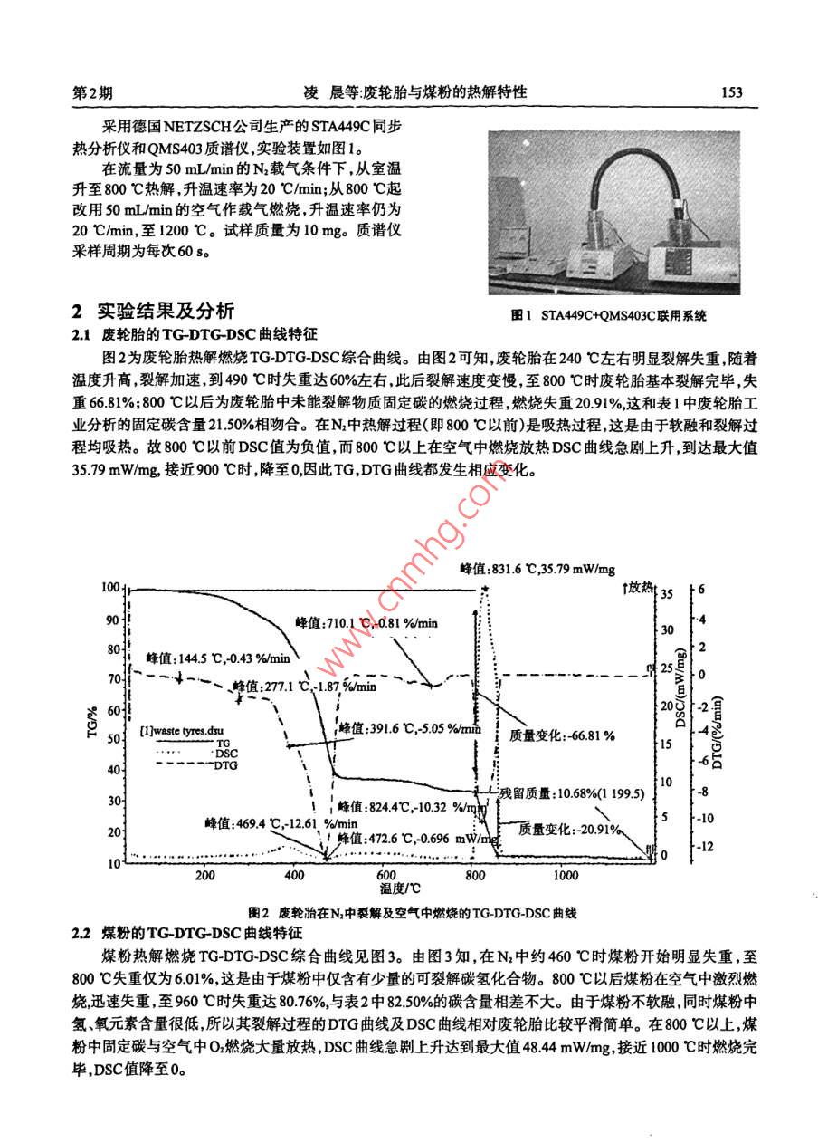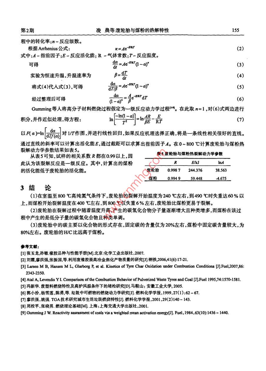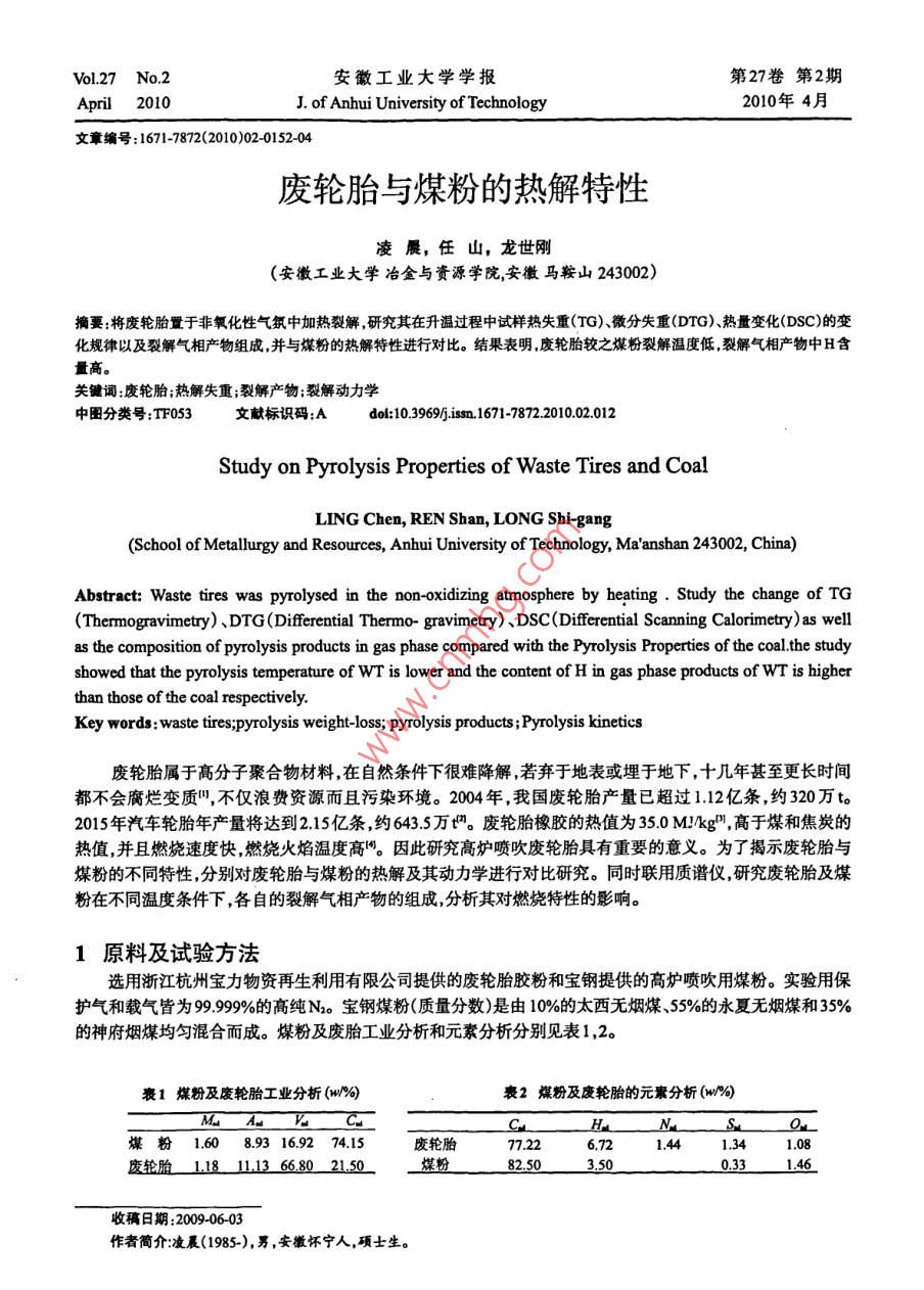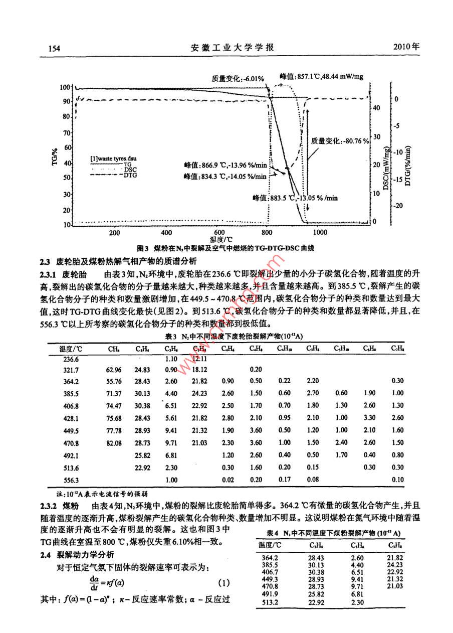 Vol 27 No. 2安徽工業(yè)大學(xué)學(xué)報(bào)第27卷第2期2010J of Anhui University of Technology2010年4月文章編號(hào):1671-78172(2010)02015204廢輪胎與煤粉的熱解特性凌晨,任山,龍世剛(安徽工業(yè)大學(xué)冶金與資源學(xué)院安徽馬鞍山243002)摘要:將廢輪胎置于非氧化性氣氛中加熱裂解研究其在升溫過程中試樣熱失重(TG)微分失重(DTG)熱量變化(DsC)的變化規(guī)律以及裂解氣相產(chǎn)物組成,并與煤粉的熱解特性進(jìn)行對(duì)比。結(jié)果表明,廢輪胎較之煤粉裂解溫度低裂解氣相產(chǎn)物中H含量高。關(guān)鍵詞廢輪胎;熱解失重;裂解產(chǎn)物;裂解動(dòng)力學(xué)中圖分類號(hào):TF053文獻(xiàn)標(biāo)識(shí)碼:Adol:103969sn167178722010.02012Study on Pyrolysis Properties of Waste Tires and CoalLING Chen, REN Shan, LONG Shi-gang(School of Metallurgy and Resources, Anhui University of Technology, Ma'anshan 243002, China)Abstract: Waste tires was pyrolysed in the non-oxidizing atmosphere by heating. Study the change of TG( Thermogravimetry), DTG(Differential Thermo-gravimetry), DSC(Differential Scanning Calorimetry)as wellas the composition of pyrolysis products in gas phase compared with the Pyrolysis Properties of the coal. the studyshowed that the pyrolysis temperature of Wr is lower and the content of H in gas phase products of wt is higherthan those of the coal reKey words: waste tires; pyrolysis weight-loss; pyrolysis products Pyrolysis kinetics廢輪胎屬于高分子聚合物材料,在自然條件下很難降解若棄于地表或埋于地下,十幾年甚至更長(zhǎng)時(shí)間都不會(huì)腐爛變質(zhì)",不僅浪費(fèi)資源而且污染環(huán)境。2004年,我國(guó)廢輪胎產(chǎn)量已超過112億條,約320萬to2015年汽車輪胎年產(chǎn)量將達(dá)到25億條,約643.5萬。廢輪胎橡膠的熱值為350M!kg,高于煤和焦炭的熱值,并且燃燒速度快,燃燒火焰溫度高。因此研究髙爐噴吹廢輪胎具有重要的意義。為了揭示廢輪胎與煤粉的不同特性,分別對(duì)廢輪胎與煤粉的熱解及其動(dòng)力學(xué)進(jìn)行對(duì)比研究。同時(shí)聯(lián)用質(zhì)譜儀研究廢輪胎及煤粉在不同溫度條件下,各自的裂解氣相產(chǎn)物的組成分析其對(duì)燃燒特性的影響。1原料及試驗(yàn)方法選用浙江杭州寶力物資再生利用有限公司提供的廢輪胎膠粉和寶鋼提供的高爐噴吹用煤粉。實(shí)驗(yàn)用保護(hù)氣和載氣皆為999990高純N。寶鋼煤粉(質(zhì)量分?jǐn)?shù))是由10%的太西無煙煤、55%的永夏無煙煤和35%的神府煙煤均勻混合而成。煤粉及廢胎工業(yè)分析和元素分析分別見表1,2饔1煤粉及廢輪胎工業(yè)分析(w%衰2煤粉及廢輪胎的元素分析(w%- M A kCC煤粉160893169274.5廢輪胎77.22672144341.08煤粉收稿日期:20090603作者簡(jiǎn)介凌晨(1985-),男,安徽懷寧人,碩士生。第2期凌晨等廢輪胎與煤粉的熱解特性153采用德國(guó) NETZSCH公司生產(chǎn)的STA44c同步熱分析儀和QMS403質(zhì)譜儀,實(shí)驗(yàn)裝置如圖1。在流量為50mL/min的N2載氣條件下,從室溫升至800℃熱解,升溫速率為20℃/min;從800℃起改用50mL/min的空氣作載氣燃燒,升溫速率仍為20℃min,至1200℃。試樣質(zhì)量為10mg。質(zhì)譜儀采樣周期為每次60s2實(shí)驗(yàn)結(jié)果及分析圖1STA49c+QMS403C聯(lián)用系統(tǒng)21廢輪胎的 TG-DTG-DSC曲線特征圖2為廢輪胎熱解燃燒 TG-DTG-DSC綜合曲線。由圖2可知,廢輪胎在240℃左右明顯裂解失重隨著溫度升高裂解加速到490℃時(shí)失重達(dá)60%左右此后裂解速度變慢,至800℃時(shí)廢輪胎基本裂解完畢,失重6681%;800℃以后為廢輪胎中未能裂解物質(zhì)固定碳的燃燒過程,燃燒失重2091%這和表1中廢輪胎工業(yè)分析的固定碳含量2150%相吻合。在N中熱解過程(即800℃以前)是吸熱過程,這是由于軟融和裂解過程均吸熱。故800℃以前DSC值為負(fù)值,而800℃以上在空氣中燃燒放熱DSC曲線急劇上升,到達(dá)最大值3579mWmg,接近900℃時(shí)降至0因此TG,DTG曲線都發(fā)生相應(yīng)變化。峰值:831.6℃3579mw/mngf放熱35峰值:710.1℃,081%min4峰值:1445℃043%min峰值271℃187%minof waste tyres. dsu峰值:3916℃,505質(zhì)量變化:6681%15讀留質(zhì)量:10.68%(11995-8峰值:824.4℃,-10.32峰值:4694℃,-12.61%min蜂值:4726℃,0696mW質(zhì)量變化:209101000圖2廢輪胎在N中裂解及空氣中燃燒的 TG-DTG-DSC曲線22煤粉的 TG-DTG-DSC曲線特征煤粉熱解燃燒TG- DTG-DSC綜合曲線見圖3。由圖3知,在N2中約460℃時(shí)煤粉開始明顯失重,至800℃失重僅為601%這是由于煤粉中僅含有少量的可裂解碳?xì)浠衔铩?00℃以后煤粉在空氣中激烈燃燒迅速失重至960℃時(shí)失重達(dá)8076%與表2中8250%的碳含量相差不大。由于煤粉不軟融,同時(shí)煤粉中氫、氧元素含量很低,所以其裂解過程的DTG曲線及DSC曲線相對(duì)廢輪胎比較平滑簡(jiǎn)單。在800℃以上,煤粉中固定碳與空氣中O燃燒大量放熱,DSc曲線急劇上升達(dá)到最大值4844mW/mg,接近1000℃時(shí)燃燒完畢,DSC值降至0。安徽工業(yè)大學(xué)學(xué)報(bào)2010年質(zhì)量變化:601%峰值:8571℃,484mW/mg質(zhì)量變化:8076%3010[I]waste tyres. dsu峰值:8669℃,-13.96%min峰值:834.3℃-14.05%min15峰值:883530s%/mim}0溫度/℃3煤粉在N中裂解及空氣中燃燒的 TG-DTG-DSC曲線23廢輪胎及煤粉熱解氣相產(chǎn)物的質(zhì)譜分析23,1廢輪胎由表3知N環(huán)境中廢輪胎在2366℃即裂解出少量的小分子碳?xì)浠衔镫S著溫度的升高裂解出的碳?xì)浠衔锏姆肿恿吭絹碓酱?種類越來越多,并且含量越來越高。到3855℃,裂解產(ch