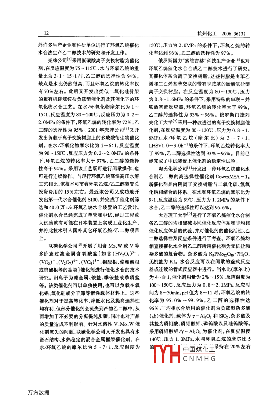 杭州化工2006.36(3)環(huán)氧乙烷合成乙二醇的研究進(jìn)展崔小明(北京燕山石化公司研究院,北京102550)摘要:介紹了環(huán)氧乙烷法合成乙二醇的研究開(kāi)發(fā)進(jìn)展,重點(diǎn)介紹了環(huán)氧乙炕催化水合法和碳酸乙烯酯法制乙二醇的研究進(jìn)展,提出了我國(guó)今后環(huán)氧乙炕合成乙二醇的發(fā)展建議。關(guān)鍵詞:環(huán)氧乙炕;乙二醇;合成;催化法乙二醇是一種重要的石油化工基礎(chǔ)有機(jī)原中44.9mm×3.0mm的高強(qiáng)度合金鋼管;(3)反應(yīng)料,主要用于生產(chǎn)聚酯纖維、防凍劑不飽和聚酯生成氣中的醛類等雜質(zhì)通過(guò)環(huán)氧乙烷吸收塔急冷樹(shù)脂潤(rùn)滑劑、增塑劑、非離子表面活性劑以及炸段大部分被吸收掉,保證了產(chǎn)品中較低的醛含量藥等。目前,國(guó)內(nèi)外乙二醇的工業(yè)生產(chǎn)方法主要以及乙二醇產(chǎn)品的UV值;(4)從貧吸收水中抽出是環(huán)氧乙烷直接水合法,雖然它的工藝成熟,但水20~30/h送到解吸塔提濃段,將解吸過(guò)程中環(huán)比大,能耗高,生產(chǎn)成本較高,為此人們又相繼開(kāi)氧乙烷水解生成的醇濃縮(約含醇30%),以每小發(fā)出環(huán)氧乙烷催化水合法和碳酸乙烯酯法以及由時(shí)1.2噸量排至醇閃蒸回收塔,避免了吸收水中合成氣合成乙二醇等各種新的生產(chǎn)方法。其中環(huán)醇的積累。氧乙烷催化水合法和碳酸乙烯酯法被認(rèn)為是今后SD工藝的主要技術(shù)特點(diǎn)為:(1)采用C以上乙二醇最有發(fā)展前景的工業(yè)化生產(chǎn)方法,是目前新酸銀鹽制備的含銫銀催化劑;(2)反應(yīng)管使用管國(guó)內(nèi)外研究開(kāi)發(fā)的熱點(diǎn)。徑為中38.1mm×3.4mm的無(wú)縫碳鋼管;(3)設(shè)置1環(huán)氧乙烷直接水合法環(huán)氧乙烷再吸收系統(tǒng),調(diào)節(jié)循環(huán)工藝水量恰好維持再吸收塔釜液中的環(huán)氧乙烷濃度(質(zhì)量分?jǐn)?shù)約環(huán)氧乙烷直接水合法是目前國(guó)內(nèi)外工業(yè)化生為10%),然后將之直接送入環(huán)氧乙烷精餾塔或產(chǎn)乙二醇的主要方法,該生產(chǎn)技術(shù)基本上由英荷乙二醇水合系統(tǒng),減少了系統(tǒng)中處理高濃度環(huán)氧殼牌、美國(guó) Halcon-SD以及美國(guó)聯(lián)碳三家公司乙烷的部位,裝置的安全性較好;(4)裝置的整個(gè)所壟斷。它們的工藝技術(shù)和工藝流程基本上相水系統(tǒng)基本上采用閉環(huán)控制,各凝液量充分利用似,即采用乙烯氧氣為原料,在銀催化劑、甲烷或使裝置水耗量較低,但因水系統(tǒng)置換量小,整個(gè)水氮?dú)庵路€(wěn)劑氯化物抑制劑存在下,由乙烯直接氧系統(tǒng)雜質(zhì)積累較多影響了產(chǎn)品UV值的控制?;森h(huán)氧乙烷,再將環(huán)氧乙烷進(jìn)一步與水以UCC工藝的主要技術(shù)特點(diǎn)為:(1)使用含鋰、定物質(zhì)的量比在管式反應(yīng)器內(nèi)進(jìn)行水合反應(yīng)生成鈉鉀、銣、銫和鋇至少一種正離子助劑和含硫化乙二醇最后將乙二醇溶液經(jīng)蒸發(fā)提濃、脫水、分物、氟化物氧代負(fù)離子助劑的銀催化劑;(2)反應(yīng)餾得到乙二醇及其它副產(chǎn)品。此外,整個(gè)工藝還管使用管徑為中349mm×2.75mm的高強(qiáng)度合設(shè)置了與其生產(chǎn)能力相配套的空分裝置、碳酸鹽金鋼管;(3)由環(huán)氧乙烷提純塔、脫惰性氣體塔、精處理以及廢氣廢液處理等系統(tǒng)。三家公司的專利制塔組成環(huán)氧乙烷精制系統(tǒng),確保了產(chǎn)品的質(zhì)量。技術(shù)主要區(qū)別體現(xiàn)在催化劑、反應(yīng)和吸收工藝以及一些技術(shù)細(xì)節(jié)上。2環(huán)氧乙烷催化水合法SheI工藝的主要技術(shù)特點(diǎn)為:(1)使用Ag-針對(duì)環(huán)氧乙烷直接水合法生產(chǎn)乙二醇工藝中Re-Cs-S體系銀催化劑;(2)反應(yīng)管使用管徑為存在的工藝流程長(zhǎng)、設(shè)備多、能耗高等不足,國(guó)內(nèi)中國(guó)煤化工CNMHG杭州化工2006.36(3)外許多生產(chǎn)企業(yè)和科研單位進(jìn)行了環(huán)氧乙烷催化150℃,壓力為20MPa的條件下,環(huán)氧乙烷的轉(zhuǎn)水合法生產(chǎn)乙二醇技術(shù)的研究和開(kāi)發(fā)工作化率達(dá)到96%,乙二醇的選擇性為97%殼牌公司3采用氟磺酸離子交換樹(shù)脂為催化俄羅斯國(guó)力“索維吉赫”科技生產(chǎn)企業(yè)6也對(duì)劑,在反應(yīng)溫度為75~115℃、水與環(huán)氧乙烷的重環(huán)氧乙烷催化水合合成乙二醇技術(shù)進(jìn)行了研究。量比為3:1-15:1時(shí),乙二醇的選擇性為94%,其催化體系為離子交換樹(shù)脂,這些樹(shù)脂是由苯乙缺點(diǎn)是水比仍然很高,而且環(huán)氧乙烷的轉(zhuǎn)化率僅烯和二乙烯基苯交聯(lián)的帶有季胺基的碳酸氫鹽型有70%左右。此后又開(kāi)發(fā)出類似二氧化硅骨架離子交換樹(shù)脂。在反應(yīng)溫度為80-130℃,壓力的聚有機(jī)硅烷銨鹽負(fù)載型催化劑及其催化下的環(huán)為0.8~1.6MPa的條件下,采用特殊的串聯(lián)-并氧化物水合工藝。在水/環(huán)氧化物摩爾比為1~聯(lián)活塞流反應(yīng)器環(huán)氧乙烷的轉(zhuǎn)化率大于99%,15:1,反應(yīng)溫度為80~200℃,反應(yīng)壓力為0.2~乙二醇的選擇性為93%~96%。俄羅斯門捷列20MPa的條件下,環(huán)氧乙烷的轉(zhuǎn)化率為72%,乙夫化工大學(xué)7采用一種改進(jìn)過(guò)的離子交換樹(shù)脂催二醇的選擇性為95%。2001年