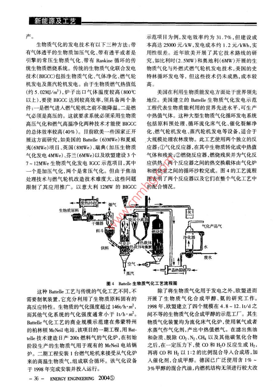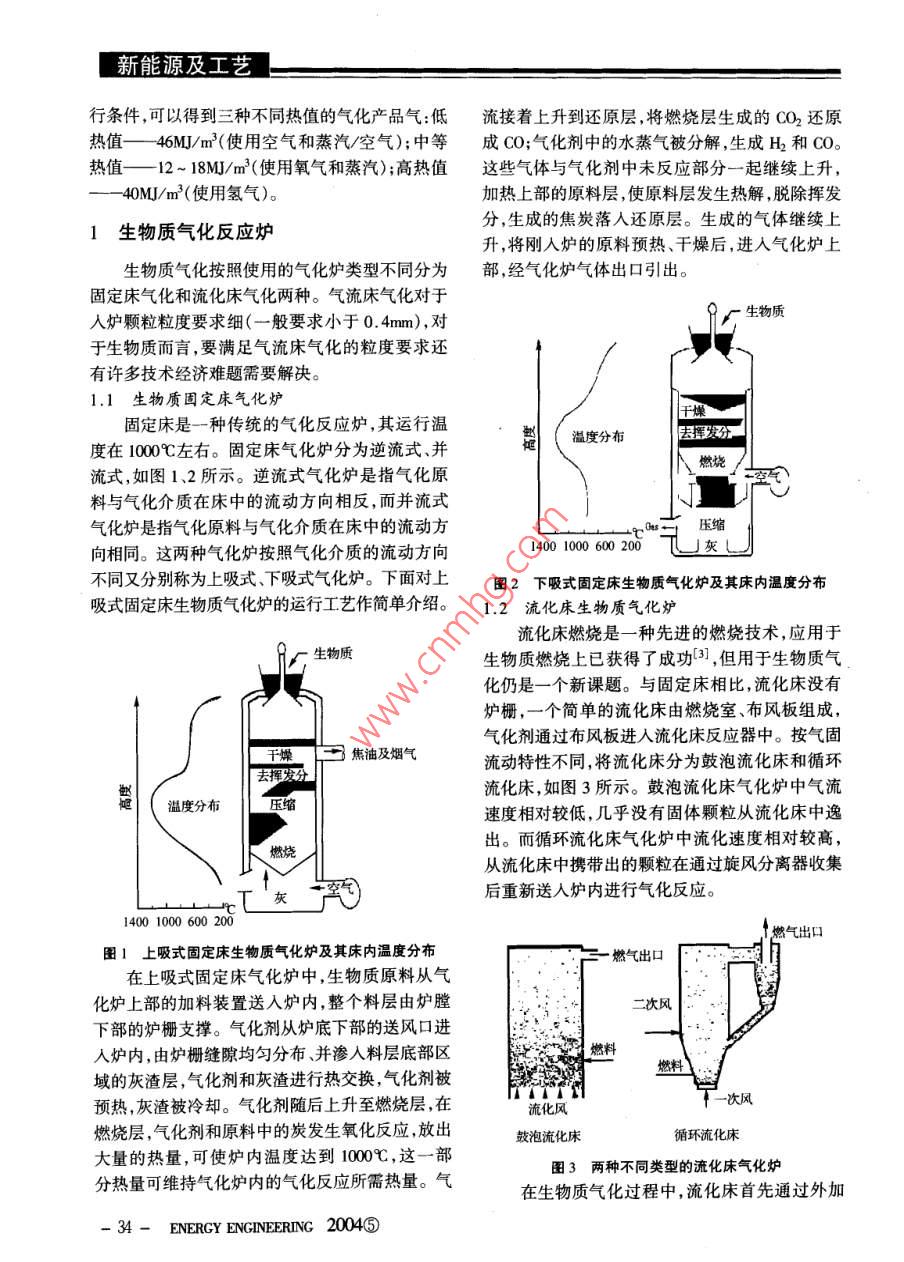 新能源及工藝行條件,可以得到三種不同熱值的氣化產(chǎn)品氣:低流接著上升到還原層,將燃燒層生成的CO2還原熱值一-46MJ/m2(使 用空氣和蒸汽/空氣);中等成CO;氣化劑中的水蒸氣被分解,生成H2和CO。熱值12~ 18M]/m2(使用氧氣和蒸汽) ;高熱值這些氣體與氣化劑中未反應(yīng)部分一起繼續(xù)上升,-40MJ/m2(使用氫氣)。加熱上部的原料層,使原料層發(fā)生熱解,脫除揮發(fā)分,生成的焦炭落人還原層。生成的氣體繼續(xù)上1生 物質(zhì)氣化反應(yīng)爐升,將剛?cè)藸t的原料預(yù)熱、干燥后,進(jìn)入氣化爐上生物質(zhì)氣化按照使用的氣化爐類(lèi)型不同分為部,經(jīng)氣化爐氣體出口引出。固定床氣化和流化床氣化兩種。氣流床氣化對(duì)于9r生物質(zhì)人爐顆粒粒度要求細(xì)(一般要求小于0.4mm),對(duì)于生物質(zhì)而言,要滿(mǎn)足氣流床氣化的粒度要求還有許多技術(shù)經(jīng)濟(jì)難題需要解決。.1 生物質(zhì)固定床氣化爐固定床是--種傳統(tǒng)的氣化反應(yīng)爐,其運(yùn)行溫溫度分布去揮發(fā)分度在1000C左右。固定床氣化爐分為逆流式、并燃燒流式,如圖1、2所示。逆流式氣化爐是指氣化原料與氣化介質(zhì)在床中的流動(dòng)方向相反,而并流式氣化爐是指氣化原料與氣化介質(zhì)在床中的流動(dòng)方壓縮向相同。這兩種氣化爐按照氣化介質(zhì)的流動(dòng)方向1400 1000 600 200灰J不同又分別稱(chēng)為上吸式、下吸式氣化爐。下面對(duì)上圖2下吸式固定床生物質(zhì)氣化爐及其床內(nèi)溫度分布吸式固定床生物質(zhì)氣化爐的運(yùn)行工藝作簡(jiǎn)單介紹。1.2 流化床生物質(zhì)氣化爐流化床燃燒是一種先進(jìn)的燃燒技術(shù),應(yīng)用于生物質(zhì)生物質(zhì)燃燒上已獲得了成功[3] ,但用于生物質(zhì)氣化仍是一個(gè)新課題。與固定床相比,流化床沒(méi)有爐柵,一個(gè)簡(jiǎn)單的流化床由燃燒室、布風(fēng)板組成,干燥日焦油及煙氣氣化劑通過(guò)布風(fēng)板進(jìn)人流化床反應(yīng)器中。按氣固流動(dòng)特性不同,將流化床分為鼓泡流化床和循環(huán)流化床,如圖3所示。鼓泡流化床氣化爐中氣流速度相對(duì)較低,幾乎沒(méi)有固體顆粒從流化床中逸出。而循環(huán)流化床氣化爐中流化速度相對(duì)較高,從流化床中攜帶出的顆粒在通過(guò)旋風(fēng)分離器收集后重新送人爐內(nèi)進(jìn)行氣化反應(yīng)。↑燃?xì)獬隹趫D1上吸式固定床生物質(zhì)氣化爐及其床內(nèi)溫度分布.燃?xì)獬隹谠谏衔焦潭ù矚饣癄t中,生物質(zhì)原料從氣化爐上部的加料裝置送人爐內(nèi),整個(gè)料層由爐膛二次風(fēng)下部的爐柵支撐。氣化劑從爐底下部的送風(fēng)口進(jìn)人爐內(nèi),由爐柵縫隙均勻分布、并滲人料層底部區(qū)燃料域的灰渣層,氣化劑和灰渣進(jìn)行熱交換,氣化劑被T預(yù)熱,灰渣被冷卻。氣化劑隨后上升至燃燒層,在流化風(fēng)燃燒層,氣化劑和原料中的炭發(fā)生氧化反應(yīng),放出鼓泡流化床循環(huán)流化床大量的熱量,可使?fàn)t內(nèi)溫度達(dá)到1000C,這-部圖3兩種不同類(lèi) 型的流化床氣化爐分熱量可維持氣化爐內(nèi)的氣化反應(yīng)所需熱量。氣在生物質(zhì)氣化過(guò)程中,流化床首先通過(guò)外加- 34- ENERGY ENGINEERING 2004⑤」新能源及工藝熱達(dá)到運(yùn)行溫度,床料吸收并貯存熱量。鼓入氣固定床多,出爐燃?xì)鉁囟群痛矞鼗?致?;癄t的適量空氣經(jīng)布風(fēng)板均勻分布后將床料流1.3.3 能量利用和轉(zhuǎn)換化,床料的湍流流動(dòng)和混合使整個(gè)床保持--個(gè)恒固定床中由于床內(nèi)溫度不均勻,導(dǎo)致熱交換定的溫度。當(dāng)合適粒度的生物質(zhì)燃料經(jīng)供料裝置效果較流化床差,但固體在床中停留時(shí)間長(zhǎng),故碳加入到流化床中時(shí),與高溫床料迅速混合,在布風(fēng)轉(zhuǎn)換效率高,- -般達(dá)90% ~ 99%。流化床出爐燃板以上的一-定空間內(nèi)激烈翻滾,在常壓條件下迅氣中固體顆粒較多,造成不完全燃燒損失,碳轉(zhuǎn)換速完成干燥、熱解、燃燒及氣化反應(yīng)過(guò)程,使之在效率-般只有90%左右。兩者都具有較高熱效等溫條件下實(shí)現(xiàn)了能量轉(zhuǎn)化,從而生產(chǎn)出需要的率。燃?xì)?。通過(guò)控制運(yùn)行參數(shù)可使流化床床溫保持在1.3.4 環(huán)境效益結(jié)渣溫度以下,床層只要保持均勻流化就可使床固定床燃?xì)怙w灰含量低,而流化床燃?xì)怙w灰層保持等溫,這樣可避免局部燃燒高溫。流化床含量高。其原因是固定床中溫度可高于灰熔點(diǎn), .氣化爐良好的混合特性和較高的氣固反應(yīng)速率使從而使灰熔化成液態(tài),從爐底排出;而流化床中溫其非常適合于大型的工業(yè)供氣系統(tǒng)。因此,流化度低于灰熔點(diǎn),飛灰被出氣帶出一部分。所以流床反應(yīng)爐是生物質(zhì)氣化轉(zhuǎn)化的- - 種較佳選擇,特化床對(duì)環(huán)境影響比固定床大,必須對(duì)燃?xì)膺M(jìn)行除別是對(duì)于灰熔點(diǎn)較低的生物質(zhì)。塵凈化處理。1.3固定床氣化爐與流化床氣化爐性能比1.3.5 經(jīng)濟(jì)性較[4.5]在設(shè)計(jì)制造方面,由于流化床的結(jié)構(gòu)較固定固定床氣化爐與流化床氣化爐有著各自的優(yōu)床復(fù)雜,故投資高。在運(yùn)用方面,固定床對(duì)原料要缺點(diǎn)和一定的適用范圍。下面從以下五個