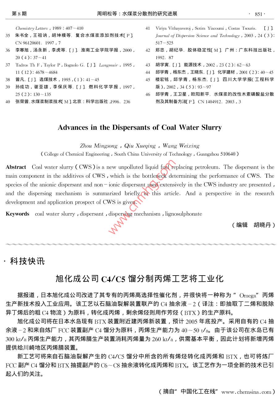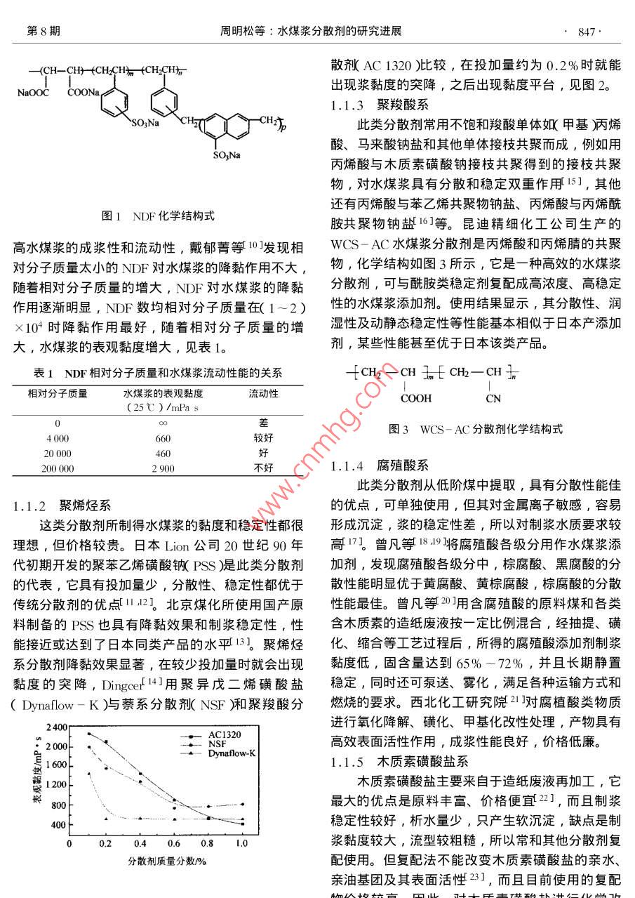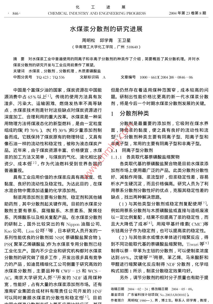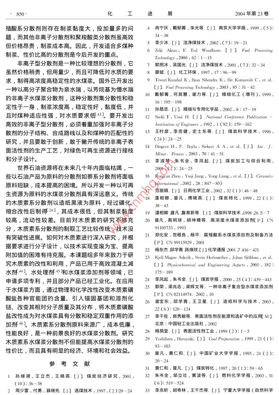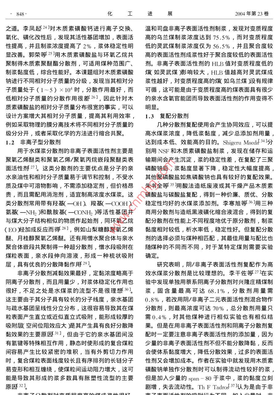 化進展846CHEMICAL INDUSTRY AND ENGINEERING PROGRESS2004年第23卷第8期水煤漿分散劑的研究進展周明松邱學(xué)青王衛(wèi)星華南理工大學(xué)化工學(xué)院,廣州510640)摘要對水煤漿工業(yè)中普遍使用的陰離子和非離子分散劑的種類作了介紹,簡要概括了其分散機理。并對水煤漿分散劑的研究開發(fā)與工業(yè)應(yīng)用前景作了展望。關(guān)鍵詞水煤漿,分散劑,分散機理,木質(zhì)素磺酸鹽中圖分類號TQ423;TQ53文獻標識碼A文章編號1000-6613(2004)8-0846-06中國是個富煤少油的國家,煤炭資源在中國能但是仍然存在著適用煤種范圍窄,成本較高的問源消費中占65%以上η。傳統(tǒng)的使用方法具有灰題。研制出性能價格比更高的新一代水煤漿分散渣多、污染大、運輸困難、燃燒發(fā)熱率不高等缺劑,將是今后一個時期水煤漿分散劑發(fā)展的關(guān)鍵。點,水煤漿技術(shù)則是針對這些缺點對煤炭資源進行深度加工、合理利用的重大改革。水煤漿是一種采1分散劑種類用物理方法將煤液態(tài)化的新型燃料,是由一定粒度分散劑是最重要的添加劑,它吸附在煤水界組成的煤約丌0%)水約30%廂和少量添加劑制面,降低漿的黏度,使之具有良好的流動性和流備而成。它既保持了煤炭原有的物理特征,又具有型6。分散劑種類主要有陰離子型、陽離子型和像石油一樣的流動性和穩(wěn)定性,被稱為液態(tài)煤炭產(chǎn)非離子型,常用的主要有陰離子型和非離子型品。近年來,由于煤炭資源豐富、價格便宜,水煤1.1陰離子型分散劑漿的加工方法又簡單,與煤炭的氣化、液化相比投1.1.1各類取代基萘磺酸鹽縮聚物資少、成本低21,作為代油燃料受到世界各國的各類取代基的萘磺酸鹽聚合物是目前水煤漿添普遍重視。加劑市場上使用最廣泛的產(chǎn)品。此類分散劑分散性具有工業(yè)應(yīng)用價值的水煤漿應(yīng)具有高濃度、低好、減黏作用強、漿流型好,但漿穩(wěn)定性差,容易黏度、良好的流動性及穩(wěn)定性。為達此目的,在煤析水產(chǎn)生硬沉淀,而且價格偏高。研究人員為了利水混合物中需添加適量的化學(xué)添加劑用萘系分散劑分散性好的優(yōu)點,克服其穩(wěn)定性差的制漿用添加劑主要有分散劑、穩(wěn)定劑和其他輔缺點,找出兩種解決思路。助藥劑,其中分散劑起關(guān)鍵作用。目前的水煤漿分(1)與其他類型分散劑或穩(wěn)定劑復(fù)配使用7散劑主要有萘系、腐殖酸系、木質(zhì)素系、聚烯烴例如用萘系分散劑與木質(zhì)磺酸鹽或直接與造紙廢液系、丙烯酸系以及相關(guān)復(fù)配產(chǎn)品。在水煤漿分散劑以一定比例復(fù)配,結(jié)果不但提高了漿的穩(wěn)定性,而的研制上,國外比較突出的有 Nippon油脂公司、且大大降低了成本8。用羧甲基纖維素(CMC)等Kao公司、Lin公哥3等,日本研究人員開發(fā)的一長鏈高分子作為穩(wěn)定劑,也可以提高漿的穩(wěn)定性系列性能優(yōu)良的分散劑如NSK萘磺酸鹽聚合物(2)與其他親水或憎水單體進行縮聚反應(yīng),得PS聚苯乙烯磺酸鹽作為水煤漿專用分散劑已經(jīng)到不同功能取代基的萘磺酸鹽縮聚物。 Tiwari等工業(yè)化生產(chǎn)。國內(nèi)不少企業(yè)和研究機構(gòu)都對水煤漿制得以萘一甲苯為主鏈的分散劑,可以使制漿濃度分散劑的研究做了很多工作,開發(fā)出很多具有競爭達到69%。沈鍵等⑩用萘、苯乙烯、馬來酸酐和力的產(chǎn)品,如迪昆精細化工公司側(cè)重于研究高效的甲醛進行縮聚磺化反應(yīng)制得NDF分散劑,化學(xué)結(jié)水煤漿分散劑,主要品種有CWF-15和wCS-構(gòu)式如圖1所示,制漿分散穩(wěn)定效果均好。AC。南京大學(xué)研究人員4開發(fā)的NDF適用煤種另外,調(diào)節(jié)分散劑的相對分子質(zhì)量也有助于提寬,性能好,占有大量的水煤漿添加劑市場。還有淮南礦業(yè)集團合成材料有限責(zé)任公司開發(fā)的HNF收稿日期2004-02-24;修改稿日期2004-05-09以同時兼顧水煤漿的分散性和穩(wěn)定性5。目前基金項目廣東省科技計劃項目No.2003A3030102作者簡介周明糍1980—),男,博士生。聯(lián)系人邱學(xué)青,教授第8期周明松等:水煤漿分散劑的研究進展847-,++CH CHn-散劑AC1320兒較,在投加量約為0.2%時就能NaOoCCOoNa出現(xiàn)漿黏度的突降,之后出現(xiàn)黏度平臺,見圖2。1.1.3聚羧酸系此類分散劑常用不飽和羧酸單體奴甲基炳烯酸、馬來酸鈉鹽和其他單體接枝共聚而成,例如用丙烯酸與木質(zhì)素磺酸鈉接枝共聚得到的接枝共聚物,對水煤漿具有分散和穩(wěn)定雙重作用151,其他還有丙烯酸與苯乙烯共聚物鈉鹽、丙烯酸與丙烯酰圖1NDF化學(xué)結(jié)構(gòu)式胺共聚物鈉鹽16等。昆迪精細化工公司生產(chǎn)的高水煤漿的成漿性和流動性,戴郁菁等⑩0發(fā)現(xiàn)相WCS-AC水煤漿分散劑是丙烯酸和丙烯腈的共聚對分子質(zhì)量太小的NDF對水煤漿的降黏作用不大物,化學(xué)結(jié)構(gòu)如圖3所示,它是一種高效的水煤漿隨著相對分子質(zhì)量的增大,NDF對水煤漿的降黏分散劑,可與酰胺類穩(wěn)定劑復(fù)配成高濃度、高穩(wěn)定作用逐漸明顯,NDF數(shù)均相對分子質(zhì)量在(1-2)性的水煤漿添加劑。使用結(jié)果顯示,其分散性、潤×10時降黏作用最好,隨著相對分子質(zhì)量的增濕性及動靜態(tài)穩(wěn)定性等性能基本相似于日本產(chǎn)添加大,水煤漿的表觀黏度增大,見表1。劑,某些性能甚至優(yōu)于日本