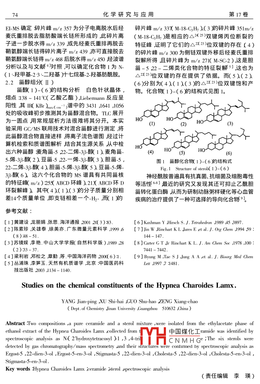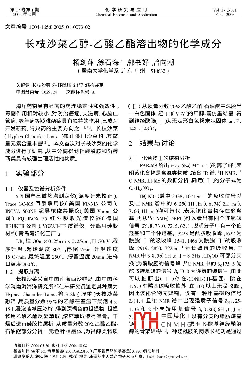 第17卷第1期化學(xué)研究與應(yīng)用Vol. 17 No2005年2Chemical Research and ApplicationFeb.2005文章編號:1004-16562005)10073-02長枝沙菜乙醇-乙酸乙酯溶出物的化學(xué)成分楊劍萍狳石海*郭書好曾向潮(暨南大學(xué)化學(xué)系廣東廣州510632)關(guān)鍵詞:枝沙菜神經(jīng)酰胺淄醇結(jié)構(gòu)鑒定中圖分類號629,24文獻(xiàn)標(biāo)識碼:A海洋藥物具有顯著的藥理穩(wěn)定性和強(qiáng)效性,(Ⅱ)從質(zhì)量分?jǐn)?shù)η0%乙酸乙酯-石油醚中洗脫出毒副作用相對較小對防治癌癥、艾滋病、心腦血一白色固體經(jīng)1:V∶)的甲醇-氯仿重結(jié)晶得管病、老年病等疑難雜癥具有獨(dú)特的作用已成為到神經(jīng)酰(Ⅰ)無定形白色粉末狀固體m.P開發(fā)新藥、特效藥的主要方向之一1長枝沙菜148~149℃。Hyphea Charoides Lam.)屬紅藻門沙菜科,其微量元素含量豐富2本文首次對長枝沙菜的化學(xué)2結(jié)果與討論成分進(jìn)行了研究隊(duì)從中分離得到神經(jīng)酰胺和甾醇兩類具有較強(qiáng)生理活性的物質(zhì)2.1化合物Ⅰ的結(jié)構(gòu)分析FAB-MS給出m/z684M++1)的離子峰表1實(shí)驗(yàn)部分明該化合物是含氮類物質(zhì)結(jié)合IR譜、HNMR、3CNMR、EI-MS的數(shù)據(jù)分析確定(I)的分子式為1.1儀器及色譜分析條件Caz h&s noso5-X國產(chǎn)顯微熔點(diǎn)測定儀(溫度計(jì)未校正)IR( KBr)譜中3381071cm-1的吸收信號以ace GC-Ms氣質(zhì)聯(lián)用儀(美國 FINNIN公司)及HNMR譜中的6.25(1H,br)6.74(2H,m)INOVA500NB超導(dǎo)核磁共振儀(美國 Varian公7.6lHm)均可氘代表示該化合物存在多羥司) EQUINOX5紅外吸收光譜儀器(德國基再從 C NMR( DEI)可以看出有四個(gè)連氧碳BRUKER公司ⅤGZAB-HS質(zhì)譜儀。分離用硅膠信號:76.8、73.072.5、62.1說明分子中有一個(gè)伯材料(青島海洋化工廠)羥基和三個(gè)仲羥基。3223是酰胺吸收峰,1622為〕B3柱30m×0.25m×0.25/m,EI:70eV程酰胺Ⅰ舶吸收峰541、1466為酰胺Ⅱ吸收序升溫,起始溫度80℃,停留2min,升溫速度峰,2919、2850、722cm1為長碳鏈的吸收帶。H15℃/min最終溫度250℃,停留溫度20min,進(jìn)樣NMR中88.1HdJ=8.3HzCD3OD可部分交口溫度260℃C換)酰胺氫的信號峰"CNMR中的?175.3為提取分離酰胺羰基碳的信號δ53.0為連氮的碳信號由此長枝沙菜采自中國南海西沙群島由中國科可以推斷出(Ⅰ)存在 CONH-CH基團(tuán)。除在學(xué)院南海海洋硏究所鄒仁林研究員鑒定其種屬為175.3有羰基碳吸收峰外在10以上無吸收峰Hypnea Charoides Lam將3.8k濕重)枝沙菜因此該化合物無雙鍵。僅有一種甲基碳的信號敲碎用質(zhì)量分?jǐn)?shù)95%的乙醇在室溫下漫泡4×8c14.4且HNMR譜中出現(xiàn)強(qiáng)質(zhì)子信號δ1.255d浸泡液減壓濃縮得到深褐色的粗提物粗提1.33和2個(gè)末端甲基信號?0.86(6H,t,J物用乙酸乙酯反復(fù)萃取濃縮萃取液得漫膏。干5「V凵中國煤化工沒有分支的脂肪烷基燥后進(jìn)行硅膠柱層析從質(zhì)量分?jǐn)?shù)20%乙酸乙酯-鏈CNMH具有N-?;窠?jīng)鞘氨石油醚部分分得一無色針狀晶體,為甾醇類物質(zhì)醇的骨架結(jié)構(gòu)3。神經(jīng)酰胺的兩條長鏈則是通過枚稿日期200405-20修回日期2004-10-08基金項(xiàng)目國家863青年基金100)疒東省自然科學(xué)基金31920資助項(xiàng)目通訊聯(lián)系人狳石海1967-)男教授博導(dǎo)主要從事天然產(chǎn)物研究與開發(fā)。 Email smush@j.edu.cm.74化學(xué)研究與應(yīng)用第17卷E-MS確定碎片峰mz357為分子電離脫水后經(jīng)碎片峰m/z33M-18-CHλ(3舶碎片峰351m/麥?zhǔn)现嘏琶撊ブ舅岫碎L鏈所形成的,此碎片離(M-18-CH)是相應(yīng)的△(25)雙鍵烯丙位斷裂的子進(jìn)一步脫水得m/z39或先經(jīng)麥?zhǔn)现嘏旁倜撊ヌ卣鞣遄C明了它們的△x2位雙鍵的存在(4)鞘氨醇端長鏈得碎片離子m/z439亦可直接脫去的碎片峰m/z300為側(cè)鏈雙鍵外移后經(jīng)麥?zhǔn)现嘏徘拾贝级碎L鏈得m468后脫水得m/z450經(jīng)波譜裂解所得且碎片峰為m/z27I(MsC.2)這是膽分析以及與文獻(xiàn)對照可以確定化合物I為N甾-522-二烯類化合物的特征裂解5]這也為1·羥甲基-2③二羥基汁七烷基-2-羥基肪酰胺?!?3位雙鍵的存在提供了依據(jù)。而(5)(2)2.2甾醇組分Ⅱ)(6)分別為(4)(1)(3)的△223)位雙鍵飽和產(chǎn)甾醭1)-(6舶的結(jié)構(gòu)分析白色針狀晶體,物。化合物1)-(6的結(jié)構(gòu)式見圖1熔點(diǎn):138~141℃(乙酸乙酯) liebermann反應(yīng)呈陽性其IKBr)(m-)譜中的343116411056處的吸收峰初步推測其為甾醇混合物。TC展開為一圓點(diǎn)用常規(guī)層析方法很難將其分開。本實(shí)H0驗(yàn)采用GC/MsS聯(lián)用技術(shù)對混合甾醇進(jìn)行測定將此甾醇混合物直接進(jìn)樣得離子流色譜圖經(jīng)過計(jì)算機(jī)檢索和質(zhì)譜圖解析結(jié)合其生源關(guān)系從中檢出六種甾醇麥角甾-522-二烯3-醇1)麥角甾(4)HO5-烯-38-2)豆甾-52-烯-3暾3)膽甾5,圖1甾醇化合物1)-(6)結(jié)構(gòu)式22-二烯-3-醇4)膽甾5-烯-39-醇5)豆甾5-烯3-6)這六個(gè)化合物的Ms譜具有共同甾核神經(jīng)酰胺普遍具有抗真菌、抗細(xì)菌及細(xì)胞毒性的特征峰m/z)25KABD環(huán)峰λ21孑ABCD環(huán)D等活性68]最近的研究又發(fā)現(xiàn)其還可抑止乙酰膽環(huán)裂解峰)其中4(1)(3的分子質(zhì)量分別相甾轉(zhuǎn)化蛋白酶從而為研制動脈粥樣硬化等心血管差14個(gè)質(zhì)量單位即支鏈相差一個(gè)-H2-而1舶的疾病的治療提供了一種可選擇的導(dǎo)向化合物”參考文獻(xiàn)[Ⅰ]黃建設(shè)龍麗娟漲思.海