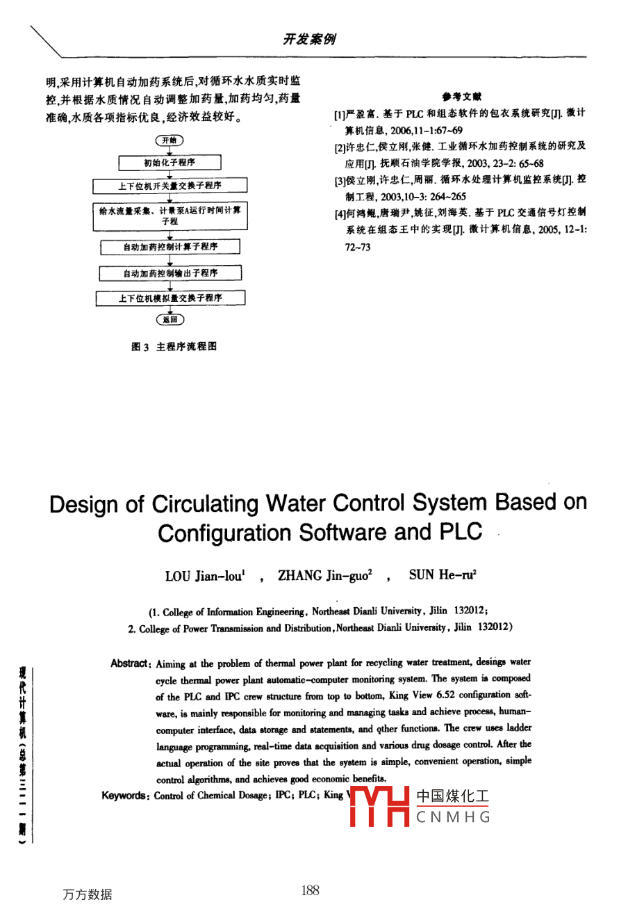 開發(fā)案例基于PLC與組態(tài)軟件的熱電廠循環(huán)水控制系統(tǒng)設(shè)計婁建樓張金果孫和茹(1.東北電力大學(xué)信息工程學(xué)院,吉林13012;2東北電力大學(xué)輸變電技術(shù)學(xué)院吉林132012)要:針對熱電廠循環(huán)水的處理問題設(shè)計熱電廠循壞水自動加藥計算機監(jiān)控系統(tǒng)。本系魷用IPC和PLC組咸的上下位機結(jié)構(gòu)上位機采用組態(tài)王652組態(tài)軟件,主要承擔(dān)監(jiān)測和管理任務(wù),實現(xiàn)工藝流程顯示、人機交互界面、數(shù)據(jù)存儲及報表等功能。下位機使用梯形圖語言編程,進(jìn)行實時數(shù)據(jù)采集和各種藥品的投加控制。經(jīng)過現(xiàn)場實際運行證明,該系魷結(jié)構(gòu)簡單、操作方便、控制算法簡單實用,取得了良好的經(jīng)濟(jì)效益關(guān)鍵詞:加藥控制;IPC;PLC;組態(tài)王0引曹水加藥量更好地控制循環(huán)水品質(zhì)的目的。上位機采在熱力發(fā)電的生產(chǎn)過程中循環(huán)水系統(tǒng)占有重要用研華工控機PC610CPU為P430512M內(nèi)存的地位,良好的水質(zhì)對延長生產(chǎn)設(shè)備的使用壽命降160G硬盤128M顯存,19英寸液晶顯示器。上位監(jiān)控軟件采用亞控652版組態(tài)王256點運行組態(tài)軟件負(fù)低能耗,提高經(jīng)濟(jì)效益具有重要意義。對循環(huán)水的處理主要依靠投加緩蝕阻垢劑和非氧化殺菌劑這兩種責(zé)加藥系統(tǒng)監(jiān)控界面顯示數(shù)據(jù)處理、保存、信息交流藥劑來完成。傳統(tǒng)的加藥方式存在很多弊端,例如所等。上位機通過 HOSTLINK通信協(xié)議,與PLC進(jìn)行雙向數(shù)據(jù)交流。上位機可讀取PC采集的模擬量數(shù)字加藥劑量不能隨循環(huán)水系統(tǒng)中水質(zhì)的變化而變化,也不能保證所加藥劑量既準(zhǔn)確又經(jīng)濟(jì)。為此本文介紹某量信號可輸出模擬量及開關(guān)量控制信號給PC。上熱電廠自動加藥改造工程控制系統(tǒng)的設(shè)計與實現(xiàn)。以位軟件可對加藥實行遠(yuǎn)程手動CRT操作及遠(yuǎn)程自PLC為主體的控制系統(tǒng)與單片機、牛頓數(shù)據(jù)采集模塊動、就地手動CRT的全程監(jiān)控,具有歷史曲線、報表、相比具有運行穩(wěn)定可靠控制功能強網(wǎng)絡(luò)化等優(yōu)點報警等界面。主監(jiān)控界面如圖2所示成為工業(yè)控制應(yīng)用的主流。本工程采用 OMRON公司c][打印機的C系列CPM2A型可編程控制器,及上位工控機組成控制系統(tǒng)。上位機監(jiān)控軟件采用北京亞控科技發(fā)展有限公司的652組態(tài)王,實現(xiàn)對加藥系統(tǒng)的過程監(jiān)控現(xiàn)場儀表]「現(xiàn)場儀計量泵A計量泵B及數(shù)據(jù)處理。管路代1循環(huán)水自動加藥控制系統(tǒng)的軟硬件部分圖1循環(huán)水處理計算機監(jiān)控系統(tǒng)配置自動加藥控制系統(tǒng)由上位機、PC控制器、測量/儀表控制器打印機等組成系統(tǒng)構(gòu)架如圖1所示12PLC控制單元1.1監(jiān)控系統(tǒng)PLC控制單元是自動控制的核心部分,負(fù)責(zé)輸監(jiān)控系統(tǒng)設(shè)計遠(yuǎn)程全自動程控操作遠(yuǎn)方控制操入、輸出及全自動控制算法的運算,選用的是60點的作就地盤柜硬操作三種控制方式達(dá)到自動調(diào)節(jié)循環(huán)ORMON CPM2A PLC,掃描時間小于1.25m6,100%布爾1<目右時聞中斷、輸入濾波時間設(shè)中國煤化工收稿日期:2009-12-01修稿日期:2009-12-18CNMHG期作者簡介:姜嚏樓(172-),男,吉林吉林人,工程師講師,項士研究開發(fā)案例置、過程控制、位置控制等豐富功能多種通信方式(多(1)流量比例控制站總線/現(xiàn)場總線遠(yuǎn)程I0傳感器總線/通信網(wǎng)絡(luò)等)根據(jù)補水量及要求的水中藥劑濃度計算出實際投藥量,再根據(jù)計量泵量程換算成計量泵的運行時間,進(jìn)行連續(xù)投藥。計量泵B的運行時間T可由下式循環(huán)自動加藥系統(tǒng)確定:TB(Iw MCBMe(2)式中,T為補水量累計時間,M為補水量,C為計量泵B所加藥劑質(zhì)量濃度,L4為計量泵B的量程。此方案只考慮了補水量這個主要因素對水藥比的影響,對指標(biāo)要求不高的場合簡便有效(2)流量電導(dǎo)比例控制根據(jù)補水量、補水與循環(huán)水電導(dǎo)率、蒸發(fā)量及濃縮倍數(shù)給出控制算法確定出投藥量,控制計量泵連續(xù)投藥。此方案比方案(1)更趨完善控制指標(biāo)高于前者圖2主監(jiān)控畫面(3)流量電導(dǎo)溫度等多參數(shù)控制2控制方案此方案考慮了多種因素對水質(zhì)的影響綜合了上該系統(tǒng)的控制任務(wù)是針對兩種藥品的投加,采用述兩種方案,同時考慮了循環(huán)水人口和出口溫度及隨季節(jié)變化的蒸發(fā)水量、失水量等因素。根據(jù)這些確定了不同的控制方案對兩個計量泵進(jìn)行控制。兩種藥品的投加量,可通過兩個計量泵的運行時間來確定。因出相應(yīng)的控制算法,而且隨季節(jié)不同可自動修正此算法,使控制指標(biāo)更加精確而該系統(tǒng)主要就是控制計量泵的運行時間。下面將分(4)手動加藥控制別介紹這兩種藥品的控制方案。可根據(jù)實際情況,由人工通過鍵盤或鼠標(biāo)隨時21非氧化殺菌劑投加控制方案非氧化殺菌劑的投加與季節(jié)及環(huán)境溫度的變化啟動加藥泵,控制藥劑的投加時間和投加量。上述4種控制方案可任意切換。密切相關(guān)需依據(jù)不同情況