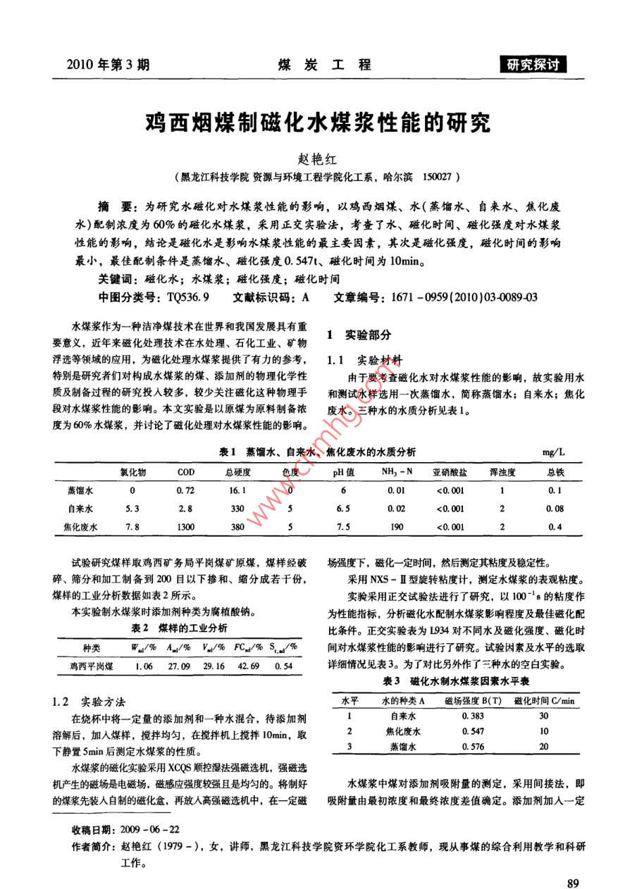 2010年第3期煤炭工程研究探討雞西煙煤制磁化水煤漿性能的研究趙艷紅(黑龍江科技學院資源與環(huán)境工程學院化工系,哈爾濱150027)摘要:為研究水磁化對水煤漿性能的影響,以雞西煙煤、水(蒸餾水、自來水、焦化廢水)配制濃度為60%的磁化水煤漿,采用正交實驗法,考查了水、磁化時間、磁化強度對水煤漿性能的影響,結(jié)論是磁化水是影響水煤漿性能的最主要因素,其次是磁化強度,磁化時間的影響最小,最佳配制條件是蒸餾水、磁化強度0.547、磁化時間為10min關(guān)鍵詞:磁化水;水煤漿;磁化強度;磁化時間中圖分類號:TQ536.9文獻標識碼:A文章編號:1671-0959(2010)03008903水煤漿作為一種潔凈煤技術(shù)在世界和我國發(fā)展具有重1實驗部分要意義,近年來磁化處理技術(shù)在水處理、石化工業(yè)、礦物浮選等領(lǐng)域的應(yīng)用,為磁化處理水煤漿提供了有力的參考,1.1實驗材料特別是研究者們對構(gòu)成水煤漿的煤、添加劑的物理化學性由于要考查磁化水對水煤漿性能的影響,故實驗用水質(zhì)及制備過程的研究投入較多,較少關(guān)注磁化這種物理手和測試水樣選用一次蒸餾水,簡稱蒸餾水;自來水;焦化段對水煤漿性能的影響。本文實驗是以原煤為原料制備濃廢水。三種水的水質(zhì)分析見表1。度為60%水煤漿,并討論了磁化處理對水煤漿性能的影響表1蒸餾水、自來水、焦化廢水的水質(zhì)分析mg/L氯化物總硬度色度pH值H3-N亞硝酸鹽渾濁度總鐵蒸餾水72<0.001自來水055焦化廢水7.50.0012試驗研究煤樣取雞西礦務(wù)局平崗煤礦原煤,煤樣經(jīng)破場強度下,磁化一定時間,然后測定其粘度及穩(wěn)定性碎、篩分和加工制備到200目以下?lián)胶?、縮分成若干份采用NXS-Ⅱ型旋轉(zhuǎn)粘度計,測定水煤漿的表觀粘度。煤樣的工業(yè)分析數(shù)據(jù)如表2所示。實驗采用正交試驗法進行了研究,以100-6的粘度作本實驗制水煤漿時添加劑種類為腐植酸鈉。為性能指標,分析磁化水配制水煤漿影響程度及最佳磁化配表2煤樣的工業(yè)分析比條件。正交實驗表為L934對不同水及磁化強度、磁化時種類W/%A』/%V%F%S』%間對水煤漿性能的影響進行了研究。試驗因素及水平的選取雞西平崗煤1.0627.0929.1642.690.54詳細情況見表3。為了對比另外作了三種水的空白實驗。表3磁化水制水煤漿因素水平表1.2實驗方法水平水的種類A磁場強度B(T)磁化時間C/min在燒杯中將一定量的添加劑和一種水混合,待添加劑0.383溶解后,加入煤樣,攪拌均勻,在攪拌機上攪拌10min,取焦化廢水下靜置5min后測定水煤漿的性質(zhì)。蒸餾水水煤漿的磁化實驗釆用XCQS順控濕法強磁選機,強磁選機產(chǎn)生的磁場是電磁場,磁感應(yīng)強度較強且是均勻的。將制好水煤漿中煤對添加劑吸附量的測定,采用間接法,即的煤漿先裝入自制的磁化盒,再放入高強磁選機中,在一定磁吸附量由最初濃度和最終濃度差值確定。添加劑加入一定收稿日期:2009-06-22作者簡介:趙艷紅(1979-),女,講師,黑龍江科技學院資環(huán)學院化工系教師,現(xiàn)從事煤的綜合利用教學和科研工作。研究探討煤炭工程2010年第3期體積的水中,最初濃度可定,水煤漿用離心機離心分離至分析結(jié)果列入表4中。上層澄清為止,取一定量的上層清液作為待測液由正交試驗的方差分析可以看出,不同水對磁化水配配置一系列標準濃度的添加劑溶液,用分光光度計確制水煤漿的性能有顯著影響,而磁化時間和磁場強度的影定峰位,繪制成標準曲線。對處理過的添加劑溶液用分光響不顯著。而且從方差比來看,磁化時間對水煤漿性能的光度計測定添加劑溶液的吸光度,再在標準曲線上對應(yīng)查影響很小,因此,將磁化時間歸為誤差列,重新對正交試出溶液濃度,并進行含量計算。驗結(jié)果進行方差分析,分析結(jié)果見表5。由這個方差分析可以看出,不同水和磁感應(yīng)強度對磁實驗結(jié)果與討論化水配制水煤漿的性能有顯著影響。同時由方差分析可以2.1正交實驗結(jié)果與討論看出各因素對水煤漿性能的影響如圖1所示。按正交表進行磁化水煤漿實驗,并將每個試樣測定和表4磁化水配制水煤漿的正交試驗表,粘度/mPa378.40581.305980567891Ⅱ皿222333311.57263.471310.681446.771628.25098.07229.17833.91422.52y=419.27皿/k409.53425.57Sa=∑(y-y)2=139498.27極差Dl16.偏差平方和S06718.4920694.51424.35自由度廠方差V53359.2510347.26212.185830.46方差比F.15顯著性2*(0.10)0·(0.25)0*(0.25)衰5方差分析表方差來源平方和S自由度6718.49M2一20694.5110347.261*(0.25)誤差e12509.623021.32總和T139498.27從上圖(a)可分析出,較高的磁化強度雖然有利于水煤磁化對水煤漿粘度降低的影響不同,磁化自來水配制的水漿粘度的降低,但達到一個最低值后,再增加磁化強度效煤漿粘度比磁化工業(yè)廢水配制的水煤漿粘度低,說明水中果不再明顯。不同水質(zhì)磁化后影響水煤漿的性能不同,其的成分在磁場的作用下發(fā)生了變化,水質(zhì)成分多受磁場影中磁化蒸餾水配制水煤漿粘度最小,如圖(b)所示。機理是響情況也多樣,進而對水煤漿粘度影響也產(chǎn)生了多樣性。磁化使氧和氫之間結(jié)合鍵距離變長,從而降低了水溶液的磁化時間對水煤漿性能影響不顯著,為降低成本可在生產(chǎn)表面張力,使水的浸潤性提高,增加了水與煤的附著力,中選擇較短的磁化時間。使水煤漿的流動性有明顯改善,這樣測定水煤漿的粘度由上述結(jié)果