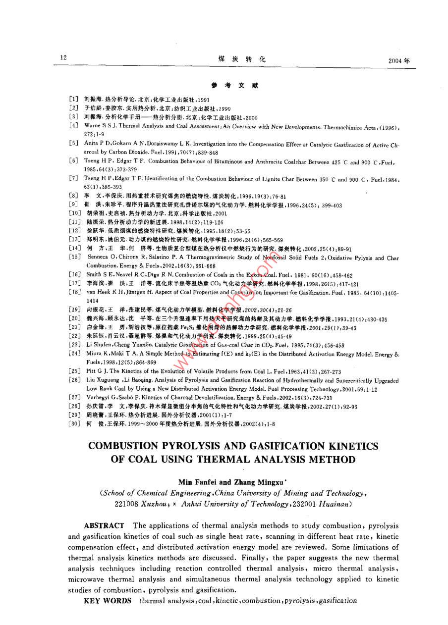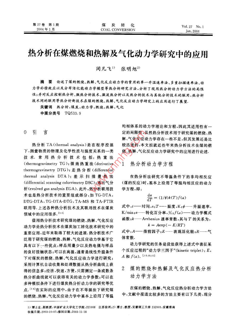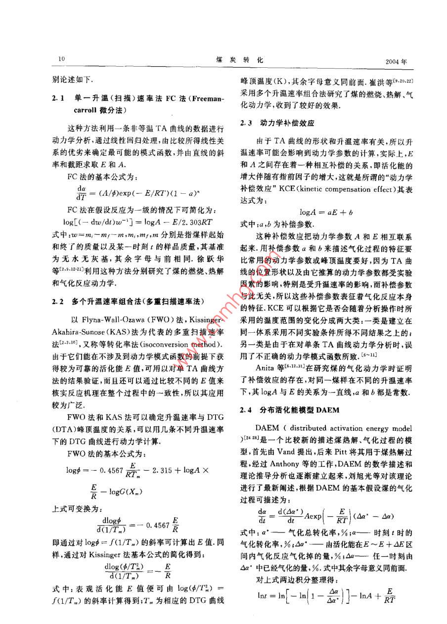 第27卷第1期煤炭轉(zhuǎn)化Vol. 27 No. 12004年1月COAL CONVERSIONJan. 2004熱分析在煤燃燒和熱解及氣化動力學(xué)研究中的應(yīng)用閔凡飛”張明 旭2>)摘要論述了謀的燃燒、熱解、氣化反應(yīng)動力學(xué)的常用的單一升溫速率法、多重掃描速率法、動力學(xué)補償效應(yīng)以及分布活化能動力學(xué)模型等熱分析研究方法,分析了現(xiàn)用熱分析動力學(xué)方法的局限性;并對反應(yīng)控制熱分析、微熱分析技術(shù)、微波熱分析以及熱分析技術(shù)與其他分析技術(shù)的聯(lián)用,熱分析技術(shù)間的聯(lián)用等熱分析新技術(shù)在煤的燃燒、熱解、氣化反應(yīng)動力學(xué)研究上的應(yīng)用進行了展望.關(guān)鍵詞熱分析,煤炭,動力學(xué),燃燒,熱解,氣化中圖分類號TQ533.9均相體系的動力學(xué)理論和方程,因此其適用性有一0引言定的局限性,雖然熱分析技術(shù)用于研究煤的燃燒、熱解、氣化反應(yīng)動力學(xué)存在-些不足,但其發(fā)展還是比熱分析TA (thermal analysis)是在程序控溫較迅速的,本文擬就近些年來熱分析技術(shù)在煤的燃下,測量物質(zhì)的物理及化學(xué)性質(zhì)與溫度關(guān)系的一類燒、熱解、氣化反應(yīng)動力學(xué)研究中的應(yīng)用進行論述.技術(shù),常用熱分析技術(shù)包括:熱重法(thermogravimetry TG); 微商熱重法(derivative1熱分析動力學(xué)方程thermogravimetry DTG);差熱分析(differentialthermal analysis DTA);差示掃描量熱法在熱分析法研究不等溫條件下的非均相反應(yīng)(differential scanning calorrimetry DSC) ;逸出氣分(煤的反應(yīng))時,基本.上沿用了等溫均相反應(yīng)的動力析(evolved gas analysis EGA).此外,熱分析聯(lián)用技學(xué)方程,即:術(shù)也是熱分析技術(shù)的重要組成部分,如TG-DTA,la.= (1/4)k(T)f(a)DTG-DTA, TG-DTA-DTG, TA-MS和TA-FTIR聯(lián)用等..上述各種熱分析技術(shù)及其聯(lián)用技術(shù)在煤炭式中:t一時間,s;T--- 溫度,K;φ- 升溫 速率,領(lǐng)城中的應(yīng)用很多. [141]K/min;a- 轉(zhuǎn)化百分率,%;f(a)- -動力學(xué)模式借用熱分析技術(shù)研究煤的燃燒、熱解、氣化反應(yīng)函數(shù);k一Arrhenius 速率常數(shù),其與T的關(guān)系為:動力學(xué)是熱分析技術(shù)在煤炭加工轉(zhuǎn)化技術(shù)研究中的k= Aexp(- E/RT)重要應(yīng)用,近年來取得了較大的進展.熱分析技術(shù)廣式中:A一指前因子;E一 表觀活化能;R一 氣泛用于研究煤的燃燒、熱解、氣化反應(yīng)動力學(xué)基于它體常數(shù).具有以下一些優(yōu)點:樣品用量少以及熱電偶與樣品動力學(xué)研究的任務(wù)是設(shè)法獲得上述式中表征某的良好接觸狀態(tài);可以在高溫,通常是線性升溫條件個反應(yīng)過程的“動力學(xué)三因子”(kinetic triplet); E,下對煤炭的燃燒、熱解、氣化反應(yīng)動力學(xué)進行研究;A和f(a). (23.10111采用計算機自動收集和處理數(shù)據(jù)從熱分析曲線上獲得的信息多;經(jīng)濟,快速,方便,只需測定- .條或數(shù)條2煤的燃燒和熱解及氣化反應(yīng)熱分析熱分析曲線就可以獲得有關(guān)的動力學(xué)參數(shù);可以在動力學(xué)方法多種模擬條件下進行煤炭熱分析動力學(xué)的研究等優(yōu)點. [58)在實際的應(yīng)用中,由于在不等溫法下研究煤在煤的燃燒、熱解、氣化反應(yīng)熱分析動力學(xué)方法的燃燒、熱解、氣化反應(yīng)動力學(xué)中基本上沿用了等溫.中,文獻(xiàn)中報道比較多的方法主要有以下幾類,現(xiàn)分1)博士生、副教授,中國礦業(yè)大學(xué)化工學(xué)院221008江蘇徐州;2) 博士、教授,安徽理工大學(xué)232001,安徽淮南收稿日期:2003-10-074修回日期:2003 11-180煤炭轉(zhuǎn)化2004年別論述如下.峰頂溫度(K),其余字母意義同前面.崔洪等0°2.22.1單一 升溫(掃描)速率法FC法(Freeman-,采用多個升溫速率組合法研究了煤的燃燒、熱解、氣化動力學(xué),收到了較好的效果.carroll微分法)這種方法利用-一條非等溫TA曲線的數(shù)據(jù)進行2.3動力學(xué)補償 效應(yīng)動力學(xué)分析,通過線性回歸處理,由比較所得線性關(guān)由于TA曲線的形狀和升溫速率有關(guān),所以升系的優(yōu)劣來確定最可能的模式函數(shù),并由直線的斜溫速率可能會影響到動力學(xué)參數(shù)的計算,實際上,E率和截距求取E和A.和A之間存在著-種相互補償?shù)年P(guān)系,即活化能的FC法的基本公式為:增大伴隨有指前因子的增大,這就是所謂的“動力學(xué)das (4/p)>exp(- E/RT)(1 - a)"補償效應(yīng)”KCE(kinetic compensation eflect)其表達(dá)式為:FC法在假設(shè)反應(yīng)為一級的情況下可簡化為:logA=aE+ blog[(一dw/dl)w~門]= logA一E/2. 303RT式中:a,b為補償參數(shù).式中:w≈m;-mg-m,m;,mt,m分別是指煤樣起始這種補償效應(yīng)把動力學(xué)參數(shù)A和E相互聯(lián)系和終了的質(zhì)量以及某一時刻t的樣品質(zhì)量,其基準(zhǔn)起來.用補償參數(shù)a和b來描述氣化過程的特征要為無水無灰基,其余字母與前相同.徐躍華比常用的動力學(xué)參數(shù)或峰頂溫度要好,因為TA曲等1912利用這種方法分別研究了煤的燃燒、熱解線的位置形狀以及由它推算的動力學(xué)參數(shù)都受實驗和氣化反應(yīng)動力學(xué),因素的影響,特別是受升溫速率的影響,而補償參數(shù)2.2多個升溫 速率組合法(多重掃描速率法)與此無關(guān),所以這些補償參數(shù)表征著氣化反應(yīng)本身的特征.KCE可