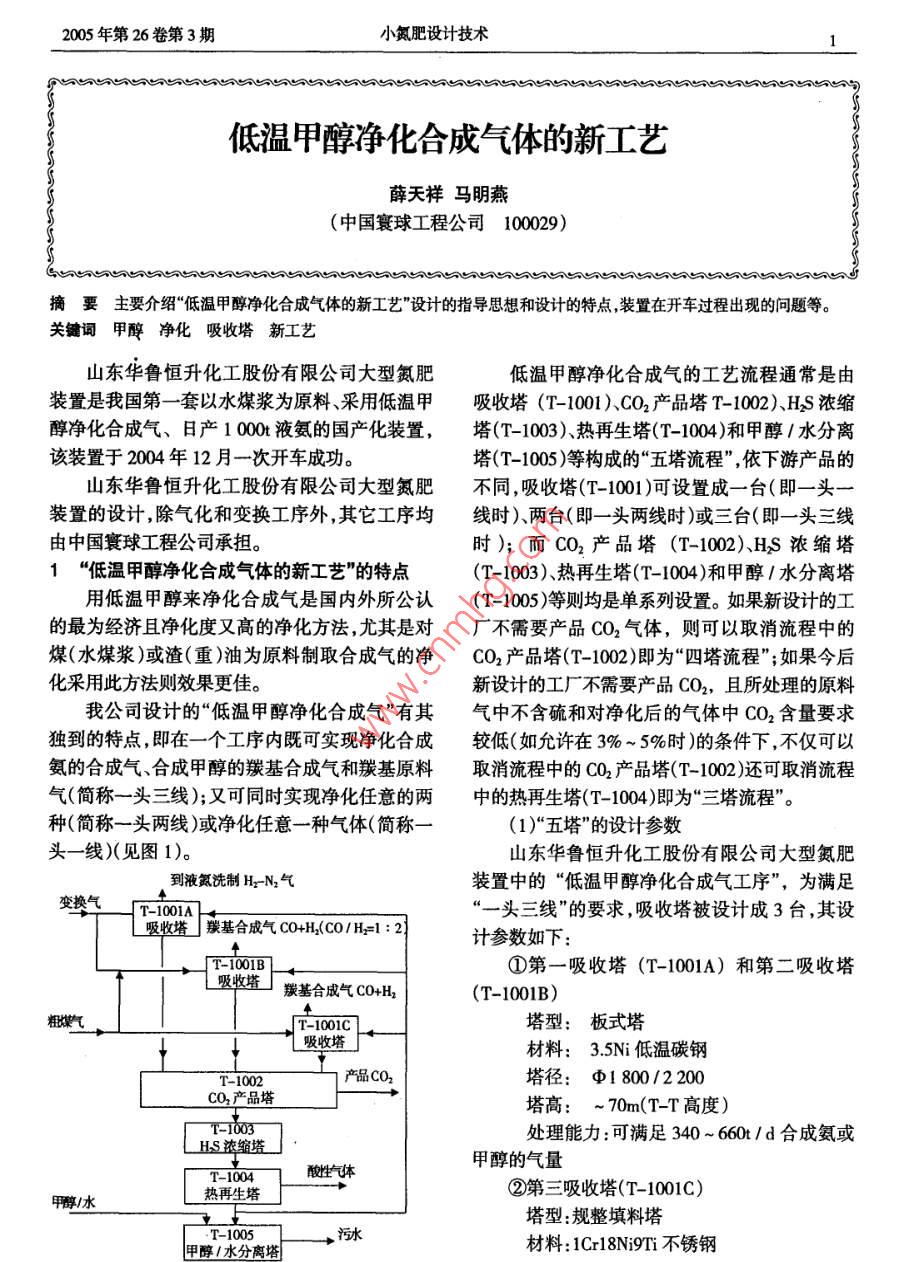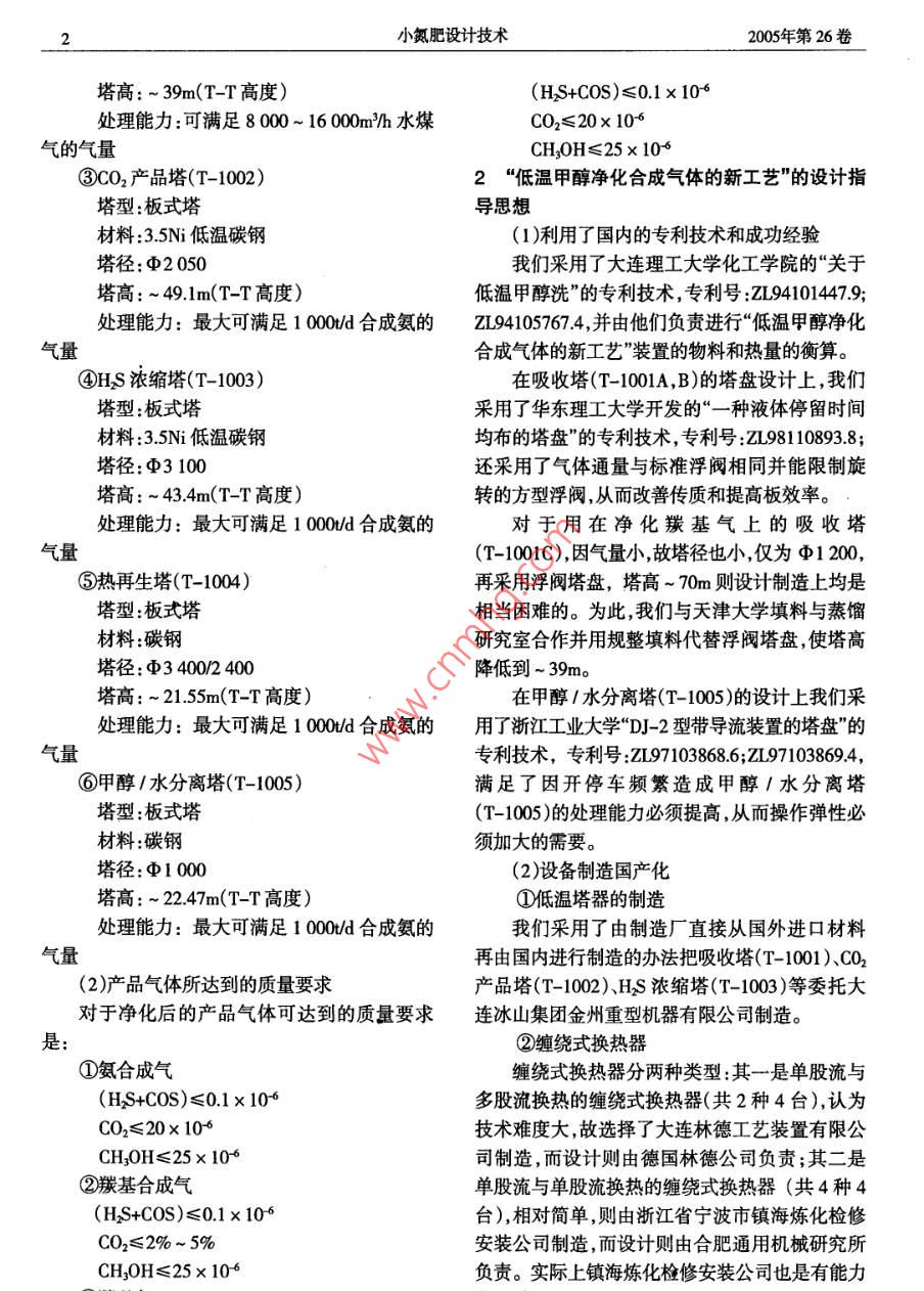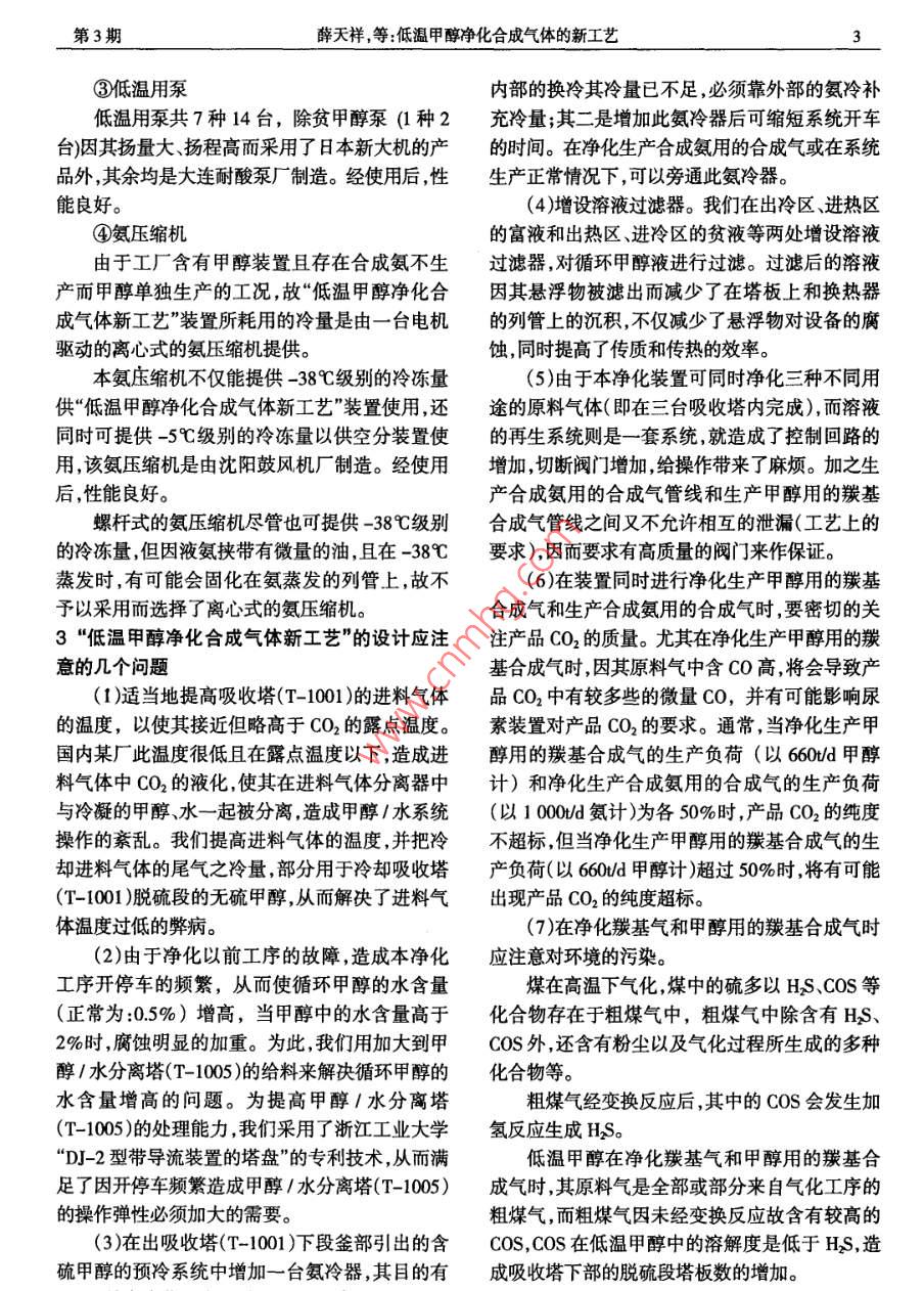 2005年第26卷第3期小氮肥設(shè)計(jì)技術(shù)s低溫甲醇凈化合成氣體的新工藝薛天祥馬明燕(中國寰球工程公司100029)摘要主要介紹“低溫甲醇凈化合成氣體的新工藝設(shè)計(jì)的指導(dǎo)思想和設(shè)計(jì)的特點(diǎn)裝置在開車過程出現(xiàn)的問題等關(guān)鍵詞甲醇凈化吸收塔新工藝山東華魯恒升化工股份有限公司大型氮肥低溫甲醇凈化合成氣的工藝流程通常是由裝置是我國第一套以水煤漿為原料、采用低溫甲吸收塔(T-1001)、CO2產(chǎn)品塔T-1002)、HS濃縮醇凈化合成氣、日產(chǎn)100液氨的國產(chǎn)化裝置,塔(T-1003)熱再生塔(T-1004)和甲醇/水分離該裝置于2004年12月一次開車成功。塔(T-1005)等構(gòu)成的“五塔流程”,依下游產(chǎn)品的山東華魯恒升化工股份有限公司大型氮肥不同,吸收塔(T-1001)可設(shè)置成一臺(即一頭裝置的設(shè)計(jì),除氣化和變換工序外,其它工序均線時)兩臺(即一頭兩線時)或三臺(即一頭三線由中國寰球工程公司承擔(dān)。時);而CO2產(chǎn)品塔(T-1002)、HS濃縮塔低溫甲醇凈化合成氣體的新工藝”的特點(diǎn)(T-1003)熱再生塔(T-1004)和甲醇/水分離塔用低溫甲醇來凈化合成氣是國內(nèi)外所公認(rèn)(-1005)等則均是單系列設(shè)置。如果新設(shè)計(jì)的工的最為經(jīng)濟(jì)且凈化度又高的凈化方法,尤其是對廠不需要產(chǎn)品CO2氣體,則可以取消流程中的煤(水煤漿)或渣(重)油為原料制取合成氣的凈CO2產(chǎn)品塔(T-1002)即為“四塔流程”;如果今后化采用此方法則效果更佳。新設(shè)計(jì)的工廠不需要產(chǎn)品CO2,且所處理的原料我公司設(shè)計(jì)的“低溫甲醇凈化合成氣”有其氣中不含硫和對凈化后的氣體中CO2含量要求獨(dú)到的特點(diǎn),即在一個工序內(nèi)既可實(shí)現(xiàn)凈化合成較低(如允許在3%~5%時)的條件下,不僅可以氨的合成氣、合成甲醇的羰基合成氣和羰基原料取消流程中的CO2產(chǎn)品塔(T-1002)還可取消流程氣(簡稱一頭三線);又可同時實(shí)現(xiàn)凈化任意的兩中的熱再生塔(T-1004)即為“三塔流程”。種(簡稱一頭兩線)或凈化任意一種氣體(簡稱1)“五塔”的設(shè)計(jì)參數(shù)頭一線)(見圖1)。山東華魯恒升化工股份有限公司大型氮肥到液氮洗制HxN2氣裝置中的“低溫甲醇凈化合成氣工序”,為滿足變換氣T-1001A一頭三線”的要求,吸收塔被設(shè)計(jì)成3臺,其設(shè)收塔」羰基合成氣CO→+H(CO/H=1:2計(jì)參數(shù)如下:T-1001B①第一吸收塔(T-1001A)和第二吸收塔吸收塔羰基合成氣CO+B(T-1001B)T-1001C塔型:板式塔吸收塔材料:3.5N低溫碳鋼T-1002塔徑:Φ1800/2200CO2產(chǎn)品塔塔高:~70m(T-T高度)處理能力:可滿足340~660/d合成氨或T1004酸性體甲醇的氣量熱再生塔②第三吸收塔(T-1001C)尊/水塔型:規(guī)整填料塔T1005材料:1Cr18NT不銹鋼小氮肥設(shè)計(jì)技術(shù)2005年第26卷塔高:~39m(T-T高度)(HS+COS)≤01×10處理能力:可滿足8000~16000mh水煤CO2≤20×106氣的氣量CH4OH≤25×106③CO2產(chǎn)品塔(T-1002)2“低溫甲醇凈化合成氣體的新工藝”的設(shè)計(jì)指塔型:板式塔導(dǎo)思想材料:35N低溫碳鋼(1)利用了國內(nèi)的專利技術(shù)和成功經(jīng)驗(yàn)塔徑:Φ2050我們采用了大連理工大學(xué)化工學(xué)院的“關(guān)于塔高:~49.1m(T-T高度)低溫甲醇洗”的專利技術(shù),專利號:ZL941014479;處理能力:最大可滿足1000合成氨的ZL941057674,并由他們負(fù)責(zé)進(jìn)行“低溫甲醇凈化氣量合成氣體的新工藝”裝置的物料和熱量的衡算。④HS濃縮塔(T-1003)在吸收塔(T-1001A,B)的塔盤設(shè)計(jì)上,我們塔型:板式塔采用了華東理工大學(xué)開發(fā)的“一種液體停留時間材料:35N低溫碳鋼均布的塔盤”的專利技術(shù),專利號:ZL98110893.8;塔徑:Φ3100還采用了氣體通量與標(biāo)準(zhǔn)浮閥相同并能限制旋塔髙:~43.4m(T-T高度)轉(zhuǎn)的方型浮閥從而改善傳質(zhì)和提高板效率。處理能力:最大可滿足1000d合成氨的對于用在凈化羰基氣上的吸收塔氣量(T-1001C),因氣量小故塔徑也小,僅為Φ1200,⑤熱再生塔(T-1004)再采用浮閥塔盤,塔高-70m則設(shè)計(jì)制造上均是塔型:板式塔相當(dāng)困難的。為此,我們與天津大學(xué)填料與蒸餾材料:碳鋼研究室合作并用規(guī)整填料代替浮閥塔盤,使塔髙塔徑:Φ34002400降低到~39m。塔高:~2155m(T-T高度)在甲醇/水分離塔(T-1005)的設(shè)計(jì)上我們采處理能力:最大可滿足1000d合成氨的用了浙江工業(yè)大學(xué)“D-2型帶導(dǎo)流裝置的塔盤”的氣量專利技術(shù),專利號:ZL971038686;ZL971038694,⑥甲醇/水分離塔(T-1005)滿足了因開停車頻繁造成甲醇/水分離塔塔型:板式塔(T-1005)的處理能力必須提高,從而操作彈性必材料:碳鋼須加大的需要。塔徑:Φ1000(2)設(shè)備制造國產(chǎn)化塔高:~22.47m(T-T高度)①低溫塔器的制造處理能力:最大可滿足1000合成氨的我們采用了由制造廠直接從國外進(jìn)口材料氣量再由國內(nèi)進(jìn)行制造的辦法把吸收塔(T-1001)、CO2(2)產(chǎn)品氣體所達(dá)到的質(zhì)量要求產(chǎn)品塔(T-1002)、HS濃縮塔(T-1003)等委托大對于凈化后的產(chǎn)品氣體可達(dá)到的質(zhì)量要求連冰山集團(tuán)金州重型機(jī)器有限公司制造。是②纏繞式換熱器①氨合成氣纏繞式換熱器分兩種類型:其一是單股流與(HS+COS)≤0.1×106多股流換熱的纏繞式換熱器(共2種4臺),認(rèn)為CO2≤20×106技術(shù)難度大,故選擇了大連林德工藝裝置有