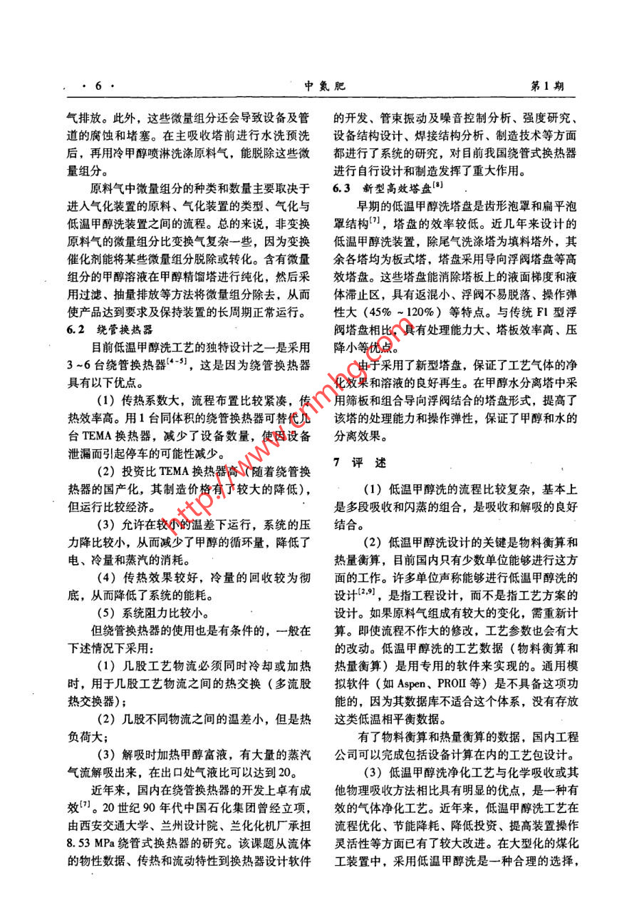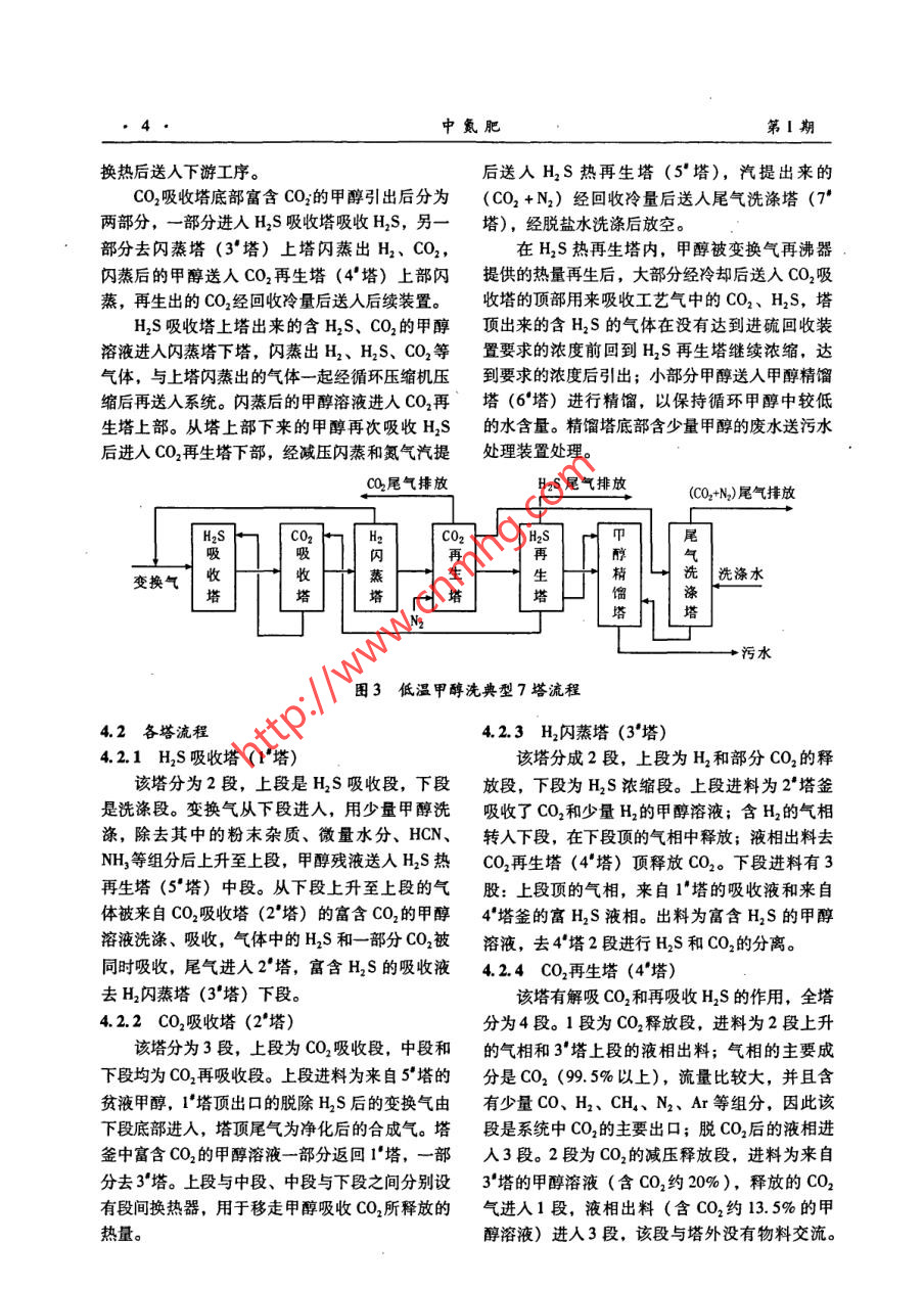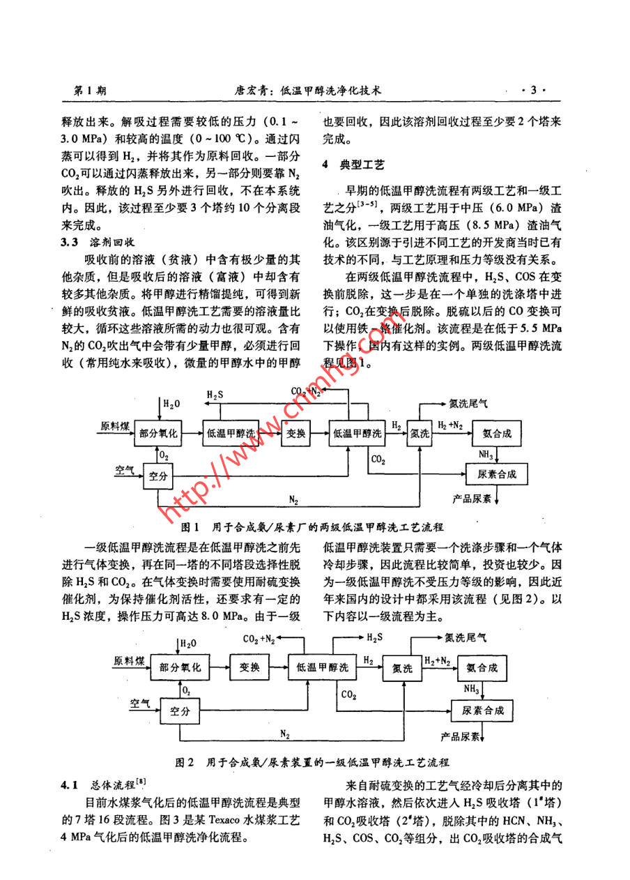 第1期中氮肥No. 12008年1月M-Sized Nitrogenous Fertilizer ProgressJan.2008類(lèi)專(zhuān)論與綜述美低溫甲醇洗凈化技術(shù)唐宏青(中國(guó)石化寧波工程公司上海公司;上海200030)[摘要] 介紹了低溫甲醇洗凈化技術(shù)的發(fā)展歷史、基本原理及流程特點(diǎn),重點(diǎn)敘述了該凈化工藝典型的7塔16段流程,提出了應(yīng)注意的問(wèn)題,并對(duì)該工藝作了評(píng)價(jià)。.[關(guān)鍵詞]低溫甲醇洗;合成氣;凈化;典型工藝[中圖分類(lèi)號(hào)] TQ113.26*4 [文獻(xiàn)標(biāo)識(shí)碼] A [文章編號(hào)] 0099200801000101LT Methanol Washing Process for Sour Gases RemovalTANG Hongqing(SNEC Shanghai Company, Shanghai 200030, China)Abstract: Following the introduction on development course, basic principle and process characteristics of LTmethanol washing process, this paper mainly focuses on the explanation of one typical process with sevencolumns and sixteen sections in total Some causions for adopting this process are presented, followed by somecomments on the process.Key Words: LT methanol washing; syngas; sour gases removal; typical process參數(shù)是有局部區(qū)別的。1概述目前工業(yè)上同時(shí)脫硫脫碳的方法很多,其中煤氣化后產(chǎn)生的合成氣中除含有H2、CO .冷法以低溫甲醇洗法Rectisol 為代表[2-59],熱法外,還含有一定量的其他組分,主要是H2S、以聚乙二醇二甲醚法Selexol(即國(guó)內(nèi)的NHD)COS等硫化物和CO2。H2S含量的高低由原料煤工藝最有利(6-7]。這2種氣體凈化方法已經(jīng)成為含硫量決定,CO2含量的高低由煤氣化方法和工以化工裝置為目標(biāo)的大中型煤氣化后合成氣凈化藝條件決定[如果采用粉煤氣化技術(shù),合成氣的主要方法,其工藝流程經(jīng)過(guò)幾十年的發(fā)展已日中CO2含量較低(2% ~4%);如果采用水煤漿趨完善,已經(jīng)有了基本固定的模式。但隨著原料氣化技術(shù),合成氣中的CO2含量較高(8% ~氣的組成、壓力等工藝條件的變化,其工藝流程12%)]。合成氣作為原料進(jìn)-步使用前,必須應(yīng)該做- -些相應(yīng)的改變。進(jìn)行凈化處理,脫除其中的H2S和CO2。凈化的近年來(lái),隨著我國(guó)煤化工熱潮的掀起,上述方法多種多樣,不同的使用目的應(yīng)該采用不同的2種氣體凈化方法被大量采用,特別是在大規(guī)模凈化方法。選擇合理的凈化方法,著眼點(diǎn)在于節(jié)的煤氣化工藝后基本上都采用低溫甲醇洗。但省能耗和投資。分別以化工裝置(制氫、合成是,多年來(lái)一個(gè)不可否認(rèn)的事實(shí)是:這2種凈化氨、甲醇、合成油)、燃?xì)?城市煤氣氣、技術(shù)均源于國(guó)外。低溫甲醇洗技術(shù)需要向國(guó)外支ICCC)、多聯(lián)產(chǎn)為目標(biāo)的凈化裝置的流程和工藝付專(zhuān)利費(fèi),而NHD技術(shù)卻不需要支付這項(xiàng)費(fèi)用。國(guó)內(nèi)的NHD技術(shù)因?yàn)橛泄I(yè)試驗(yàn)裝置的支持,[收稿日期] 2007.0909[作者簡(jiǎn)介]唐宏青(1941-),男,上海人,教授級(jí)高工,中因此把NHD技術(shù)看作是自主知識(shí)產(chǎn)權(quán)是有道理的;而低溫甲醇洗技術(shù)在國(guó)內(nèi)缺乏工業(yè)試驗(yàn)裝置國(guó)石化集團(tuán)蘭州設(shè)計(jì)院原副總工程師。中氮肥第1期的支持,只有模擬計(jì)算技術(shù),這就使其自主知識(shí)CO2、H,S甲醇的物化性質(zhì),并測(cè)定了部分二元對(duì)產(chǎn)權(quán)的說(shuō)法備受懷疑,這是一-件非常遺憾的事。的相平衡常數(shù),為進(jìn)行工藝計(jì)算奠定了基礎(chǔ);在中實(shí)際上,模擬技術(shù)也是技術(shù),靠模擬技術(shù)設(shè)計(jì)化國(guó)石化總公司和蘭州設(shè)計(jì)院的組織下,大連理工大工裝置也不乏先例。只要模擬技術(shù)可靠,再加上學(xué)經(jīng)過(guò)多年的不懈努力,完成了SAPROSS中的低完善的工程放大技術(shù),工藝包設(shè)計(jì)是能夠成功溫甲醇洗系統(tǒng)計(jì)算軟件,該軟件在國(guó)內(nèi)幾家化肥廠的。吸收和解吸是低溫甲醇洗法的基本理論和方低溫甲醇洗裝置的標(biāo)定、瓶頸分析、增產(chǎn)改造方案法,溶劑是甲醇,溶質(zhì)是CO2、HS和H2等,根確定中發(fā)揮了很大的作用。據(jù)這個(gè)原理,模擬出吸收-解吸的多塔流程,應(yīng)隨著研究工作的進(jìn)展和對(duì)生產(chǎn)操作中暴露出的該屬于自主開(kāi)發(fā)的技術(shù),也是可以申請(qǐng)專(zhuān)利的問(wèn)題的處理,使引進(jìn)的低溫甲醇洗工藝不斷得到改(已有類(lèi)似的先例)。如果國(guó)內(nèi)的設(shè)計(jì)單位有足進(jìn)和完善。國(guó)內(nèi)已經(jīng)有幾個(gè)單位采用模擬技術(shù)完成夠的勇氣努力完成這樣的工藝包設(shè)計(jì)并且付諸工了低溫甲醇洗的工藝包改造,當(dāng)然,隨之的工程設(shè)程實(shí)踐,就沒(méi)有理由認(rèn)為低溫甲醇洗工藝沒(méi)有自計(jì)也應(yīng)該能順利完成。在完成現(xiàn)有裝置的擴(kuò)能改造主知識(shí)產(chǎn)權(quán)。后,能夠有針對(duì)性地獨(dú)立設(shè)計(jì)新流程,因此可以認(rèn)為低溫甲醇洗技術(shù)在國(guó)內(nèi)已經(jīng)成熟。2發(fā)展歷史低溫甲醇洗凈化技術(shù)是20世紀(jì)50年代初林3基本原理德公司和魯奇公司聯(lián)合開(kāi)發(fā)的適用于處理含高濃低溫甲醇洗工藝用冷甲醇作為吸收溶劑,利度酸性氣體的凈化工藝。1954 年首先用于煤加用低溫下酸性氣體在甲醇中溶解度比較大的特性壓氣化后的