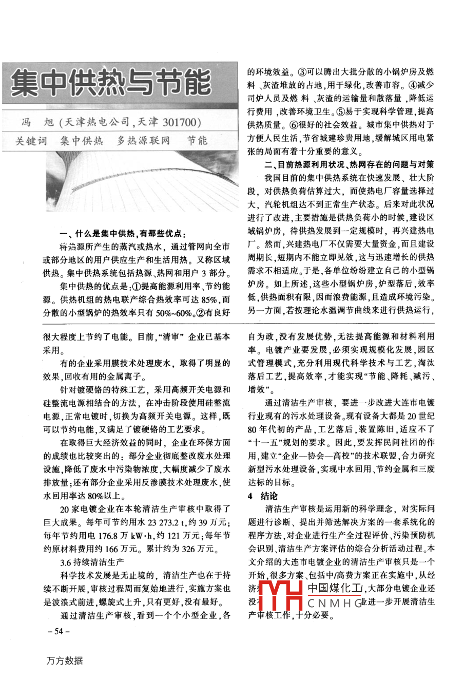 集中供熱與節(jié)能的環(huán)境效益。③可以騰出大批分散的小鍋爐房及燃料、灰渣堆放的占地,用于綠化,改善市容。④減少司爐人員及燃料、灰渣的運(yùn)輸量和散落量,降低運(yùn)行費(fèi)用,改善環(huán)境衛(wèi)生。⑤易于實(shí)現(xiàn)科學(xué)管理,提高馮旭(天津熱電公司,天津301700)供熱質(zhì)量。⑥很好的社會(huì)效益。城市集中供熱對(duì)于關(guān)鍵詞集中供熱多熱源聯(lián)網(wǎng)節(jié)能方便人民生活,節(jié)省城建珍貴用地,緩解城區(qū)用電緊張的局面有著十分重要的意義。二、目前熱源利用狀況、熱網(wǎng)存在的問(wèn)題與對(duì)策我國(guó)目前的集中供熱系統(tǒng)在快速發(fā)展、壯大階段,對(duì)供熱負(fù)荷估算過(guò)大,而使熱電廠容量選擇過(guò)大,汽輪機(jī)組達(dá)不到正常生產(chǎn)狀態(tài)。后來(lái)對(duì)此狀況進(jìn)行了改進(jìn),主要措施是供熱負(fù)荷小的時(shí)候,建設(shè)區(qū)什么是集中供熱,有那些優(yōu)點(diǎn)域鍋爐房,待供熱發(fā)展到一定規(guī)模時(shí),再興建熱電將熱源所產(chǎn)生的蒸汽或熱水,通過(guò)管網(wǎng)向全市廠。然而,興建熱電廠不僅需要大量資金,而且建設(shè)或部分地區(qū)的用戶供應(yīng)生產(chǎn)和生活用熱。又稱區(qū)域周期長(zhǎng),短期內(nèi)不能立即見(jiàn)效,這與迅速增長(zhǎng)的供熱供熱。集中供熱系統(tǒng)包括熱源、熱網(wǎng)和用戶3部分。需求不相適應(yīng)于是,各單位紛紛建立自己的小型鍋集中供熱的優(yōu)點(diǎn)是①提高能源利用率、節(jié)約能妒房。如上所述,這些小型鍋爐房,爐型落后,效率源。供熱機(jī)組的熱電聯(lián)產(chǎn)綜合熱效率可達(dá)85%,而低供熱面積有限因而浪費(fèi)能源且造成環(huán)境污染分散的小型鍋爐的熱效率只有50%-60%②有良好另一方面若按理論水溫調(diào)節(jié)曲線來(lái)進(jìn)行供熱運(yùn)行,很大程度上節(jié)約了電能。目前,“清審”企業(yè)已基本自為政,沒(méi)有發(fā)展優(yōu)勢(shì),無(wú)法提高能源和材料利用采用。率。電鍍產(chǎn)業(yè)要發(fā)展,必須實(shí)現(xiàn)規(guī)?;l(fā)展,園區(qū)有的企業(yè)采用膜技術(shù)處理廢水,取得了明顯的式管理模式,充分利用現(xiàn)代科學(xué)技術(shù)與工藝,淘汰效果,回收有用的金屬離子。落后工藝,提高效率,才能實(shí)現(xiàn)“節(jié)能、降耗、減污、針對(duì)鍍硬鉻的特殊工藝,采用高頻開(kāi)關(guān)電源和增效”。硅整流電源相結(jié)合的方法,在沖擊階段使用硅整流通過(guò)清潔生產(chǎn)審核,要進(jìn)一步改進(jìn)大連市電鍍電源,正常電鍍時(shí),切換為高頻開(kāi)關(guān)電源。這樣,既行業(yè)現(xiàn)有的污水處理設(shè)備?,F(xiàn)有設(shè)備大都是20世紀(jì)以節(jié)約電能,又滿足了鍍硬鉻的工藝要求。80年代初的產(chǎn)品,工藝落后,裝置陳舊,適應(yīng)不了在取得巨大經(jīng)濟(jì)效益的同時(shí),企業(yè)在環(huán)保方面“十一五”規(guī)劃的要求。因此,要發(fā)揮民間社團(tuán)的作的成績(jī)也比較突出的:部分企業(yè)徹底整改廢水處理用,建立“企業(yè)一協(xié)會(huì)一高?!钡募夹g(shù)聯(lián)盟,合力研究設(shè)施,降低了廢水中污染物濃度,大幅度減少了廢水新型污水處理設(shè)備,實(shí)現(xiàn)中水回用、節(jié)約金屬和三廢排放量;還有部分企業(yè)采用反滲膜技術(shù)處理廢水,使達(dá)標(biāo)的目標(biāo)水回用率達(dá)80%以上。4結(jié)論20家電鍍企業(yè)在本輪清潔生產(chǎn)審核中取得了清潔生產(chǎn)審核是運(yùn)用新的科學(xué)理念,對(duì)實(shí)際問(wèn)巨大成果。每年可節(jié)約用水23273.2t,約39萬(wàn)元;題進(jìn)行診斷、提出并篩選解決方案的一套系統(tǒng)化的每年節(jié)約用電1768萬(wàn)kWh,約121萬(wàn)元;每年節(jié)程序方法,對(duì)企業(yè)進(jìn)行生產(chǎn)全過(guò)程評(píng)價(jià)、污染預(yù)防機(jī)約原材料費(fèi)用約166萬(wàn)元。累計(jì)約為326萬(wàn)元。會(huì)識(shí)別、清潔生產(chǎn)方案評(píng)估的綜合分析活動(dòng)過(guò)程。本3.6持續(xù)清潔生產(chǎn)文介紹的大連市電鍍企業(yè)的清潔生產(chǎn)審核只是一個(gè)科學(xué)技術(shù)發(fā)展是無(wú)止境的,清潔生產(chǎn)也在于持開(kāi)始,很多方案、包括中高費(fèi)方案正在實(shí)施中,從經(jīng)續(xù)不斷開(kāi)展,審核過(guò)程周而復(fù)始地進(jìn)行,實(shí)施方案也濟(jì)中國(guó)煤化工,大部分電鍍企業(yè)還是波浪式前進(jìn)螺旋式上升,只有更好沒(méi)有最好。沒(méi)CNMH碰業(yè)進(jìn)一步開(kāi)展清潔生通過(guò)清潔生產(chǎn)審核,看到一個(gè)個(gè)小型企業(yè),各產(chǎn)審核工作,十分必要2007年第二期(第23卷第97期)在有些地區(qū)會(huì)造成室溫過(guò)高而浪費(fèi)熱量。例如,某熱源同時(shí)運(yùn)行,運(yùn)行人員則可通過(guò)調(diào)整多熱源的水市,當(dāng)室外溫度為-19℃時(shí),其實(shí)際供回水溫度分別流量及供熱量,達(dá)到全網(wǎng)供熱效果一致的目的。同為83/52℃,混水后二次網(wǎng)供回水溫度為69/52℃,時(shí),環(huán)狀管網(wǎng)還具有自動(dòng)優(yōu)化水力工況的特殊功能,而在設(shè)計(jì)中,供回水溫度是按95/0℃來(lái)設(shè)計(jì)的,這可改善系統(tǒng)中最不利環(huán)路