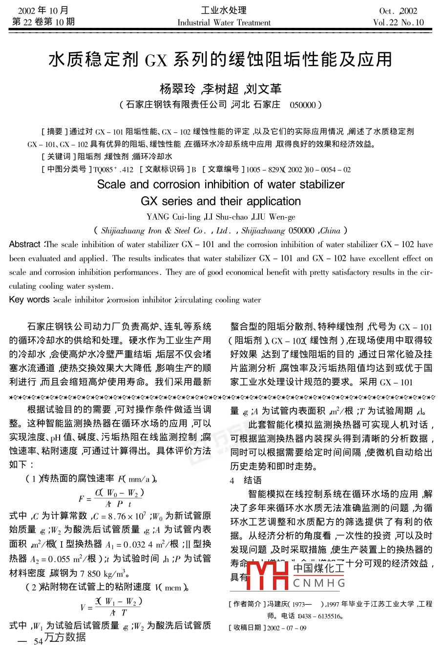 2002年10月工業(yè)水處理Oct.2002第22卷第10Industrial Water TreatmentVol 22自動(dòng)監(jiān)測(cè)系統(tǒng)在循環(huán)水場(chǎng)的應(yīng)用馮建慶中國石油前郭石化分公司吉林松原138008)[摘要]在循環(huán)水場(chǎng)安裝智能模擬監(jiān)測(cè)換熱器這種換熱器利用冷卻水旁踣對(duì)其傳熱面下旳腐蝕、結(jié)垢和積污情況進(jìn)行監(jiān)測(cè)。其監(jiān)測(cè)結(jié)果為循環(huán)水工藝調(diào)整和水質(zhì)配方的篩選提供了依據(jù)。關(guān)鍵詞]監(jiān)測(cè)換熱器循環(huán)水自動(dòng)監(jiān)測(cè)[中圖分類號(hào)]mQ56[文獻(xiàn)標(biāo)識(shí)碼]B[文章編號(hào)]1005-829X2002)0-0053-02隨著石油、化工、紡織、冶金工業(yè)的蓬勃發(fā)展大理便于操作(2阻合合理安裝拆卸方便便于維型循環(huán)冷卻水系統(tǒng)的使用也越來越廣泛由此引起修〔3洎自動(dòng)控制信號(hào)清晰直觀性強(qiáng)(4)系統(tǒng)可冷卻水在循環(huán)系統(tǒng)中的腐蝕、結(jié)垢及積污旳矛盾也直接提供歷史走勢(shì)和實(shí)時(shí)走勢(shì)圖打印功能齊全日益突出而對(duì)循環(huán)水的腐蝕、結(jié)垢的監(jiān)測(cè)我公司(5充功能強(qiáng),可配接酸度計(jì)、電導(dǎo)儀和腐蝕測(cè)量直是以人工掛片為主很難真實(shí)反應(yīng)出換熱器的儀還可安裝腐蝕試片直接觀察腐蝕變化(6旌接實(shí)際工況。為保證循環(huán)水系統(tǒng)的正常運(yùn)行有效的微機(jī)可遠(yuǎn)程調(diào)控便于集中管理。對(duì)循環(huán)水系統(tǒng)的結(jié)垢、腐蝕等情況進(jìn)行監(jiān)測(cè)和觀察,2監(jiān)測(cè)裝置和方法我公司于2002年初在循環(huán)水場(chǎng)安裝了智能模擬監(jiān)該監(jiān)測(cè)換熱器安裝在冷卻水旁路上進(jìn)行測(cè)試,測(cè)換熱器采用的是江都建華儀器儀表廠生產(chǎn)的三用低壓飽和蒸汽做熱介質(zhì)。冷卻介質(zhì)的流量、溫度、管式智能模擬監(jiān)測(cè)換熱器。這種換熱器利用冷卻水壓力都可以測(cè)試根據(jù)獲取的參數(shù)計(jì)算岀冷卻水的旁路對(duì)其傳熱面下的的腐蝕、結(jié)垢和積污情況進(jìn)行污垢熱阻。由于換熱器本身是可拆卸的旁路安裝監(jiān)測(cè)。經(jīng)過半年的實(shí)際運(yùn)行其測(cè)試效果對(duì)于冷卻方法又便于把試驗(yàn)系統(tǒng)從運(yùn)行的冷卻水系統(tǒng)中隔離水化學(xué)處理方案的確認(rèn)和調(diào)整以及藥劑效果的評(píng)出來因此試驗(yàn)周期可以根據(jù)工藝要求而靈活決定。定是十分有效的。取出的試管根據(jù)觀察和稱量測(cè)取腐蝕、結(jié)垢和1現(xiàn)場(chǎng)安裝流程簡(jiǎn)介積污數(shù)據(jù)。此外還可以在這個(gè)試驗(yàn)旁路和監(jiān)測(cè)換主要流程見圖1。熱器的進(jìn)、出水囗水箱中置入掛片和安裝電極探頭,以測(cè)試?yán)鋮s水的腐蝕情況。垂At在流程的采用上,有3種試驗(yàn)旁路流程第1種是安裝在靠近涼水塔的循環(huán)泵供水線旁路上經(jīng)試驗(yàn)后的熱水直接排入涼水池;第2種是把旁路換熱器安裝在重點(diǎn)生產(chǎn)換熱器的旁路上并把監(jiān)測(cè)換消兩熱器的工藝條件盡可能與生產(chǎn)實(shí)際相近第3種是安裝在系統(tǒng)總回水旁路中,此時(shí)監(jiān)測(cè)換熱器的進(jìn)水冷凝水出側(cè)溫度不宜過大。我公司采用的是第1種旁路流程。這種旁路優(yōu)點(diǎn)是冷卻水壓力小、流程實(shí)用、便于圖1安裝流程示意換熱管、電測(cè)探頭和掛片的拆裝此套系統(tǒng)具有如下優(yōu)點(diǎn)(1黠結(jié)構(gòu)緊湊布局合3操作條件及評(píng)價(jià)方法具體操作條件見表1表1操作條件中國煤化工流程介質(zhì)操作壓力溫度/℃進(jìn)口CNMHG m熱管長(zhǎng)度|換熱管面積m殼程飽和蒸汽104.25l1700.0552002年10月工業(yè)水處理Oct.2002第22卷第10期Industrial Water treatmentVol. 22 No, 10水質(zhì)穩(wěn)定劑Gⅹ系列的緩蝕阻垢性能及應(yīng)用楊翠玲李樹超劉文革石家莊鋼鐵有限責(zé)任公司河北石家莊050000[摘要]通過對(duì)GX-10阻垢性能、GX-102緩蝕性能的評(píng)定以及它們的實(shí)際應(yīng)用情況闡述了水質(zhì)穩(wěn)定劑GX-101、(X-10具有優(yōu)異的阻垢、緩蝕性能在循環(huán)水冷卻系統(tǒng)中應(yīng)用取得良好的效果和經(jīng)濟(jì)效益。[關(guān)鍵詞]阻垢劑緩蝕劑楯環(huán)冷卻水[中圖分類號(hào)]T085+,412[文獻(xiàn)標(biāo)識(shí)碼]B[文章編號(hào)]005-8209X2002)0-0054-02Scale and corrosion inhibition of water stabilizerGX series and their applicationYANG Cui-ling LI Shu-chao U Wen-geShijiazhuang Iron Steel Co., Ltd., Shijiazhuang 050000, ChinaAbstract The scale inhibition of water stabilizer gx-101 and the corrosion inhibition of water stabilizer gx-1o2 havebeen evaluated and applied. The results indicates that water stabilizer gx-101 and GX-102 have excellent effect onale and corrosion inhibition performances. They are of good economical benefit with pretty satisfactory results in the cir-culating cooling water systemKey words scale inhibitor corrosion inhibitor ' circulating cooling water石家莊鋼鐵公司動(dòng)力廠負(fù)責(zé)高爐、連軋等系統(tǒng)螯合型的阻垢分散劑、特種緩蝕劑代號(hào)為GX-101的循環(huán)冷卻水的供給和處理。硬水作為工業(yè)生產(chǎn)用(阻垢劑)GX-10x緩蝕劑)在現(xiàn)場(chǎng)使用中取得較的冷卻水會(huì)使高爐水冷壁嚴(yán)重結(jié)垢垢層不僅會(h