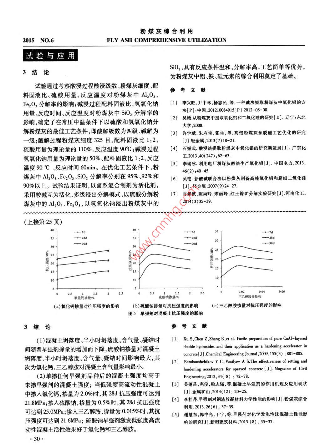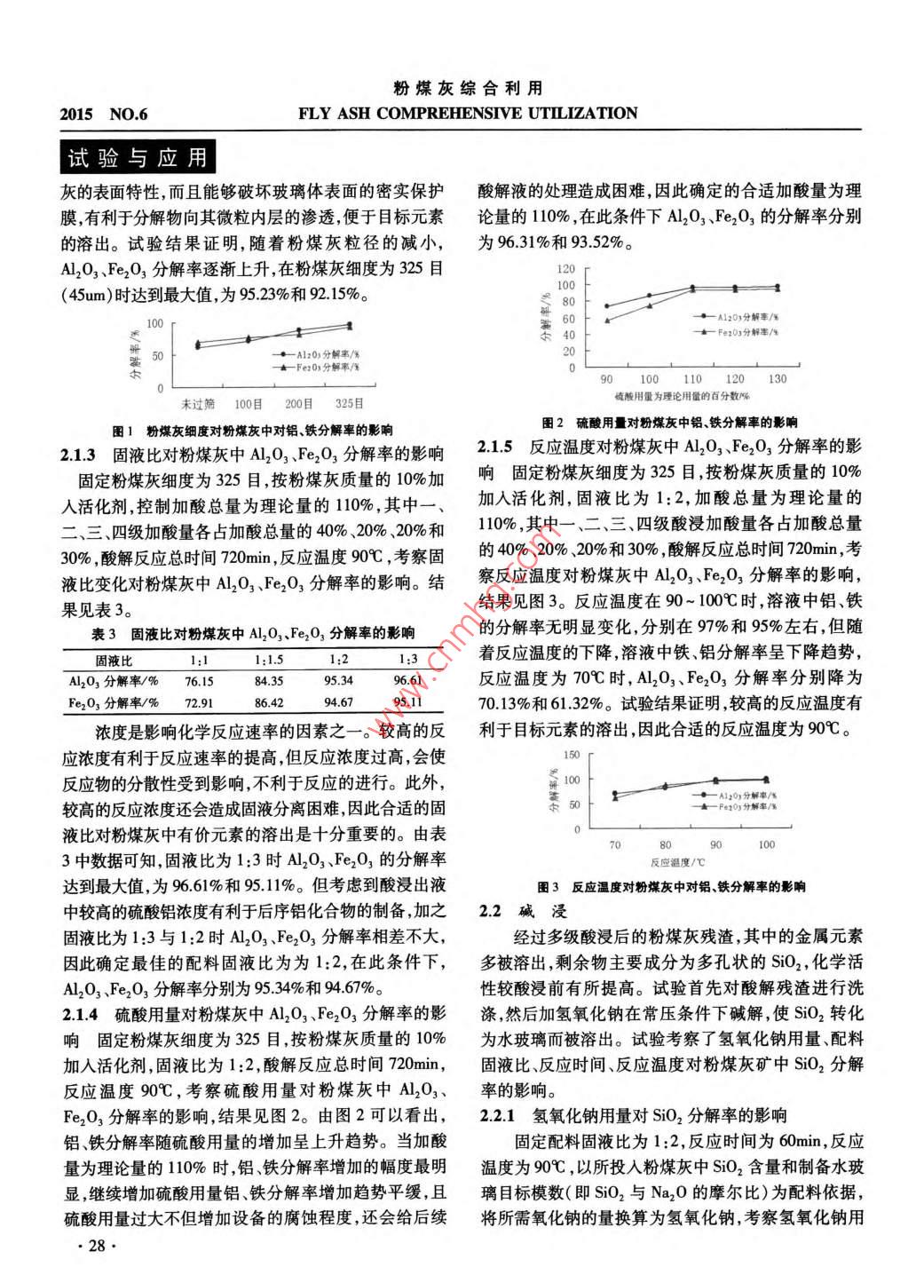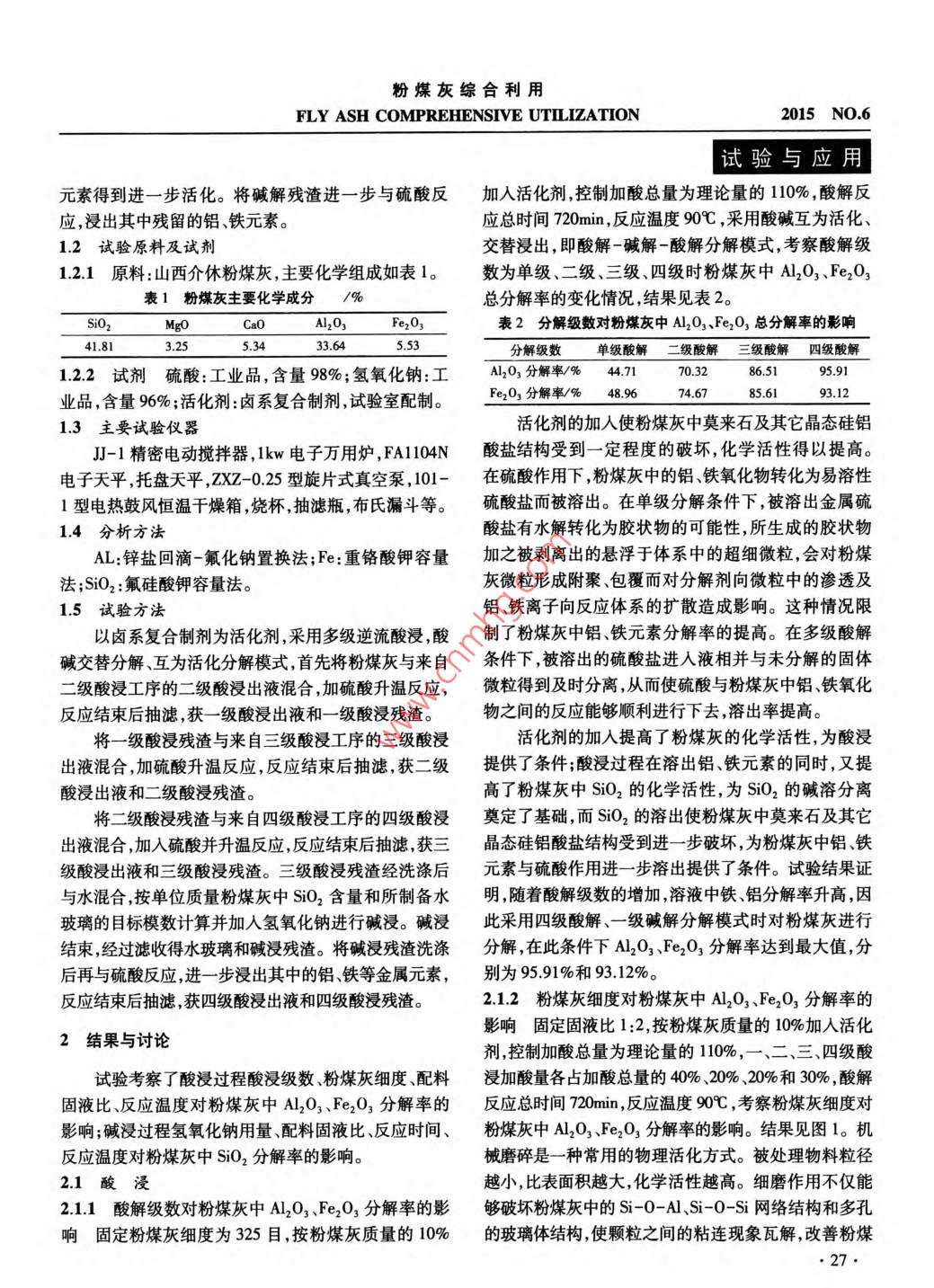 粉煤灰綜合利用2015N0.6FLY ASH COMPREHENSIVE UTILIZATION試驗(yàn)與應(yīng)用粉煤灰分解試驗(yàn)研究Research on The Decomposition Experiment of Fly Ash胡彩華,肖景波,郭捷(南陽(yáng)東方應(yīng)用化工研究所,河南南陽(yáng)473000摘要:試驗(yàn)以鹵系復(fù)合制劑為活化劑,采用酸堿交替分解,互為活化分解模式處理粉煤灰。在常壓條件下以硫酸浸出其中的鋁和鐵,以氫氧化鈉浸出其中的硅。試驗(yàn)考察了酸浸過(guò)程分解級(jí)數(shù)、粉煤灰細(xì)度、配料固液比、硫酸用量、反應(yīng)溫度對(duì)粉煤灰中Al2O3Fe2O3分解率的影響;堿浸過(guò)程氫氧化鈉用量配料固液比、反應(yīng)時(shí)間、反應(yīng)溫度對(duì)粉煤灰中SiO2分解率的影響確定了最佳優(yōu)化工藝條件。在優(yōu)化工藝條件下,A2O3、Fe2O3SiO2的分解率在95%92%和90%以上。關(guān)鍵詞:粉煤灰;分解;研究中圖分類號(hào):TQ031文獻(xiàn)標(biāo)識(shí)碼:A文章編號(hào):1005-8249(201506026-05粉煤灰是燃煤電廠等排放的固體廢棄物,也是我堿法工藝的優(yōu)點(diǎn)是鋁元素分解率相對(duì)較高,不足國(guó)排放量最大的工業(yè)固體廢渣。其主要成分是SiO2,是流程長(zhǎng),耗能高石灰石及純堿耗量大,處理成本高,Al2O3,Fe2O3和未燃盡C此外還有少量的Mg、Ti、K、且對(duì)硅鐵等元素未能綜合利用,二次殘?jiān)a(chǎn)生量大,Na、P、S的氧化物以及稀有金屬氧化物等。采用濕法經(jīng)濟(jì)與環(huán)境效益不樂(lè)觀等。冶金工藝由粉煤灰制備氧化鋁和白炭黑是粉煤灰高附酸法工藝主要優(yōu)點(diǎn)是流程簡(jiǎn)單,能耗較低,可有效加值化、精細(xì)化綜合利用的主要方向,也是近年來(lái)學(xué)術(shù)實(shí)現(xiàn)鋁、硅分離,硅組分可用于生產(chǎn)高附加值的無(wú)機(jī)硅及產(chǎn)業(yè)界研究、關(guān)注的熱點(diǎn)化合物,存在的不足是鋁分解率偏低。以氟化物(氟將粉煤灰中的有價(jià)元素分解并溶出是實(shí)現(xiàn)對(duì)其高化銨氟化鈉等)作助溶劑雖可提高鋁的溶出率但會(huì)附加值、精細(xì)化綜合利用的基礎(chǔ)和前堤。粉煤灰的物增加處理成本。如果能夠解決有價(jià)元素溶出率偏低的相組成主要有莫來(lái)石(3Al2O3·2SiO2)晶相、硅鋁酸鹽問(wèn)題酸法工藝將是一種較為理想的粉煤灰分解方法。玻璃相,其它還有石英(SO2)、赤鐵礦(Fe2O3)磁鐵為了克服己報(bào)道工藝存在的不足,尋找一條切實(shí)礦(Fe304)、剛玉(a-A2QO3)等。其中的硅和鋁主要可行的粉煤灰分解新方法,筆者以酸法工藝為基礎(chǔ),開(kāi)賦存于以Si-0-A鍵結(jié)合而成的非活性莫來(lái)石中。展了酸堿聯(lián)合法分解粉煤灰新工藝的研究。莫來(lái)石是一種鏈狀結(jié)構(gòu)硅酸鹽,常溫下既不溶于1試驗(yàn)酸,也不溶于堿,低于1200℃時(shí)性質(zhì)穩(wěn)定,受熱也不會(huì)發(fā)生分解因此,要分解、分離粉煤灰中的硅、鋁等有價(jià)1.1試驗(yàn)原理元素,首先要破壞莫來(lái)石的Si-0-Al鍵以提高其化學(xué)將粉煤灰與配料液混合,加入活化劑,再以硫酸在活性。常壓條件下對(duì)粉煤灰進(jìn)行酸浸,使其中的莫來(lái)石結(jié)構(gòu)目前己報(bào)道的粉煤灰分解方法有堿法、酸法及酸及非晶態(tài)硅酸鹽結(jié)構(gòu)受到破壞鋁、鐵等金屬元素轉(zhuǎn)化堿聯(lián)合法。堿法工藝有石灰石燒結(jié)法(、堿石灰燒結(jié)為相應(yīng)的硫酸鹽而被溶出,同時(shí)使硅的化學(xué)活性得以2、預(yù)脫硅堿石灰燒結(jié)法等,酸法主要有酸浸提高。將酸浸料漿分離,獲酸浸出液和主要成分為法法{4、硫酸銨燒結(jié)法(和酸堿聯(lián)合法°SiO2的酸浸殘?jiān)?。酸解殘?jiān)c氫氧化鈉反應(yīng),使其中的SO2分解并轉(zhuǎn)化為水玻璃而溶出,同時(shí)使酸浸過(guò)程收稿日期:2015-06-27因受鋁硅氧網(wǎng)絡(luò)聚合體的影響未被分解的鋁、鐵金屬26粉煤灰綜合利用FLY ASH COMPREHENSIVE UTILIZATION2015No.6驗(yàn)與應(yīng)用元素得到進(jìn)一步活化。將堿解殘?jiān)M(jìn)一步與硫酸反加入活化劑控制加酸總量為理論量的110%,酸解反應(yīng),浸出其中殘留的鋁鐵元素。應(yīng)總時(shí)間720min,反應(yīng)溫度90℃,.用酸堿互為活化12試驗(yàn)原料及試劑交替浸出,即酸解-堿解-酸解分解模式,考察酸解級(jí)121原料:山西介休粉煤灰,主要化學(xué)組成如表1。數(shù)為單級(jí)、二級(jí)、三級(jí)、四級(jí)時(shí)粉煤灰中A2O3、Fe2O3表1粉煤灰主要化學(xué)成分/%總分解率的變化情況,結(jié)果見(jiàn)表2。Al,203Fe,0表2分解級(jí)數(shù)對(duì)粉煤灰中Al2O3、Fe2O3總分解率的影響183.25533.645.53分解級(jí)數(shù)單級(jí)酸解二級(jí)酸解三級(jí)酸解四級(jí)酸解122試劑硫酸:工業(yè)品,含量98%;氫氧化鈉:工A2O3分解率%4.7170328519591業(yè)品,含量%6%;活化劑:鹵系復(fù)合制劑試驗(yàn)室配制。F=0分解率%48%6467856193.121.3主要試驗(yàn)儀器活化劑的加入使粉煤灰中莫來(lái)石及其它晶態(tài)硅鋁J-1精密電動(dòng)攪拌器,kw電子萬(wàn)用爐,FA14N酸鹽結(jié)構(gòu)受到一定程度的破壞化學(xué)活性得以提高。電子天平,托盤天平,ZX2-0.25型旋片式真空泵,101-在硫酸作用下粉煤灰中的鋁鐵氧化物轉(zhuǎn)化為易溶性1型電熱鼓風(fēng)恒溫干燥箱,燒杯,抽濾瓶,布氏漏斗等。硫酸鹽而被溶出。在單級(jí)分解條件下,被溶出金屬硫14分析方法酸鹽有水解轉(zhuǎn)化為膠狀物的可