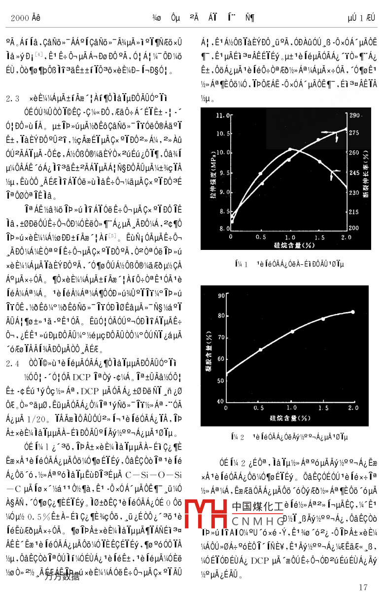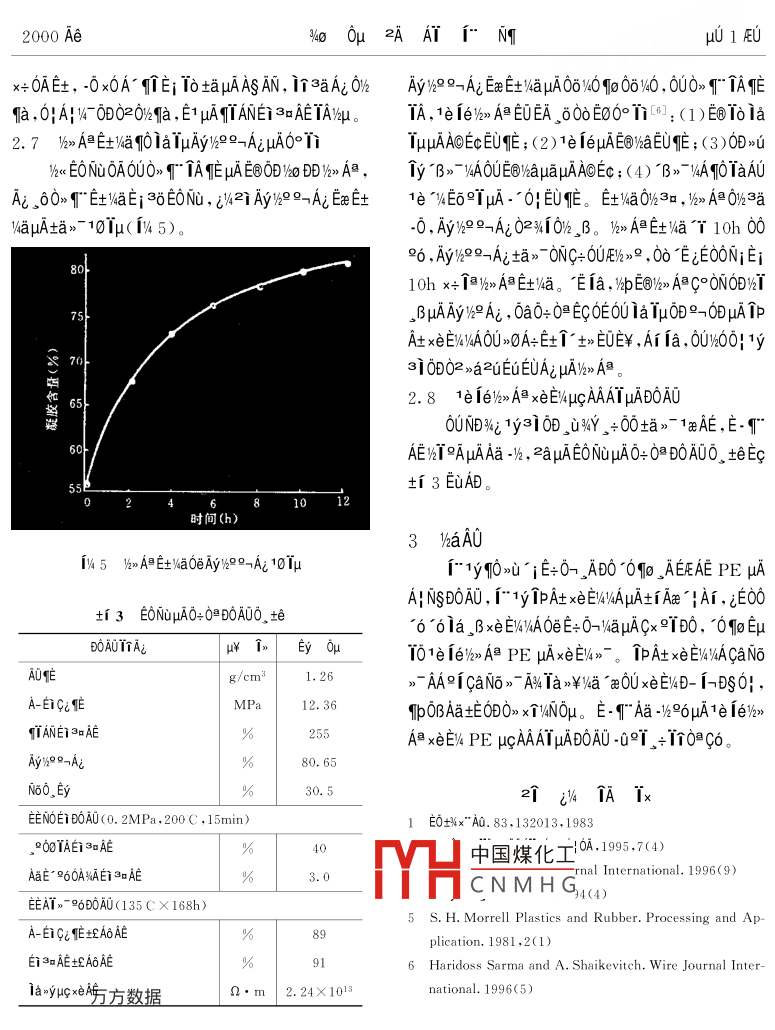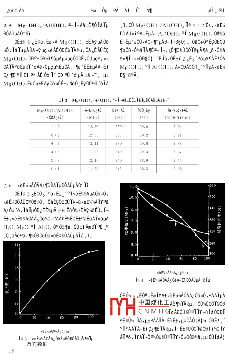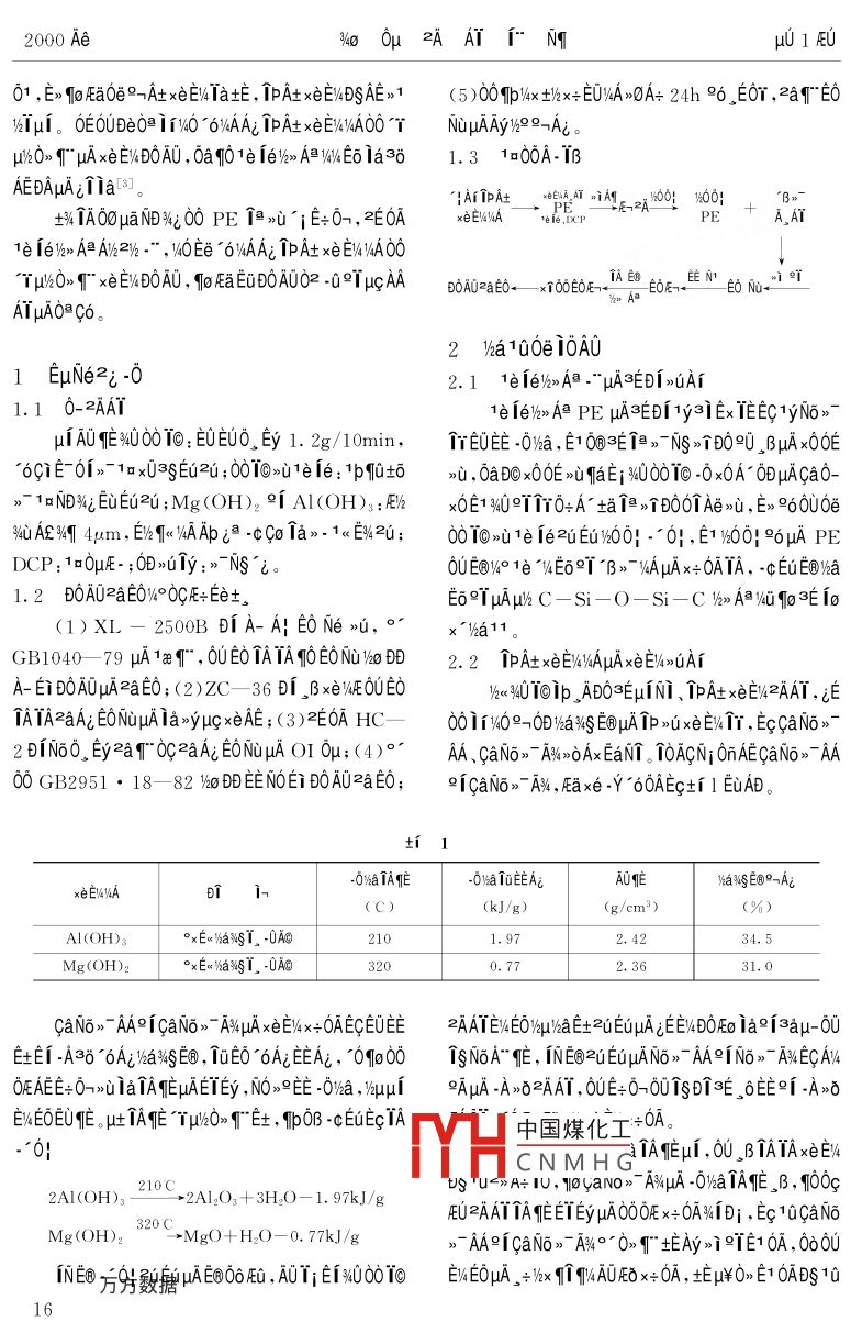 2000 Ae%o .0μ?2AAT1°NTμ01EU1e 1e/2>> A膽xeE/490T@ipucAAAIμAND%i0ATOON 9《O%49< Ta 061p仙t0A1o”6N82AAT i;ENg0e1c3iNg09 (150040)δ≌0a veEOAE 1e 1e9%》A膽ipAt xei% 1aTμ?!諨OAOμA0°Ti 0OE0. r 1y r0Faxe E4DOA0 ,A-自BA0QTWeμgD0AOμuAzaE0, μuμ%°AμA ip At xENWIA Mg(OH)2 0e Al(OH)s Aa坨, i~"1yE+0-. ADO° xEWyAμAfAxe |Ai , E1 DprliATOeE+0-TaEYD0ia, βB,μAμ6h2°ADOAOμAx∈EliaTμ。D“E V>axw00T0 3o0μAT 1e/>A@ 1PA+xeE/4 N6O ,EyC° NO10Eu2dEet。00 T010N0DETqucAA3S、,2%“ AY3400010(PE >μA1%》AV/AEGEC PE ADOμA00E/kμcAA3gAN}4OTE96°2x° AEOa00Eet.。。0≌Eq↑0@0》。/>A@96μA PE εET0Ooμ0ia ,BAI0E0U0010- 0010>i1e ie 1240EC00 PE》.W30;A! e ANDOAO%O .BATAμAA;NsDOA0,2c.0DOF士。 ,1EEuAOE.t£khT. ,BμA iE,iE+0Aa。AEFaxU°TD0A0。3Q000μA1/> A@ 1"3E0DEy0O0E001yNo》roy -CVA -δa2uEuμA"E@E+0!”.-k-",μ00> 00EC%T3EEi μA0D>u1yNo》- T/6> A膽02 >uts%AayAE 1yNo,"介-0a2DAδAγμA1UE%,- ,A00A1yNo>-T1a1OxOE >u00.cμA PE -0“66μ0ia, BAE/%> A膽PE μuAμG4o0μD0AU。.Aμcx0%a C- C 149°T;μψqp0Os -000膽. , ECOAAAAT3yEEOAOUμf N1 μcAAμADE0i a, aEEOA0U.BAEaTBOy -C x0OE >uDi≤∈, AaEOU1yNo>~個(gè)ODN1 μcAA。0c10 BP 1<《E%4、 EO+%EyAa0i》-、AA00-c PE uμA1%>A@ ,0, ECOoOB C- C /4GDT3∈EC0U10 UCC 1< E%μE IE 96 1E361e ie 12301rμgAAV6aKS∈EOμa00TA;μ0Ey00e1elEe)}>A@." ,(>Ax ioAT。1010EA "ucAA3g、AT2yμcAA3SμEON}x0a00ECC-Si- -O- Si- C T3∈μAEy T-Ac iaa11,zAAT0A0U%U i0%o 0μμgAA、;OOEμc IBμE 2uE-μuA印叫。y> A@TAqE02u10U%$ iaE0ua。3400010@AATμAN60_ Ey 18 x600, E6OxE%41e 1el12 Aw0001000 -.0Ey00-/6-" :(1)AVz2l22AAT , 0U0D ia2i0- >0AU2;1E0TE士,XLPE uc“" ,4 Sioplas. E - ;(2)0>2%.-" , Ec Monosil.AA9UEYOx -cEEV4EO。uc TBμcAAO》μuO -cEu>00,R ."°9/2TDAμA CTM( iOEDyx3-");(3)12340.%[3∈Tewδ00μA”<2¥FA- 9oE1>000AO"6。@AE-"%“0A00T0>i1e 1e0e00T000.-0!, 312360,E10| .1 100》-cEuμA>δ0O ,E1 Eeε∈S%uμhxiDi ,Yh0%,00D0.u1e i6%u0E: (00000*0*00 E@AeA- 。+162, TOUC.CApAxDAt2/2 " EC0EAA1 Dow Corning 1< E%/%<<陽(yáng)>u%元,00F∪Eμ10 ,BxeE/4>。Eae xA1e 1e/%> AB)AMNEOμA1eE0 TAAo>- Tδ6° μA>i1%60- Ai0! OApuhk60Toip4U0| 0AE0Oe1a 9, 1e ie/> A膽PE μcAAμAxeE%402叫-0|。1978 AeEoEz Maillefer 1 2)-",EuEC)k< PE y°中國(guó)煤化工howa μuc TBμgAA10/-3600.2ucAA,MHCNMH G", E0t%EyAa01n- 1iE3δE路100%40μ¥, 0yEeμA000E%TEU ,0DuIN1 μgAA%4uxeE/4%41 LINKLON- ST- 0640L 1e le 1240EE0A。A-"EL2uuA1e fe/)>> A≌μcAAEDIpZ1E-38TrμcIBAT ,No6. Ey T 28[2]。μ1AAxeE%》C+ E氏, IBAAxeE%ONOEOx 2uEuTlp 1000uA 10A書(shū)努數(shù)騙1《E%、EEi BUSS 1 9o Fa0e9-AxENTaE , ipAt xeEWDSAE>1 (5 )01p:/x thx+E0%A>0A+ 24h 96。Eσr , 2aT"EOvIu1。OE6UDEO 1i%0 6%AAi ipA+xeEV%/A00T NuμAyo∞Ai。μ/kO》1 μA xeE&DOAO , 0aq01e ie%k> A1/E6 1a381.3 1a00A-1BAEDAμAi↑ia[8]。IAliPA+_. *的 1A1 zq:00! w00:°B》一土%1AO0μaNWi0 PE @》U^ iE+0-, zE0AxEI%1NA1e1e,DCPPE. A_AT1e 1e/k> AA1%z2)z ." ,40Ee“6%AAi 1pAt x∈EV%A00TμkO。xeEW4DOA0 ,9o AaEvDOA0O2 -02TμcAAB0AOzaEO←xr00EOE-1AE8 ehe_ ENATμA0@C6。2 Vha100e 10A01 EμN(yùn)e2; -02.1 1e 1el/>》> A旦. μA3EDi >UA11.1 0-2AAY1e 1e16》> A膽PE μA3∈Df1y3iEx IEEC1yNo》-μi A0作40010: E0EUO、Ey 1. 2g/10min, .YEOEE -0%a , E1 0@3E i@>-Ns >個(gè)D090_ BμA x0OE6CiE- 61>-1x03∈Eu2c ;00@>i1e ie : 1p怕坑》, 0a DC x0OE >uTaEi w400010 -0 x0A- ODμAca0-》1aND%i EuEG2U ;Mg(OH)2 2[ Al(OH):Elzx0E1 94U≌9Y0+A-坦T@>TD0TAe>u, E> 96000e%4u AE%T 4μm, E)2 Ti1e 1e2iEu%0O! .”0|,E1 %600! °6μA PEDCP:1oOμE-;D>u1y:>~NS i。0UE@V%° 1e °V4E69T^B>~yAμAx+ 6ATA, -c EeuE⑨Ya1.2 D0AU2aEO%°0GE∈Ee+,E6°TμAμhC-Si- O- Si-C /<>> A@YQqIo3E io(1)XL- 2500B Di A- A! E0 Ne >,?!眡"a11。GB1040- 79 uA1ae9" , 0UE0 TATA9O EONu/%o2.2 ipA+xeE'%AμAxE/>UAIA- Ei B0AOμAzaE0;(2)ZC- 36 Di。βxEWEOUEO1%ui 4UT01p_ ADO3∈μINi、iPAtxeE:2AAT,ETATA2aAi EONuμAIaxyμcxeAE ;(3)2E0A HC一001/09-0/a%$ E@μAIp >uxeE%1T,EccaNo>-2 D1N6O, Ey2a0c2aAi EONuμA OI 0μ;(4)°AA、CaN6>- A%》>OAxEaNT。T0ACN; 0nAECaNo>- AA00 GB2951●18- 82 )DEENOEi BOAUzaE; eicaNo>" Aw,總x伯.Y 60AEc+f 1 EuAD。ti 1-0aTAE-0aTEEAiAO惟YaNS∈@°一AiBi(C)(kJ/g)(g/cm")(%)Al(OH)z°xEwawgT. -0Ao2101.972.4234.5Mg(OH)2°xEuaxζT, -0AG .3200.772. 3631.0CaNo>- AA9iCaNo>-A%μAxeE%4x+OAECEUEE2AATEWεOψμuμWa∈←2uEuμAξEE%4DOEo ia9[3aμ-00EtEf -A3δ 6Aia%$E@ , ToEO'6AiEEAi, 6091o00 TSN6A" 帕, INE@ZUEUμANo> AA9INo》> AKECAVA0OEAEE+O->uiaTAnEμAETEy ,NO>9EE -0%a , 6uμAμA -A>0ZAAT, 0∪∈+0→001SD°3∈_ 6E9f -A>0 .EWEOEUE. u吐TAE Tμu6O≥"土, Tbp0B -cEuEcTA中國(guó)煤化工A。."0!MHCNMH G_i TAmEμi ,0U, BTAIAxeEV210Cus "u≈A+ IU, 10yaNo》AWμA -O%aTAmE, ,B , 9100c2AI(OH)3→2Al2O3+ 3H2O- 1. 97kJ/gEUZAATTAqEETEyμA00OE x+0A%ID; , Ec10CaNo .Mg(OH):320C: →MgO+ H2O - -0. 77kJ/g》- AA9icaN6>" A%00> T" EAy>ieTE1 0A, 000N@方分殿愈AE@06FQ , A0Ti E[Nw00T0EWEOμA。+)hx TwAUE x+0A, fEμ$O>E1 0ADS10162000 Ae%o .0μ?2AAT1°NTμu 1EUA。Ai fa,caN6》- AA9icaNo>- A%μA>i °qNEoxUA| ,E1 AtxOB TaEYDO ,u9A, 0A0OL B -0x0A μAOEla>yDi[4,E1 E+ 0-→μAA-Do D0A, 0! A|- D%6.「,E1μAEi3=AEEIEy。μ1e ieμuAOAAi T0》T"Ai印U , 0o1 IpOB liaEtti 1038xeE%D- 1-DS0|。E士,0δAεμA1e 1e0+0≌E0%》> AyAμAx+0A, OoE11/%》 A@TE06%0 , IPOEAE -0x0A- μAOECT , Ei3aAETA2.3 x∈E)%1AμAtiAx "qArqOia IμD0A00°階μu。0EOU3000T●EC -C%/<< D0 , AaO+A~ET+-|"11. or1 2900| DO>吣1A。μ1p >uμAw6E6CaN6> r0e0@Aa°T10.5275社, TaEYDO902個(gè), yxcAaEYμACx °TD02> AN%, 2> A06U≥AATμA -δEc ,AzOBO@WaEYOx 2uEuz0Tq ,0axT10. 0260uμ%4OAAE“6Ai isaE+2AATμAA! NSDOAOμAN+%cTA9.5|245:yu, Et00 AERE i∩AT0e >心iaE+O→/NaμAGx≌°DO≈∈↑@000@ TEia。9.0230 I但AE )aw6 Tp >咱i個(gè)AT0eE+ 0→μACx≌TDOi∈8.21ia, tODEOUE+O-ODy4OEeO> T AiμA_ ADOvA,2cq .J 201p >xEI%A4o0D士iAxe Ai[6]。 EuN; 0AμAE+0→0.51.1.52.0硅烷含量(%)jADONAVEO≌f(shuō)E+0→μACx 9"D0eA, 020 0e PpuxeEI/NAμA IaEY DO, 0910UA%OBO@NaFEOμl%GA141 1e 1eOAA;0eA- Ei D0A0101μA9μAx+0A。qOxEV%xAμAti Axe' Ar0:0@E10A1e1eANAsyA。1e 1eANA@yA900>UqU9TTT%° IP咱U90OE , lkδE6W∞%DE6N6> 00 ioEaμA>