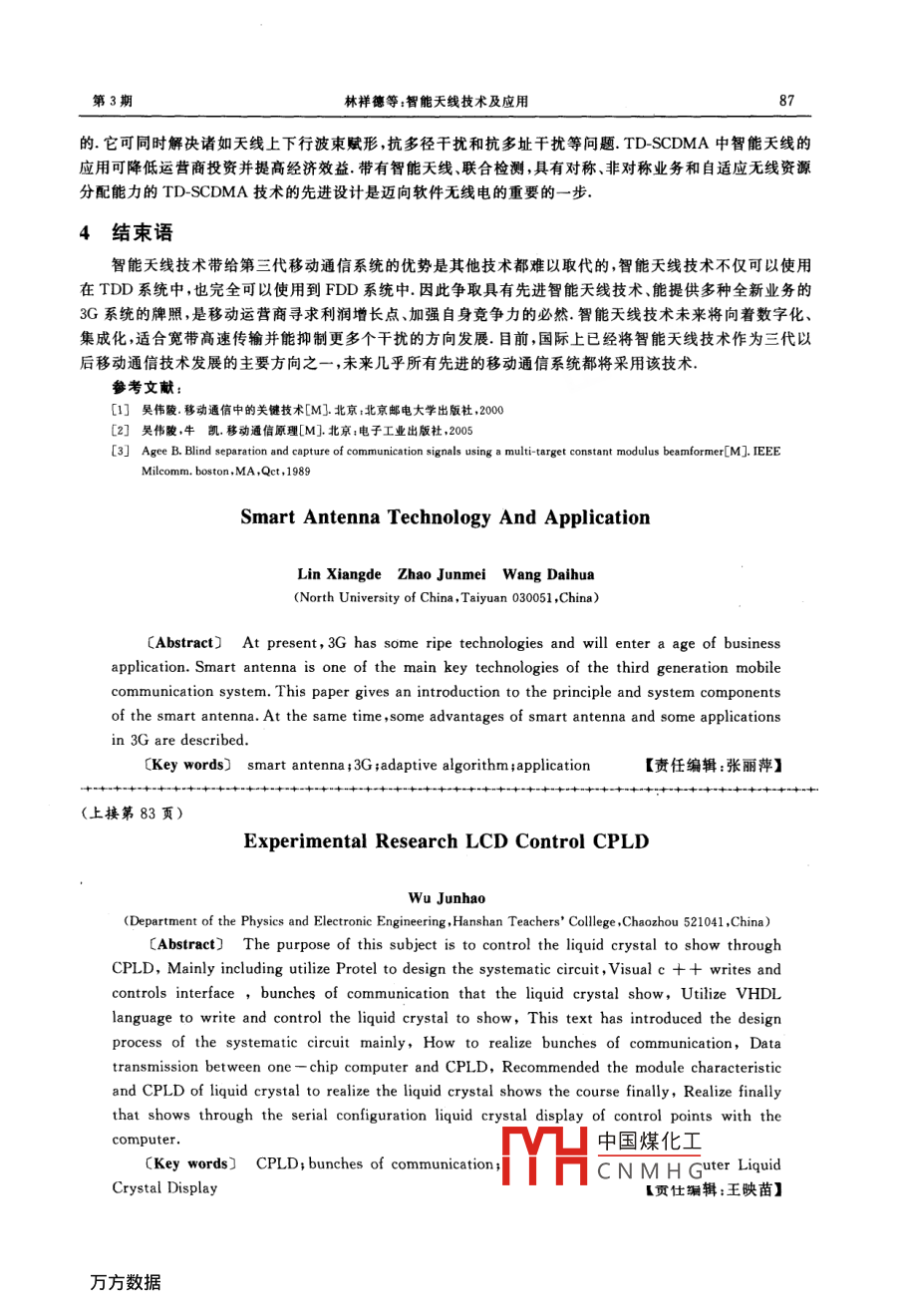 第5卷第3期太原師范學(xué)院學(xué)報(bào)(自然科學(xué)版)2006年9月JOURNAL OF TAIYUAN NORMAL UNIVERSITY(Natural Science Edition)2006智能天線技術(shù)及應(yīng)用林祥德趙俊梅王代華(中北大學(xué),山西太原030051)〔摘要〕當(dāng)前,3G技術(shù)業(yè)已成熟,商用在即,其中智能天線是第三代移動(dòng)通信系純中的關(guān)鍵技術(shù)之一,文章簡(jiǎn)要地介紹了智能天線的基本原理和系統(tǒng)組成,同時(shí)分析了智能天線技術(shù)的優(yōu)點(diǎn)和它在3G中的應(yīng)用關(guān)鑣詞〕智能天線;3G;自適應(yīng)算法;應(yīng)用〔文章編號(hào)〕1672-2027(2006)03-0084-04〔中圖分類號(hào))TN929〔文獻(xiàn)標(biāo)識(shí)碼〕A0前言當(dāng)前,通信技術(shù)和產(chǎn)品已滲透到人們生活的每一個(gè)角落,特別是個(gè)人移動(dòng)通信更是以不可阻擋的勢(shì)頭蓬勃發(fā)展,用戶數(shù)量迅速增加頻譜資源隨之變得越來(lái)越緊張同時(shí)人們對(duì)個(gè)人通信服務(wù)的內(nèi)容和質(zhì)量要求也越來(lái)越高所以如何提高頻譜利用率,如何消除多址干擾(MAI)、共信道干擾(CCI)和多徑衰落的影響以提高通信質(zhì)量,如何滿足市場(chǎng)的需求已成為個(gè)人移動(dòng)通信領(lǐng)域函待解決的問(wèn)題智能天線( Smart Antenna)技術(shù)的引入使問(wèn)題得到滿意解決智能天線最初應(yīng)用于雷達(dá)、聲納及軍用通信領(lǐng)域.20世紀(jì)90年后,民用移動(dòng)通信系統(tǒng)逐步開(kāi)始采納智能天線.數(shù)字信號(hào)處理(DSP)技術(shù)的迅速發(fā)展及計(jì)算機(jī)處理能力的不斷提髙使得利用數(shù)字技術(shù)在基帶形成天線波束變?yōu)楝F(xiàn)實(shí),從而促使智能天線技術(shù)在無(wú)線通信中得以廣泛應(yīng)用1智能天線的原理Y收下下[控制部分智能天線技術(shù)是在微波技術(shù)、自動(dòng)控制理論、自接收/下行轉(zhuǎn)適應(yīng)天線技術(shù)、數(shù)字信號(hào)處解調(diào)理技術(shù)和軟件無(wú)線電技術(shù)等多學(xué)科基礎(chǔ)上綜合發(fā)展可而成的一門(mén)新技術(shù),它的主差信號(hào)接收/下行轉(zhuǎn)A、0要任務(wù)是研究如何獲取和換利用接收信號(hào)中包含的空自適應(yīng)天線陣列算法間方向信息,并通過(guò)陣列信波束成型網(wǎng)絡(luò)號(hào)處理技術(shù)改善接收信號(hào)的質(zhì)量,從而提高系統(tǒng)的性圖1典型的智能天線接收系統(tǒng)示意圖能口.一個(gè)典型智能天線接ig. 1 A typical sketch-map of smart antenna yeceiving system收系統(tǒng)(如圖1所示)包括三部分:實(shí)現(xiàn)信號(hào)空間過(guò)采樣的天線陣列;對(duì)各陣元輸出進(jìn)行加權(quán)合并的波束成型網(wǎng)絡(luò);更新合并權(quán)值的控制部分21.1智能天線的天線陣列智能天線的天線陣列是由多個(gè)天線單元排列成一定形式后形成的各天線陣亓間距一般取半個(gè)波長(zhǎng),因?yàn)殛囋g距過(guò)大會(huì)使接收信號(hào)彼此相關(guān)程度降低,太小則會(huì)中國(guó)煤化工鑒按目前的水平,CNMHG收稿日期:2006-07-20作者簡(jiǎn)介:林祥德(1977)男江蘇連云港人,中北大學(xué)在讀碩士研究生,主要從事無(wú)線通信研究第3期林祥德等:智能天線技術(shù)及應(yīng)用天線元的數(shù)量約在6~16之間智能天線通常形式有平面型圓環(huán)形、直線型直線型和平面型容易實(shí)現(xiàn)基站的定向覆蓋,并且在基站選址的問(wèn)題上也更加靈活,直線型和平面型天線陣列可以很容易安置于建筑物的側(cè)面或桿狀建筑物上;而圓環(huán)型天線陣列更適于安置于鐵塔或樓房頂部,這樣更方便提供全面覆蓋,缺點(diǎn)是圓環(huán)型天線陣列的天線校準(zhǔn)難度比直線型和平面型要大1.2智能天線的波束形成波束形成技術(shù)關(guān)系到智能天線能否實(shí)現(xiàn)波束形成就是將天線陣列上接收到的信號(hào)變換到基帶,然后進(jìn)行相應(yīng)的空間譜處理,獲得該信號(hào)的空間特征矢量和矩陣以及信號(hào)的功率估值和波達(dá)方向(DOA)估值.在此基礎(chǔ)上,依據(jù)相應(yīng)準(zhǔn)則計(jì)算信號(hào)在各個(gè)天線陣元的加權(quán)矢量,生成多個(gè)高增益的動(dòng)態(tài)窄波束來(lái)跟蹤多個(gè)期望用戶,目的是從期望信號(hào)、干擾和噪聲混在一起的輸入信號(hào)中提取期望信號(hào)智能天線所形成的波束可實(shí)現(xiàn)空間濾波作用,它對(duì)在特定方向入射的信號(hào)具有高增益,而對(duì)在其他方向入射的信號(hào)具有衰減作用在接收模式下,抑制來(lái)自窄波束之外的信號(hào);而在發(fā)射模式下,使期望用戶接收的信號(hào)功率最大,同時(shí)使窄波束范圍以外的非期望用戶受到的干擾最小,降低用戶間的共信道干擾根據(jù)波束形成的不同可將實(shí)現(xiàn)智能天線的方式分為陣元空間處理方式和波束空間處理方式其中陣元空間處理方式直接對(duì)各陣元按接收信號(hào)采樣進(jìn)行加權(quán)求和處理,形成陣列輸出,使陣列方向圖主瓣對(duì)準(zhǔn)用戶信號(hào)DOA,各個(gè)陣元均參與自適應(yīng)加權(quán)調(diào)整.這種方式屬于全自適應(yīng)陣列處理;另外波束空間處理方式分兩級(jí)處理過(guò)程,第一級(jí)對(duì)各陣元信號(hào)進(jìn)行固定加權(quán)求和,形成多個(gè)指向不同方向的波速率第二級(jí)對(duì)第一級(jí)的波