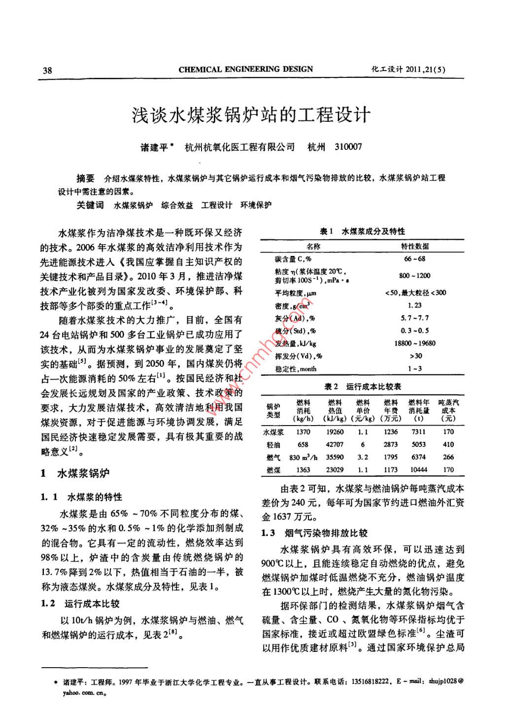 CHEMICAL ENGINEERING DESIGN化工設(shè)計(jì)2011,21(5)淺談水煤漿鍋爐站的工程設(shè)計(jì)諸建平*杭州杭氧化醫(yī)工程有限公司杭州310007摘要介紹水煤漿特性,水煤漿鍋爐與其它鍋爐運(yùn)行成本和煙氣污染物排放的比較,水煤漿鍋爐站工程設(shè)計(jì)中需注意的因素。關(guān)鍵詞水煤漿鍋爐綜合效益工程設(shè)計(jì)環(huán)境保護(hù)水煤漿作為潔凈煤技術(shù)是一種既環(huán)保又經(jīng)濟(jì)表1水煤漿成分及特性的技術(shù)。2006年水煤漿的高效潔凈利用技術(shù)作為名稱特性數(shù)據(jù)先進(jìn)能源技術(shù)進(jìn)入《我國(guó)應(yīng)掌握自主知識(shí)產(chǎn)權(quán)的碳含量C,%關(guān)鍵技術(shù)和產(chǎn)品目錄》。2010年3月,推進(jìn)潔凈煤粘度n(漿體溫度20℃,剪切率100s-1),mPa·800~1200技術(shù)產(chǎn)業(yè)化被列為國(guó)家發(fā)改委、環(huán)境保護(hù)部、科平均粒度,μm<50最大粒徑<300技部等多個(gè)部委的重點(diǎn)工作們密度,g/cm3隨著水煤漿技術(shù)的大力推廣,目前,全國(guó)有灰分(Ad),%5.77.724臺(tái)電站鍋爐和500多臺(tái)工業(yè)鍋爐已成功應(yīng)用了硫分(Sd),%0.3~0.5該技術(shù),從而為水煤漿鍋爐事業(yè)的發(fā)展奠定了堅(jiān)發(fā)熱量,k/kg18800-19680揮發(fā)分(Vd),%實(shí)的基礎(chǔ)。據(jù)預(yù)測(cè),到2050年,國(guó)內(nèi)煤炭仍將穩(wěn)定性, month占一次能源消耗的50%左右。按國(guó)民經(jīng)濟(jì)和社會(huì)發(fā)展長(zhǎng)遠(yuǎn)規(guī)劃及國(guó)家的產(chǎn)業(yè)政策、技術(shù)政策的衰2運(yùn)行成本比較表要求,大力發(fā)展?jié)嵜杭夹g(shù),高效清潔地利用我國(guó)鍋爐消耗熱值單價(jià)年費(fèi)消耗量成本煤炭資源,對(duì)于促進(jìn)能源與環(huán)境協(xié)調(diào)發(fā)展,滿足國(guó)民經(jīng)濟(jì)快速穩(wěn)定發(fā)展需要,具有極其重要的戰(zhàn)水煤漿1370192601.112367311170略意義2)輕油65842707628735053燃?xì)?30m3/h355903.2179563741水煤漿鍋爐燃煤13230291.1117310444由表2可知,水煤漿與燃油鍋爐每噸蒸汽成本1.1水煤漿的特性差價(jià)為240元,每年可為國(guó)家節(jié)約進(jìn)口燃油外匯資水煤漿是由65%-70%不同粒度分布的煤、金1637萬(wàn)元。32%~35%的水和0.5%~1%的化學(xué)添加劑制成1.3煙氣污染物排放比較的混合物。它具有一定的流動(dòng)性,燃燒效率達(dá)到水煤漿鍋爐具有高效環(huán)保,可以迅速達(dá)到98%以上,爐渣中的含炭量由傳統(tǒng)燃燒鍋爐的900℃以上,且能連續(xù)穩(wěn)定自動(dòng)燃燒的優(yōu)點(diǎn),避免13.7%降到2%以下,熱值相當(dāng)于石油的一半,被燃煤鍋爐加煤時(shí)低溫燃燒不充分,燃油鍋爐溫度稱為液態(tài)煤炭。水煤漿成分及特性,見(jiàn)表1。在1300℃以上時(shí),燃燒產(chǎn)生大量的氮化物污染。1,2運(yùn)行成本比較據(jù)環(huán)保部門的檢測(cè)結(jié)果,水煤漿鍋爐煙氣含以10υh鍋爐為例,水煤漿鍋爐與燃油、燃?xì)饬蛄?、含塵量、CO、氮氧化物等環(huán)保指標(biāo)均優(yōu)于和燃煤鍋爐的運(yùn)行成本,見(jiàn)表21。國(guó)家標(biāo)準(zhǔn),接近或超過(guò)歐盟綠色標(biāo)準(zhǔn)6。塵渣可以用作優(yōu)質(zhì)建材原料。通過(guò)國(guó)家環(huán)境保護(hù)總局諸建平:工程師。1997年畢業(yè)于浙江大學(xué)化學(xué)工程專業(yè)。一直從事工程設(shè)計(jì)。聯(lián)系電話:135168182,E-mil: zhuji028@ahoo. com. cno011,21(5)諸建平淺談水煤漿蝸爐站的工程設(shè)計(jì)編制的有關(guān)環(huán)境影響報(bào)告表的有關(guān)數(shù)據(jù),水煤漿爐的正常運(yùn)行與鍋爐的蒸汽壓力水煤漿流量、送鍋爐與其它鍋爐煙氣污染物排放比較,見(jiàn)表3。風(fēng)量、爐膛負(fù)壓等工藝參數(shù)與燃燒都有著密切的關(guān)表3煙氣污染物排放比較系,將這些工藝參數(shù)關(guān)聯(lián)起來(lái)組成一個(gè)自動(dòng)控制系水煤漿輕柴油重油Ⅱ類煙煤統(tǒng)。通過(guò)各參數(shù)的互相調(diào)節(jié),自動(dòng)控制系統(tǒng)能完成燃料灰分,%0.010.232.48以下功能:燃料硫分,%0.251.5(1)穩(wěn)定髙溫?zé)嵩?。除塵器(除塵率),%不用不用脫硫裝置(脫硫效0(2)實(shí)現(xiàn)不間斷連續(xù)穩(wěn)定運(yùn)行率),%不用不用70-30(3)提高加熱爐整體運(yùn)行效率。CB13271,I類區(qū)Ⅱ時(shí)段煙塵要求,ng/Nm2(4)配備非正常工況下的安全聯(lián)鎖反饋保護(hù)和GB371,I類區(qū)Ⅱ時(shí)段9(500)500非正常工況下的預(yù)警、報(bào)警等控制程序來(lái)保證水煤SO2要求mg/Nm漿鍋爐的安全運(yùn)行。實(shí)際煙塵濃度,mg/Nm339.8(59.4)<80<80此外,水煤漿鍋爐必須與鼓風(fēng)機(jī)、引風(fēng)機(jī)、供漿實(shí)際SO2濃度,mg/Nm32538(393.5)450泵、過(guò)濾攪拌器之間進(jìn)行聯(lián)鎖動(dòng)力控制,以保證加格林曼黑度啟熱爐安全運(yùn)行。B13271符合規(guī)定禁止不符合2.4消耗定額及配套動(dòng)力是否符合環(huán)保要求符合區(qū)使用以10/h水煤漿鍋爐為例,年生產(chǎn)按300d計(jì),注①表中“()內(nèi)數(shù)字按燃油鍋爐即過(guò)剩空氣系數(shù)a=1.2的標(biāo)每天連續(xù)運(yùn)行。由每10t蒸汽消耗的水煤漿為準(zhǔn)計(jì)算:②水煤漿鍋爐實(shí)際數(shù)據(jù)以浙環(huán)監(jiān)(200質(zhì)字08號(hào)為準(zhǔn):⑤水1370kg,軟化水為It,電為23.5kWh,壓縮空氣為煤漿鍋爐燃燒效率>85%(經(jīng)過(guò)布袋除塵及脫硫后,相當(d