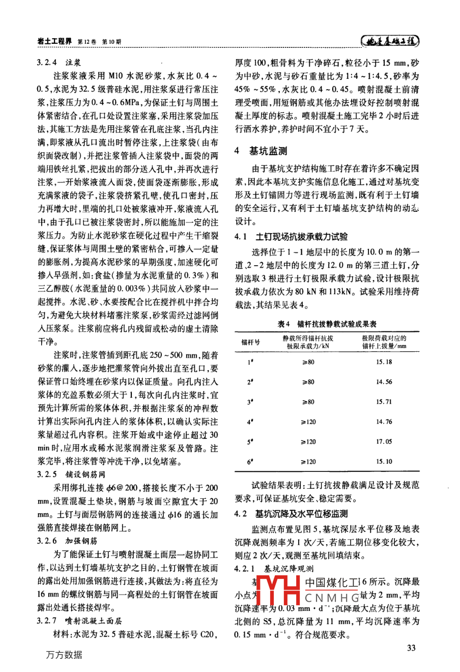 地受基礎工程)GEOTECHNICAL ENGINEERING WORLD Vol.12 No. 10某電廠循環(huán)水泵房深基坑土釘墻支護的設計與施工李宏運.(中冶天工上海十三冶建設有限公司基礎工程分公司,上海201900)摘要通過某循環(huán)水泵房深基坑土釘墻支護的設計與施工實例對類似基坑支護方案的制定及施工要點進行了探討。關鍵詞士釘注漿噴射砼基坑監(jiān)測中圖分類號:TV551.4文獻標識碼:A .文章編號:1009 - 5098(2009)10 -0030 -051.2工程地質條件1概述表1所示(1-1)層素填土為新近填土,土較松1.1工程概況散。(2 -2)層粉質粘土中夾粉土薄層;(3)層以粉某電廠循環(huán)水泵房工程東臨已建廠區(qū)道路及擬敷質粘土與粉土互層狀;由于該兩層土粉粒含量較高,設的循環(huán)水壓力管道,西南和西北側距3"、4"冷卻塔分進行大開挖施工時,易出現(xiàn)流砂與坍塌等現(xiàn)象。(4別為29 m、38 m(見圖1)。其地下結構平面尺寸為- 1)層粉質粘土,以軟塑為主。24. 24m x36. 48 m,場地自然地坪標高約-1.00 m,泵房2基坑支護方 案的確定基底標高為-9. 900 m,基坑開挖深度為8.900 m。北本基坑屬二級基坑。根據(jù)其周邊環(huán)境及工程地質條件,需對基坑實施支護,具體支護結構型式通過4"冷卻塔以下兩種方案比較確定。方案一:鉆孔灌注樁+水泥土攪拌樁止水帷幕|東支護型式基坑四周采用φ800鉆孔灌注樁,樁長18.0 m,3*冷卻塔樁底標高一19.0 m,鉆孔灌注樁外打設兩排φ700雙軸水泥土攪拌樁止水帷幕,樁長11.0 m,樁底標高一12. 0 m,樁間搭接200 mm??觾?nèi)設φ600臨時鋼管支圖1循環(huán)水泵房平面布置圖撐3道,分別位于-1.0m.-5.0m.-9.0m。支撐與灌注樁分別采用鋼筋砼貫梁和H型鋼圍檁連接。表1場地主要土層物理力學指標抗剪強度指標土層編號土層名稱層厚/m含水量w/% 重度y/kN.m-3 孔腺比e極限描固力/kPac/kPaφ/°1-1填土2.624.219.20.79730.916.202-1粘七2.223.118.80.98337.4452-2粉質粘土4.318. 1154-131. 818.60.93419.726.0淤泥質粉質粘土4. 036.11.03914. I_20.5該方案雖然安全可靠,可有效防止周圍建、構筑210中國煤化工坑推薦支護方案。物位移;但由于基坑支護施工工期長,臨時支撐嚴重MHC NMH G.影響地下砼結構施工,且用于基坑支護費用高達根據(jù)《建筑基坑支護技術規(guī)程》(JGJ120 - 99)[收稿日期] 2009-05 -05.39方數(shù)據(jù)巖土工程界第12卷 第10期的要求進行土釘墻整體穩(wěn)定性驗算和土釘抗拔承載鋼管擊人,傾角為10°,各層土釘?shù)拈L度及布置如圖力驗算,其整體穩(wěn)定性安全系數(shù)不小于1. 30,土釘3所示,墻面坡度為1:0.3,噴射混凝土面層厚度為極限抗拔承載力的安全系數(shù)不小于1.25,設計地面100mm,強度為C20,內(nèi)配置φ6@200的鋼筋網(wǎng)片超載按15kPa考慮?;悠矫娌贾迷斠妶D2。一層,并延伸至排水溝,為防止在開挖2-2層土時產(chǎn)生流砂現(xiàn)象,在施工第3道土釘前,先施工長度為1006.0 m的超前錨桿與第3道土釘進行連接,其尺寸為φ48(3. 0 mm,間距為600 mm。各層土釘?shù)氖芾麬荷載及抗拉承載力驗算列于表2。循環(huán)衣梨房地下姑構表3為基坑開挖到各個階段時的土釘墻整體穩(wěn)00 140720290定性分析結果,經(jīng)驗算當開挖至高程-9.90 m且第7道土釘尚未施工時,此時為最不利工況,其整體穩(wěn)定性系數(shù)為1. 310,能滿足2級基坑的要求。200基坑東側與已開挖的循環(huán)水管溝相鄰(詳見圖咖B4) ,管溝開挖寬度為4.0 m,基底標高-4.00 m,這樣為基坑東側減小主動區(qū)土壓力創(chuàng)造了有利條件。為此,基坑開挖面坡度取1:0.5,坡面噴射混凝土面層厚度為100 mm,強度為C20,內(nèi)配置φ6@ 200的圖2基坑平面布置圖鋼筋網(wǎng)片-層,坡面內(nèi)設置長度為3.0 m的土釘,土.基坑南北側采用土釘結合錨桿支護,土釘墻由釘間距為1.3 m(垂直) x1.2 m(水平)。上而下共7層土釘組成,土釘采用φ48(3. 0 mm的-0.300-1.150l 08-3.0 .多廠- SLo48-3000010.048*3.0018*3.0 c-9 90000100.-30 L1w10.0s 08.3.0 6000@600圖3 A-A 剖面表2各層土釘 的受拉荷載及抗拉驗算編號位置(高程)/m長度/m水平間距/mm所受拉力/kN極限抗拉力/kN安全系數(shù)-2.5012002.91861. 86121. 197-3.705. 60855.6719. 928超前錨桿-4.906.060012.0中國煤化工5.228-6.10DHCNMHG.2.68330. 8y154. 3U21.764-8.4037. 99848.8281.285-9.5038.461 .46. 154.200 .31(她是基礎工程GEOTECHNICAL ENGINEERING WORLD Vol.12 No. 10...........表3各施工階段土釘墻整體 穩(wěn)定性分析施工工況土釘未施工第1道第2道.第3道第4道.第6道第7道土釘施工土釘施L土釘施工,基底高程/m-2.904. 10-5.30-6. 50-7.70-8. 80-9.90開挖深度/m1.903.1004.305.506. 707.808.9穩(wěn)定安全系數(shù)1.9761. 5491.7221. 6031.4161. 4101.3101.354-4.00一~ 1:4.09.900| 048.2.5 L30002000 10*圖4 B-B剖面基坑西側為排水箱涵區(qū)域(圖4),其中箱涵為9.90 m-→施工第七道土釘-→噴射混凝土面層。變截面,箱涵基底傾斜,坡度為1:4,當開挖深度小各層土釘墻的施工流程為:開挖并修正邊坡面于6m時基坑采用1:1. 5放坡開挖,當基坑開挖深度- +噴射第一層混凝土(40 mm)-→擊人注漿鋼管→清大于6m時采用土釘墻支護。孔-→鋪設φ6@ 200的鋼筋網(wǎng)片- +焊接加強鋼筋一→其次,為防止基坑集水浸泡,在基底四周用磚砌噴射混凝土面層(60 mm) - +進行壓力注漿。筑截面尺寸為400mm x400 mm排水溝,四角設直3.2施工方法徑為600 mm,深度為1000 mm集水井,井內(nèi)放置潛3.2.1開挖作業(yè) 面水泵及時收集抽排基底集水。每層深度低于同層土釘約400 mm,作業(yè)段長度該方案較方案-一不僅能確?;影踩€(wěn)定,而根據(jù)現(xiàn